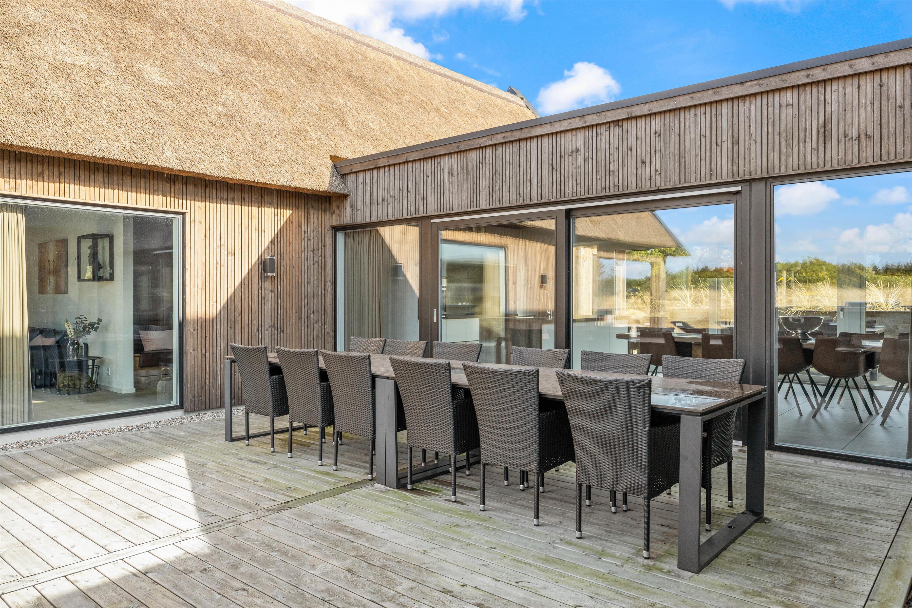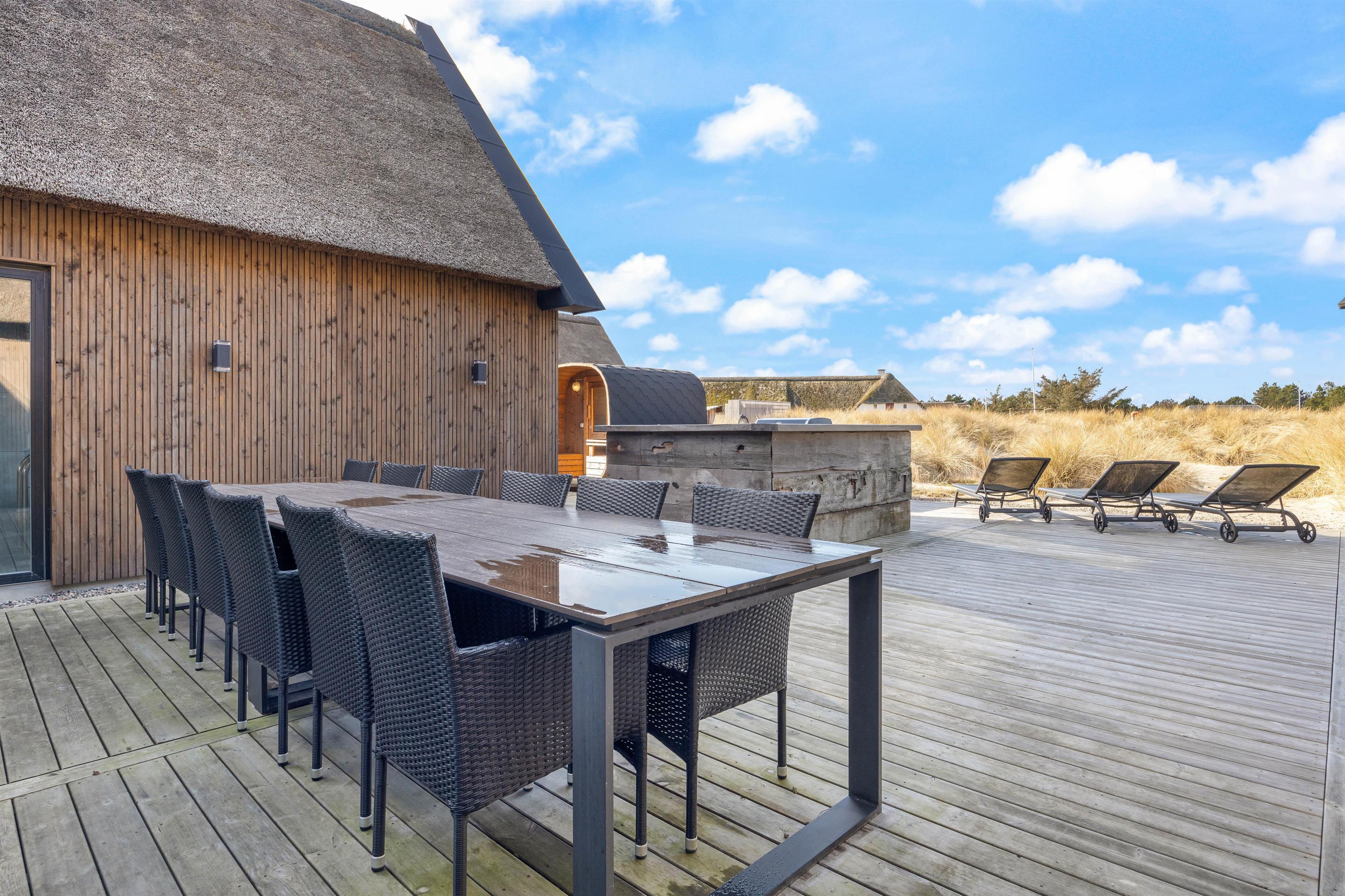 Fra opholdsstuen har I adgang til den rummelige, overdækkede terrasse, hvor I kan sidde i læ for Vestenvinden og på de kølige dag få varmen fra strålevarmerne. Fra køkkenet er der adgang til den åbne og delvis afskærmede terrasse, hvor I kan nyde en dejlig middag kreeret af feriens grillmester. Skulle I have lyst til en middagslur, eller er vejret til solbadning, er der naturligvis solvogne og parasol til jeres rådighed.