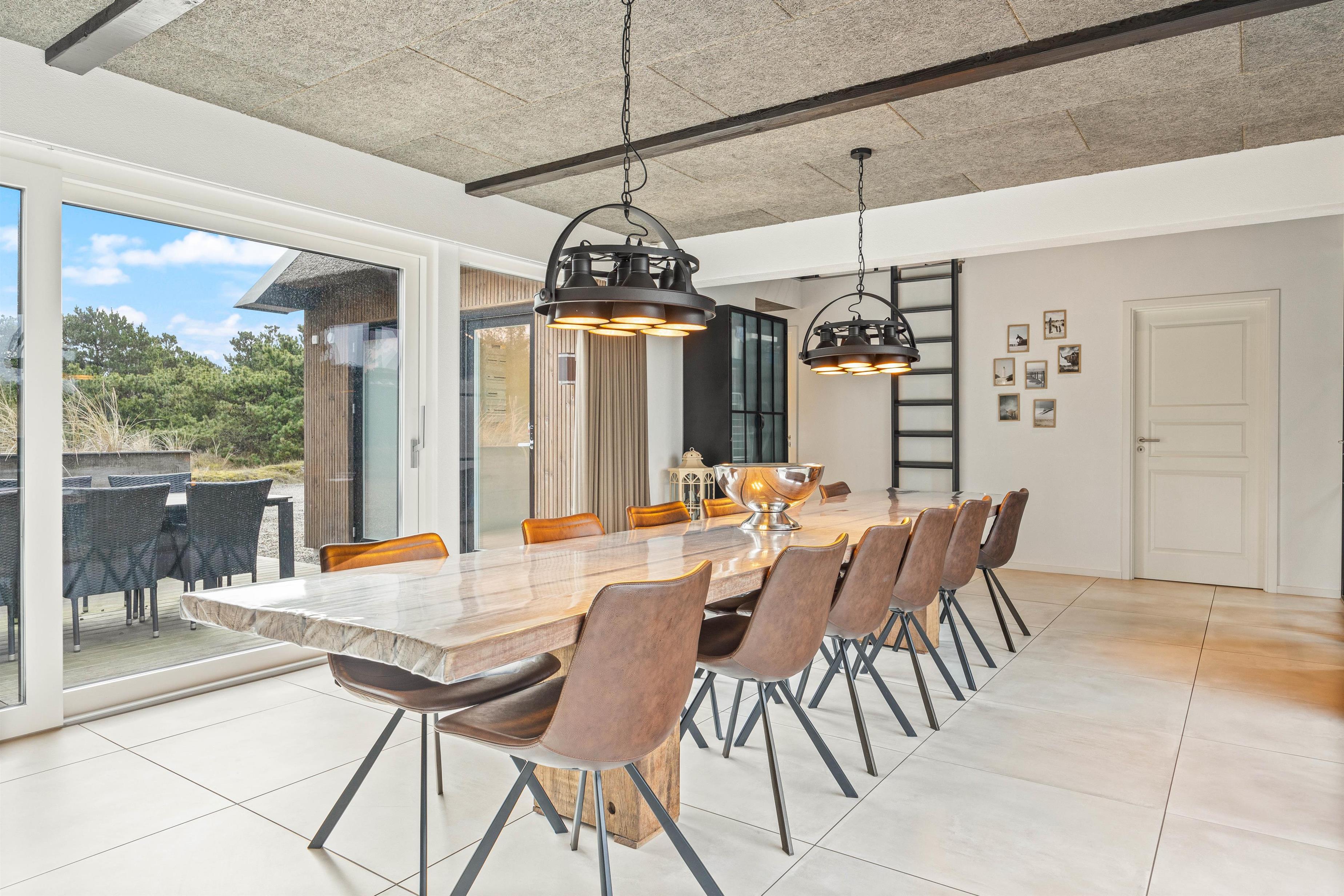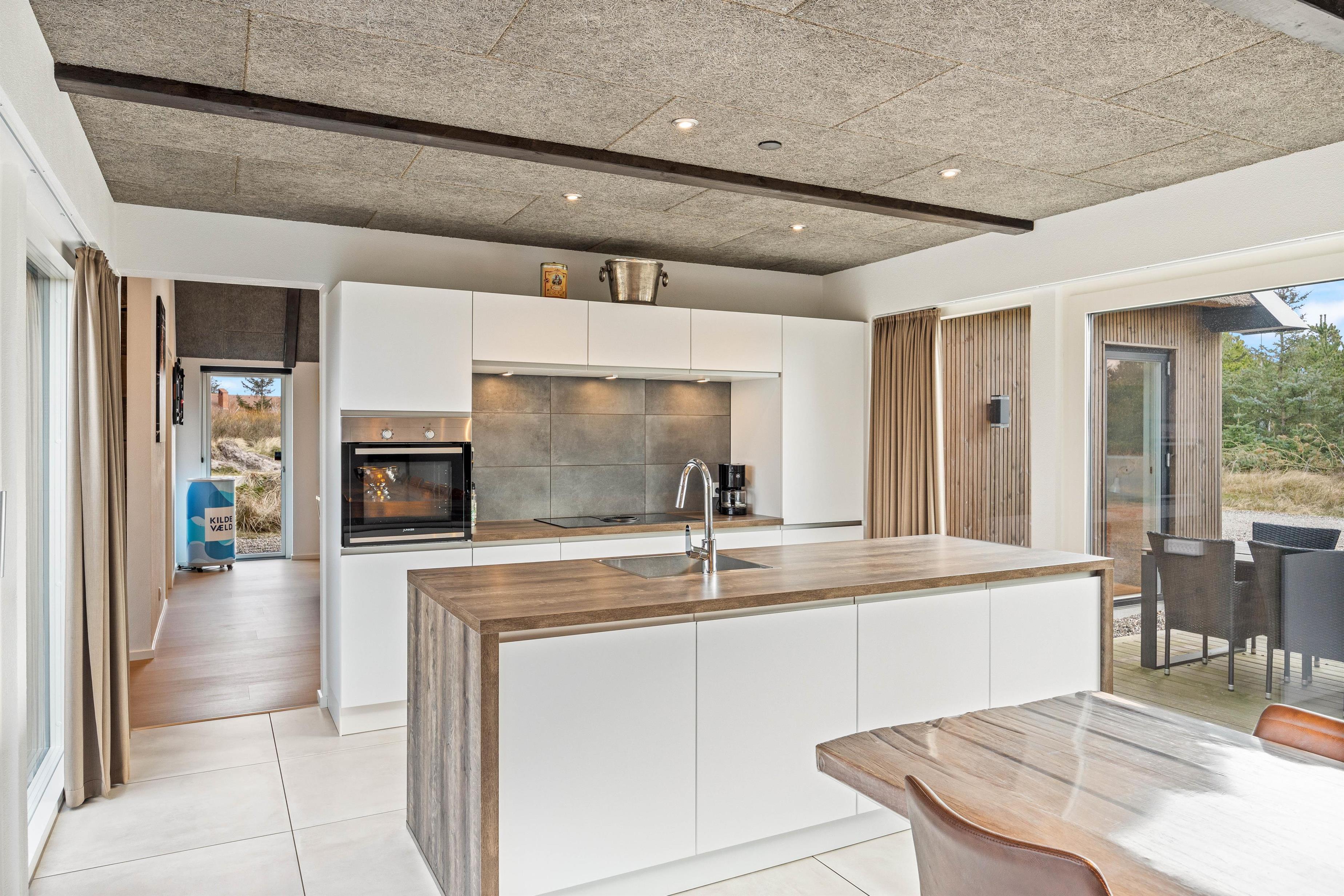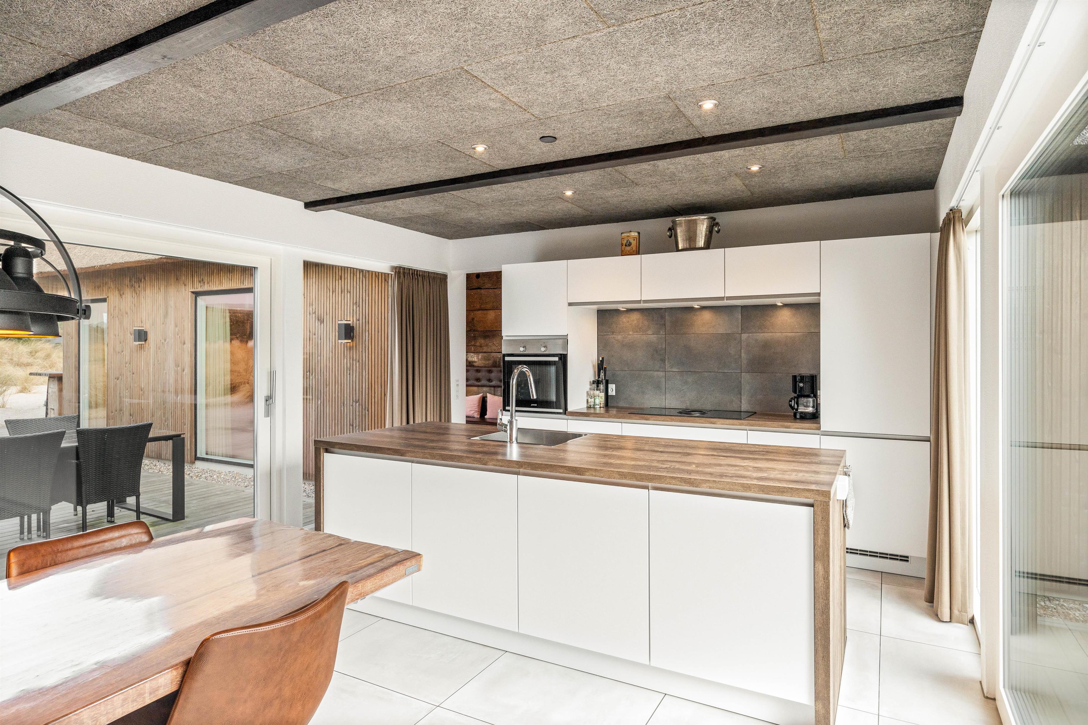 I det lyse og rummelige køkken med kogeø og moderne udstyr kan I være sammen om madlavningen og bagefter nyde den gode mad ved det store spisebord. I kan også nyde udsigten til den vajende marehalm gennem de store vinduespartier i køkkenet, hvor der desuden er udgang til den dejlige terrasse.