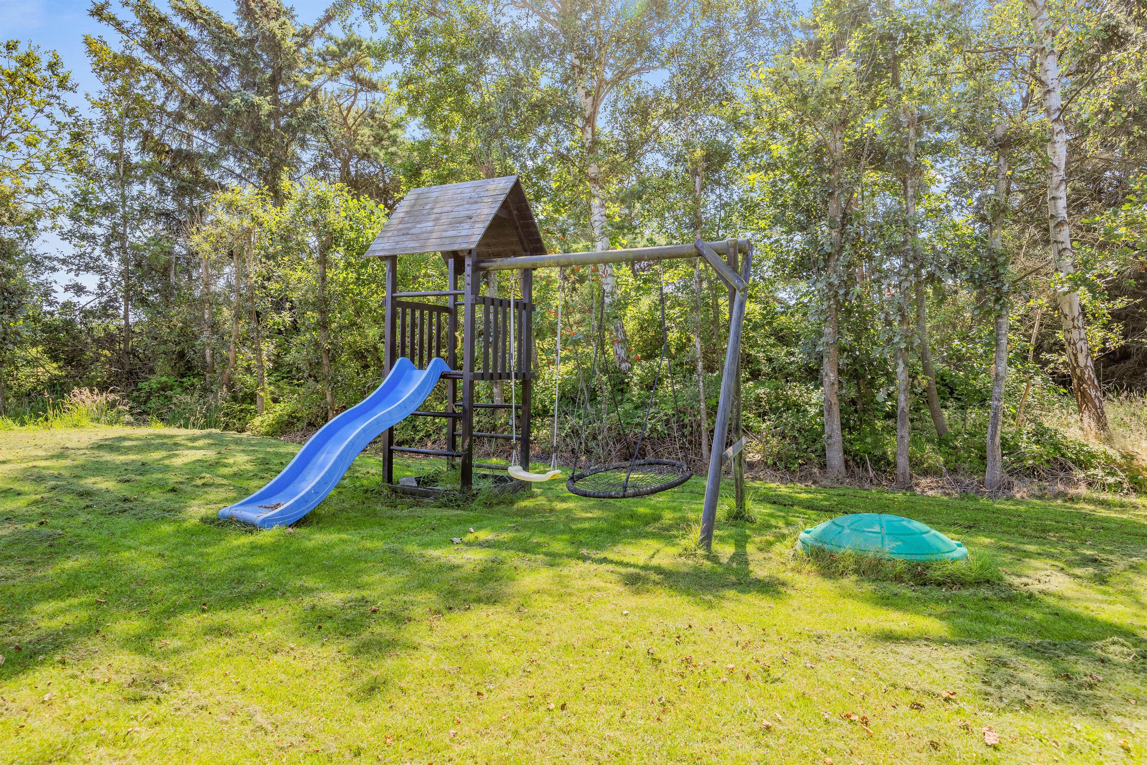 Ikke kun indendørs byder sommerhuset på de perfekte rammer til jeres ferie. Fra alrummet og ét af soveværelserne har I adgang til udearealet, hvor den 1500 m² store og indhegnede naturgrund er omgivet af træer og buske. Til familiens yngste er der både gyngestativ og sandkasse.