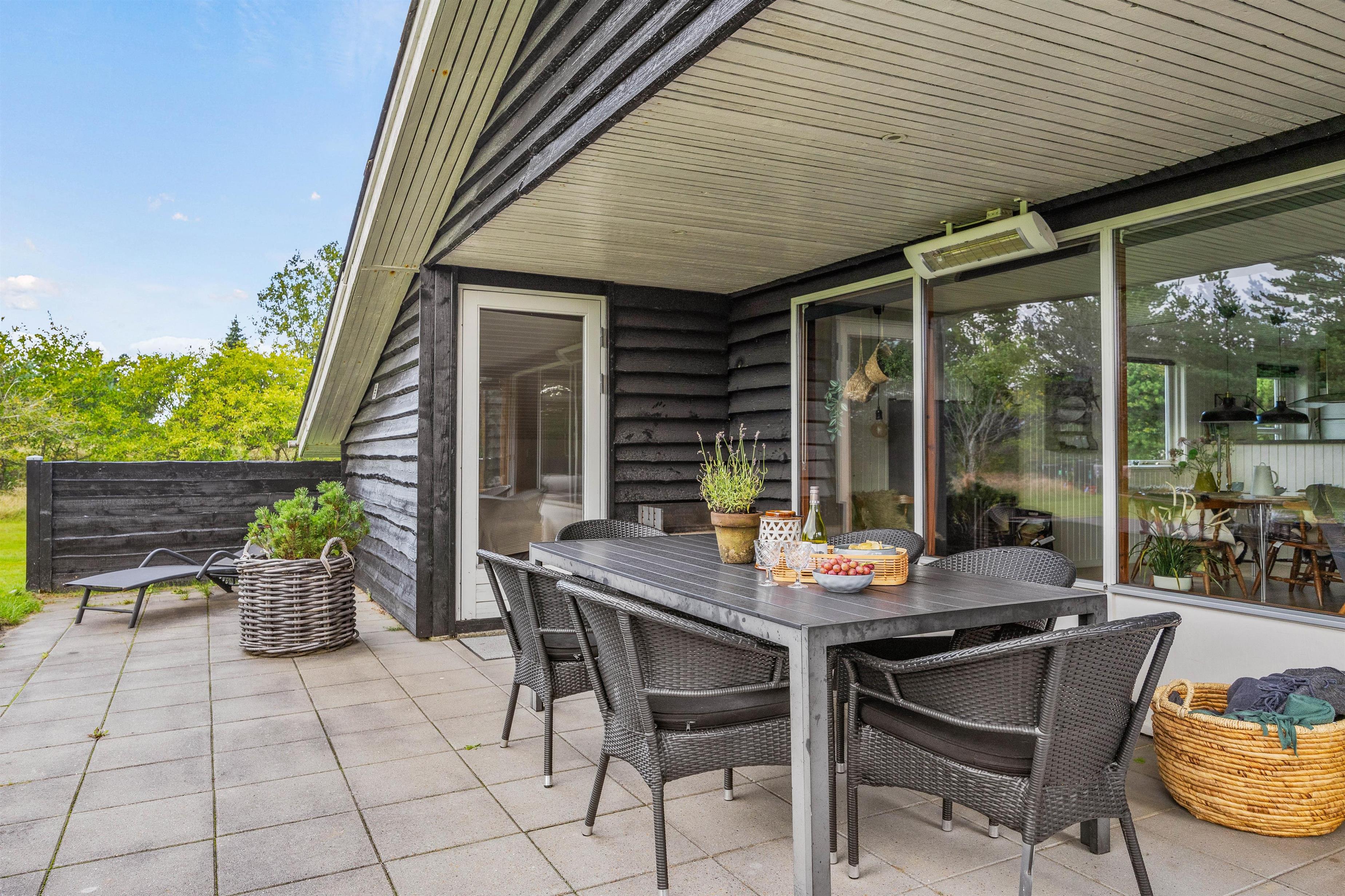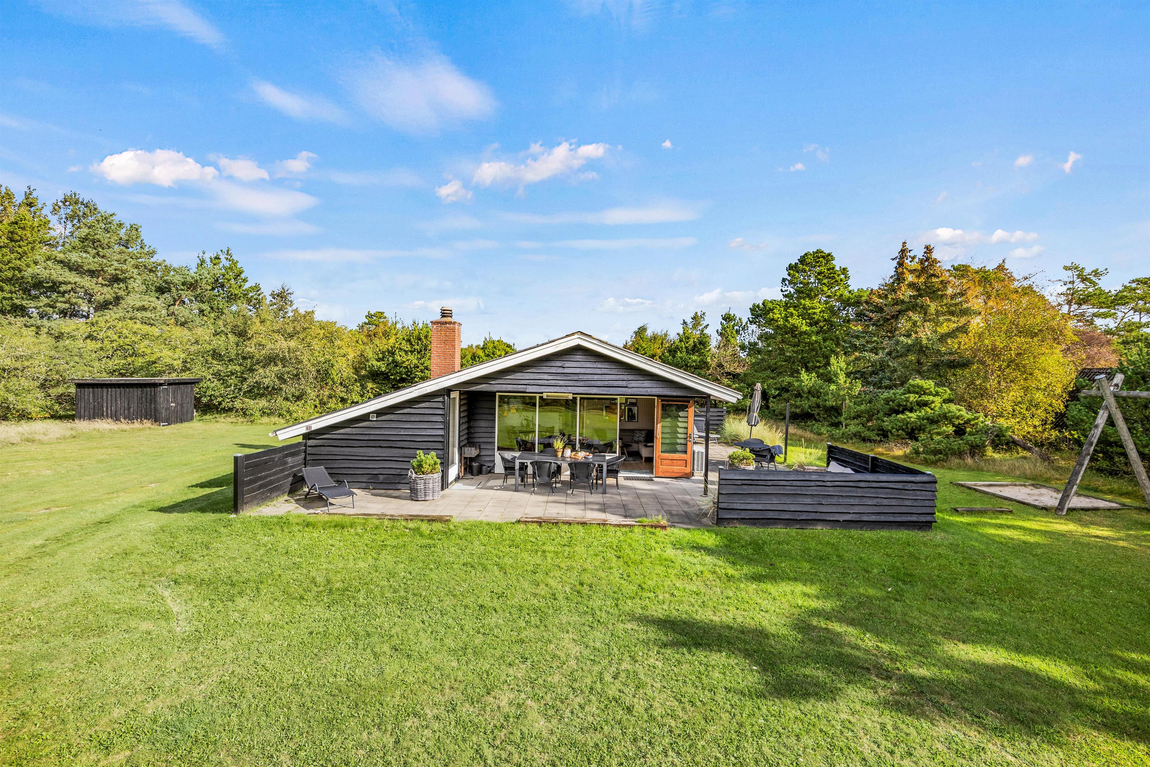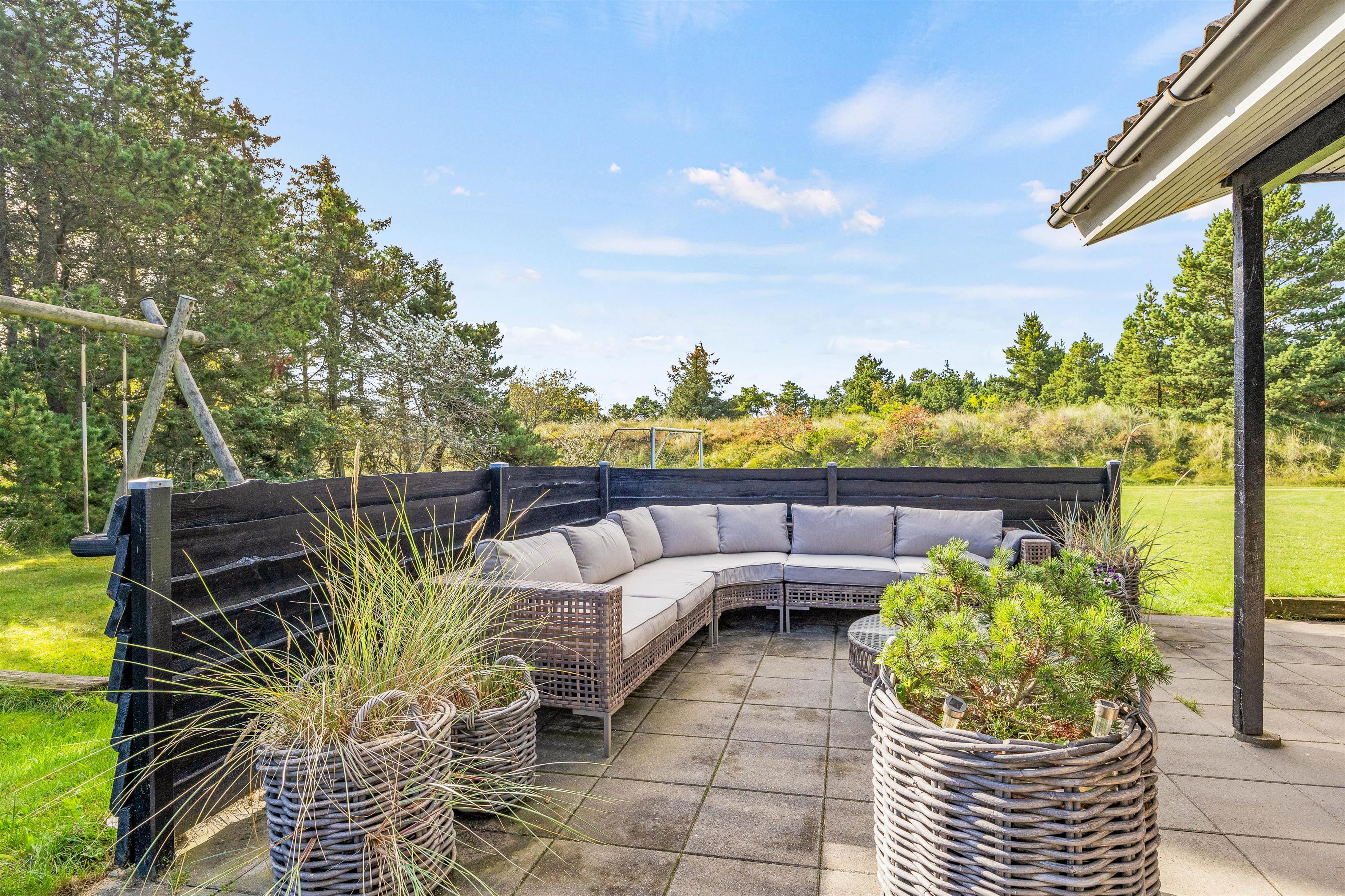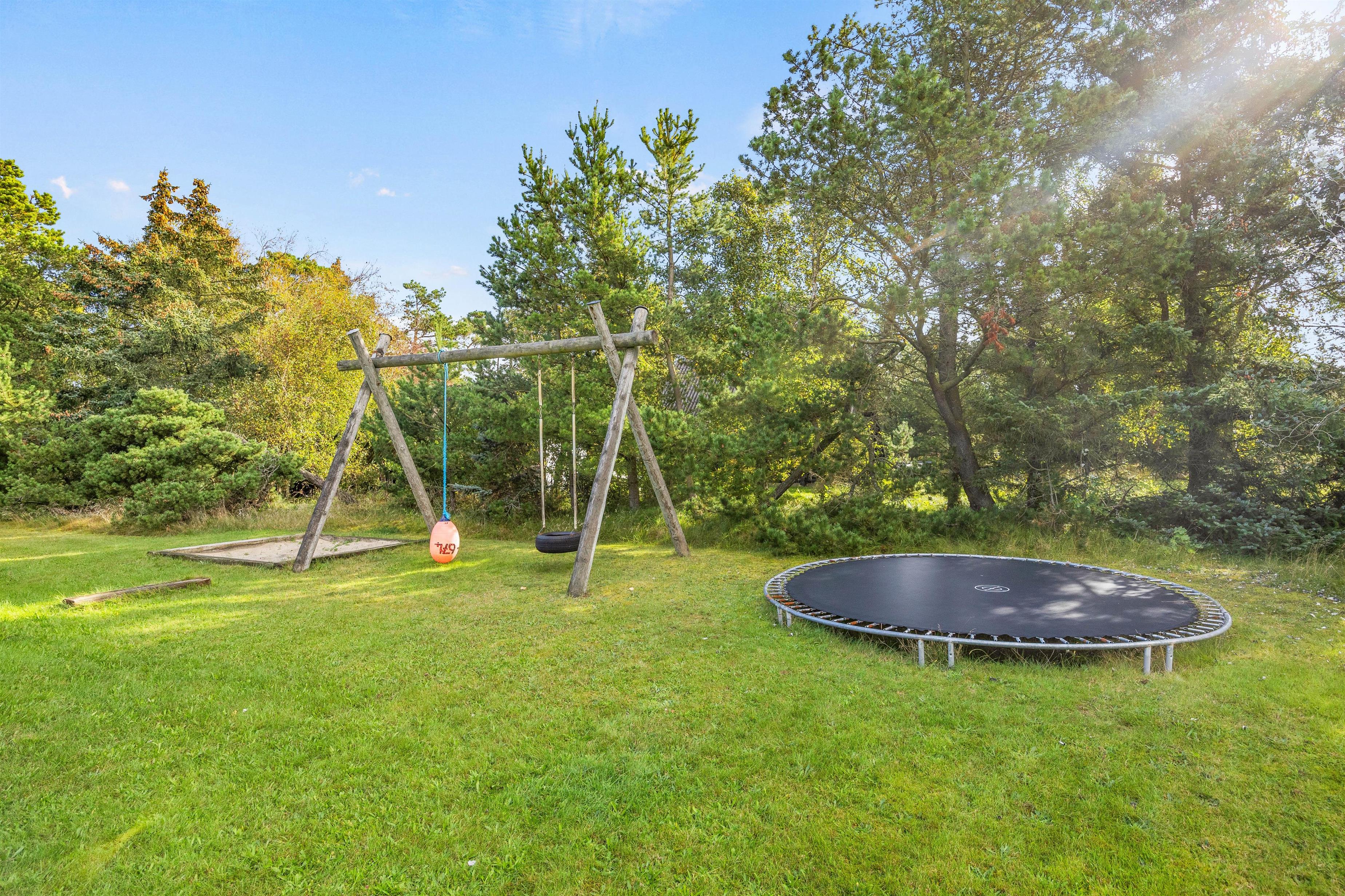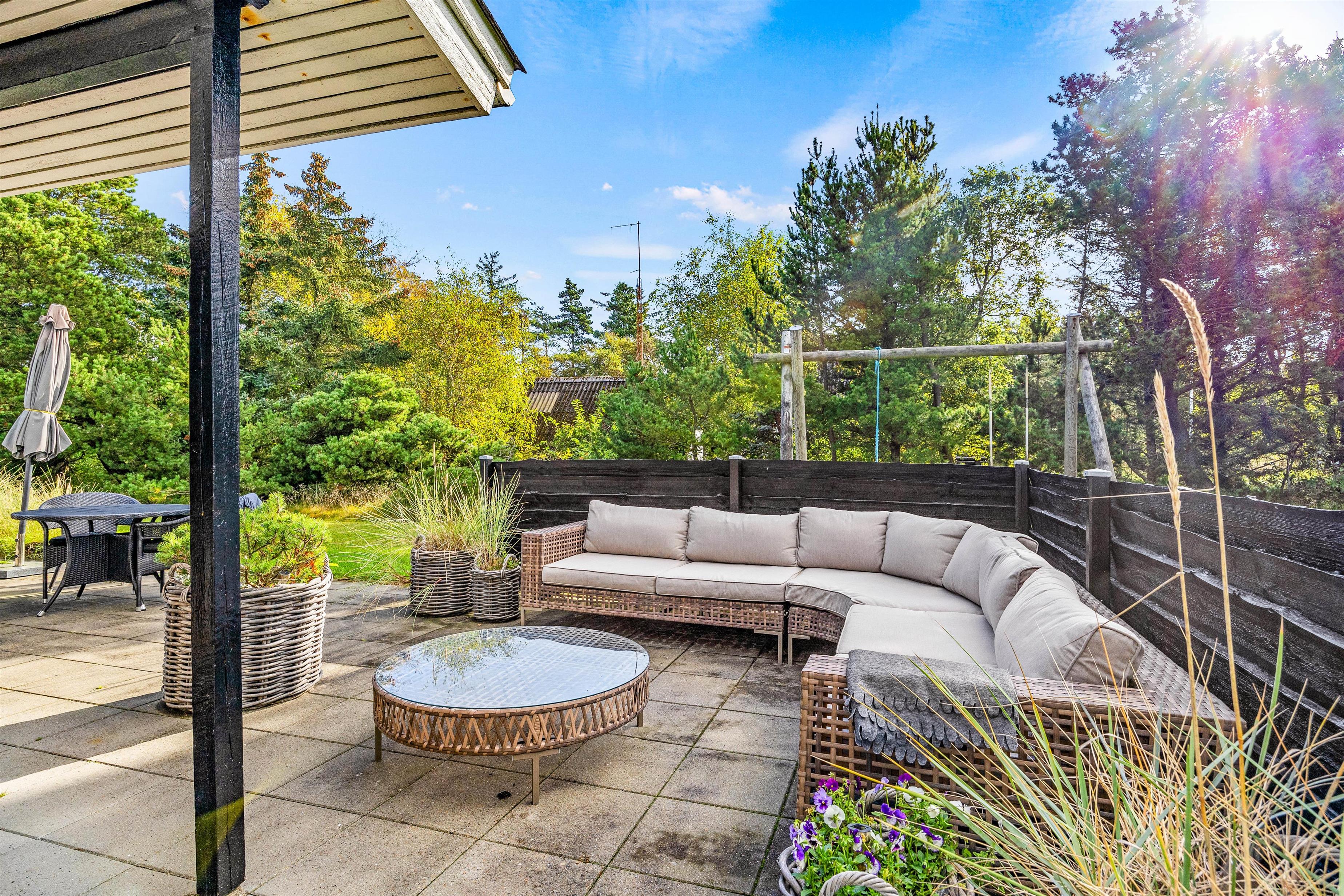 Fra alrummet er der direkte udgang til den fine terrasse. På terrassen, som delvist overdækket, finder I mange hyggelige siddepladser. Her står havemøblerne og et hyggeligt loungemøbel klar til jer! Slå benene op, læs en god bog og se børnene lege i haven. Den grønne plæne er perfekt til boldspil, og på trampolinen kan de hoppe mod skyerne. Til familiens mindste er her både sandkasse og gynger.
