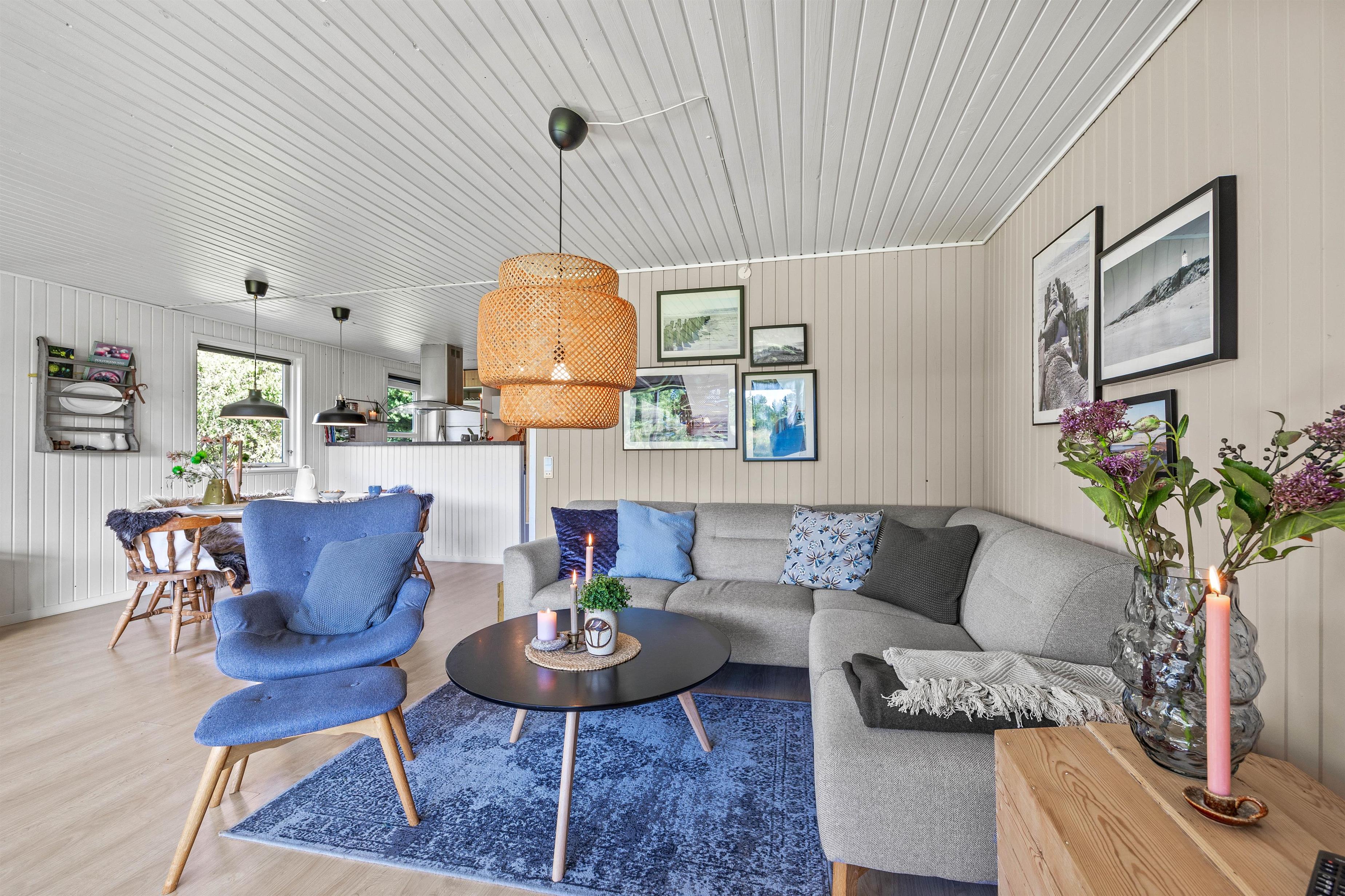 På Santoftevej 12 i Blåvand byder den hyggelige atmosfære jer velkommen indenfor. Her er 65 m2 og hjerterummet er det fine alrum, der binder det funktionelle køkken og stue sammen. Her varmer brændeovnen, og familien kan samles til mange gode stunder; uanset om det er til filmhygge i sofaen eller omkring et lækkert måltid. Skønt er her også en energibesparende varmepumpe, som sørger for et behageligt indeklima.