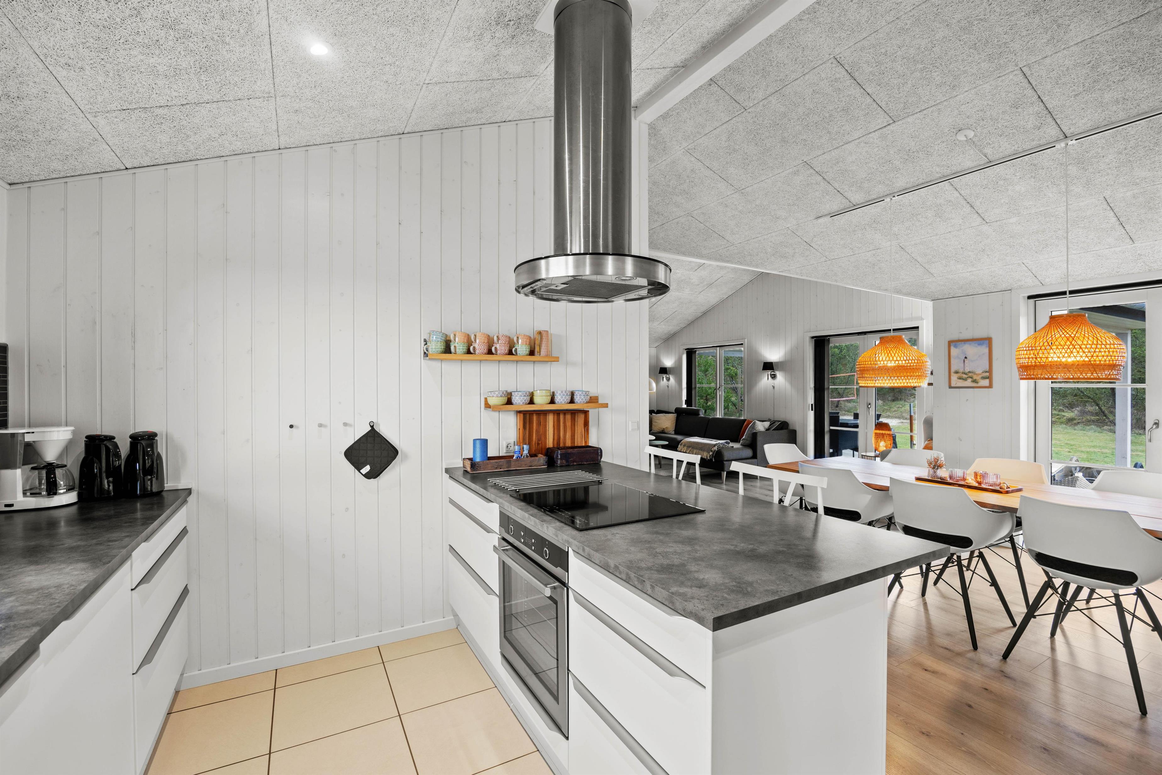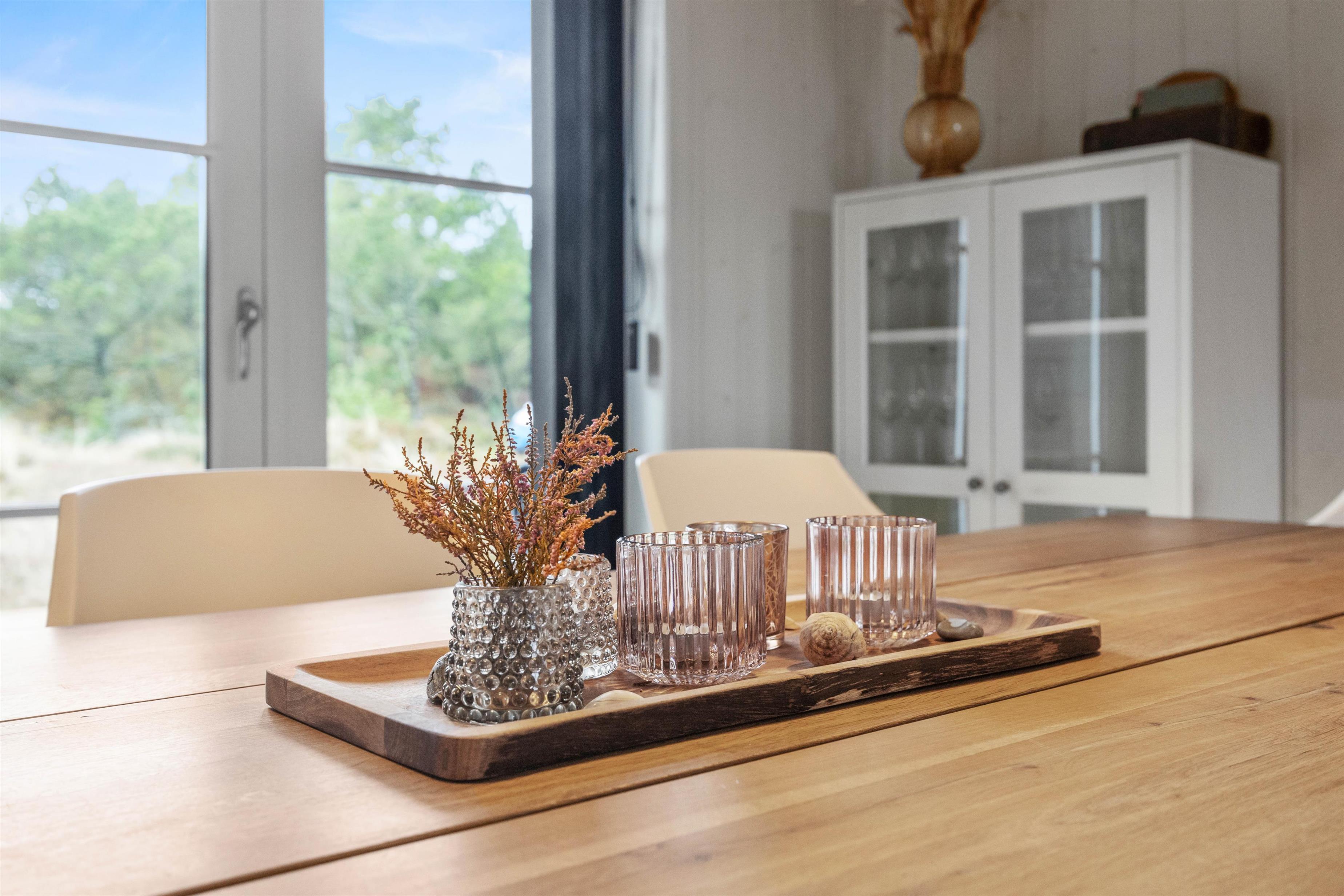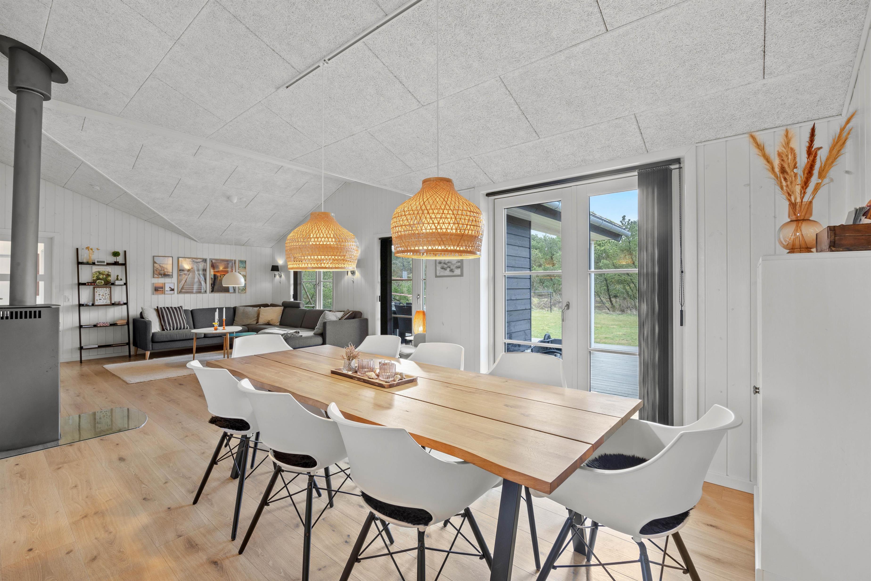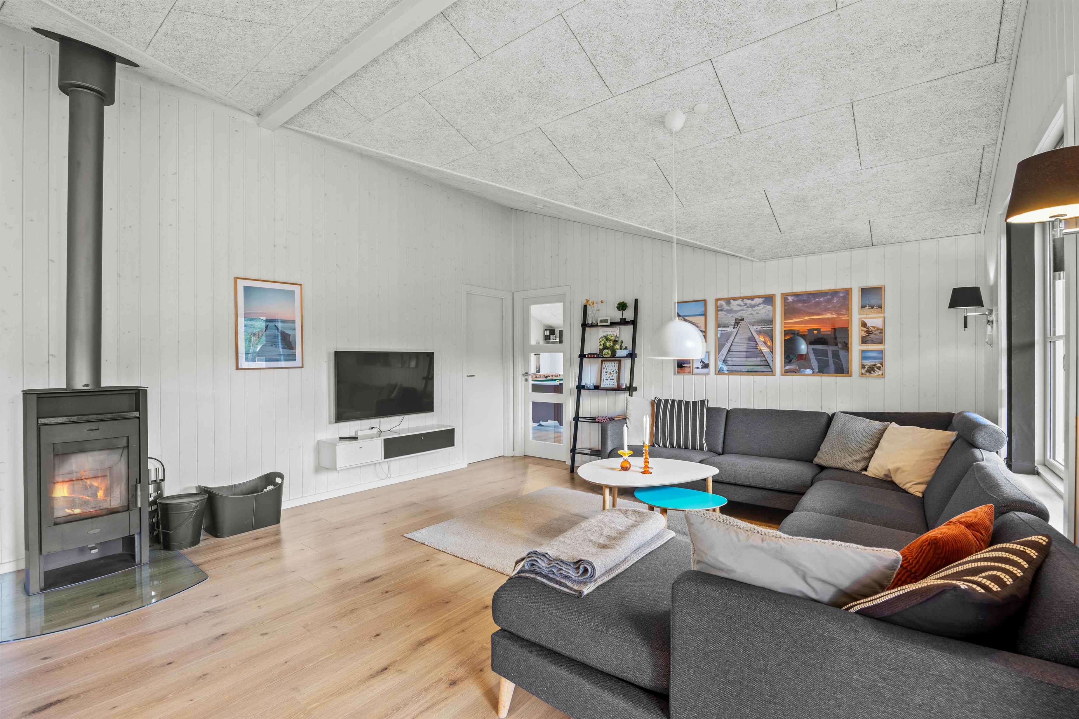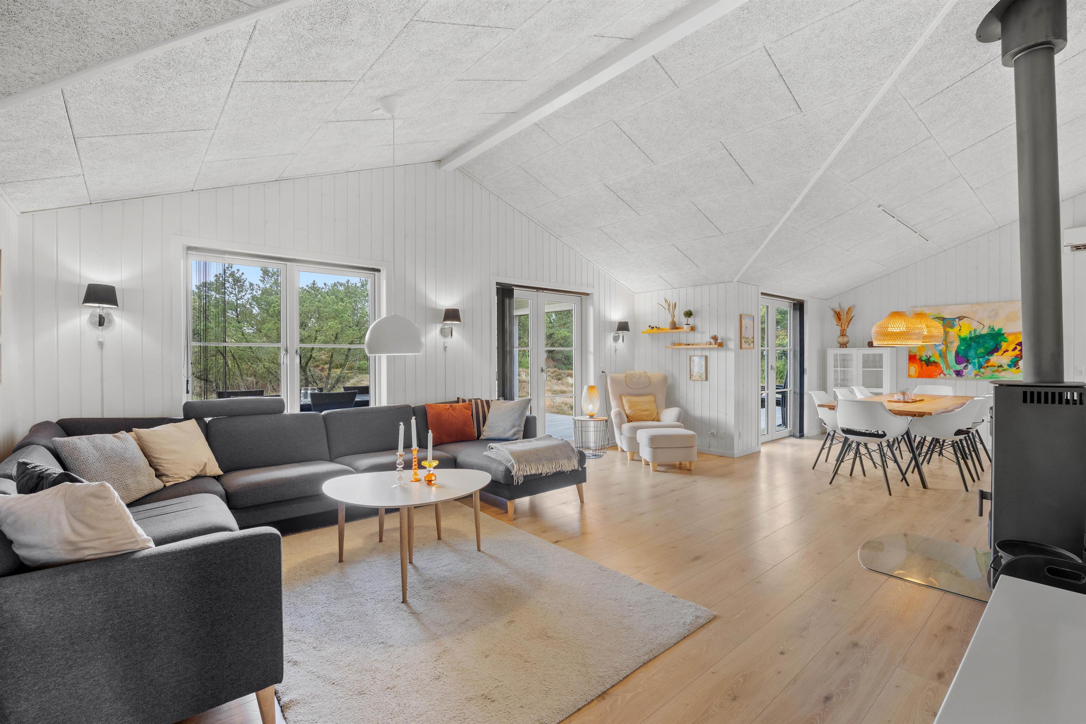 Lyse lofter, gulve og vægge, skaber sammen med en moderne og smagfuld indretning den helt rigtige ferieatmosfære. Stue- og spiseafdelingen med den hyggelige brændeovn fungerer som husets midtpunkt, og det veludstyrede køkken rummer alt, hvad feriekokkene har brug for.