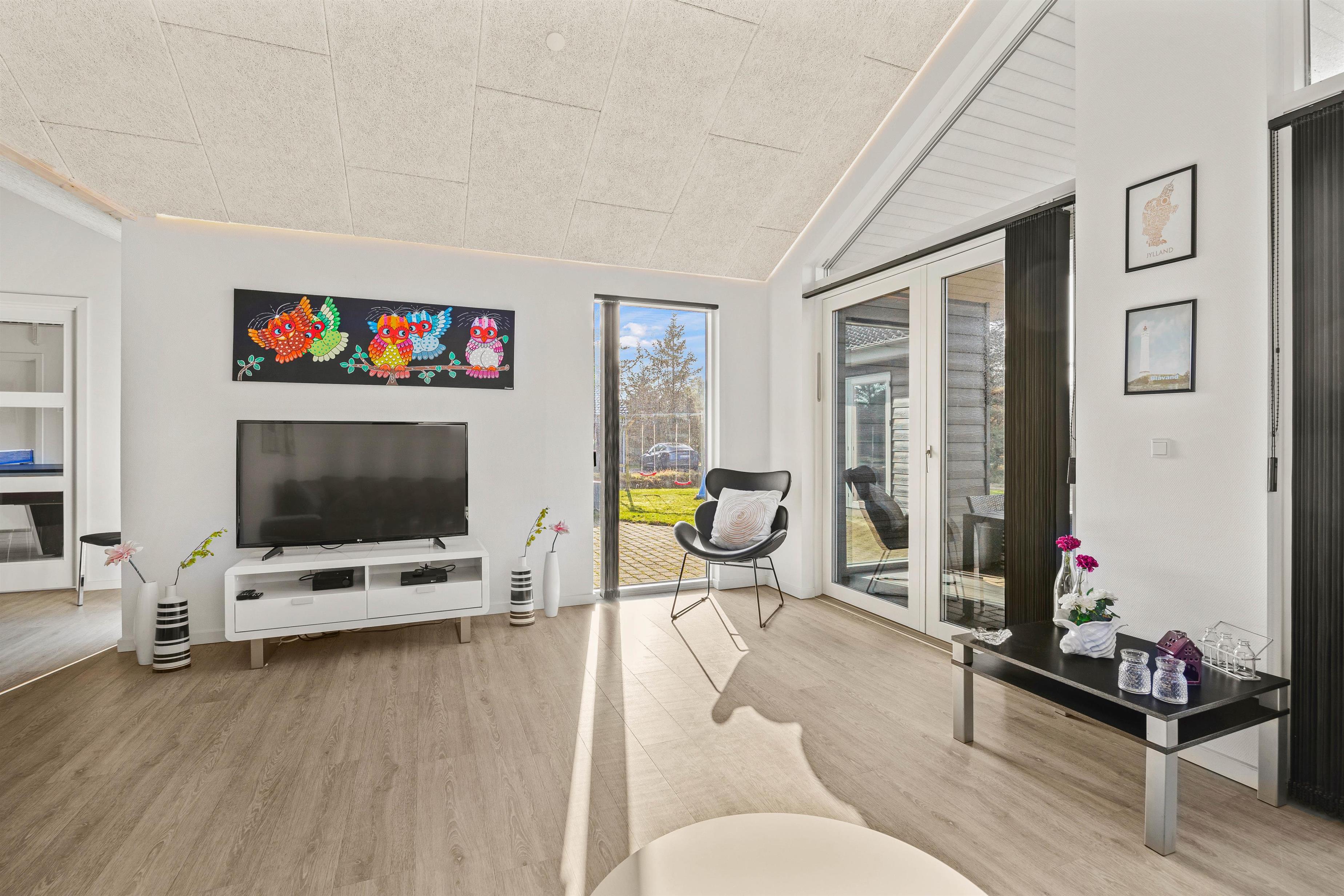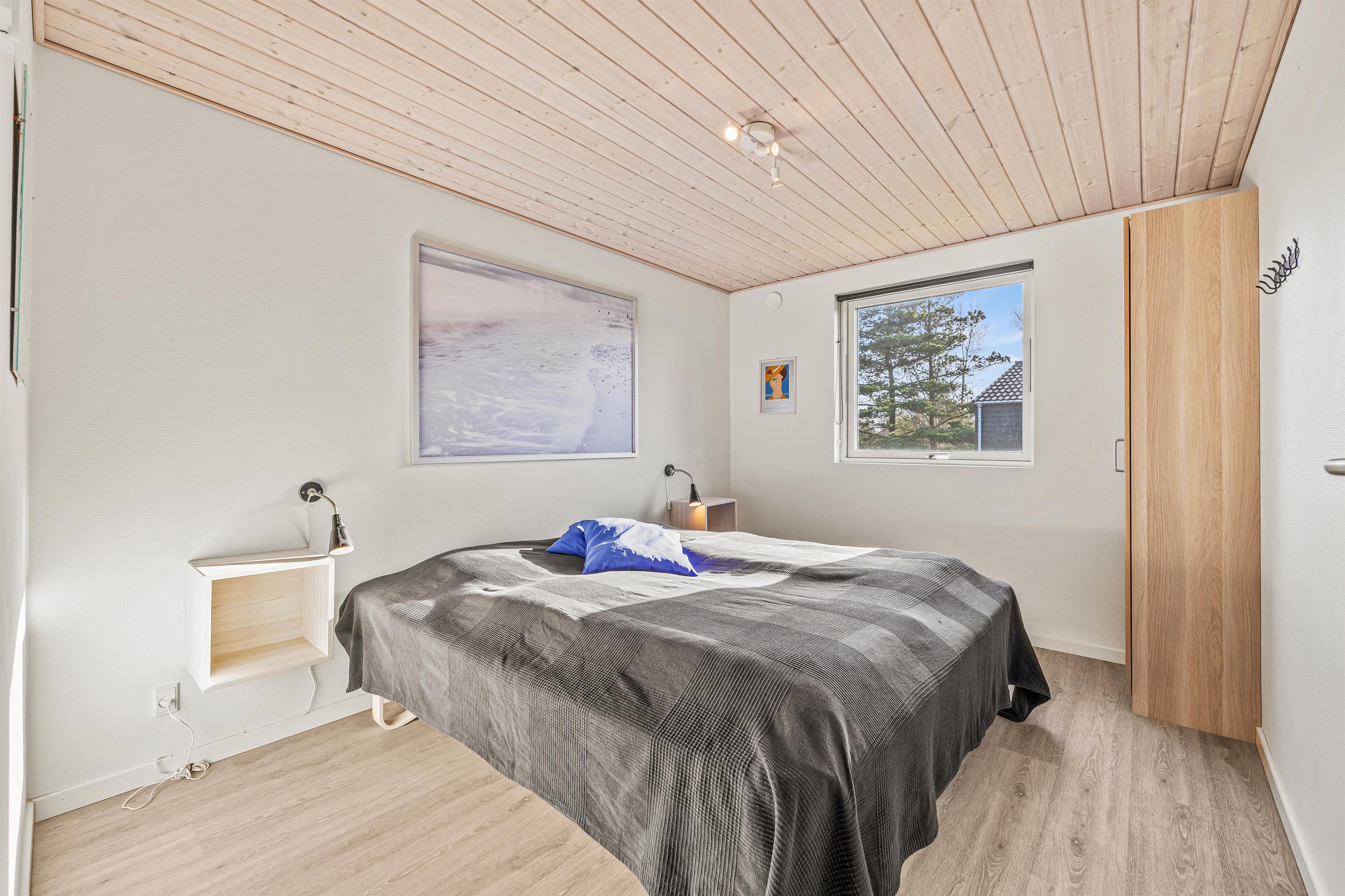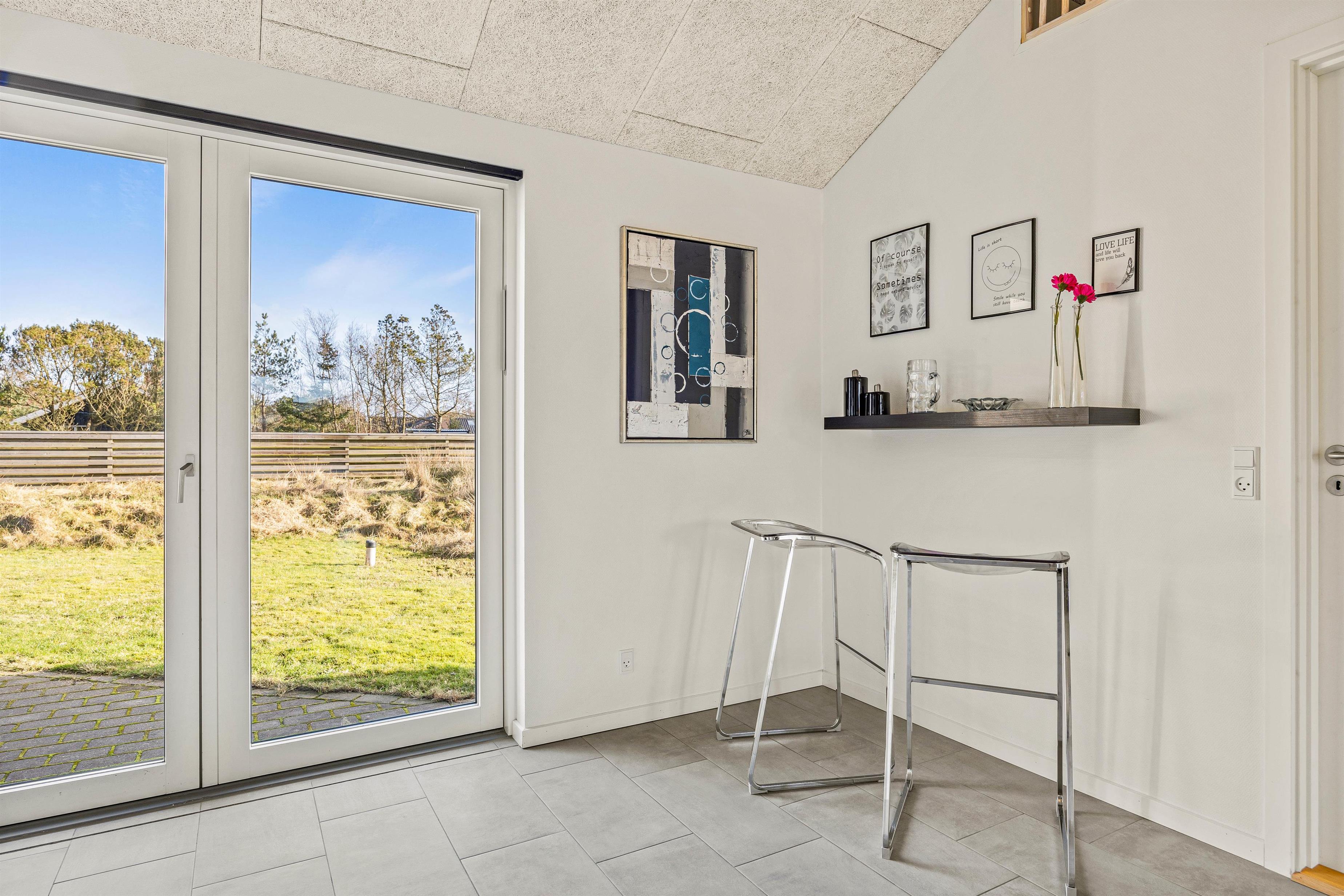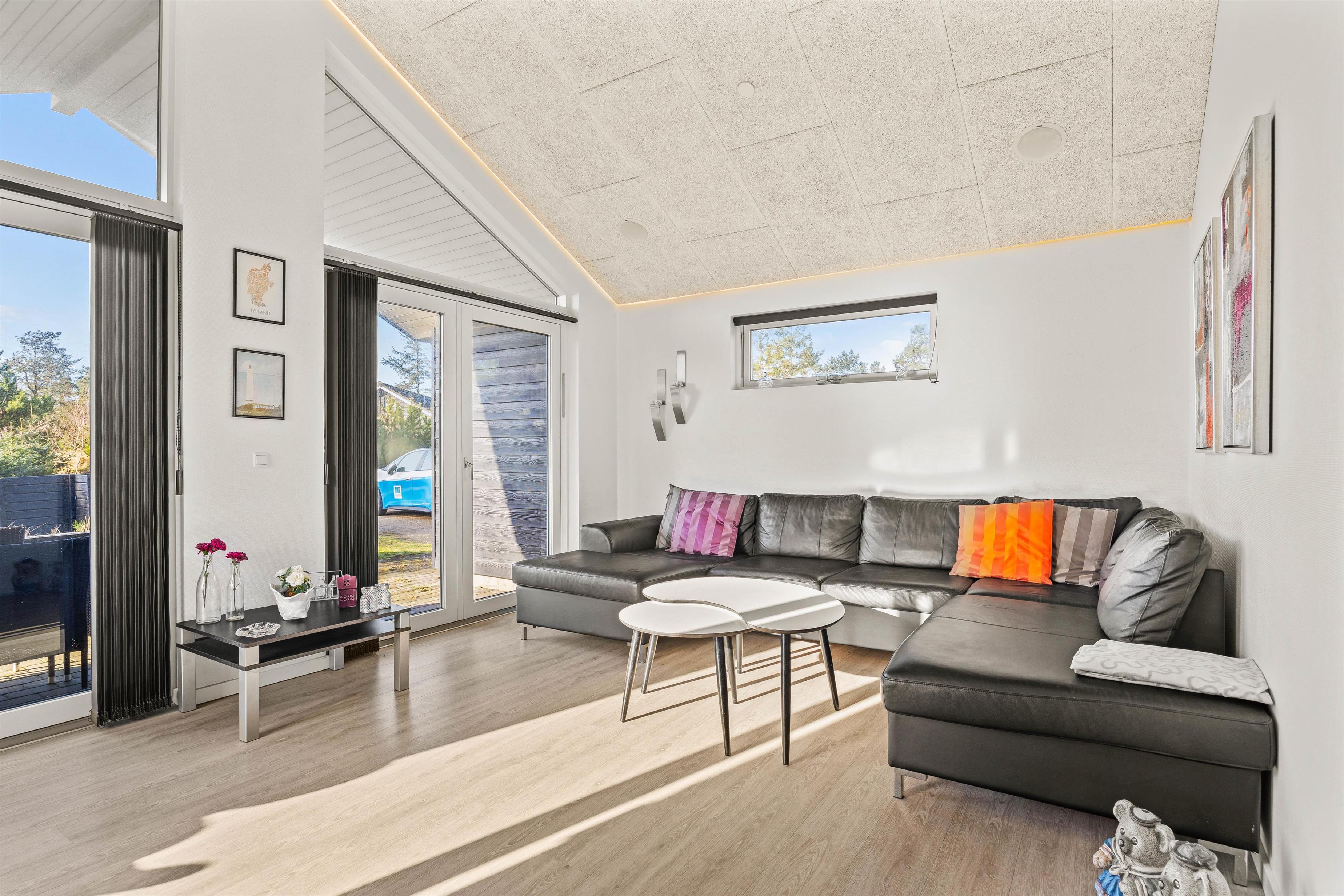 Sommerhuset er lyst og venligt indrettet i moderne stil. De store vinduespartier giver et godt lysindfald, og sammen med loft til kip skaber det en god og indbydende atmosfære i feriehuset.