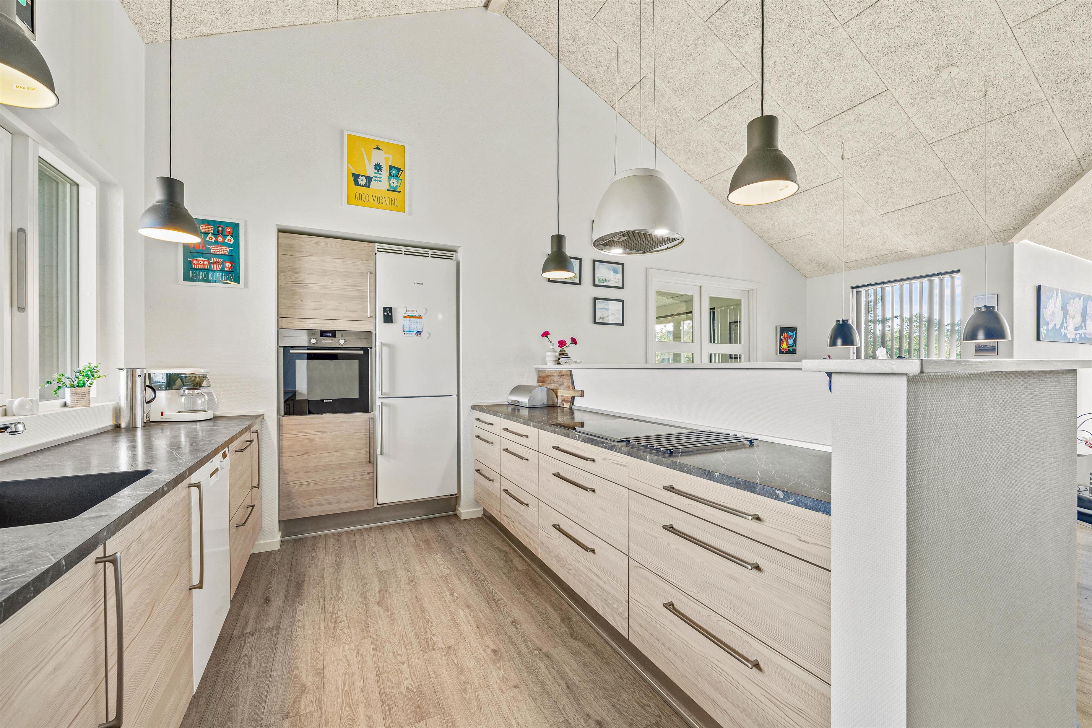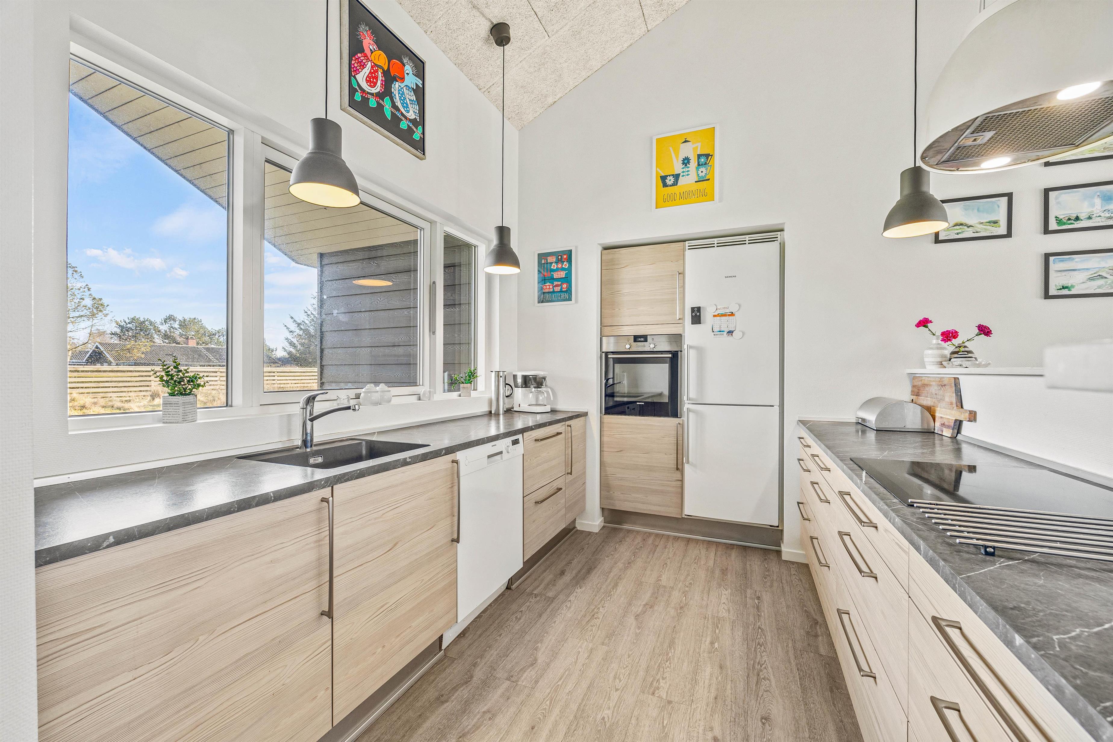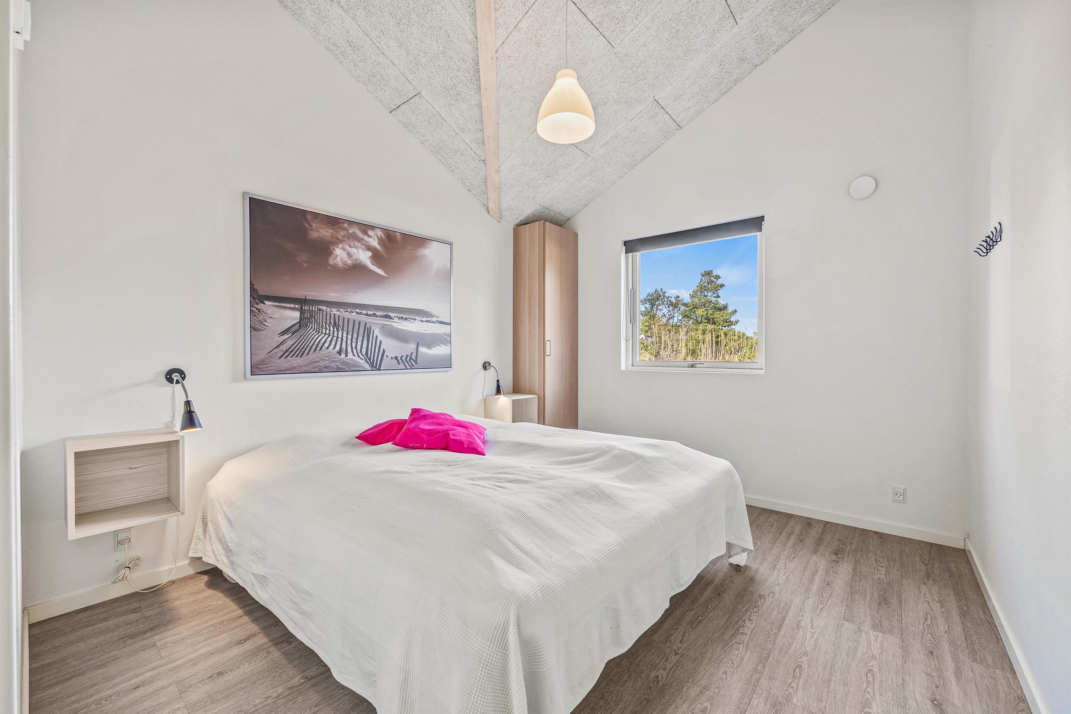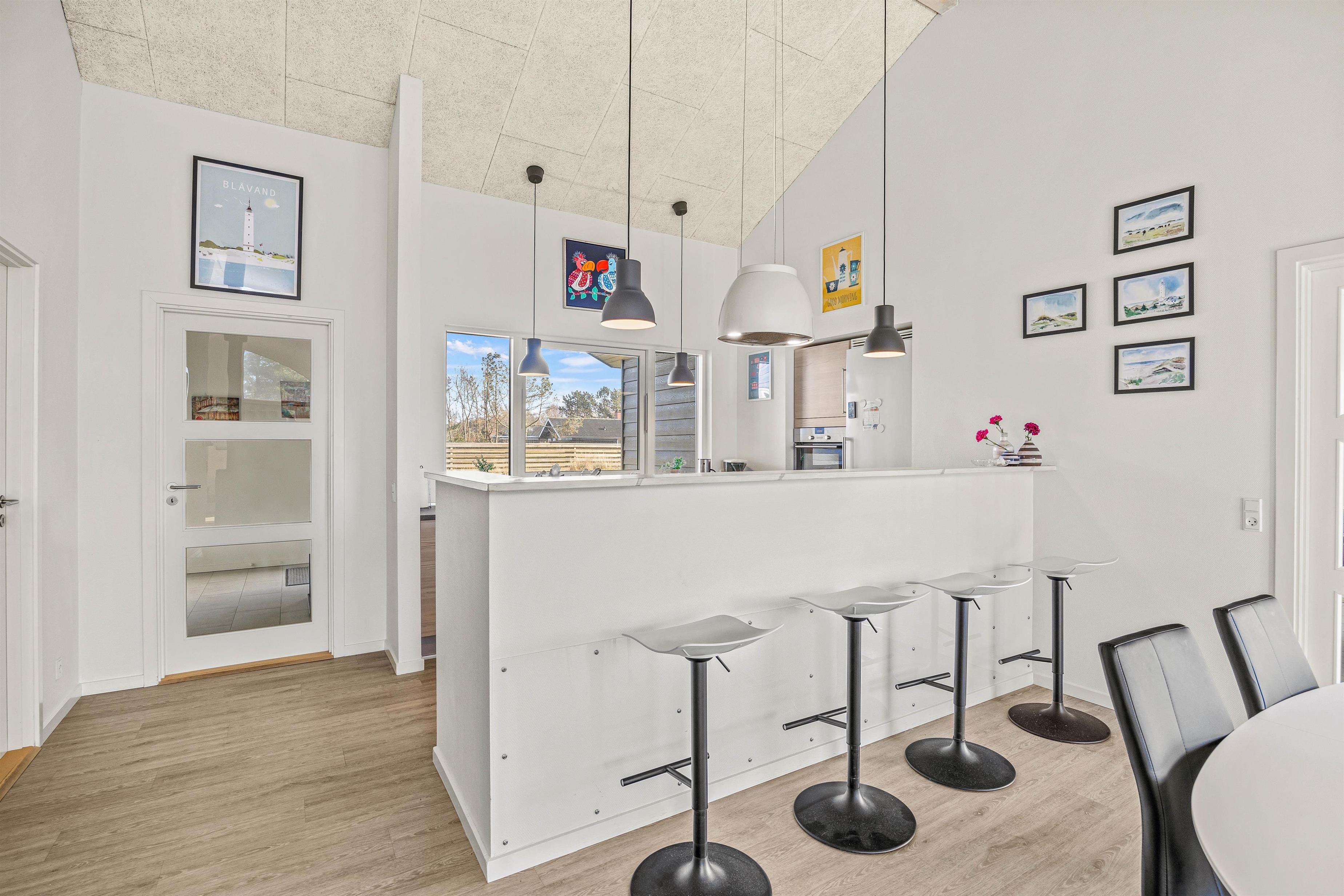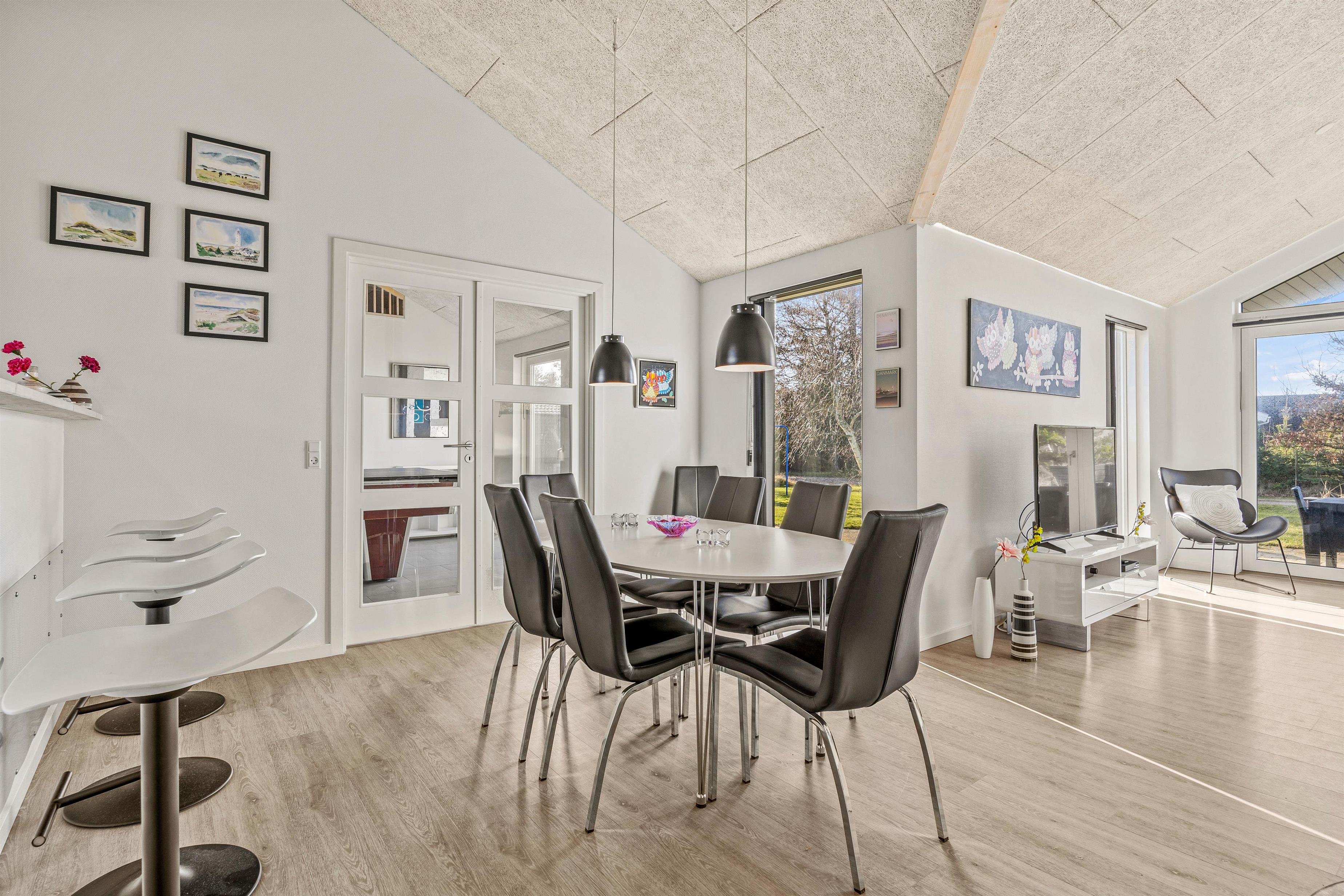 Sommerhuset er lyst og venligt indrettet i moderne stil. De store vinduespartier giver et godt lysindfald, og sammen med loft til kip skaber det en god og indbydende atmosfære i feriehuset.