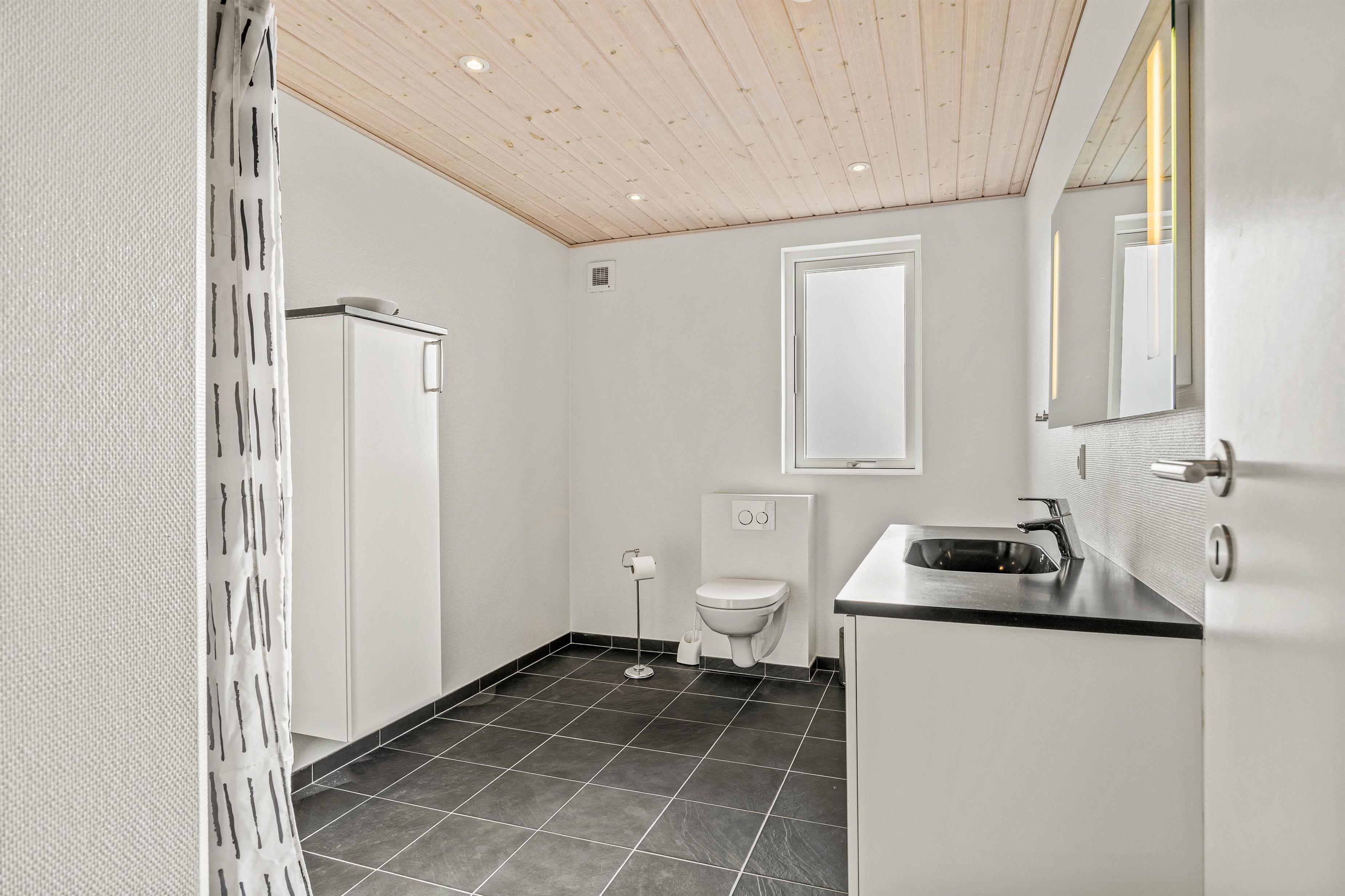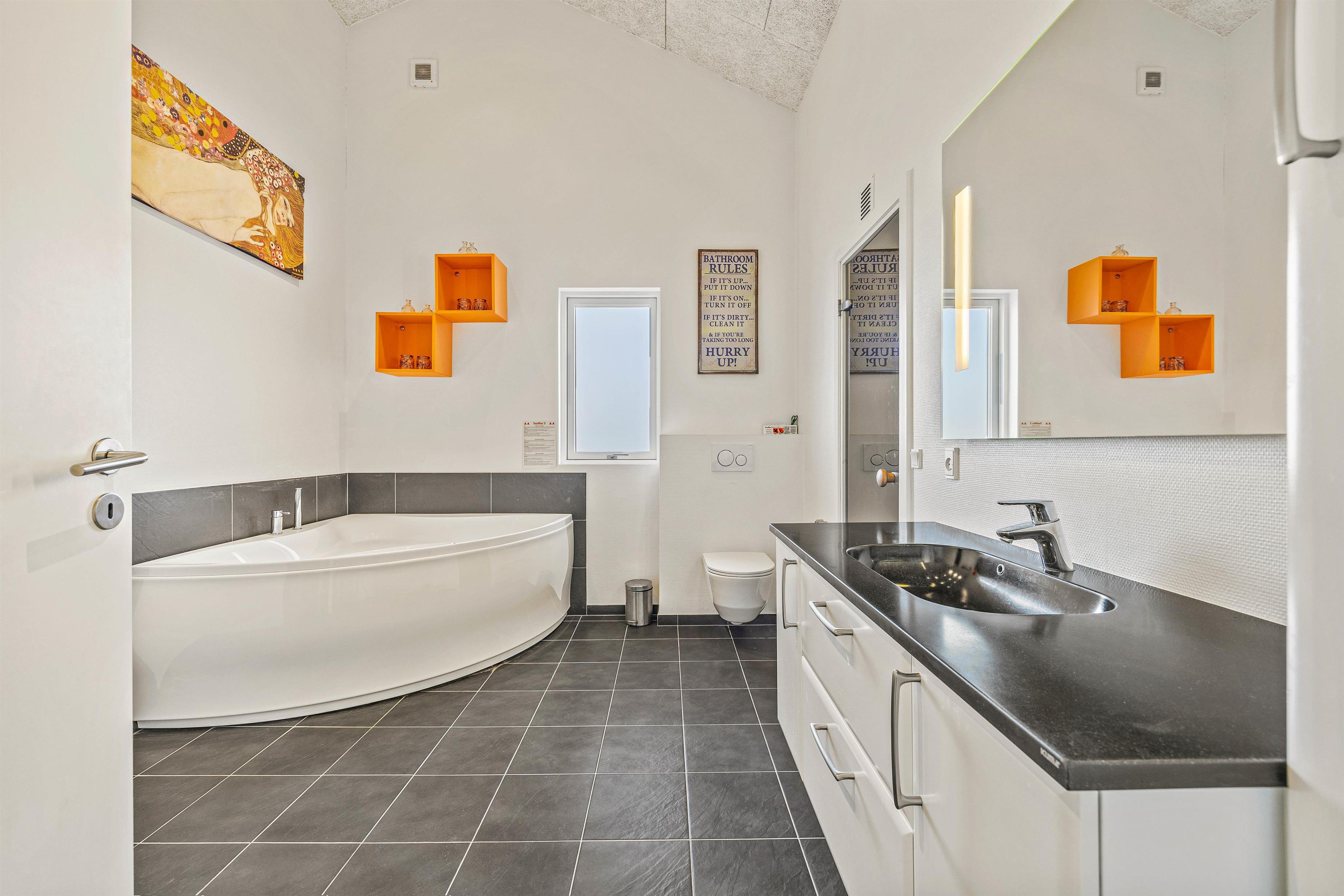 Efter et par timer med aktivitet, kan I velfortjent nyde en afslappende stund i det varme, boblende vand i spabadet efterfulgt af en tur i den varme sauna. Det er afslapning og velvære på højt plan. Spabad og sauna er placeret på det ene af feriehusets i alt 2 badeværelser, der begge er udstyret med gulvvarme.