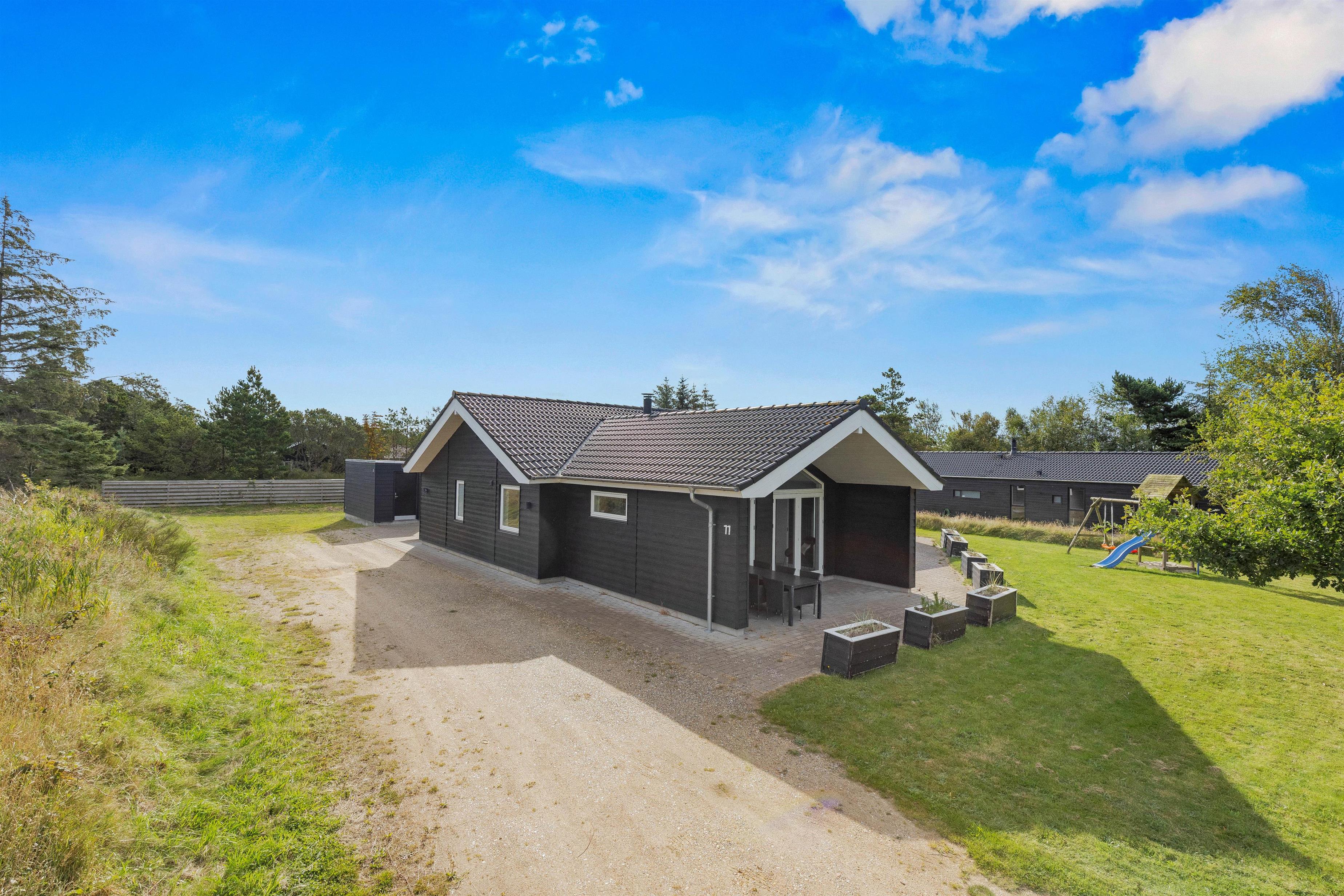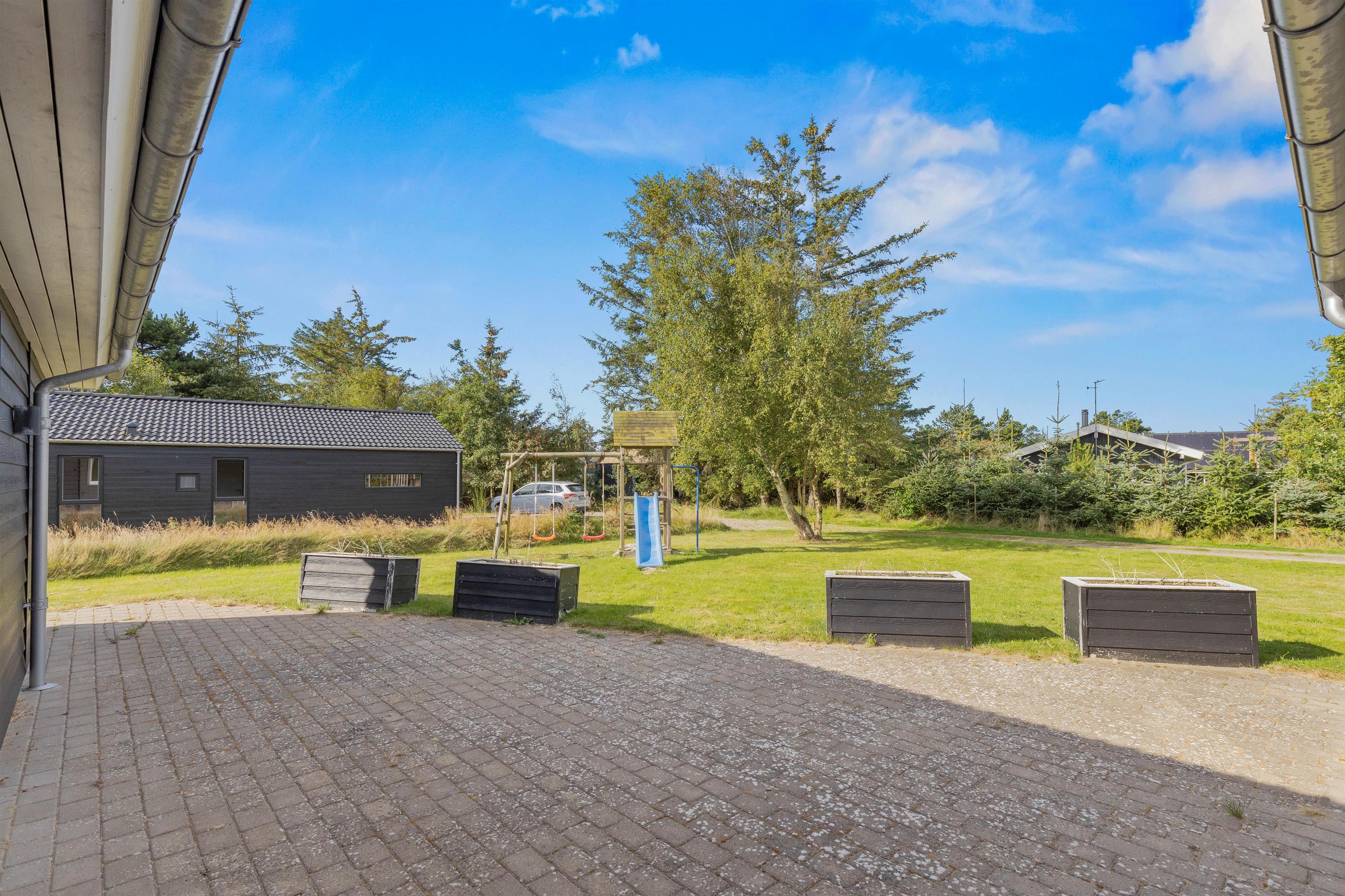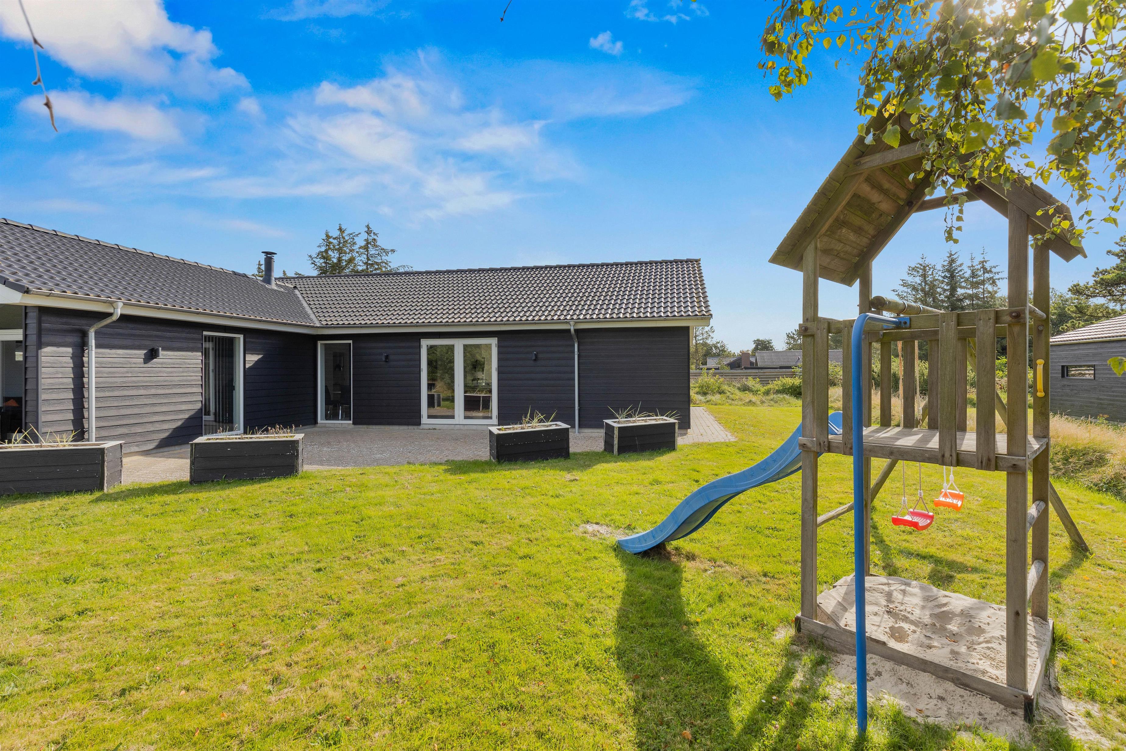Sommerhuset ligger på en fin plænegrund, hvor børn og barnlige sjæle kan lege og spille. Til familiens yngste er der et gyngestativ og en sandkasse.