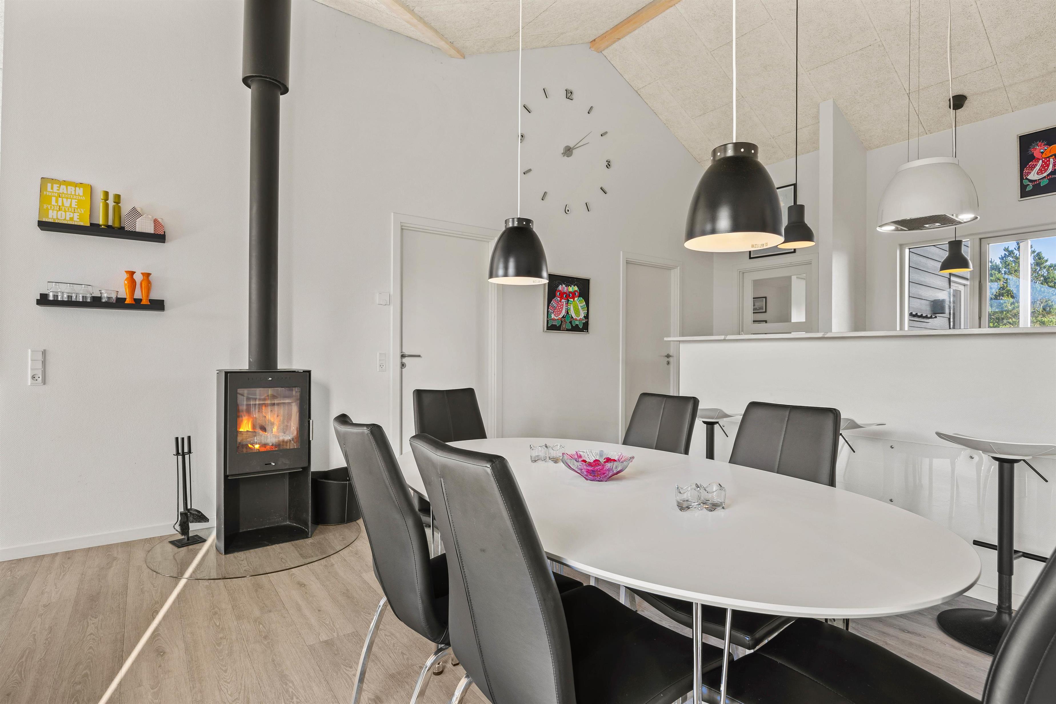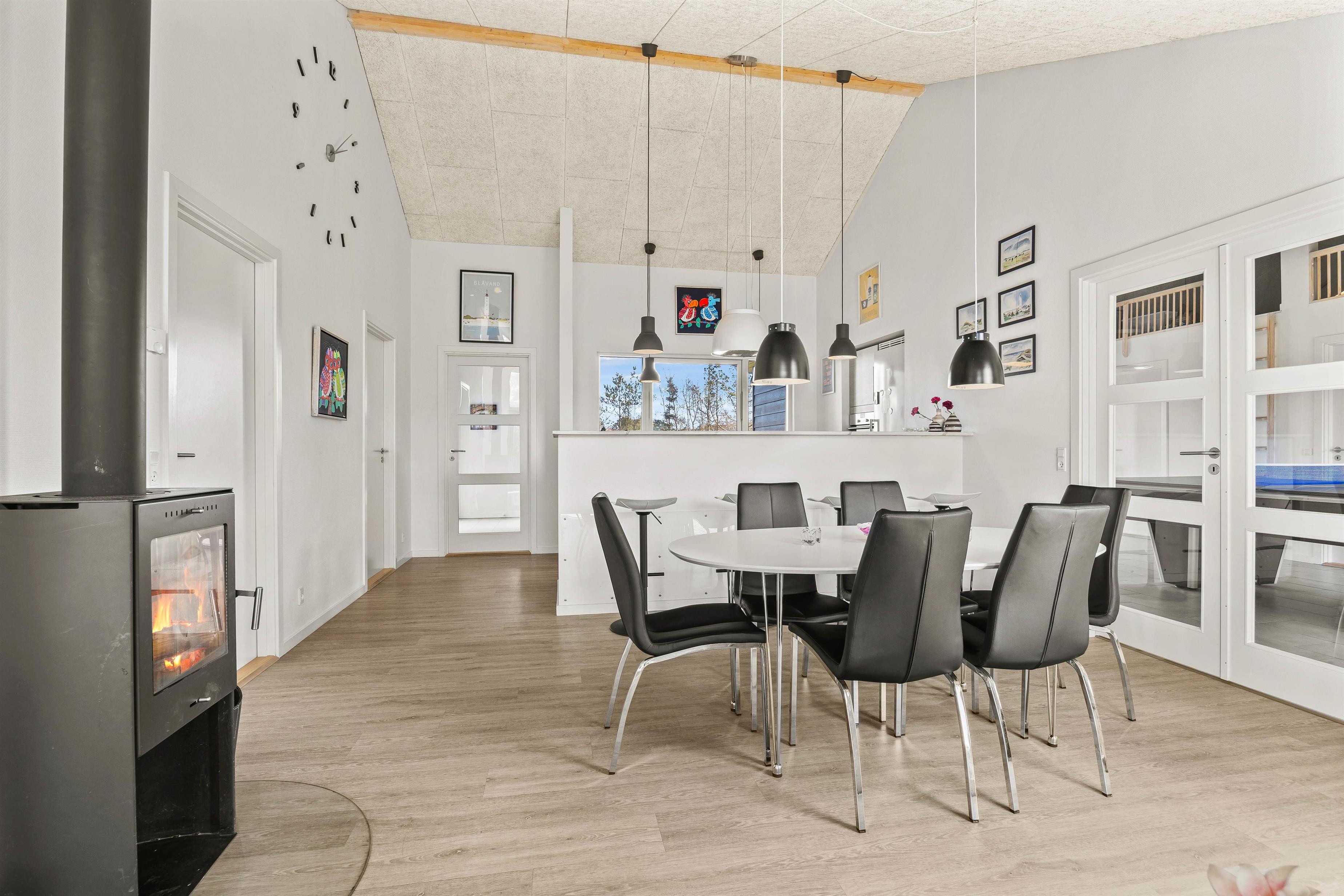 Når I træder ind ad døren til sommerhuset, kommer I som det første ind i den rummelige entré. Her er der god plads til sko og overtøj, og her er der også vaskemaskine og tørretumbler til jeres rådighed. Træder I længere ind, kommer I til det store alrum. Her kan hele familien samles om madlavningen, nyde et lækkert måltid ved spisebordet og slappe af i stuens sofa. Her sørger brændeovnen for en dejlig varme, mens I kan nyde en god film i fjernsynet.