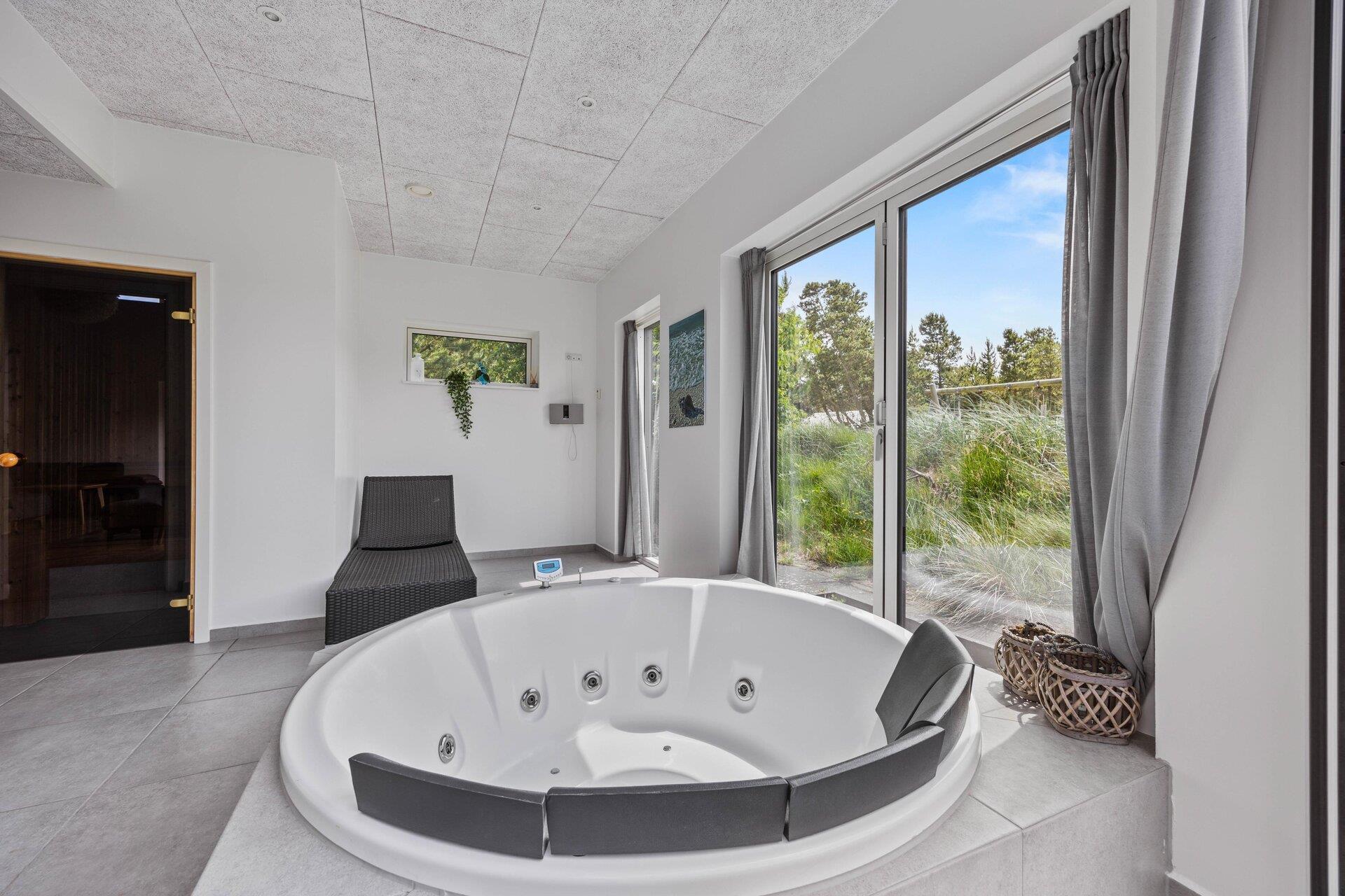 Det nyligt opførte feriehus byder både på afslapning og underholdning. I den ene ende af huset finder I jeres helt egen wellnessafdeling med et stort spabad og en lækker sauna, hvor fridagene rigtig kan nydes, og I kan tanke ny energi langt væk fra den travle hverdag.
