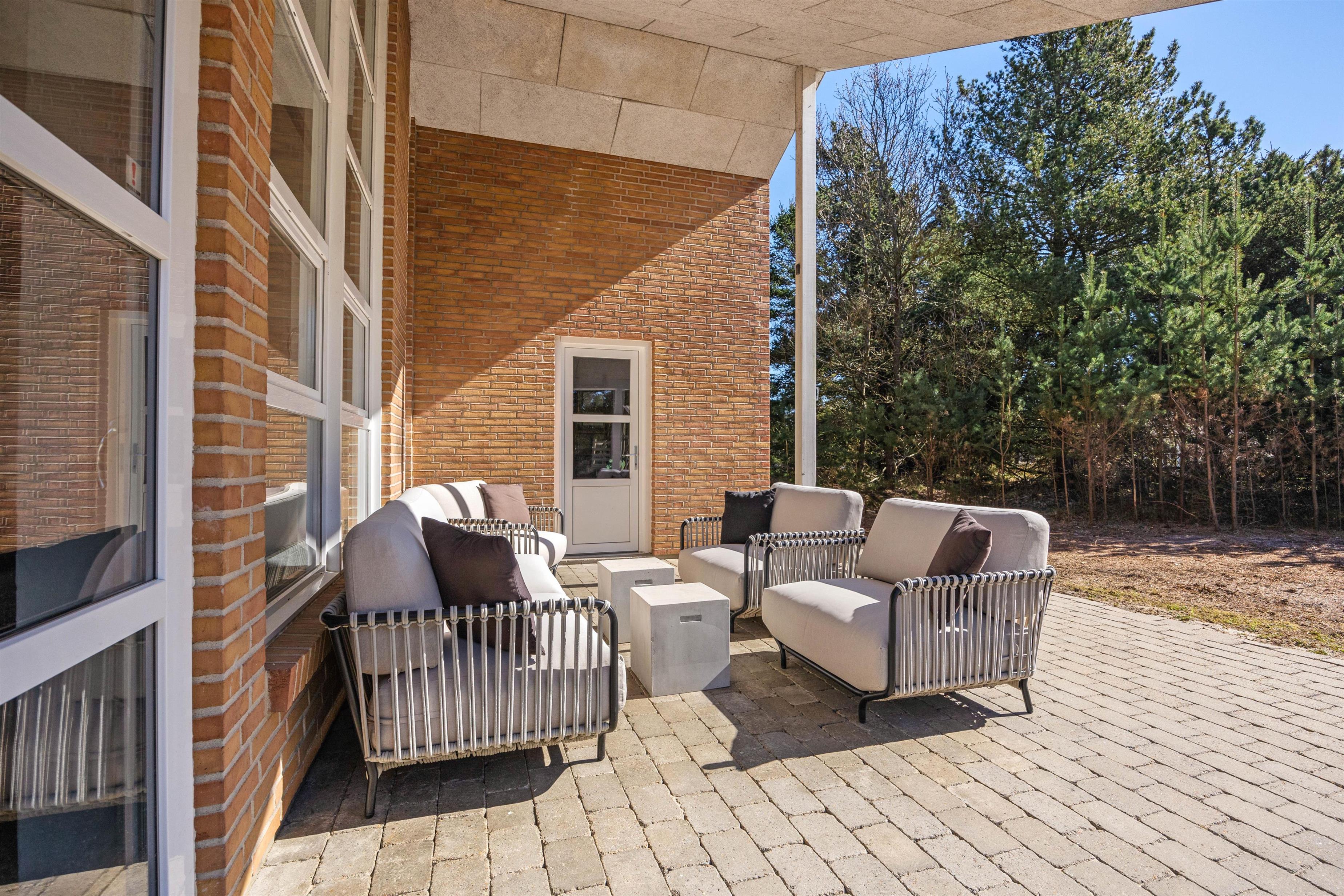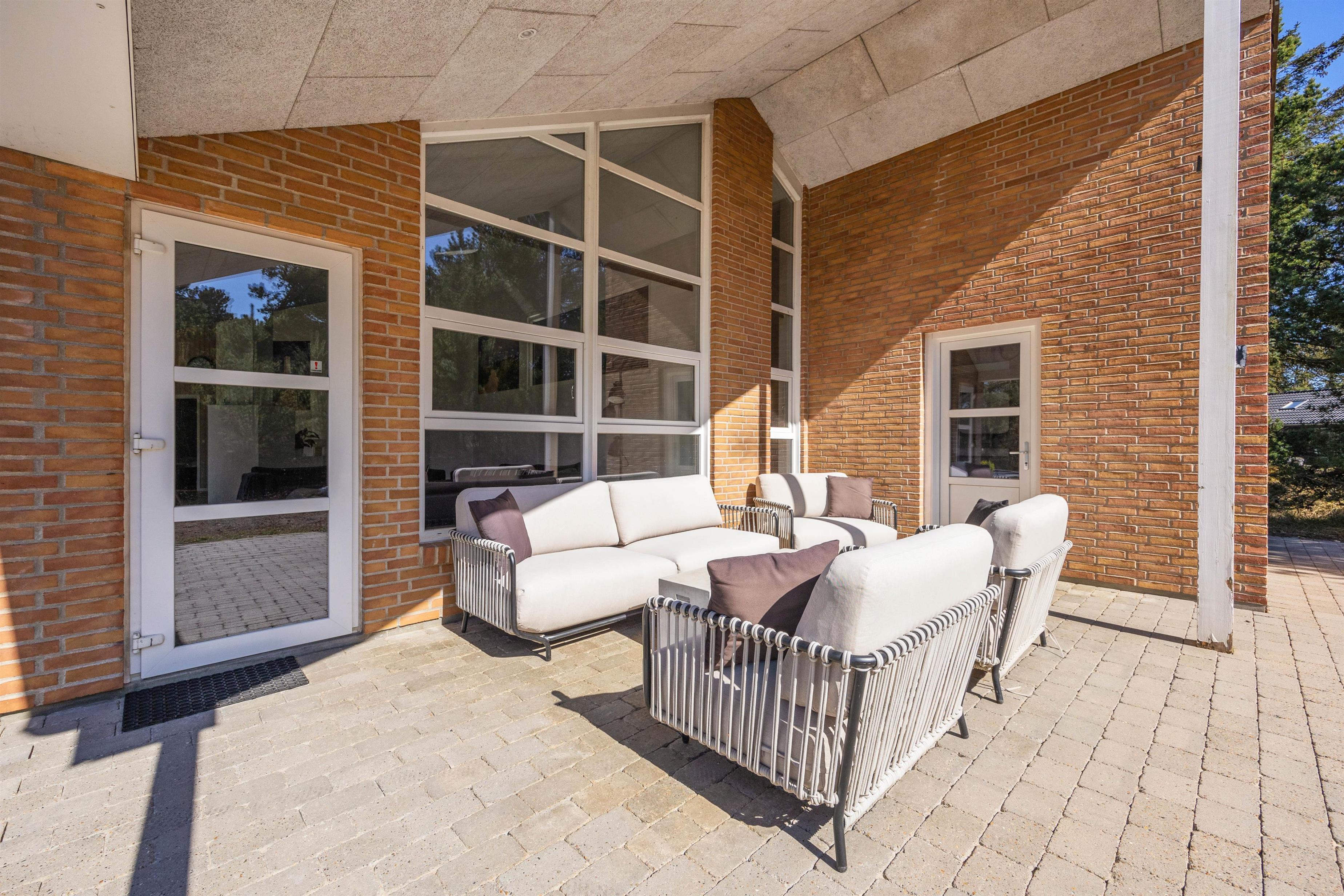 De store terrasser, både overdækkede og åbne, indbyder til alt fra solbadning til lange sommeraftener med lækker mad fra grillen og afslapning i de store loungemøbler.