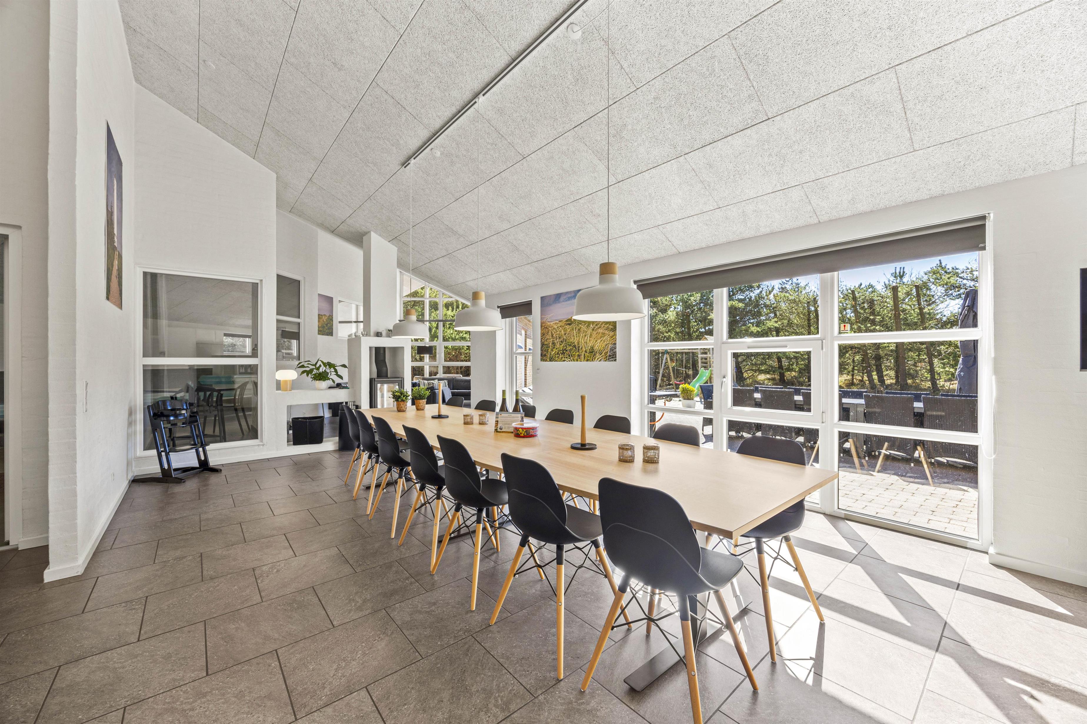 Husets hjerte er det store, lyse køkken-alrum, som flyder naturligt sammen med den hyggelige stue – kun delt af en stemningsfuld brændeovn, der spreder varme og charme på tværs af rummene. Her er der god plads til hele flokken, uanset om I laver mad sammen, spiller brætspil og deler ferieminder eller slænger jer i sofaerne.