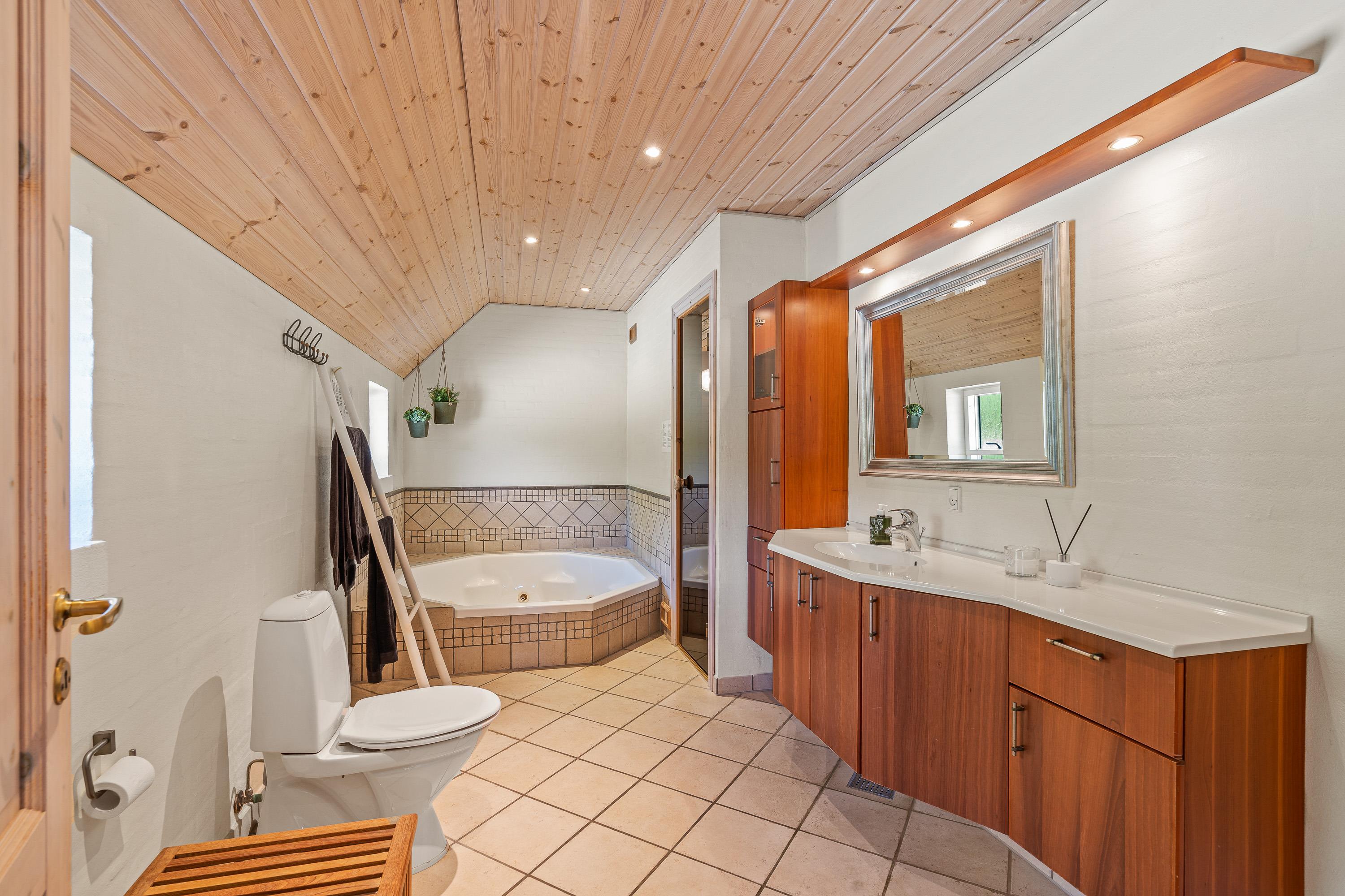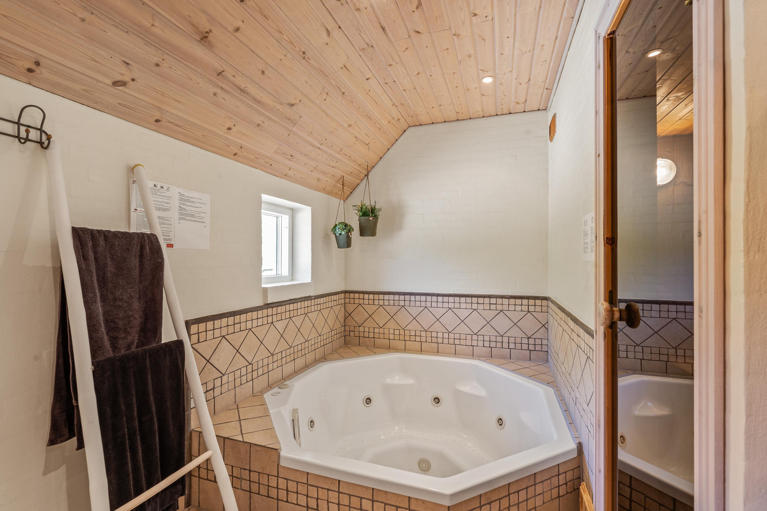 Sommerhusets helt store højdepunkter finder I på det ene af badeværelserne i feriehuset. Her venter jer nemlig et lækkert spabad og en skøn sauna, der inviterer til afslappende stunder i løbet af jeres ferie, hvor I kan komme helt ned i gear, så I kan få ladt batterierne op.
