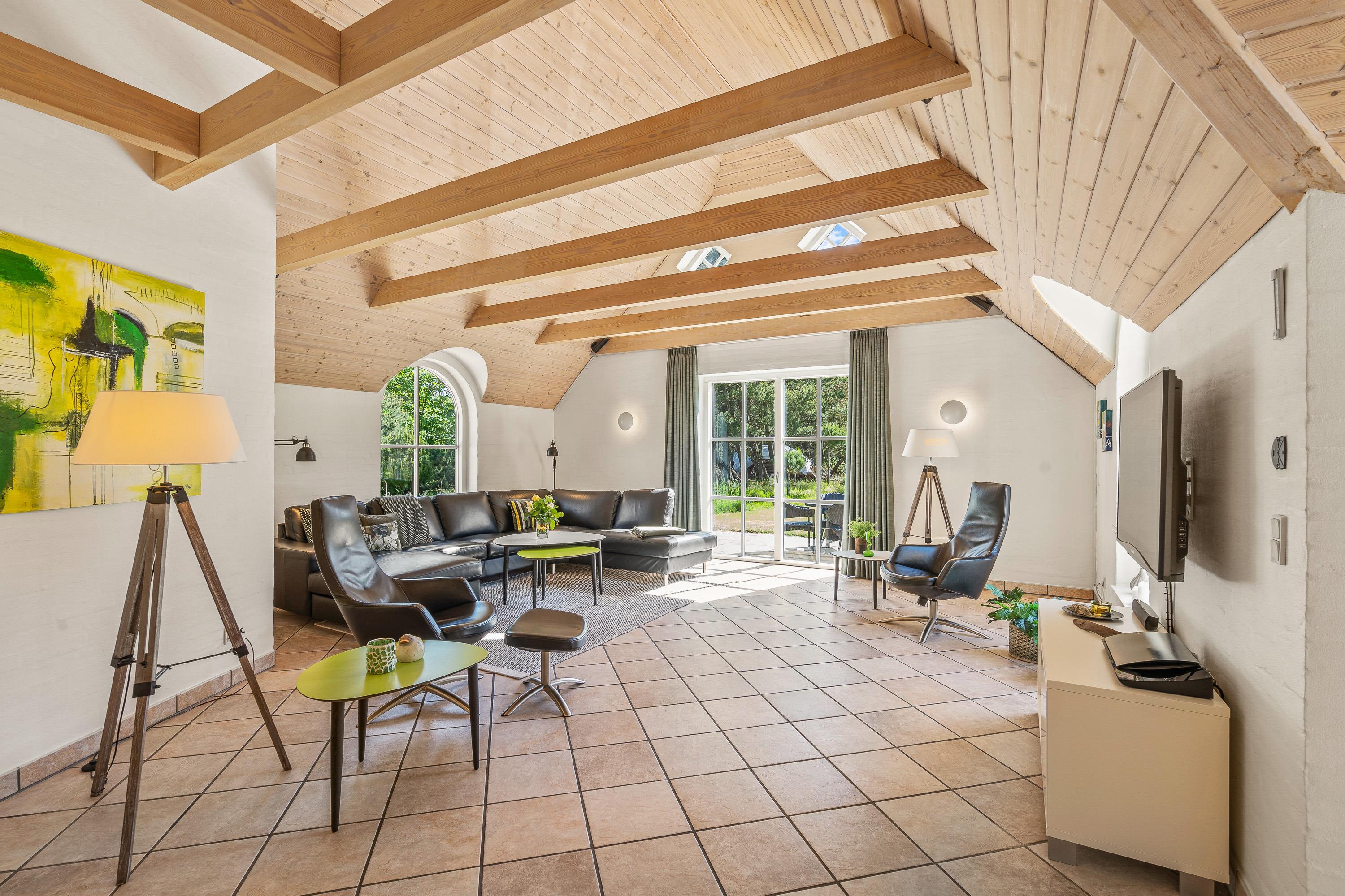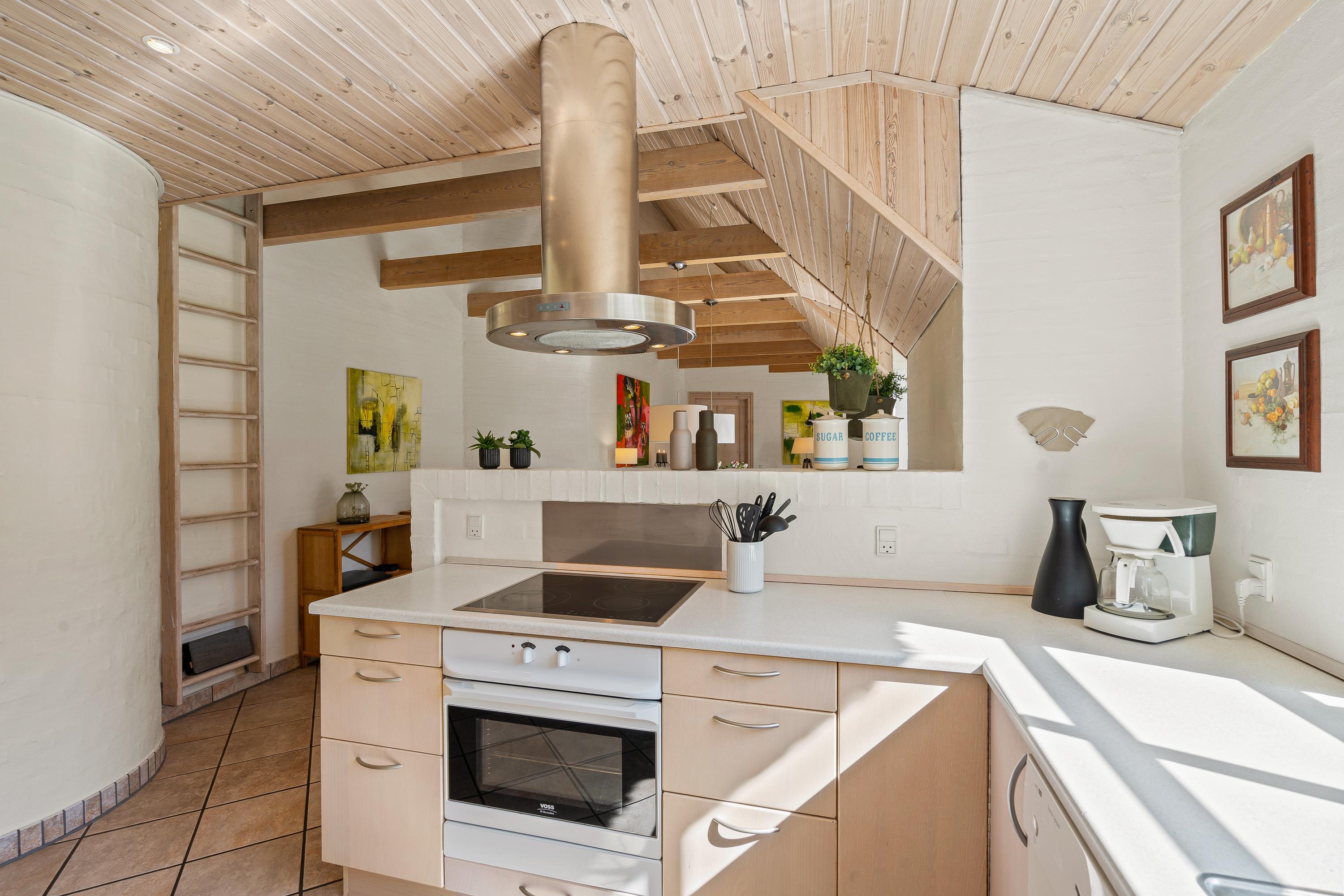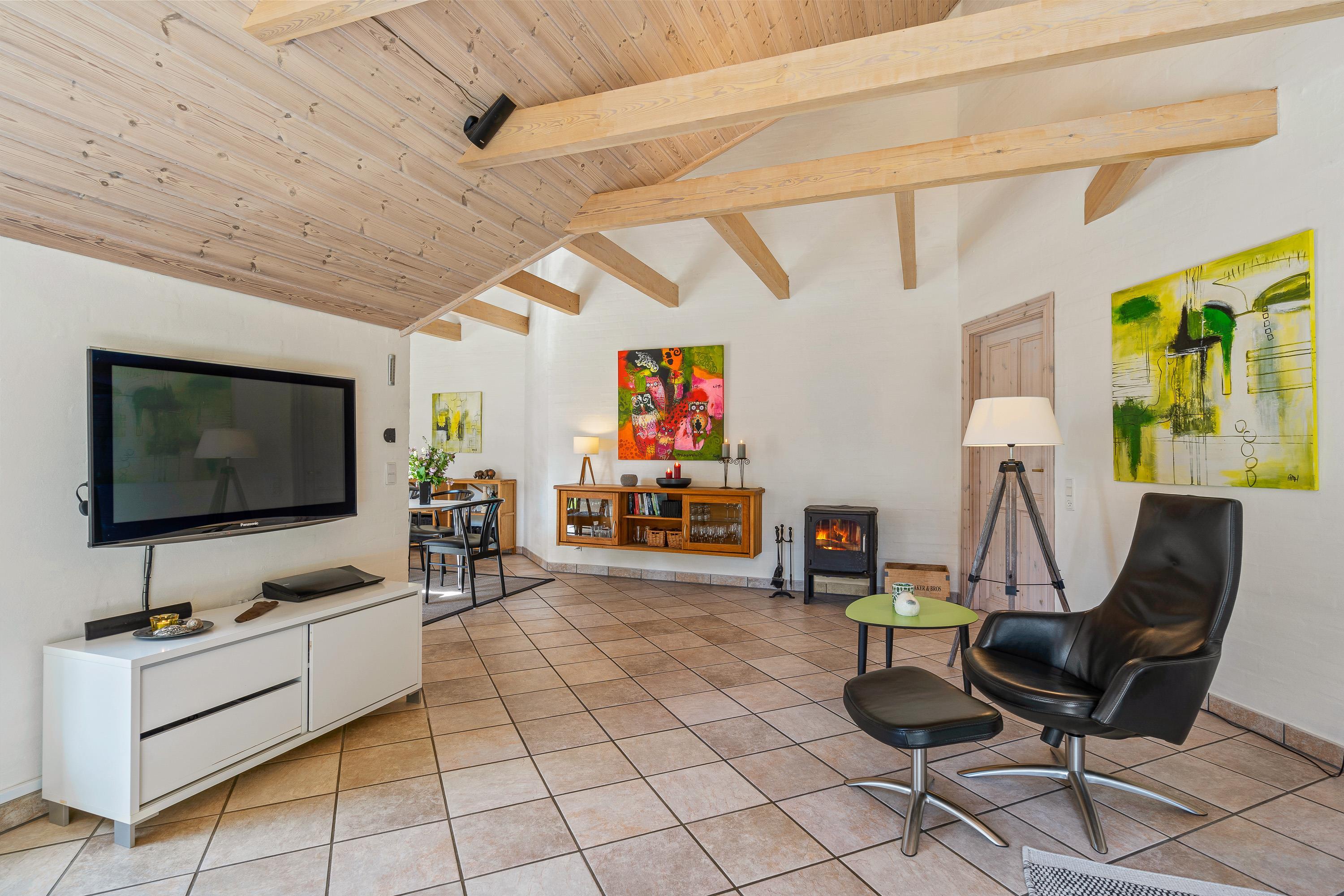 Det store samlingspunkt er utvivlsomt det hyggelige alrum med brændeovn, hvor køkkenet ligger i åben forbindelse med spisestuen og stuen. Her har I rig mulighed for at nyde hinandens selskab, selv når nogle står for madlavningen i køkkenet, og andre ser tv. På tv’et er der kun tyske kanaler, men takket være Chromecasten kan I streame jeres yndlingsfilm og -serier.