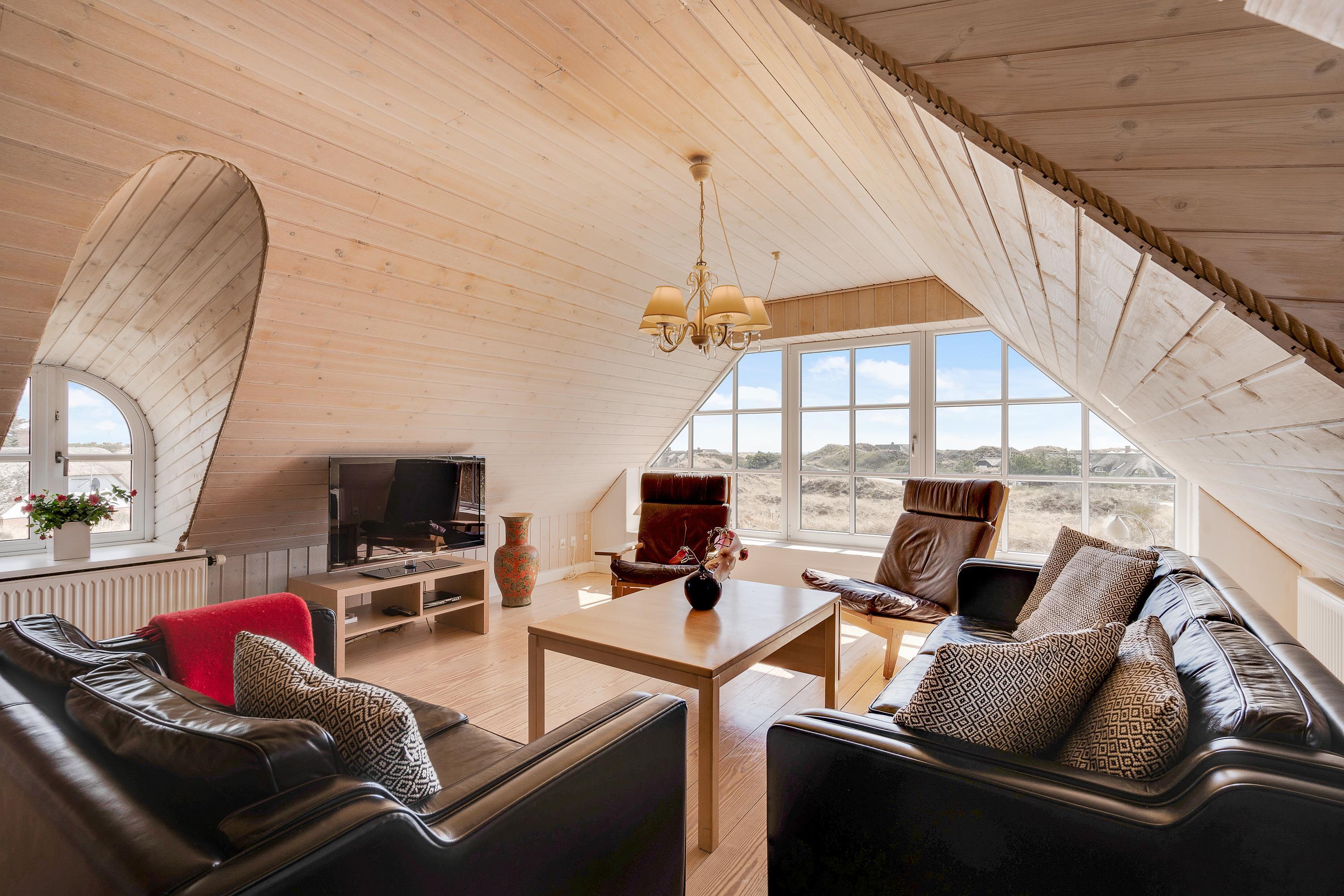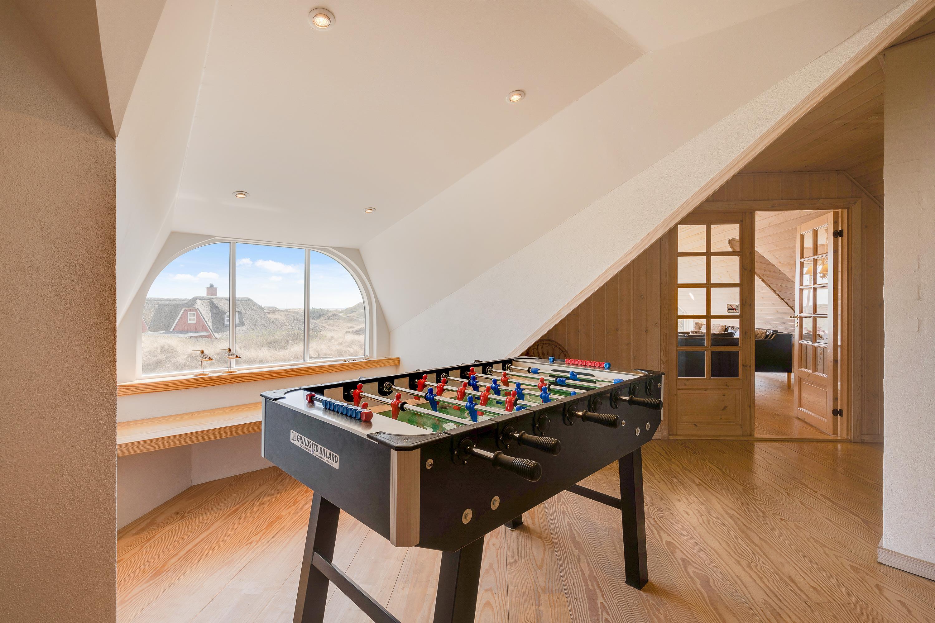 På første etage finder I endnu én opholdstue, hvor den smukke udsigt gør rummet helt unikt. Det store vinduesparti sørger både for en fantastisk panoramaudsigt ud over Blåvands natur og ikke mindst et dejligt lysindfald. På første etage finder I også et bordfodboldbord, og det er jo altid sjovt at udfordre hinanden til en omgang bordfodbold.