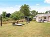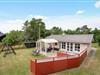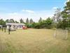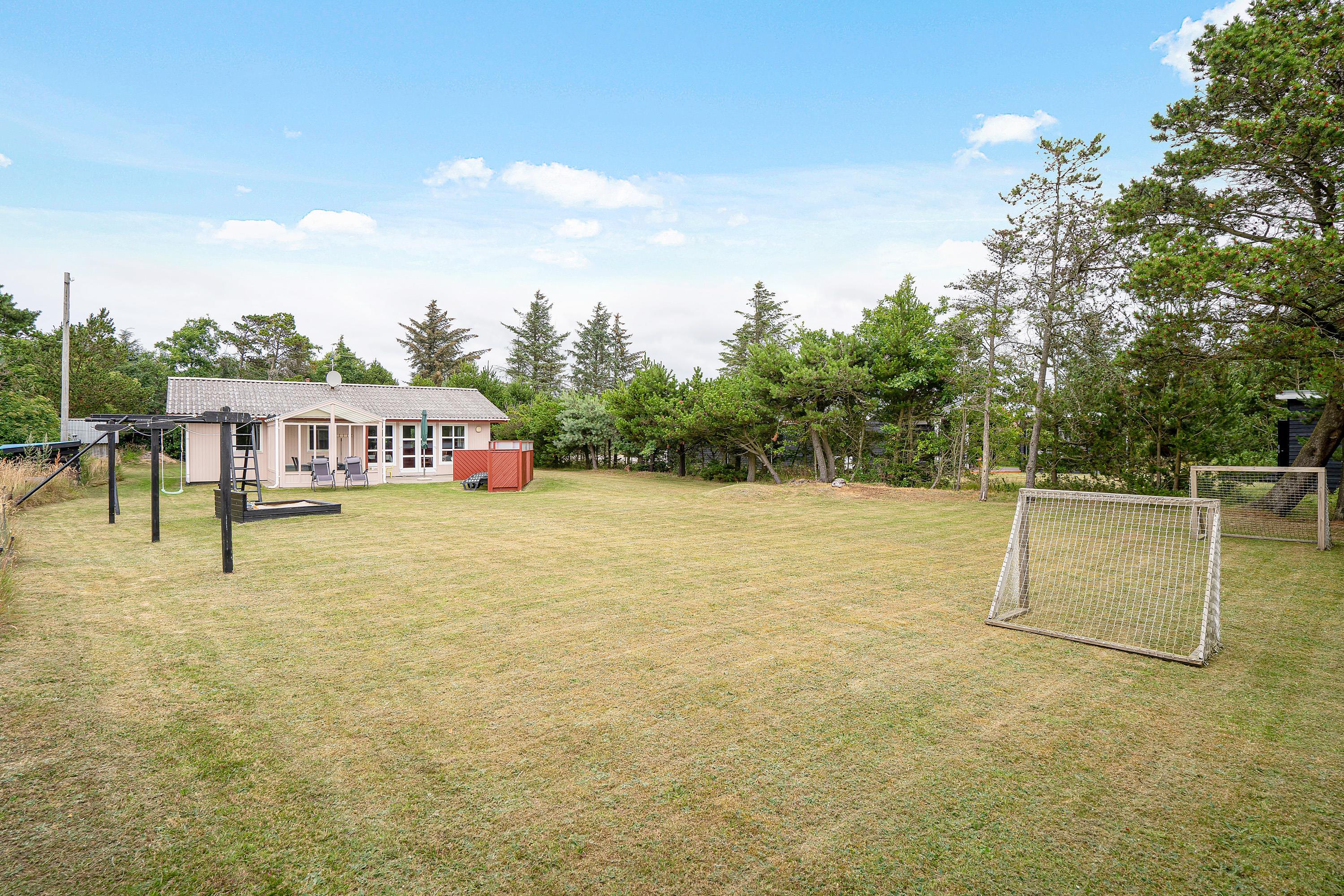 Børnevenligt sommerhus på plænegrund med fodboldmål, sandkasse og gynge.