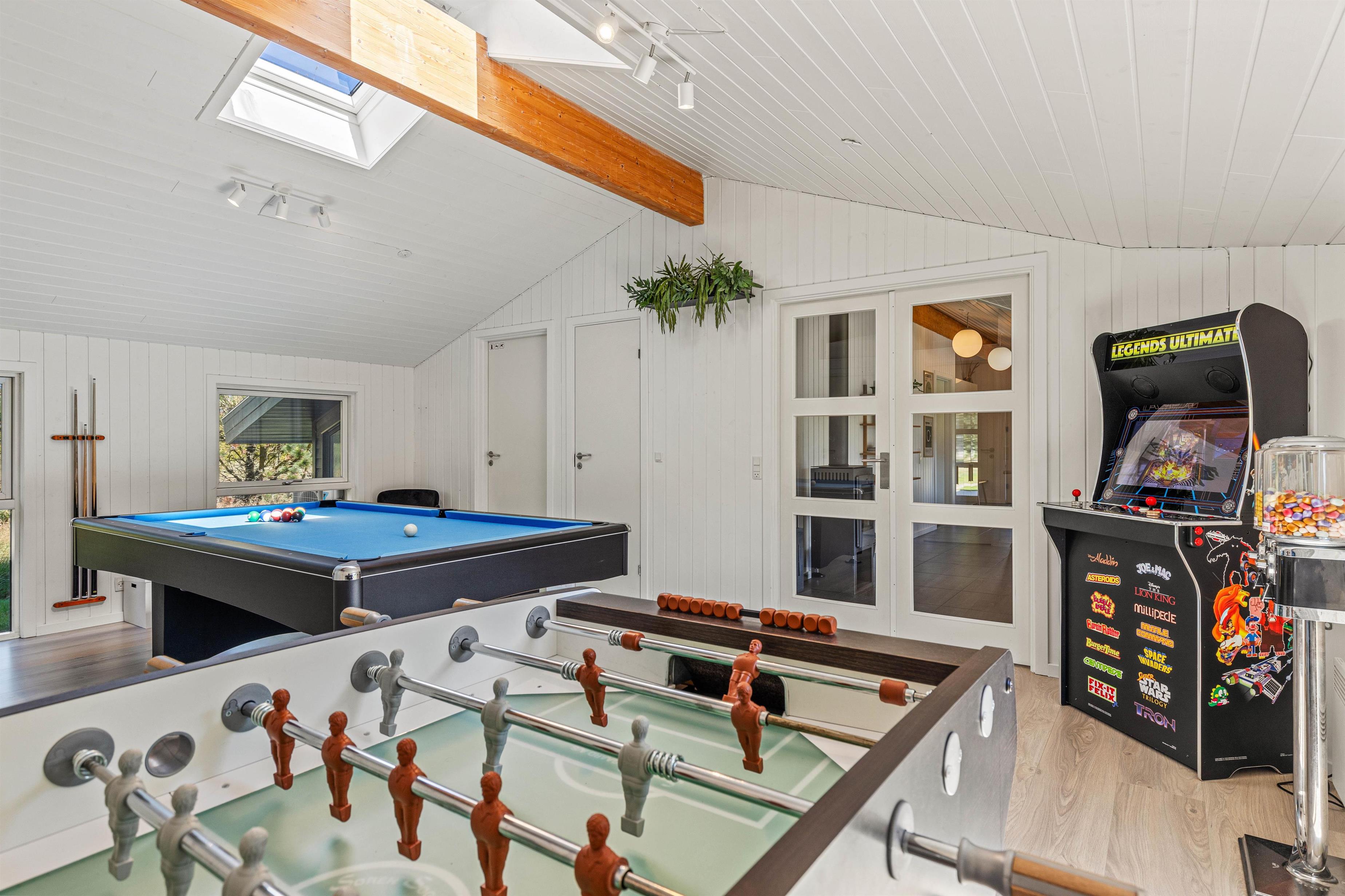 Sommerhuset tilbyder en bred vifte af faciliteter til både afslapning og aktivitet, og med både sauna og standspa er der rig mulighed for luksuriøs selvforkælelse efter en lang dag. For de mere energiske byder aktivitetsrummet på underholdning i form af poolbillard og bordfodbold. Børnene kan lege frit og fantasifuldt på den store, grønne plæne, hvor gynge, sandkasse og trampolin indbyder til timevis af leg og sjov. På den hyggelige, overdækkede terrasse kan I tænde op i grillen, lægge et par saftige bøffer på risten og nyde lange, stemningsfulde aftener under den åbne, blå himmel.