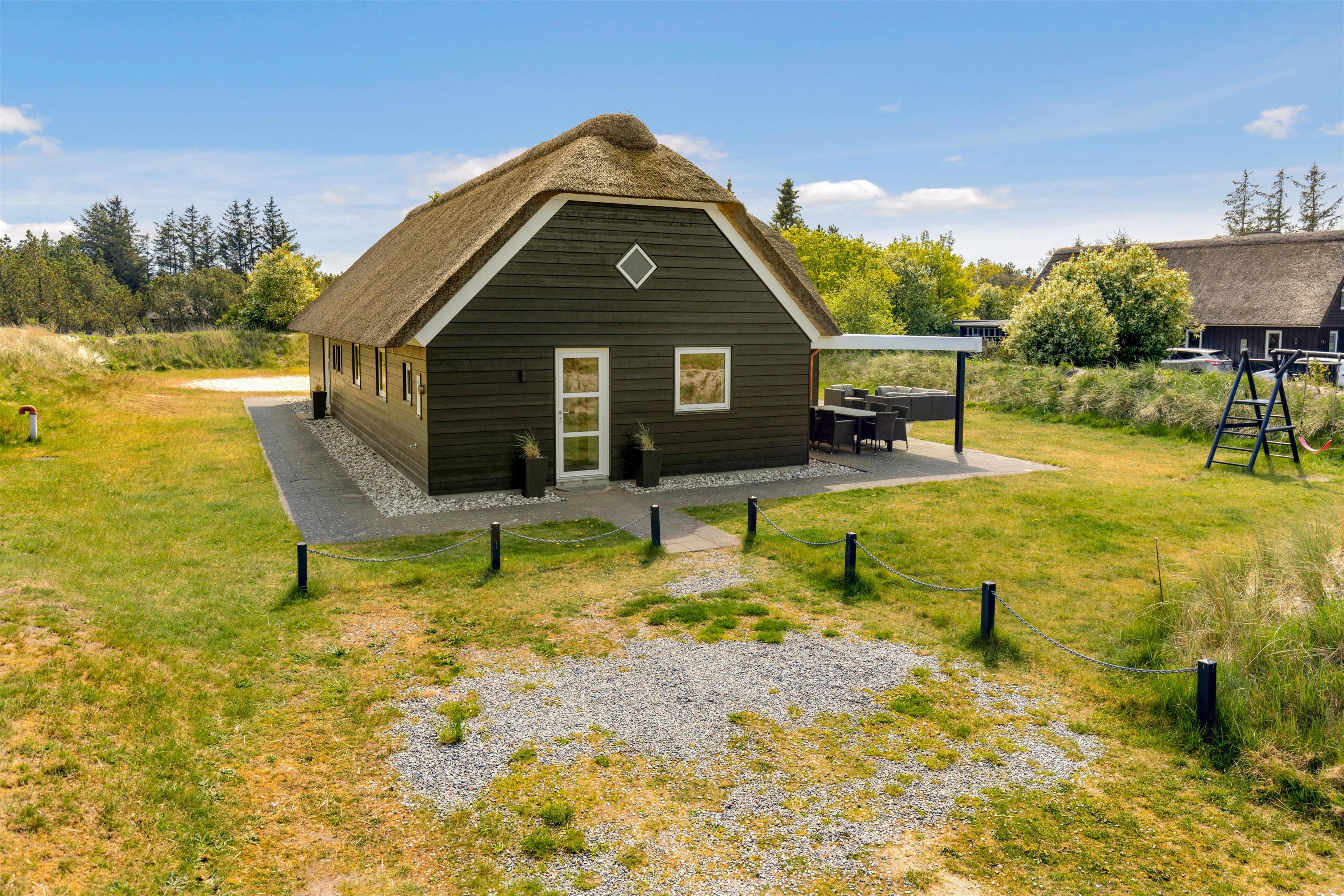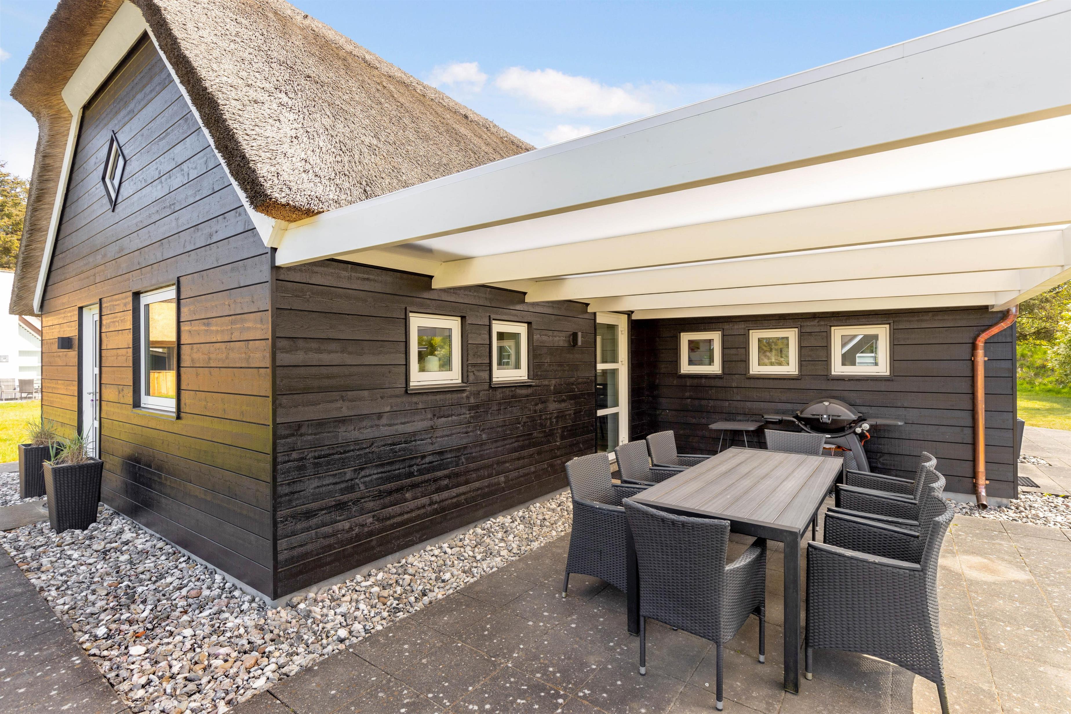 Dette smukke sorte stråtækte hus står klar til jeres hyggelige og sjove ferie i Blåvand. Med 150 m2 er her god plads til afslapning og leg for 8 personer og op til 2 hunde.