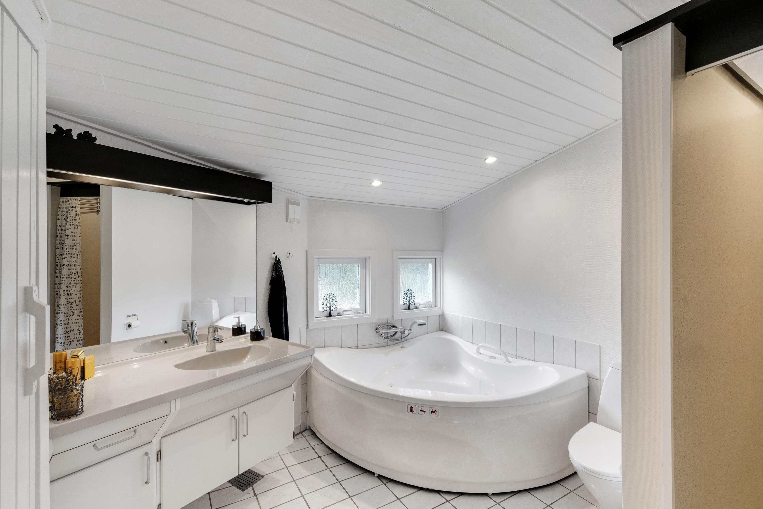 Sommerhuset har et praktisk bryggers med vaskemaskine, og køkkenet er udstyret med opvaskemaskine. Der bliver altså masser af tid til at slappe af og komme ned i gear på ferien – og I bliver hjulpet ekstra godt på vej af feriehusets badeværelse, som både er indrettet med sauna og spabad.