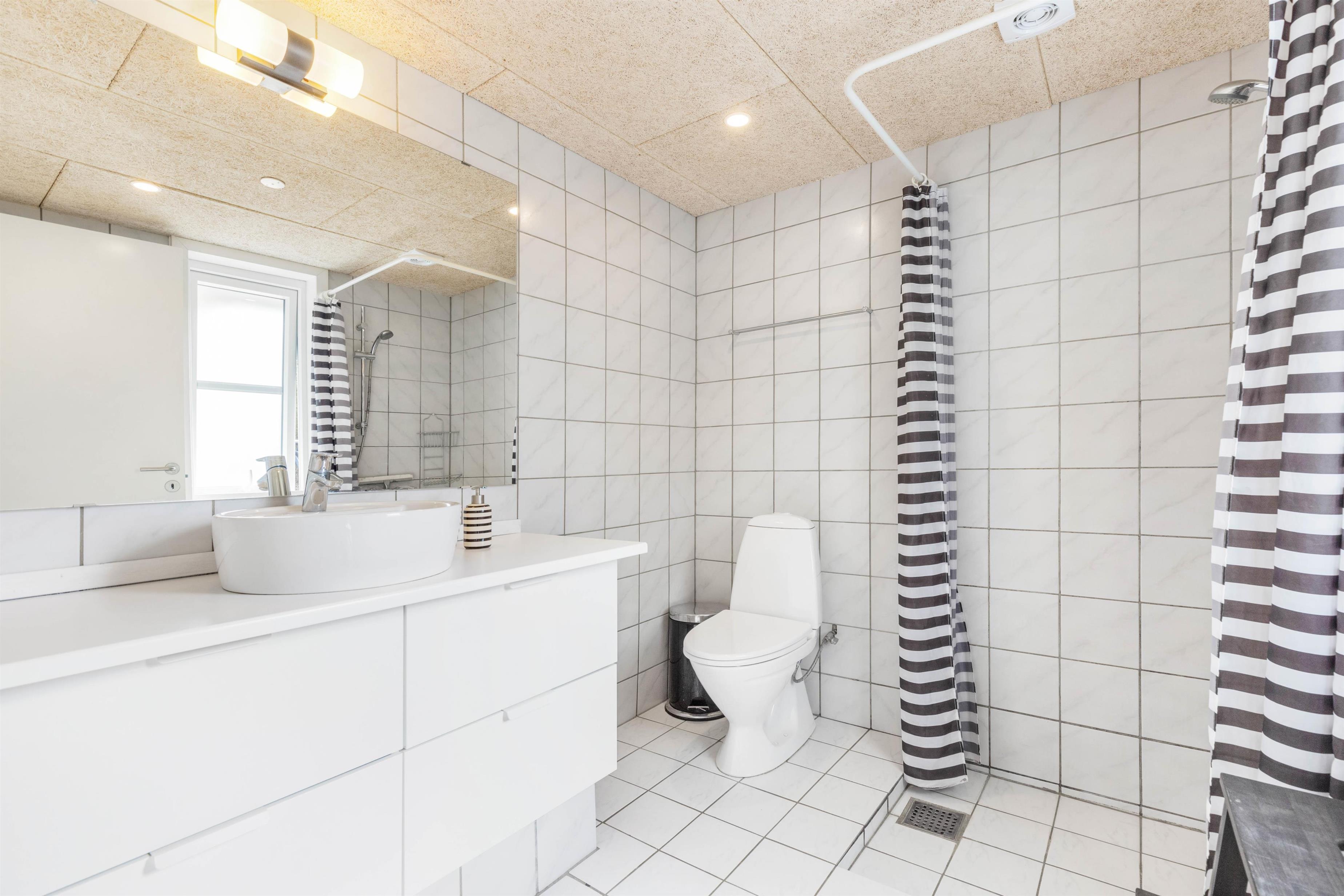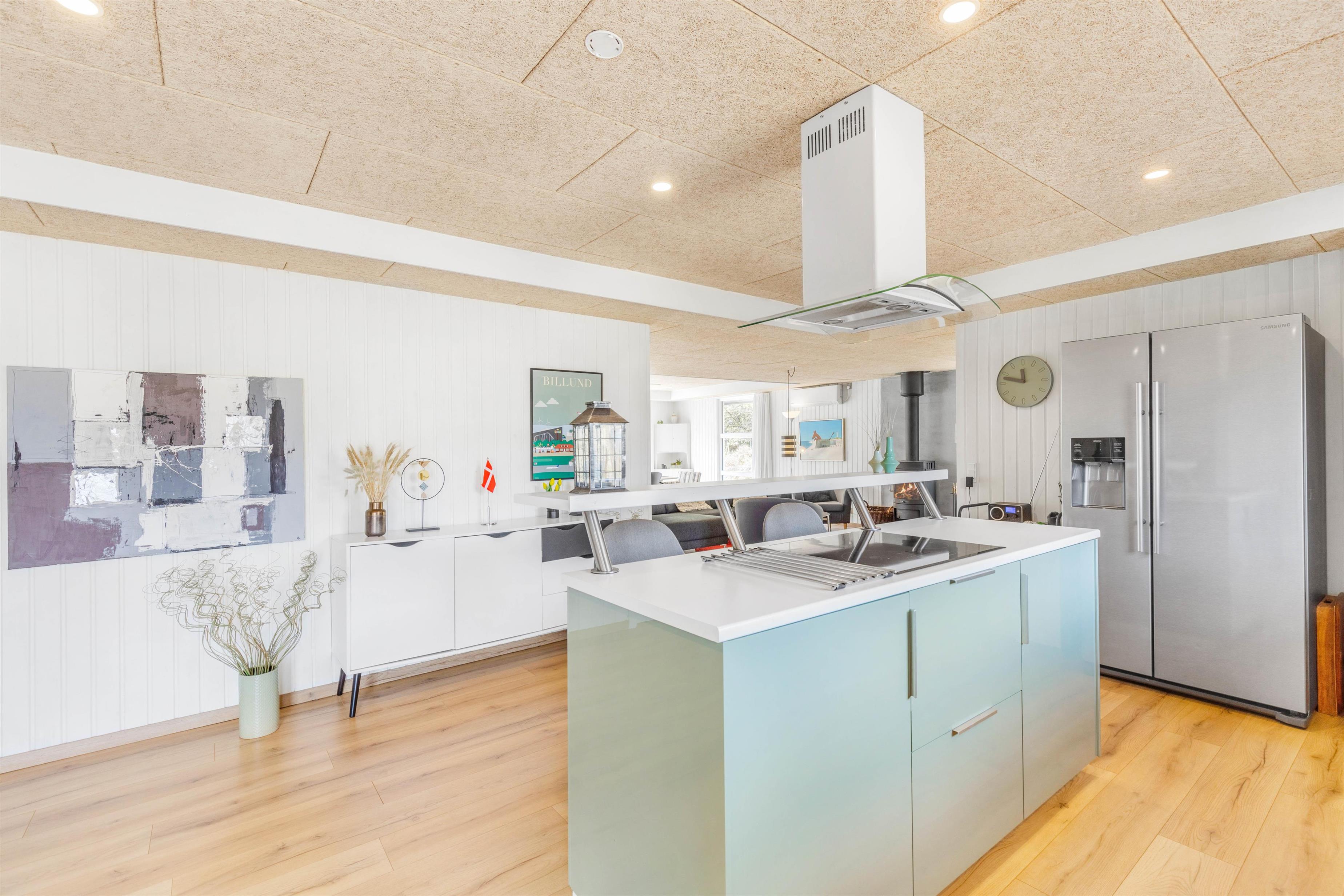Stue og køkkenalrum er kombineret i ét, og de imødekommende omgivelser bliver understreget af de mange lyse elementer og de store vinduespartier, som inviterer solens lys såvel som den smukke natur indenfor. På de kolde dage vil brændeovnen sprede masser af stemning og varme, mens i sidder i den dejlige lyse stue og hygger med en bog, eller spiller et spil med resten af familien.