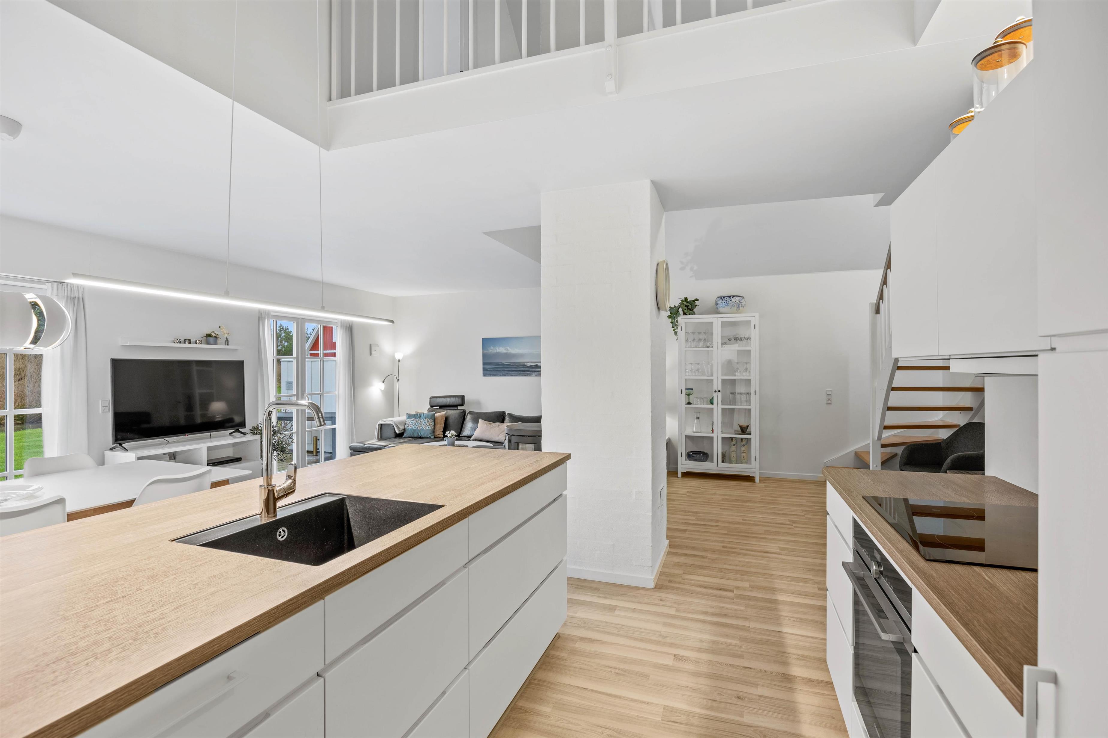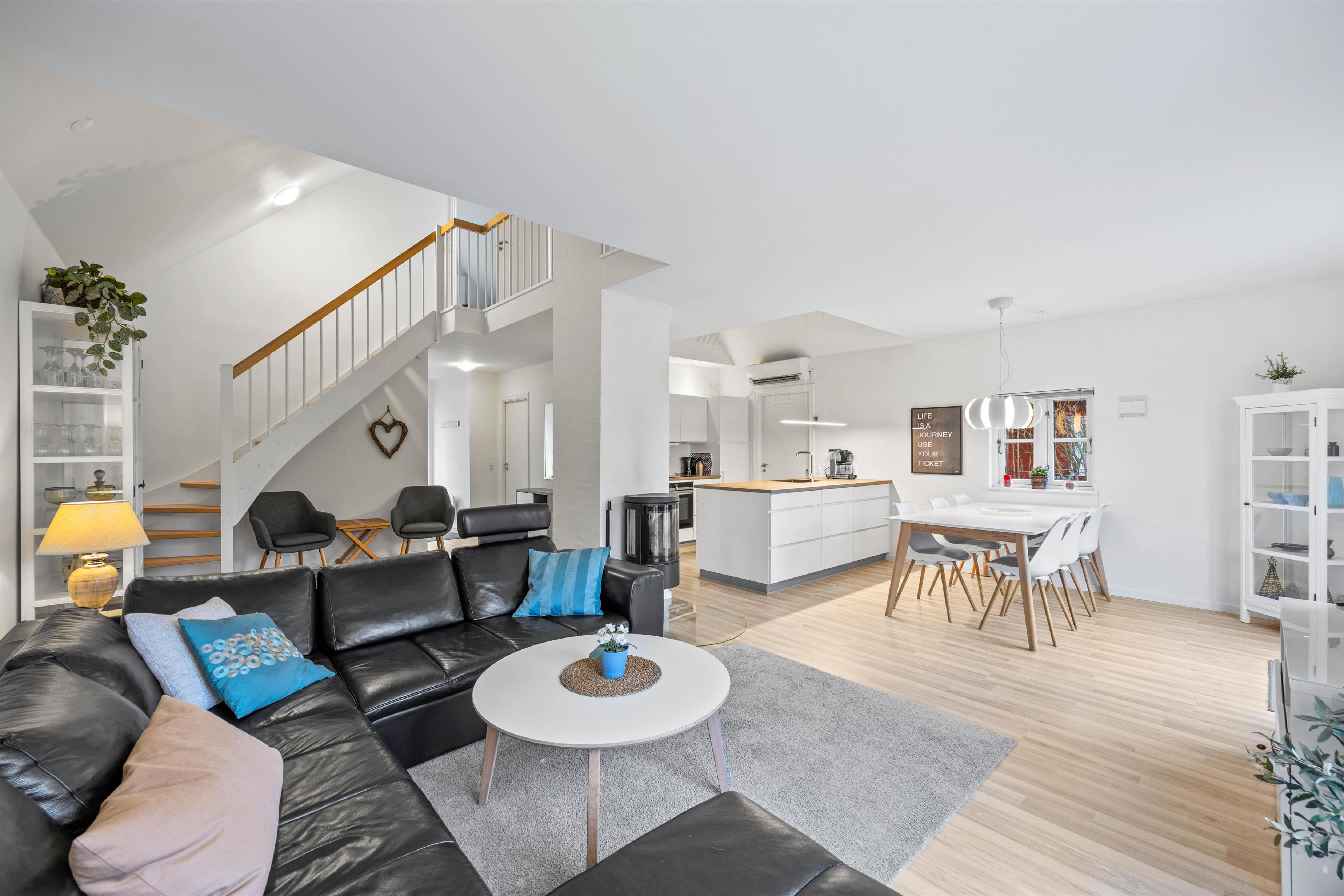 Det indbydende opholdsrum med stue, køkken og spiseafdeling kombineret i ét og med brændeovnen i midten lægger op til masser af hyggelige feriestunder sammen med familien med hjemmelavede måltider omkring spisebordet og sene aftener på sofaen.