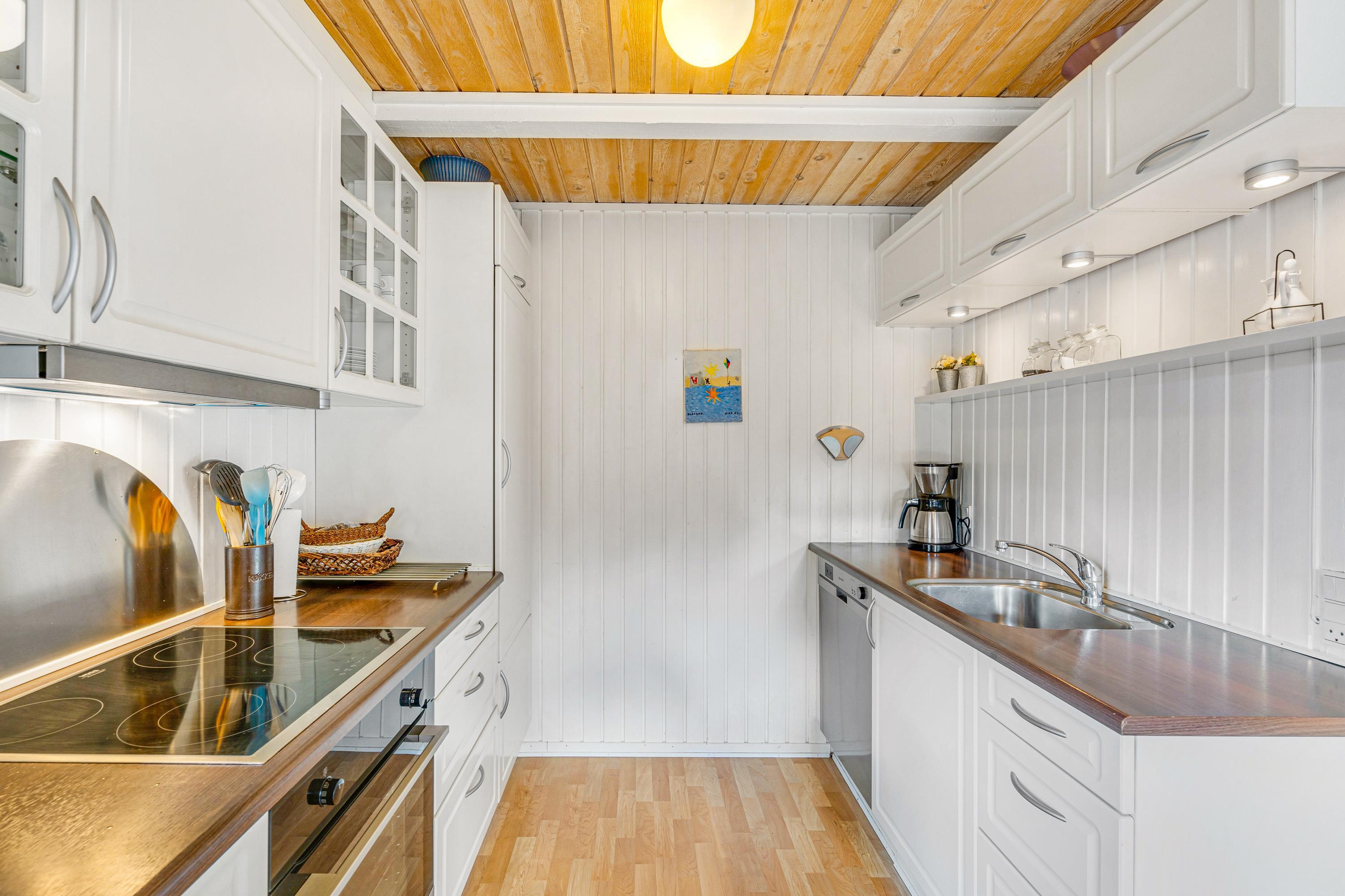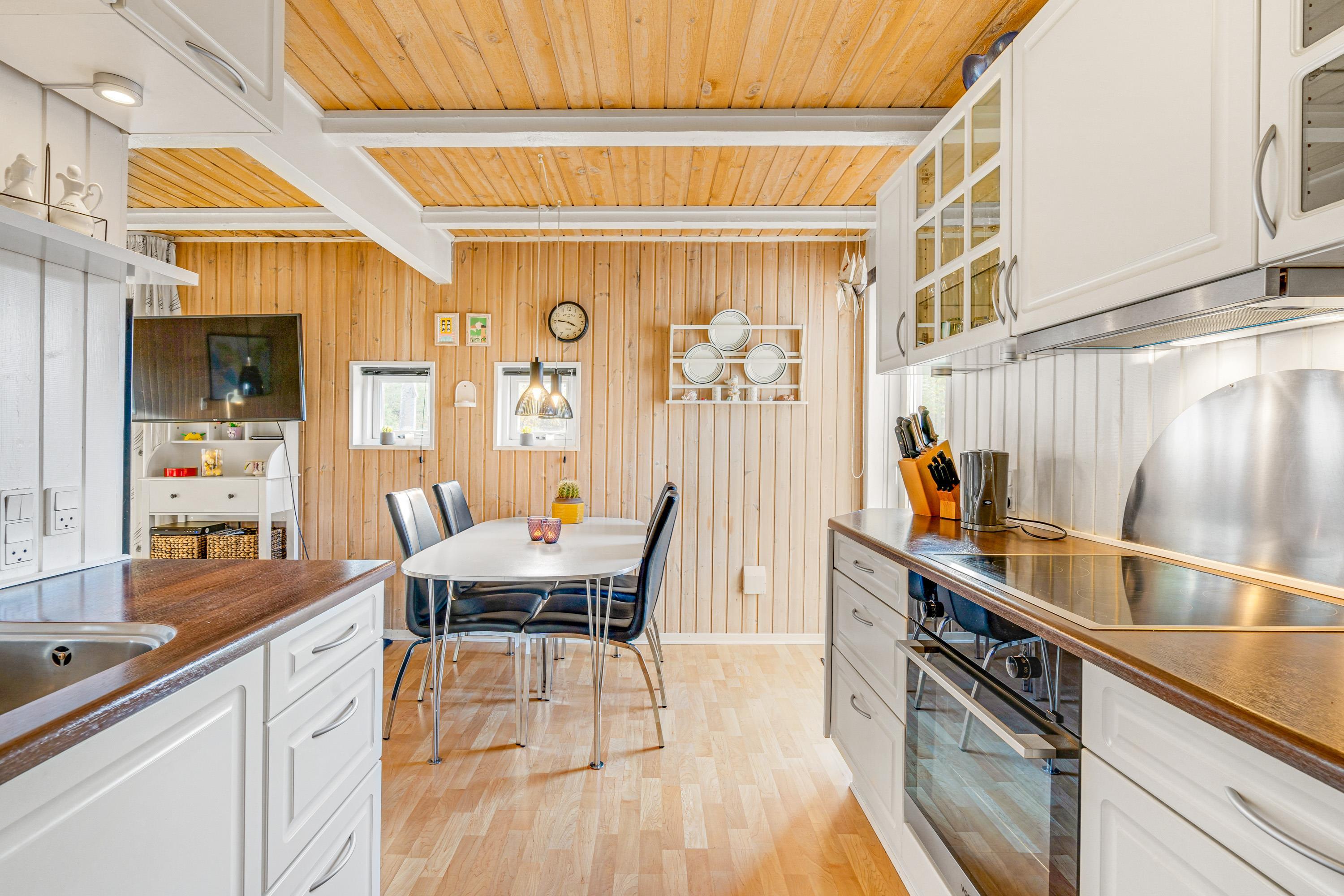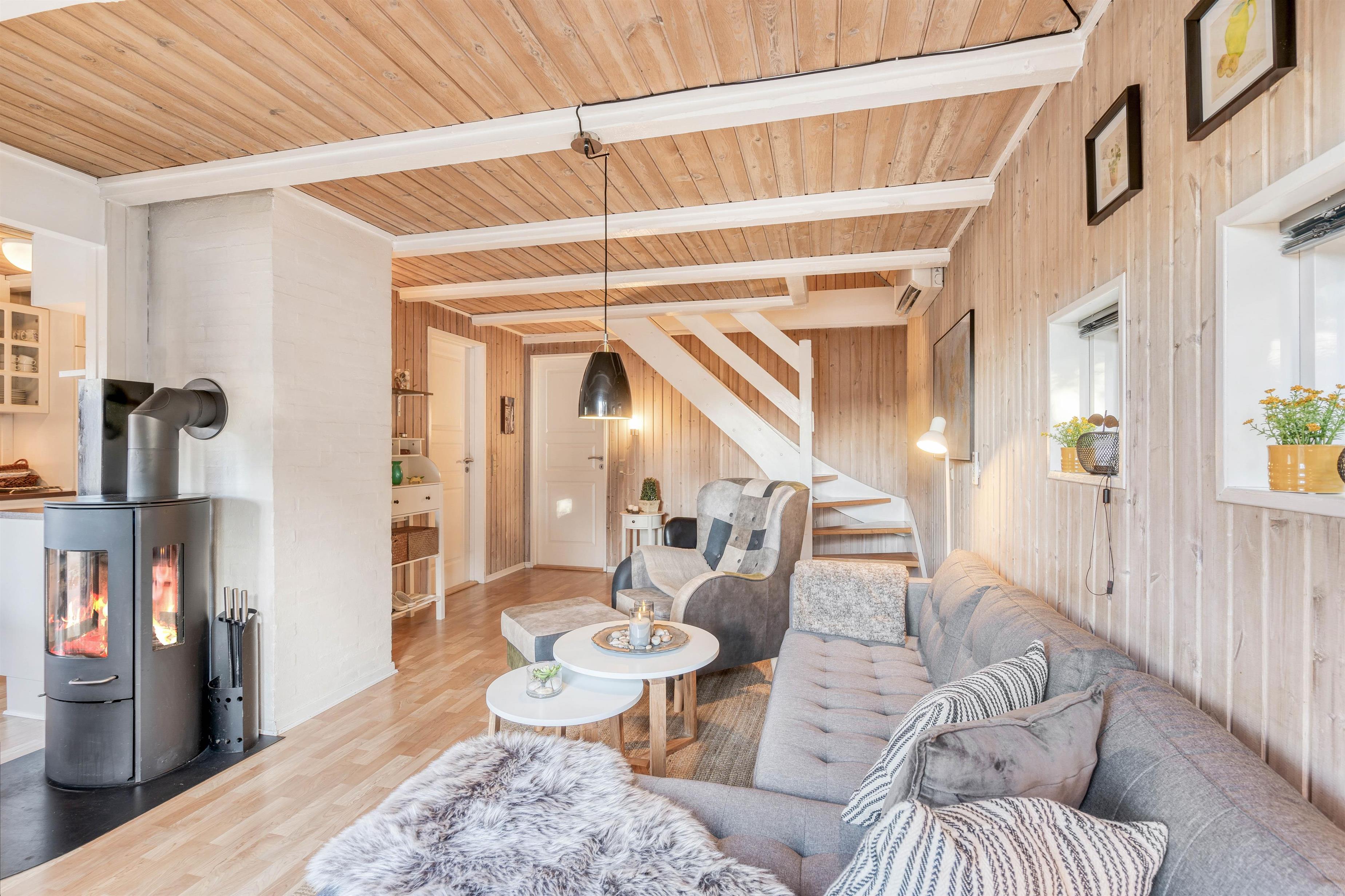 Sommerhuset er indrettet i 2 plan. I stueetagen er alrummet, hvor køkken, stue og spiseafdeling ligger i åben forbindelse. Her kommer I uden tvivl til at få mange hyggelige timer til at gå sammen med madlavning, spil og film. Brændeovnens knitren i baggrunden sætter prikken over i’et for feriestemningen.