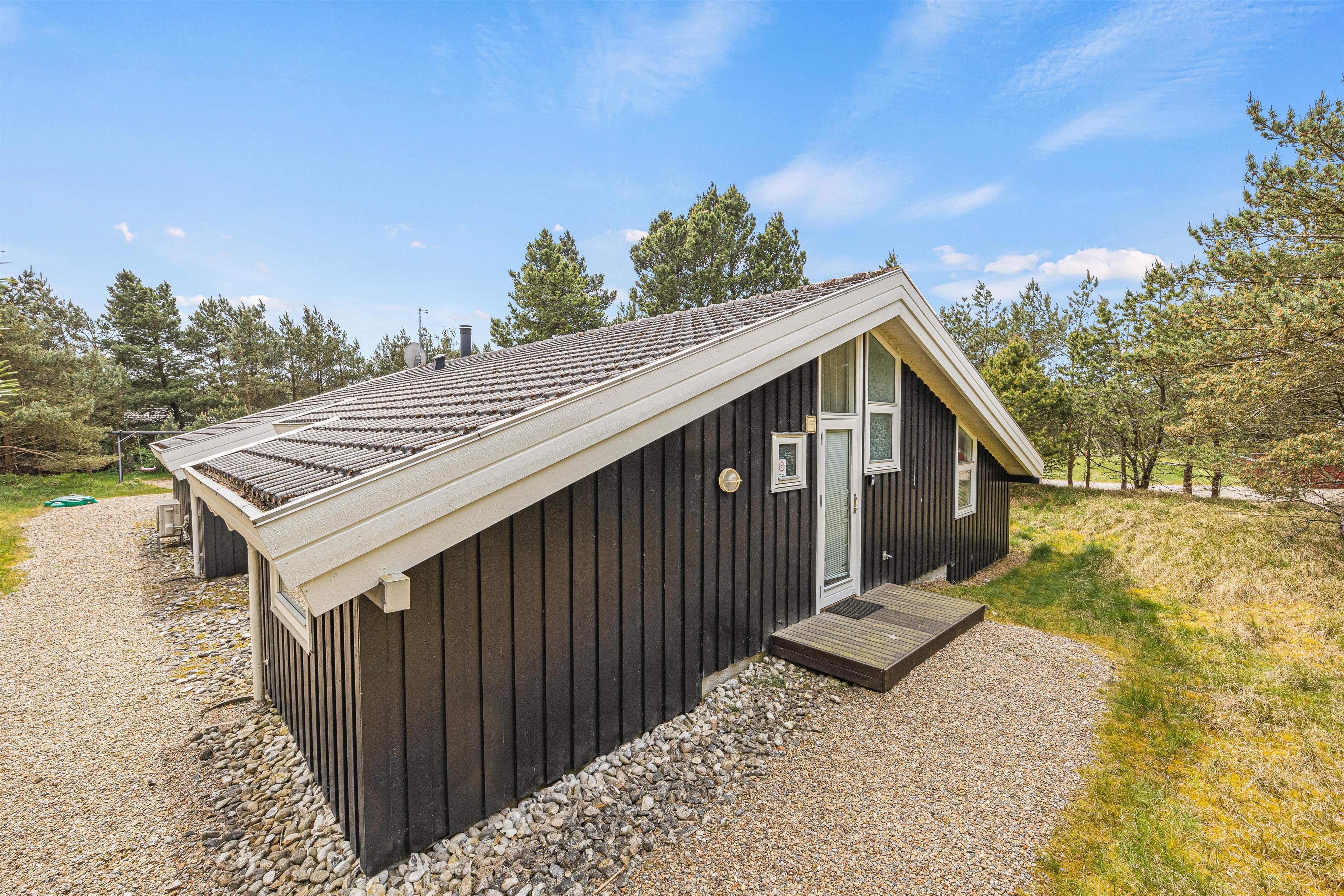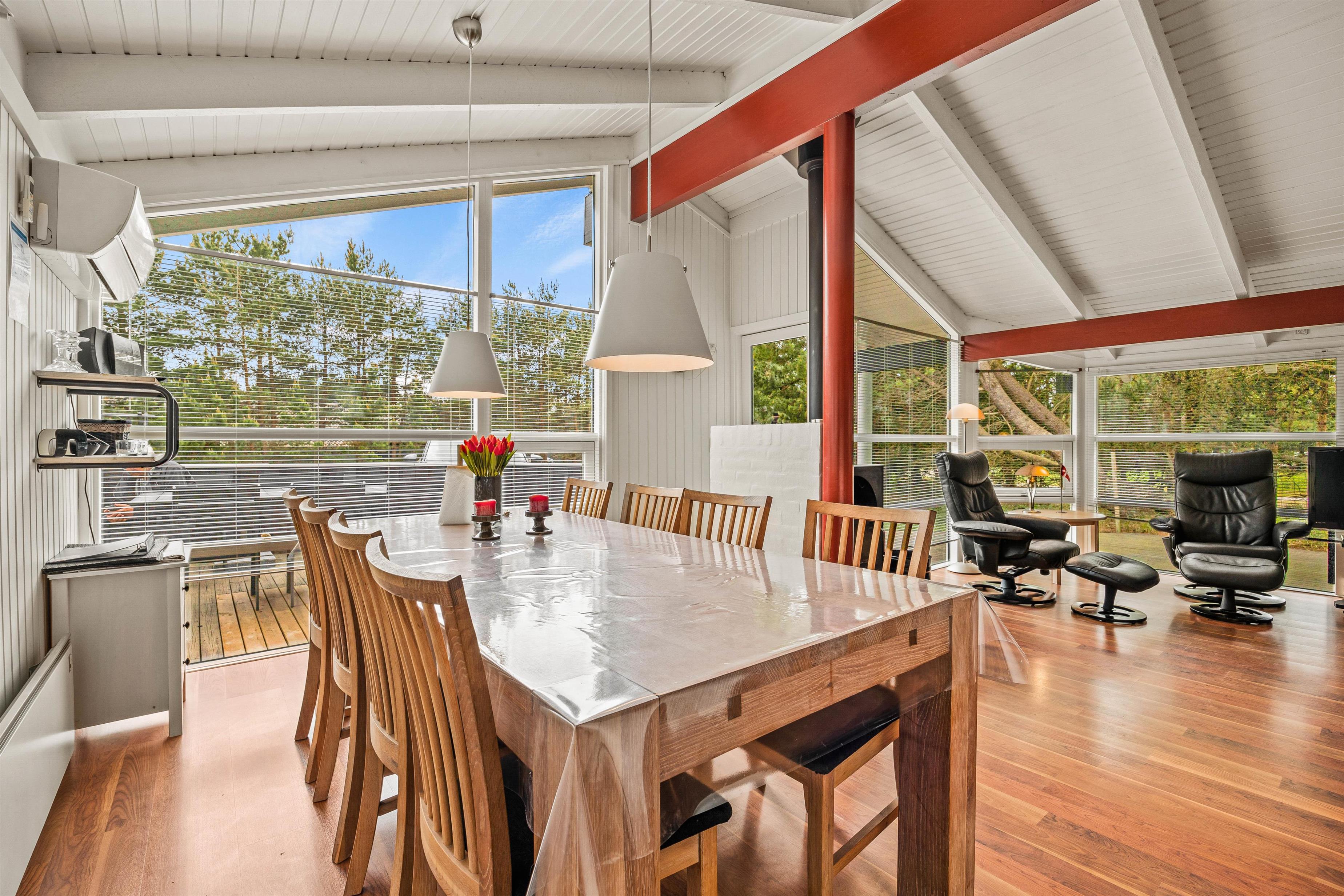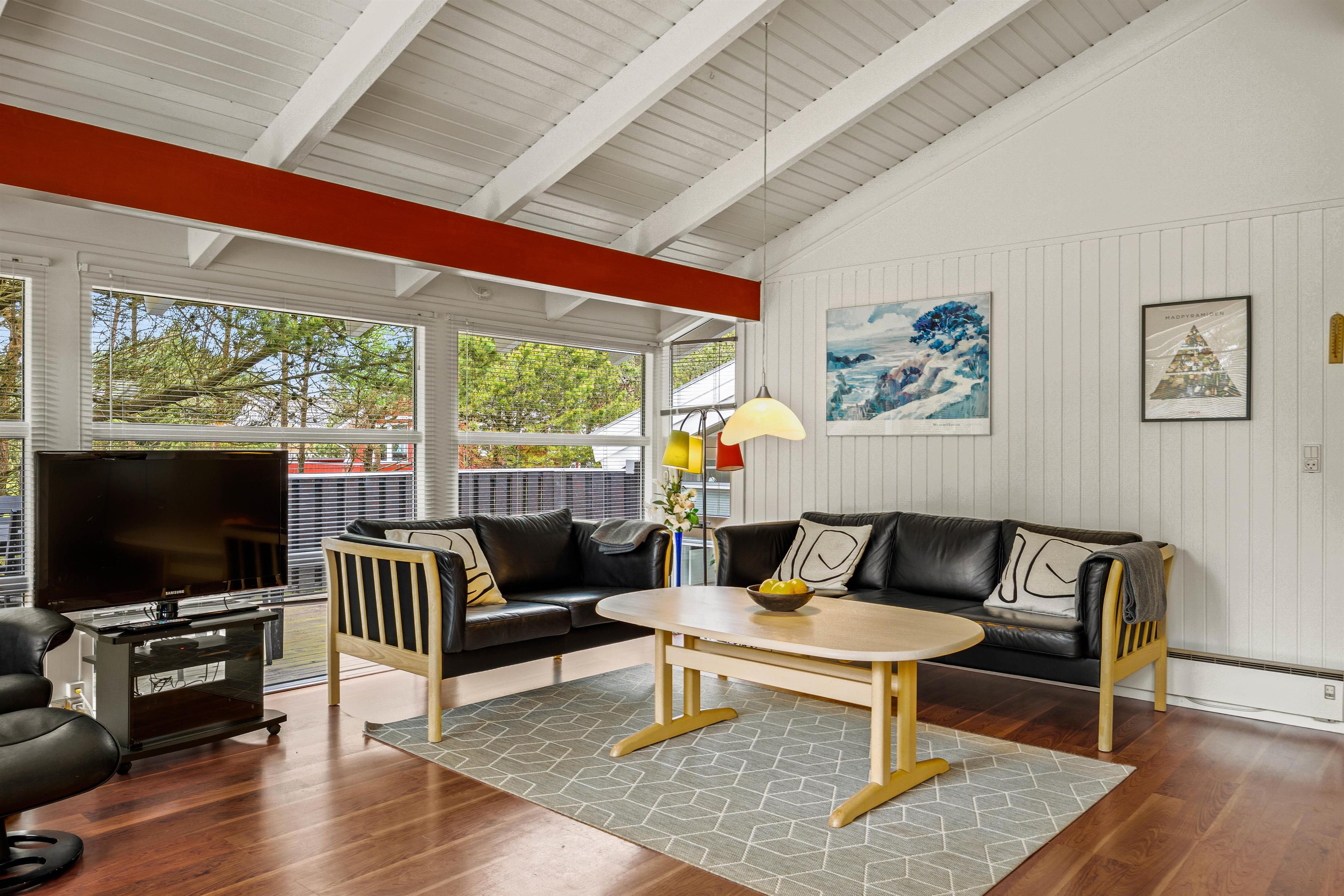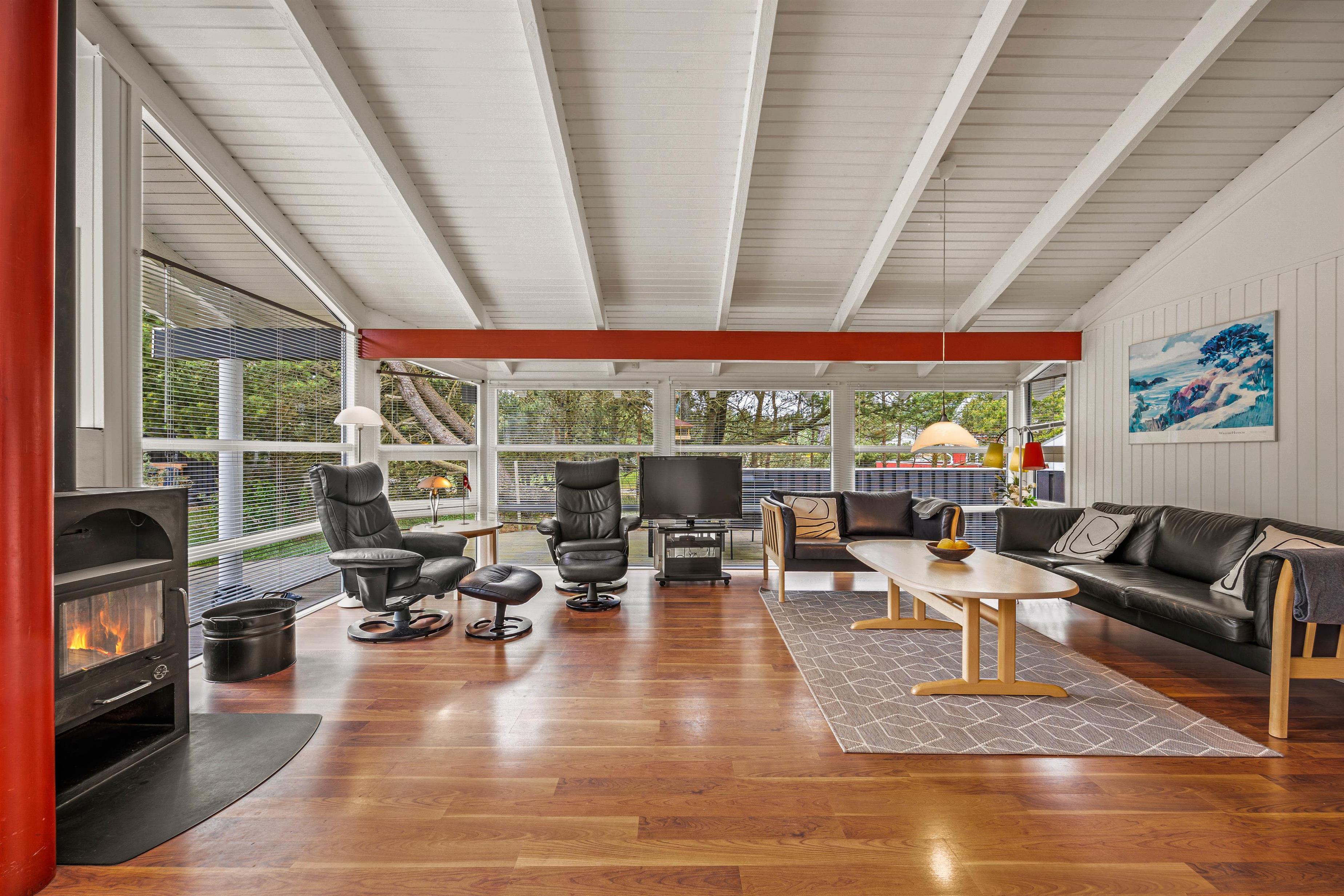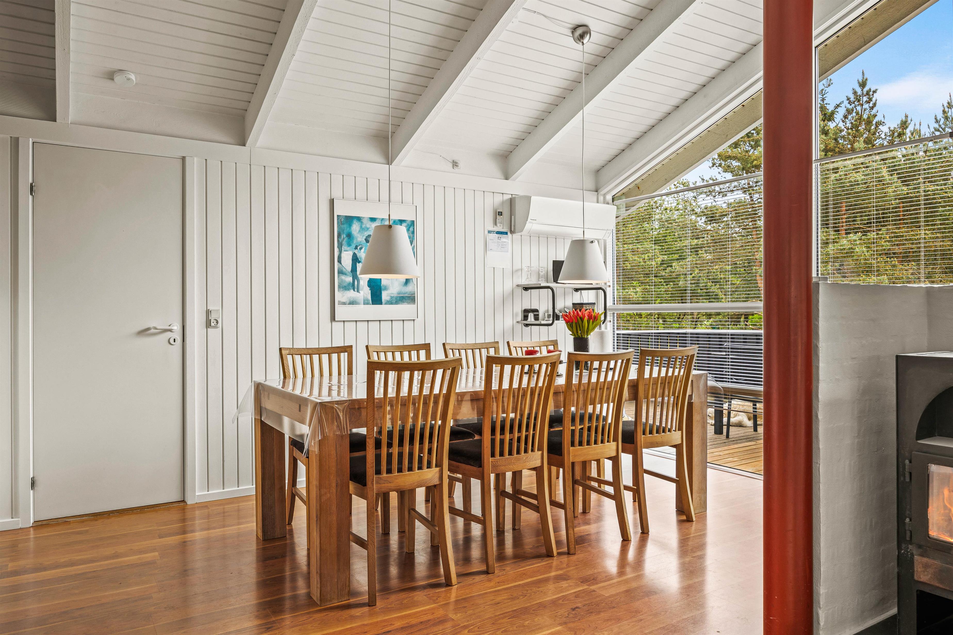 Feriehuset byder desuden på et alrum, der forener køkken, spiseplads og stue, og som kommer til at danne jeres samlingspunkt. Her kan I blandt andet lave lækker mad i køkkenet eller se gode film i tv’et, mens brændeovnen knitrer i baggrunden. Desuden er der en varmepumpe, der sørger for et godt indeklima.