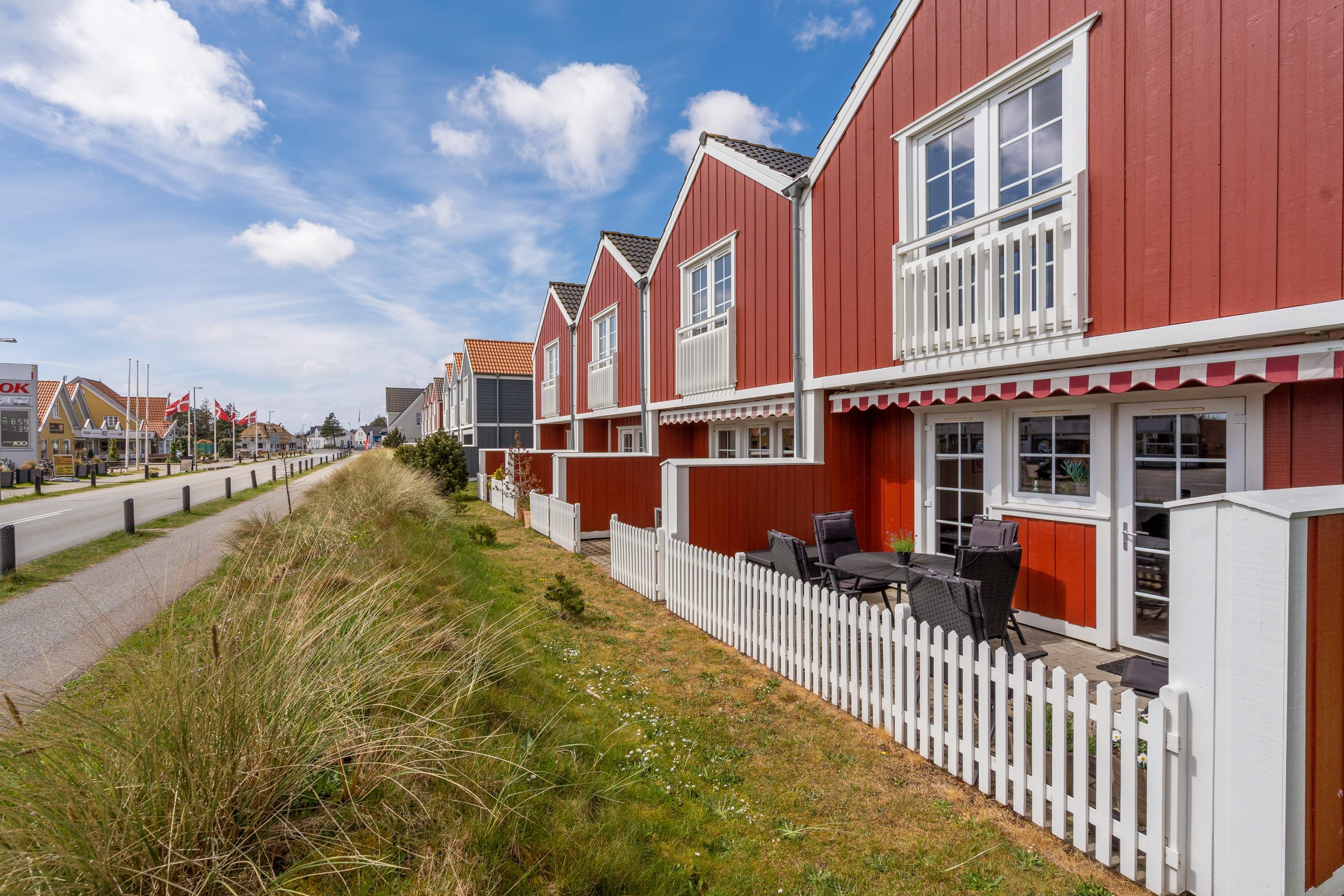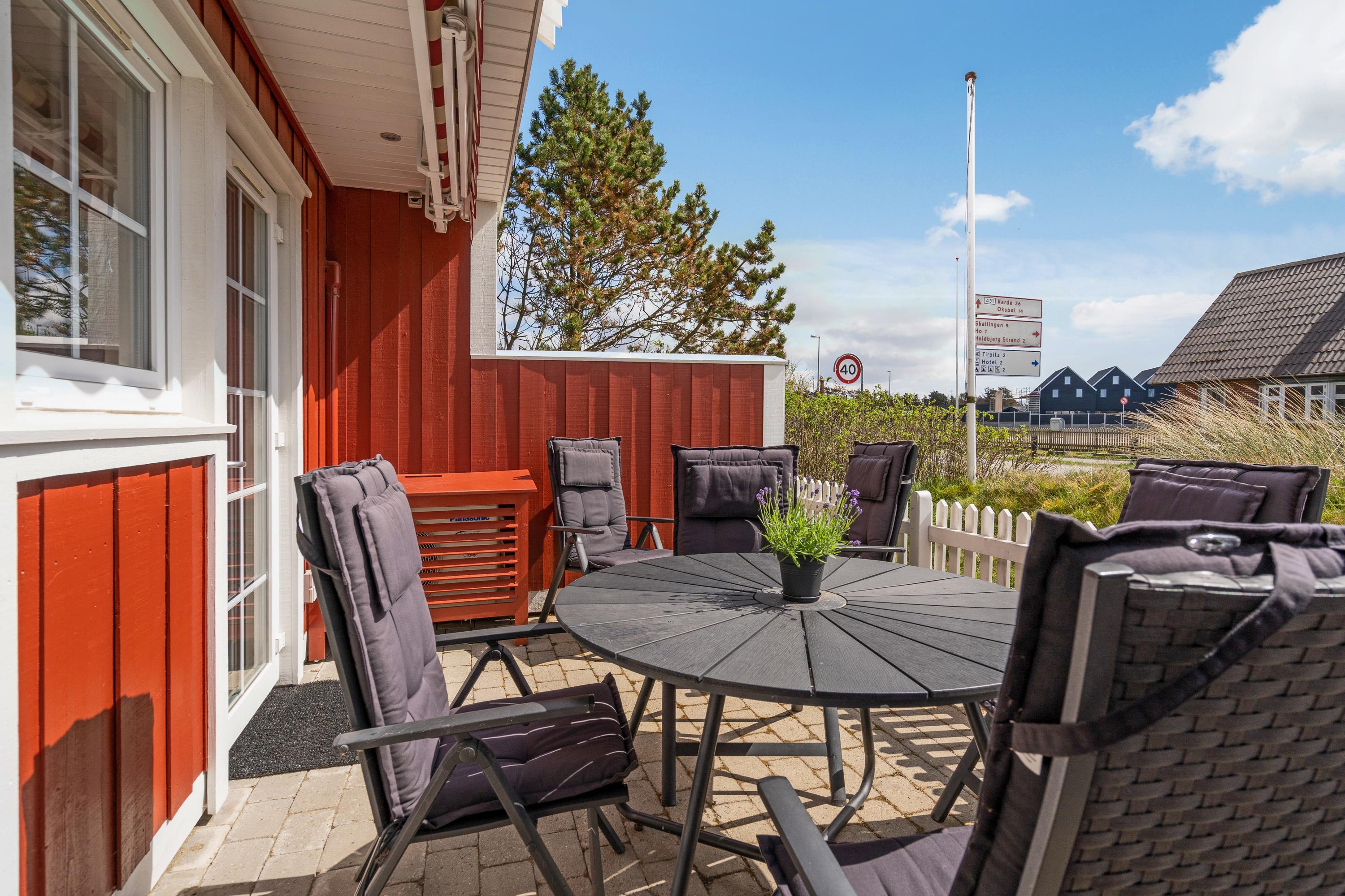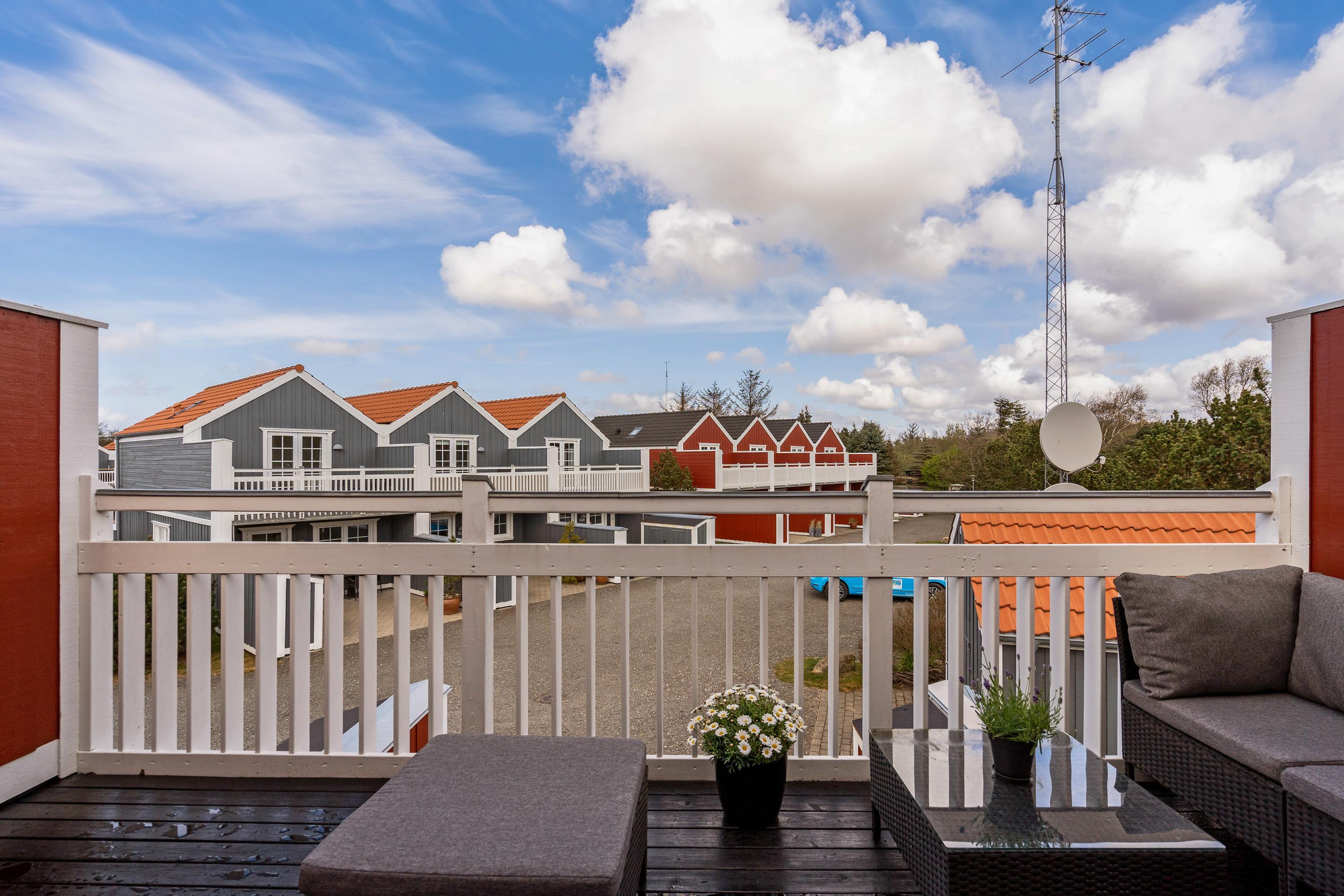 Delvist overdækket terrasse og udsigt til Blåvands summende ferieby