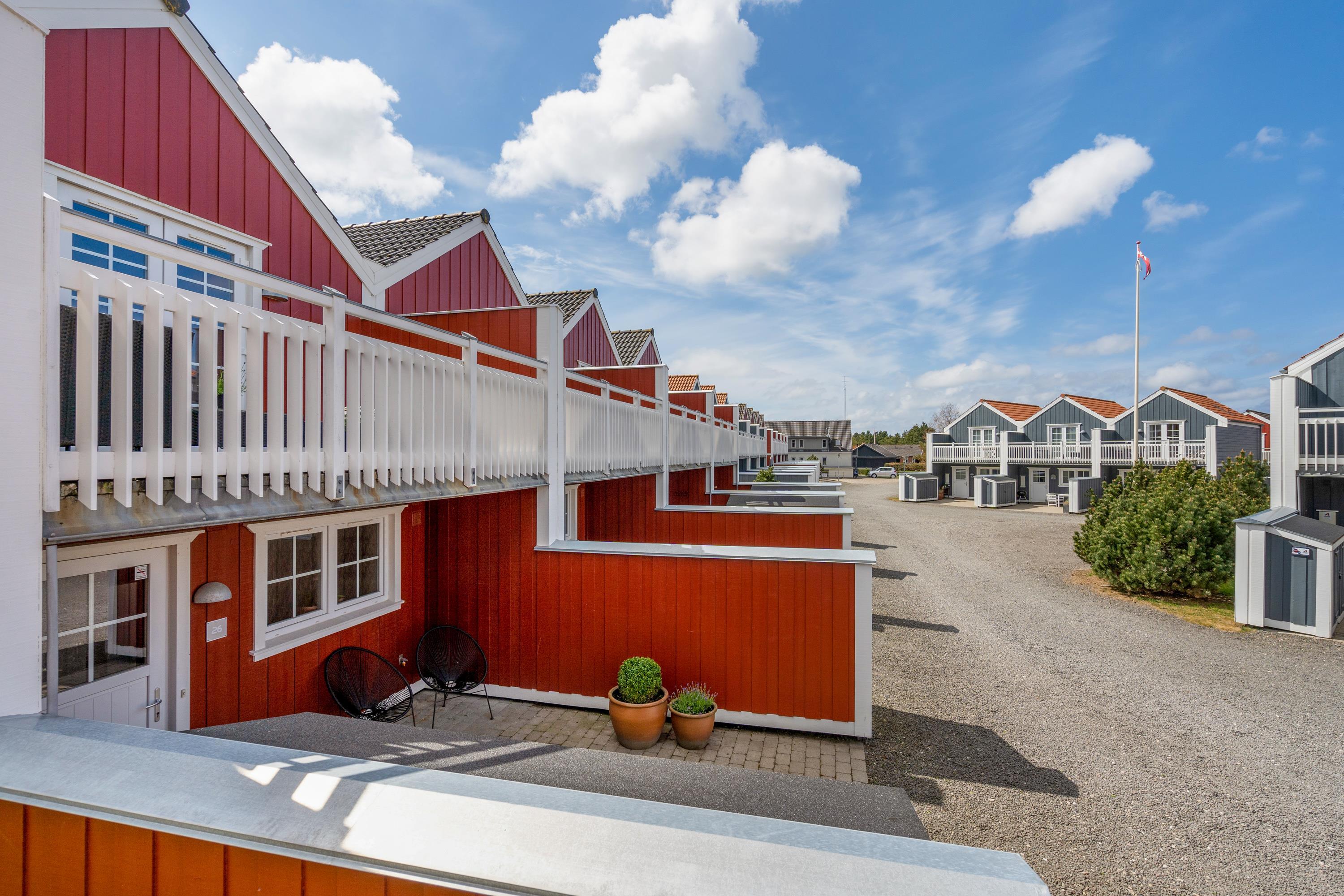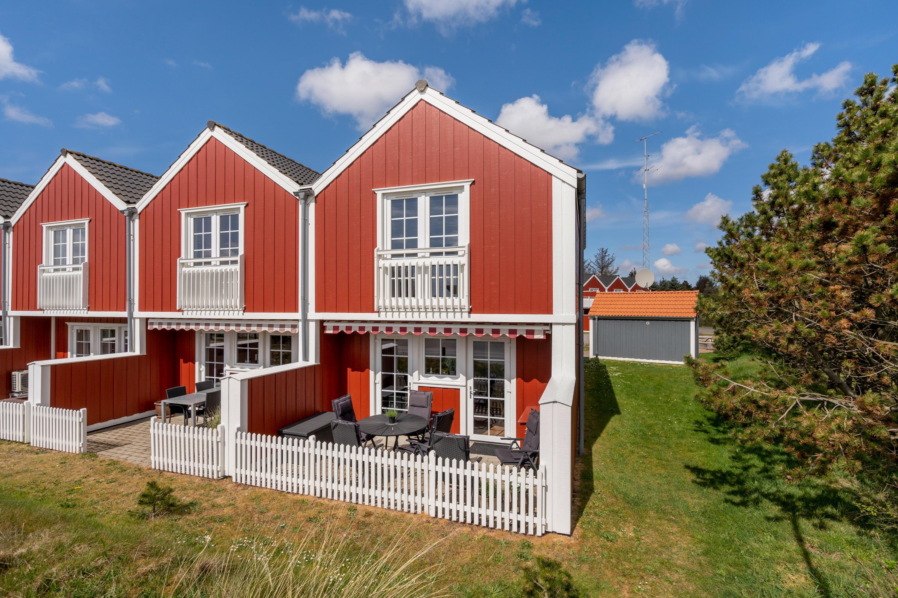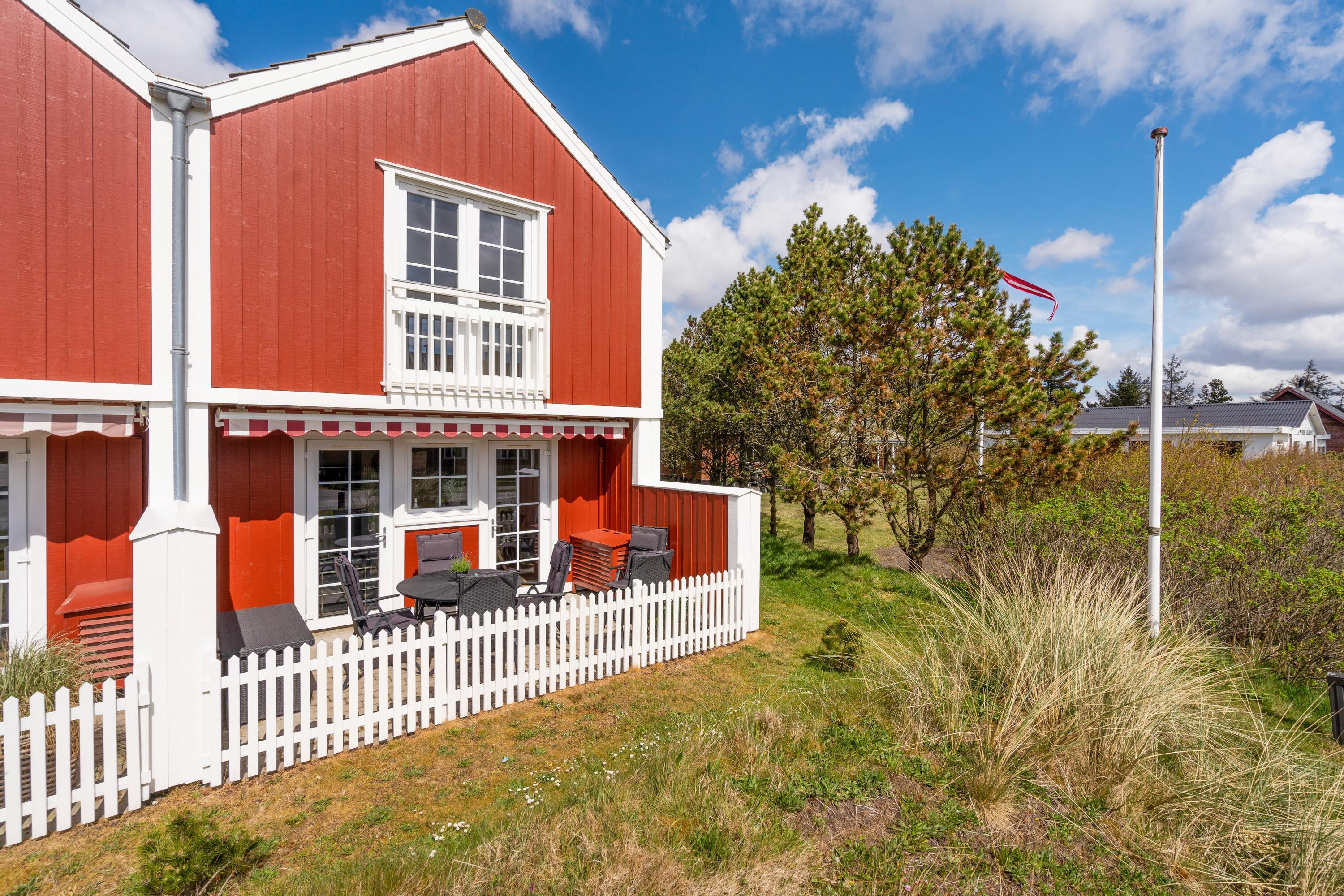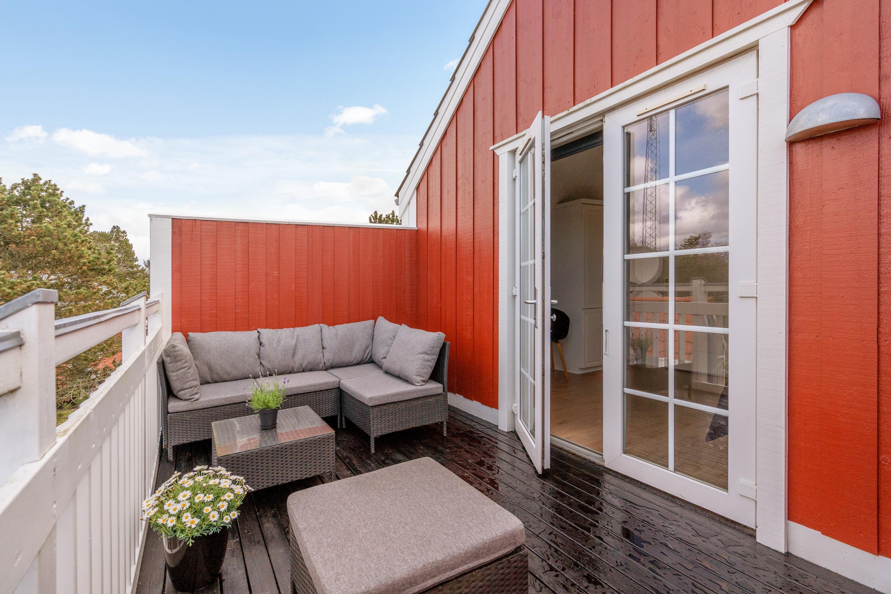 Delvist overdækket terrasse og udsigt til Blåvands summende ferieby
