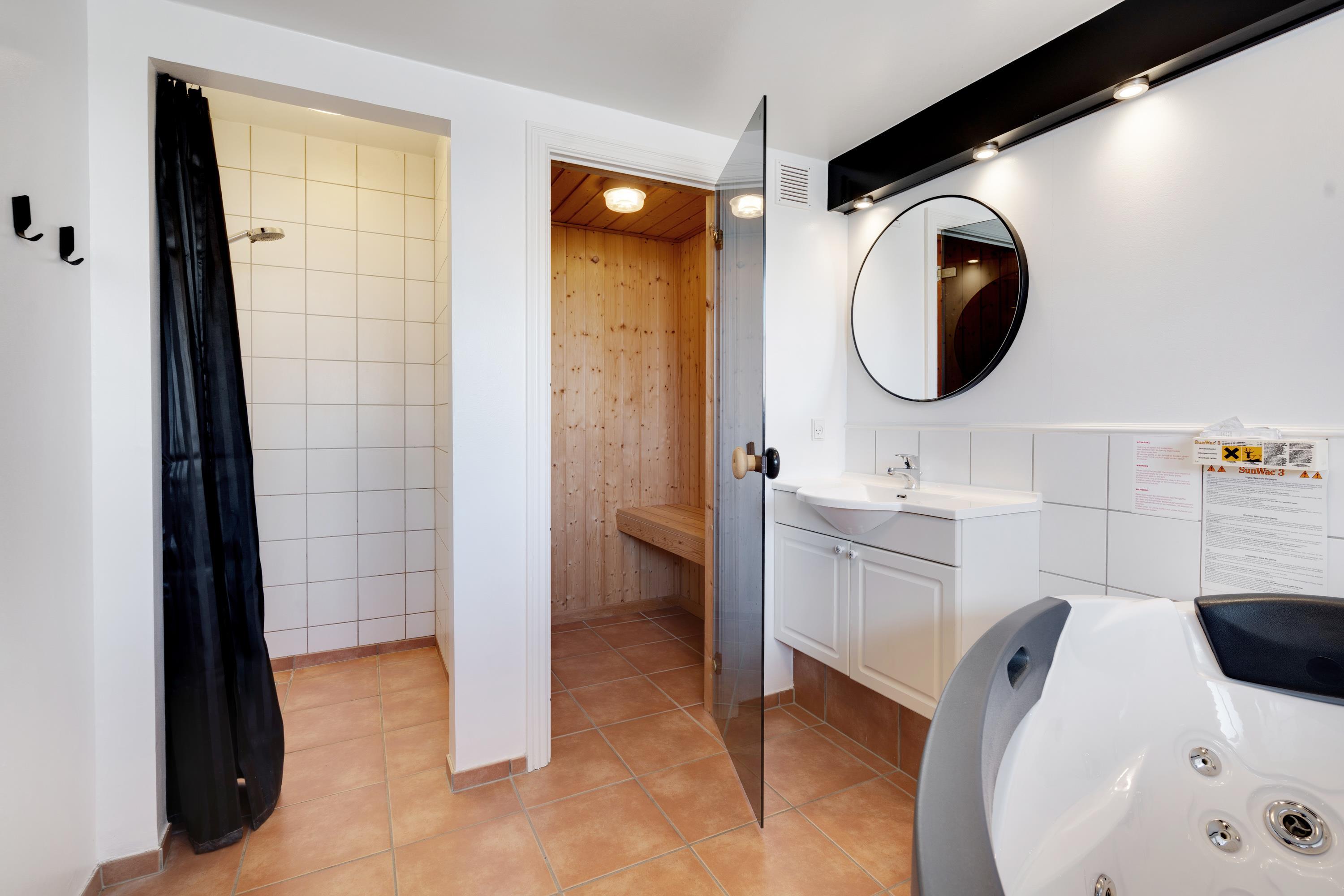 En ferie på Vandflodvej 2, 26 byder på afslapning med stort A. På stueetagens badeværelse har I nemlig jeres egen lille ”wellness-afdeling” med sauna og spabad. Der er altså rig mulighed for at lade batterierne op i varmen og vende hjem med fornyet energi efter ferien.