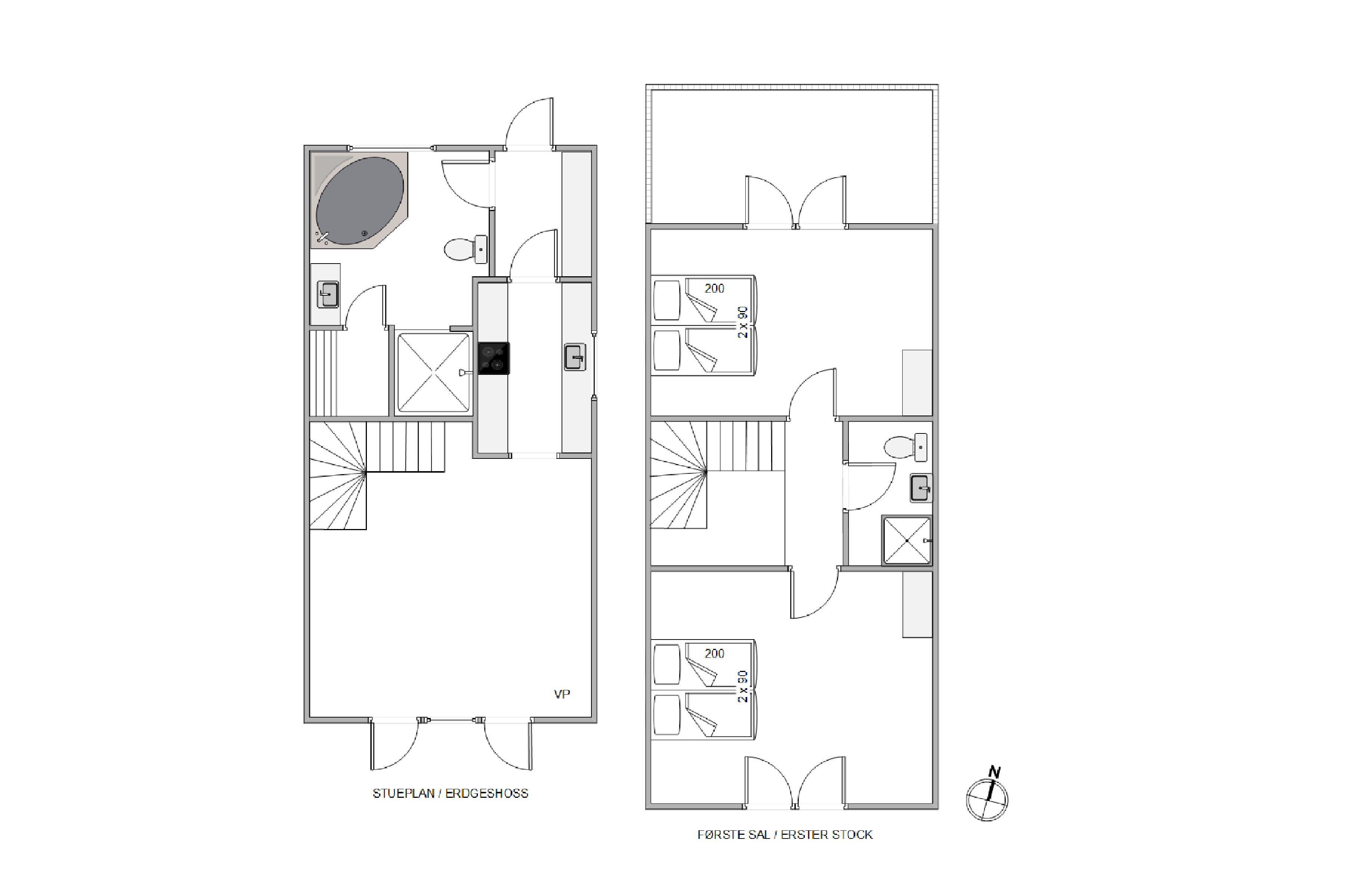 Rækkehusets 92 kvadratmeter fordeler sig på 2 etager, der begge er hyggeligt indretning i enkel og imødekommende sommerhusstil. På stueetagen finder I den kombinerede køkken-, spise- og stueafdeling samt et stort badeværelse, og på første sal er der endnu et badeværelse samt 2 soveværelser med dobbeltseng med udgang til en altan mod nord.