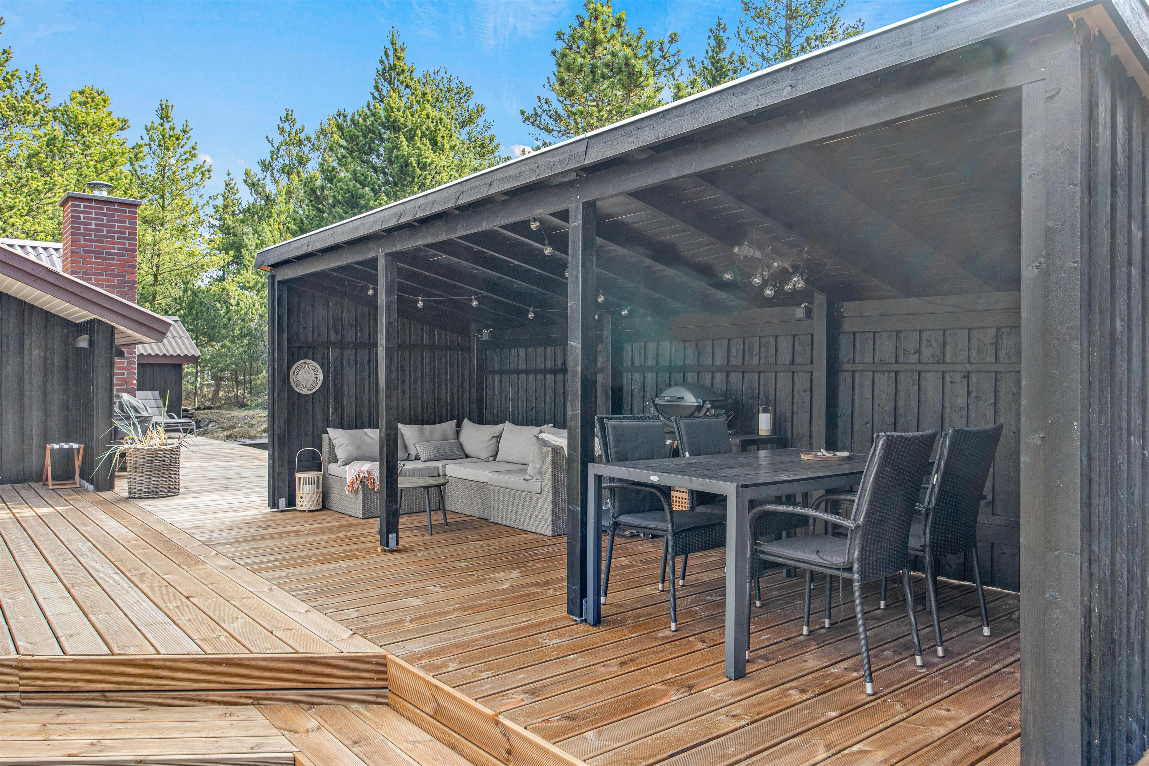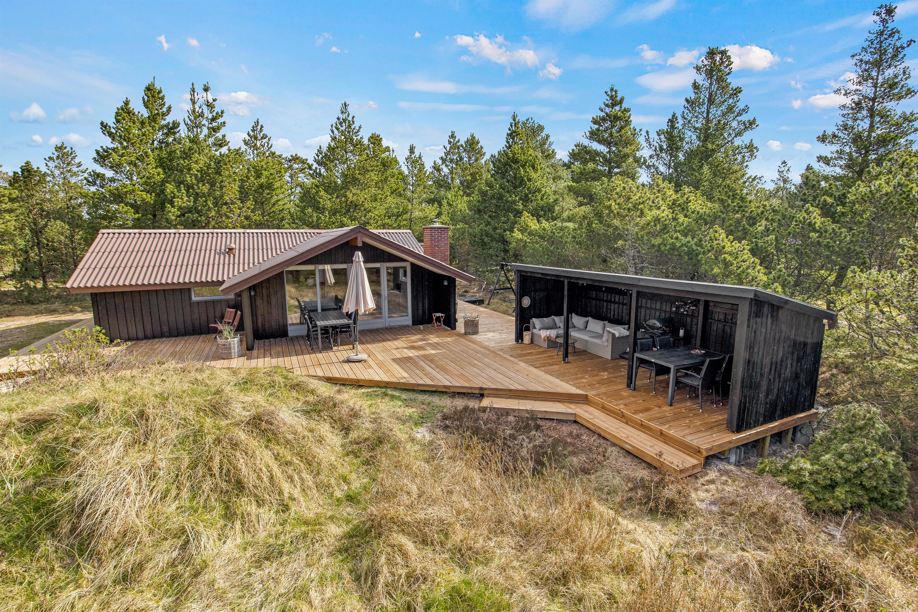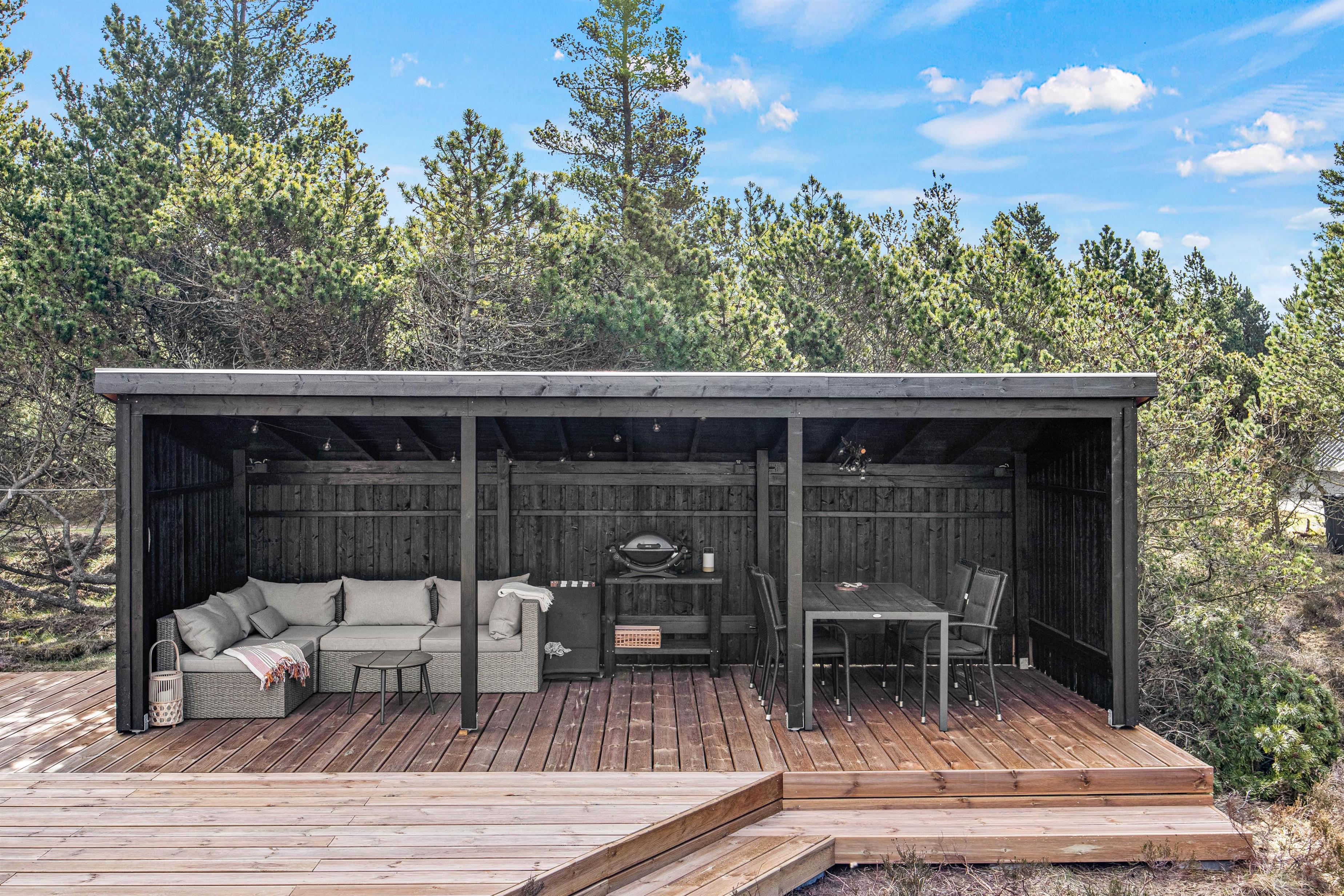 Det fine sorte sommerhus ligger på en dejlig stor naturgrund og omfavnes af en skøn åben træterrasse. Her er altid mulighed for at finde en plads i solen, om det er til aftensmadstid eller morgenkaffen. Mod sydvest står havemøbler og liggestole klar til jer, mens I yderst finder en afskærmet pergola med gasgrill og loungesofa. Om dagen er sofaen den ideelle plads i skyggen, mens den på de lune sommeraftner indbyder til et godt glas. Sid her, mens solen langsomt går ned, marehalmen vifter roligt i vinden og kun lyskæderne i loftet lyser.