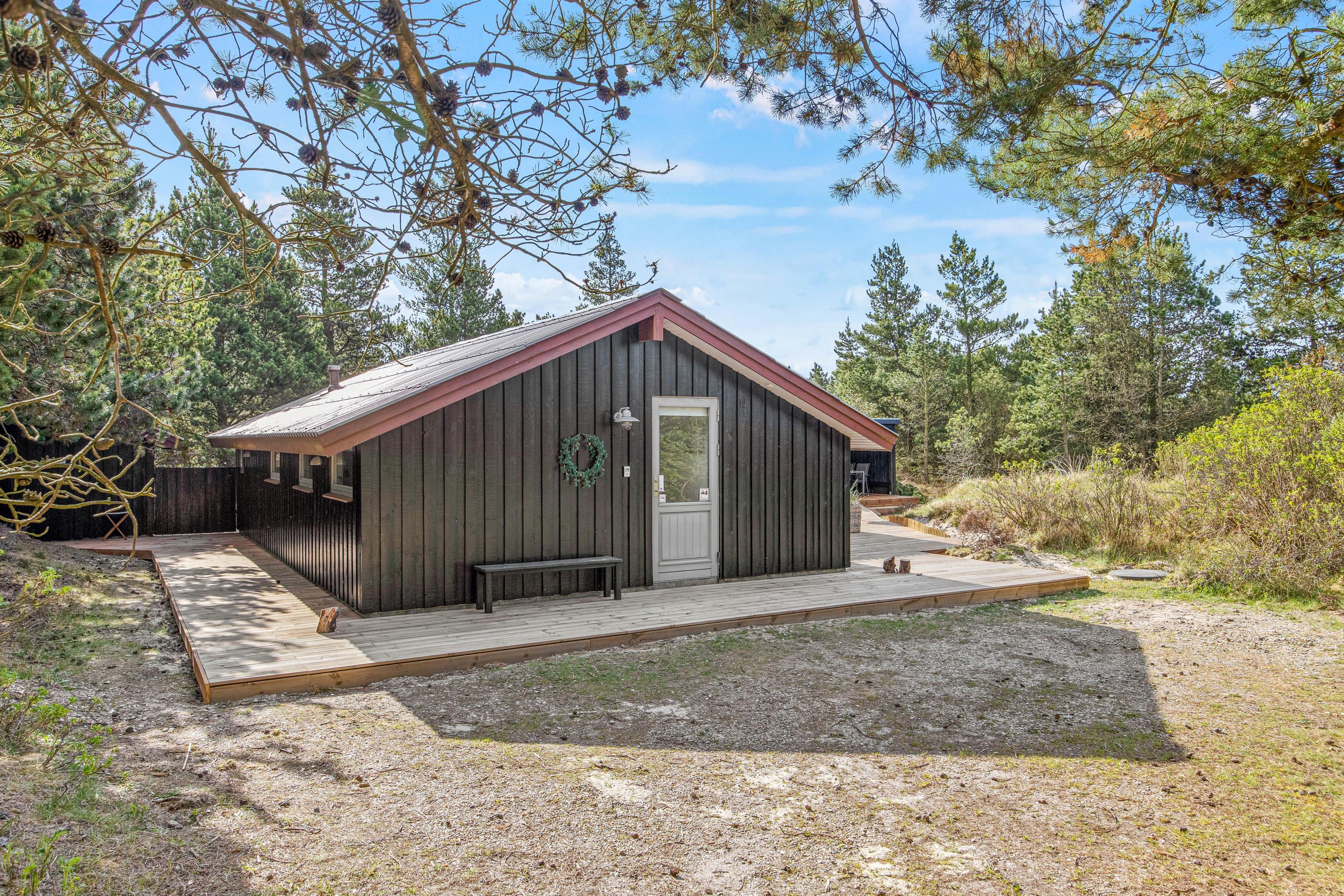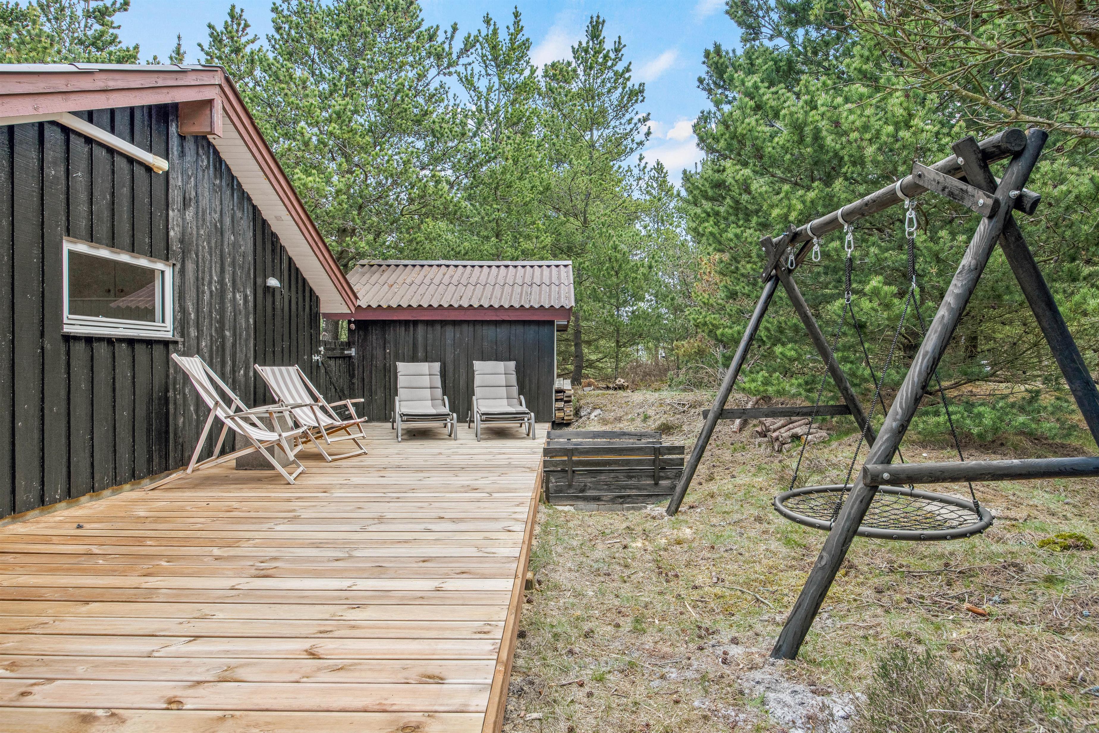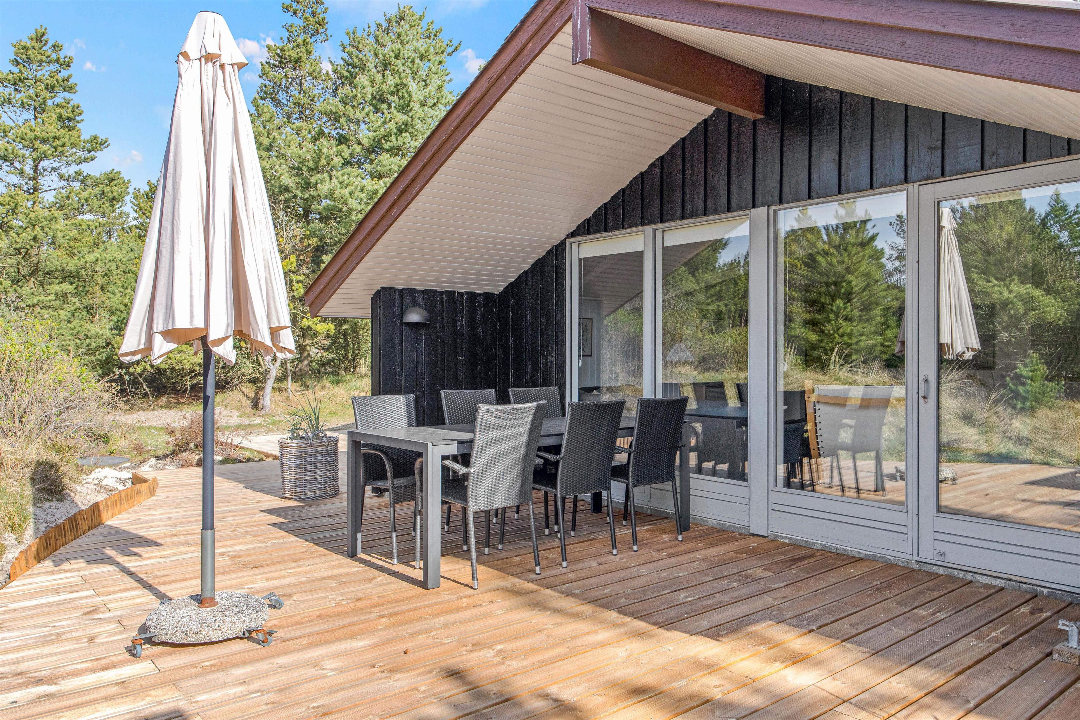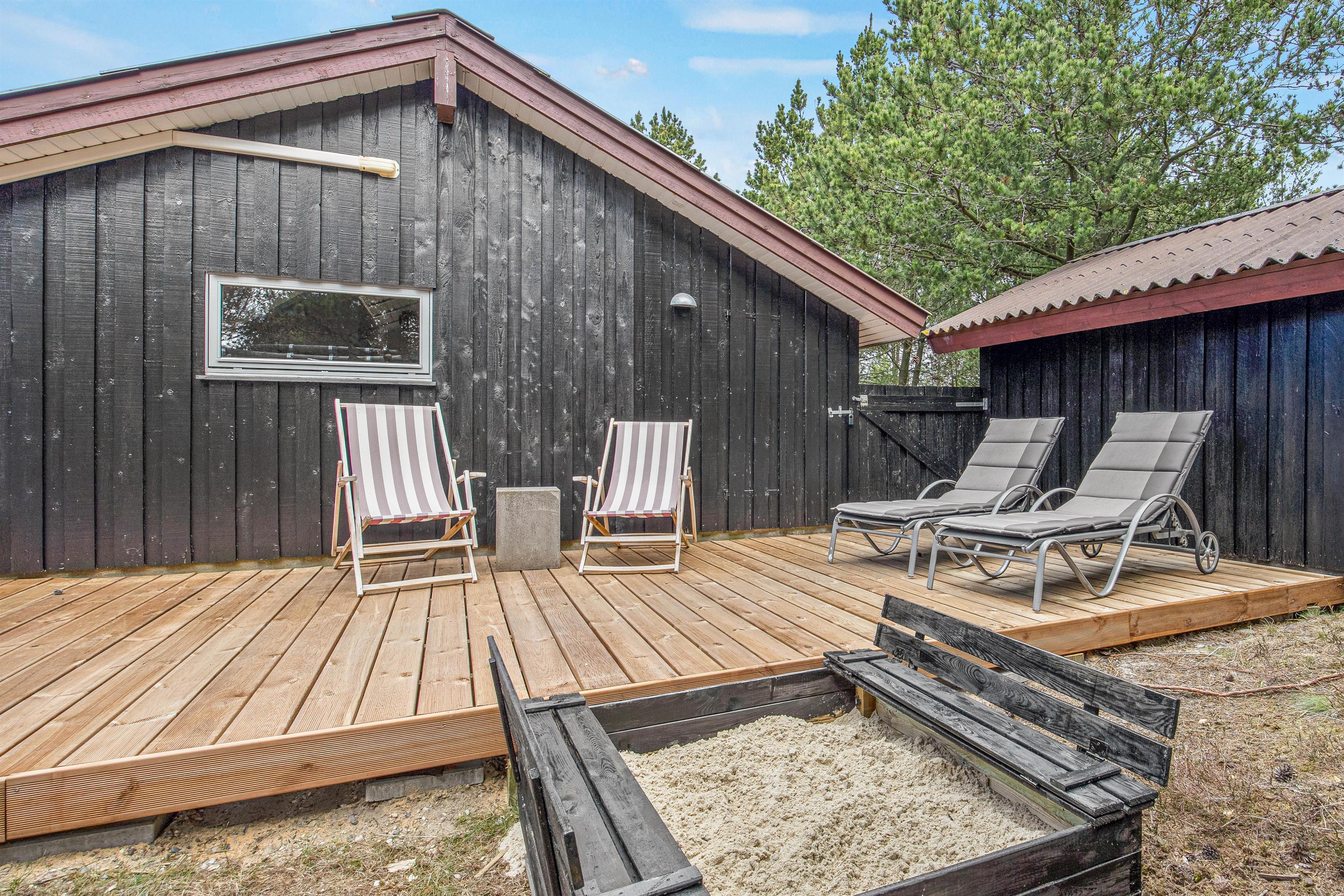 Det fine sorte sommerhus ligger på en dejlig stor naturgrund og omfavnes af en skøn åben træterrasse. Her er altid mulighed for at finde en plads i solen, om det er til aftensmadstid eller morgenkaffen. Mod sydvest står havemøbler og liggestole klar til jer, mens I yderst finder en afskærmet pergola med gasgrill og loungesofa. Om dagen er sofaen den ideelle plads i skyggen, mens den på de lune sommeraftner indbyder til et godt glas. Sid her, mens solen langsomt går ned, marehalmen vifter roligt i vinden og kun lyskæderne i loftet lyser.