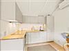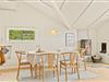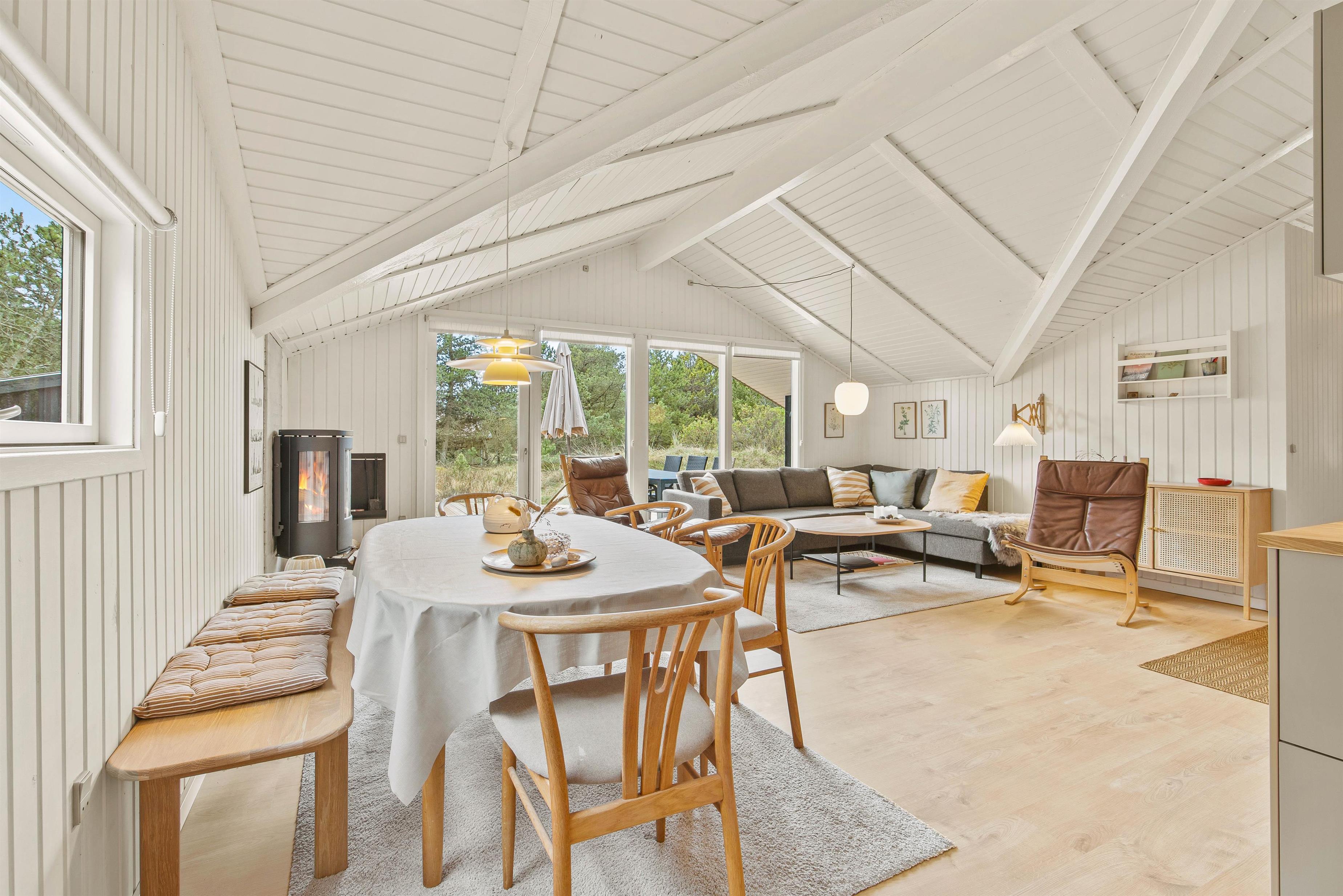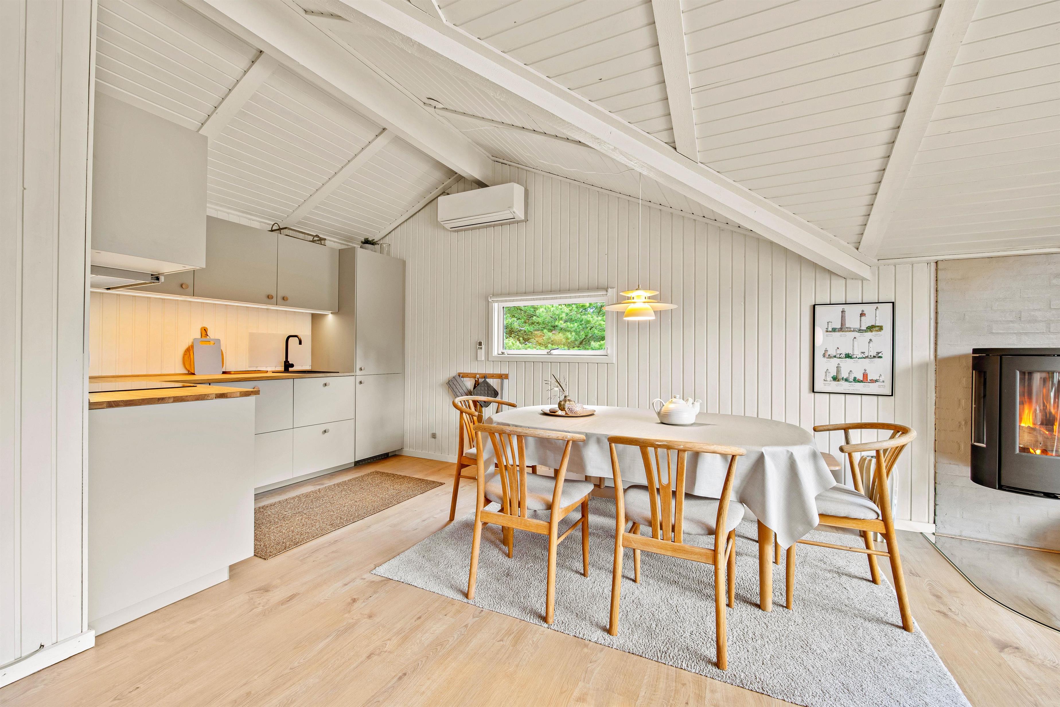 Samlingspunktet i sommerhuset bliver helt sikkert det lyse køkkenalrum, hvor stuen ligger i åben forbindelse. Her kan op til 6 feriegæster samles i sofaen til filmhygge, brætspil eller lave et lækkert måltid i det funktionelle køkken. I alrummet er der plads til, at I kan opholde jer sammen, selvom I evt. har gang i hvert sit. Loftet til kip og det store vinduesparti skaber en luftig atmosfære, som sammen med brændeovnens varme skaber den ideelle sommerhusstemning – også i de koldere måneder, hvor en kop varm kakao og god bog også hører sig til.
