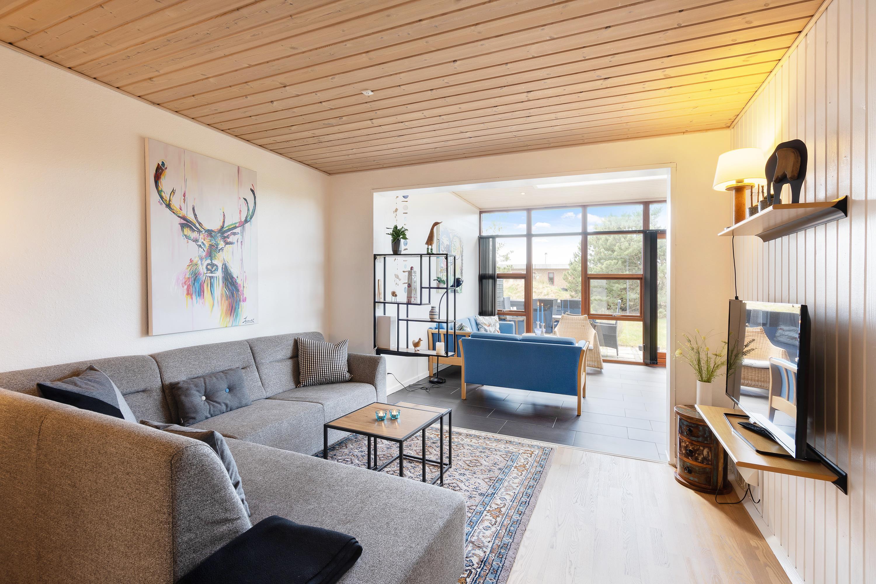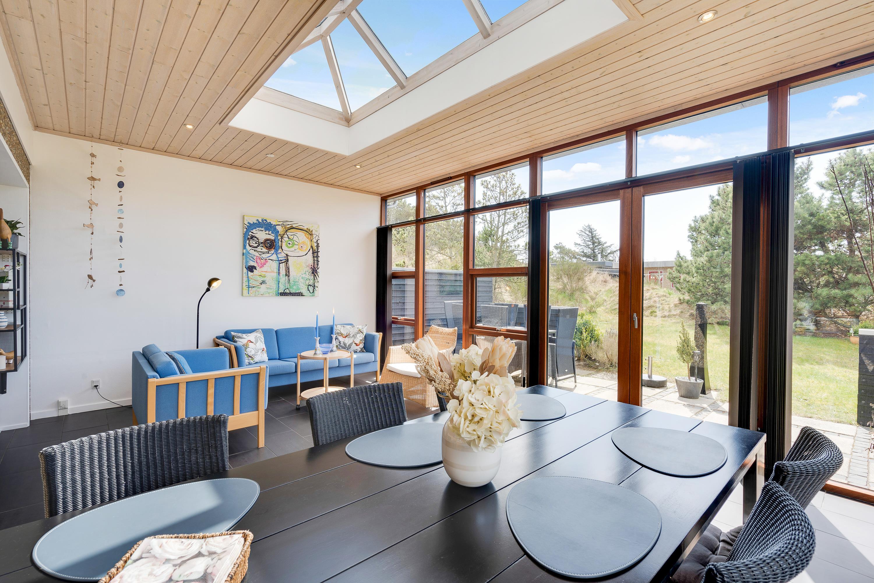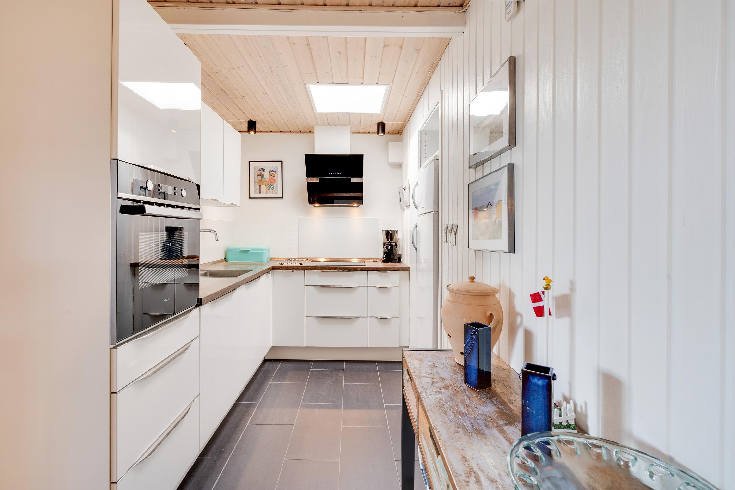 Sommerhusets køkken er udstyret med en opvaskemaskine, der klarer opvasken for jer, så I kan bruge jeres ferietid med hinanden og gode oplevelser. Et hyggeligt stort sofahjørne med fjernsyn og et lille fint kontorhjørne befinder sig i køkken-alrummet, men feriehusets mest fantastiske rum er nok "udestuen". Store vinduespartier og et ovenlysvindue lukker masser af lys ind i rummet, der er indrettet med både spise- og sofahjørne. Herfra kan I nyde udsigten til sommerhusets have og I kan passende tilbringe dagen her, hvis I skulle være så uheldige, at vejret ikke er med jer.