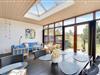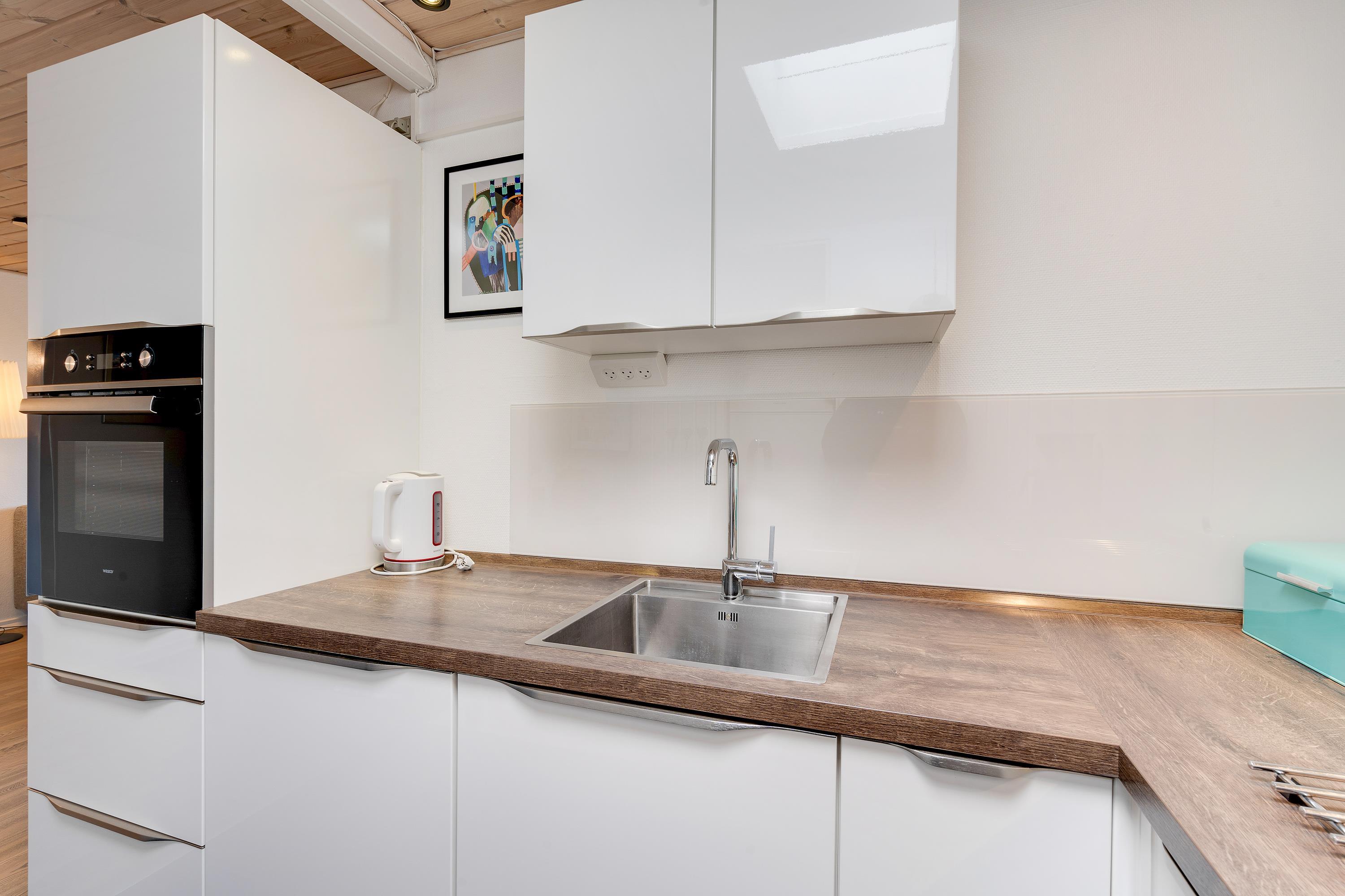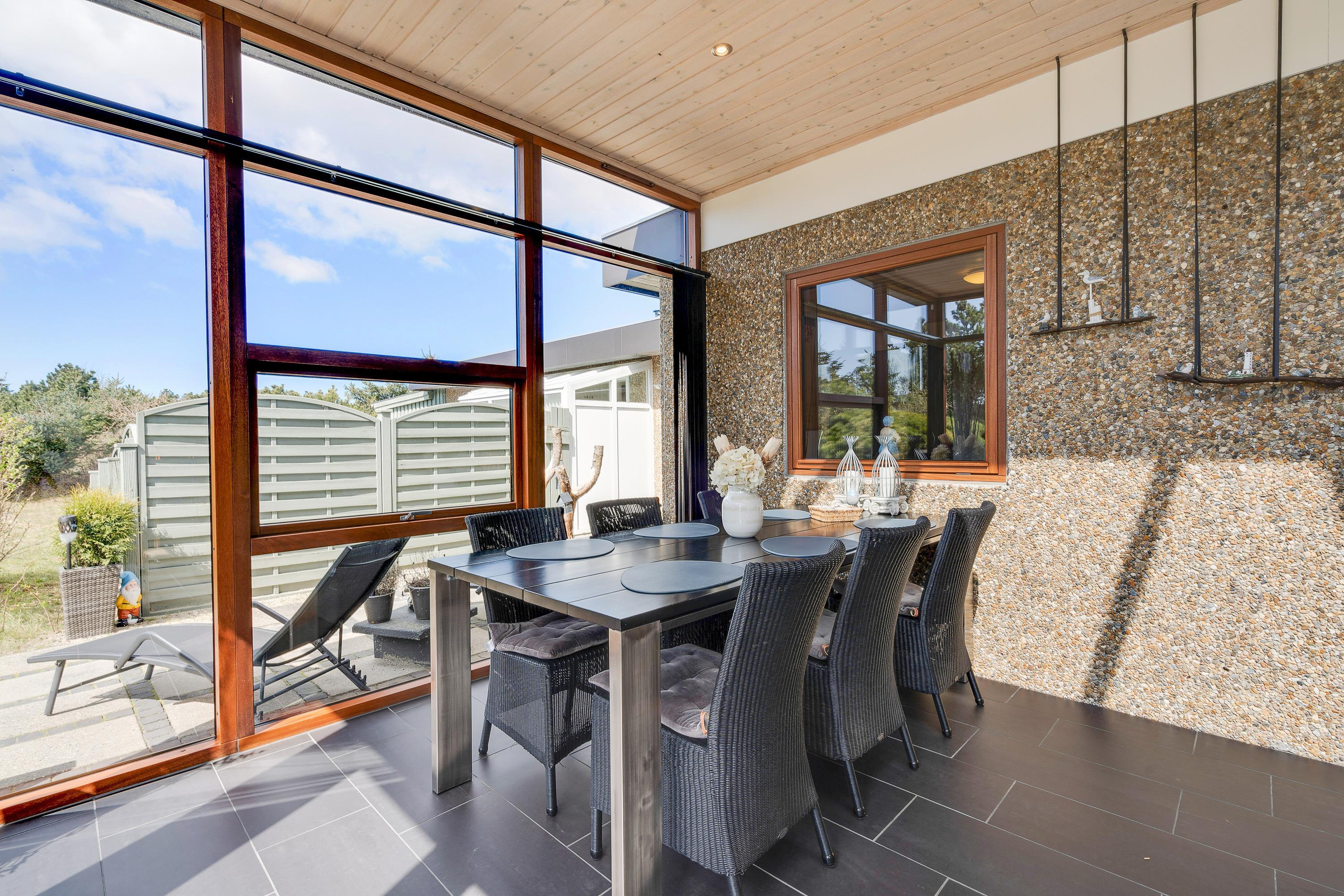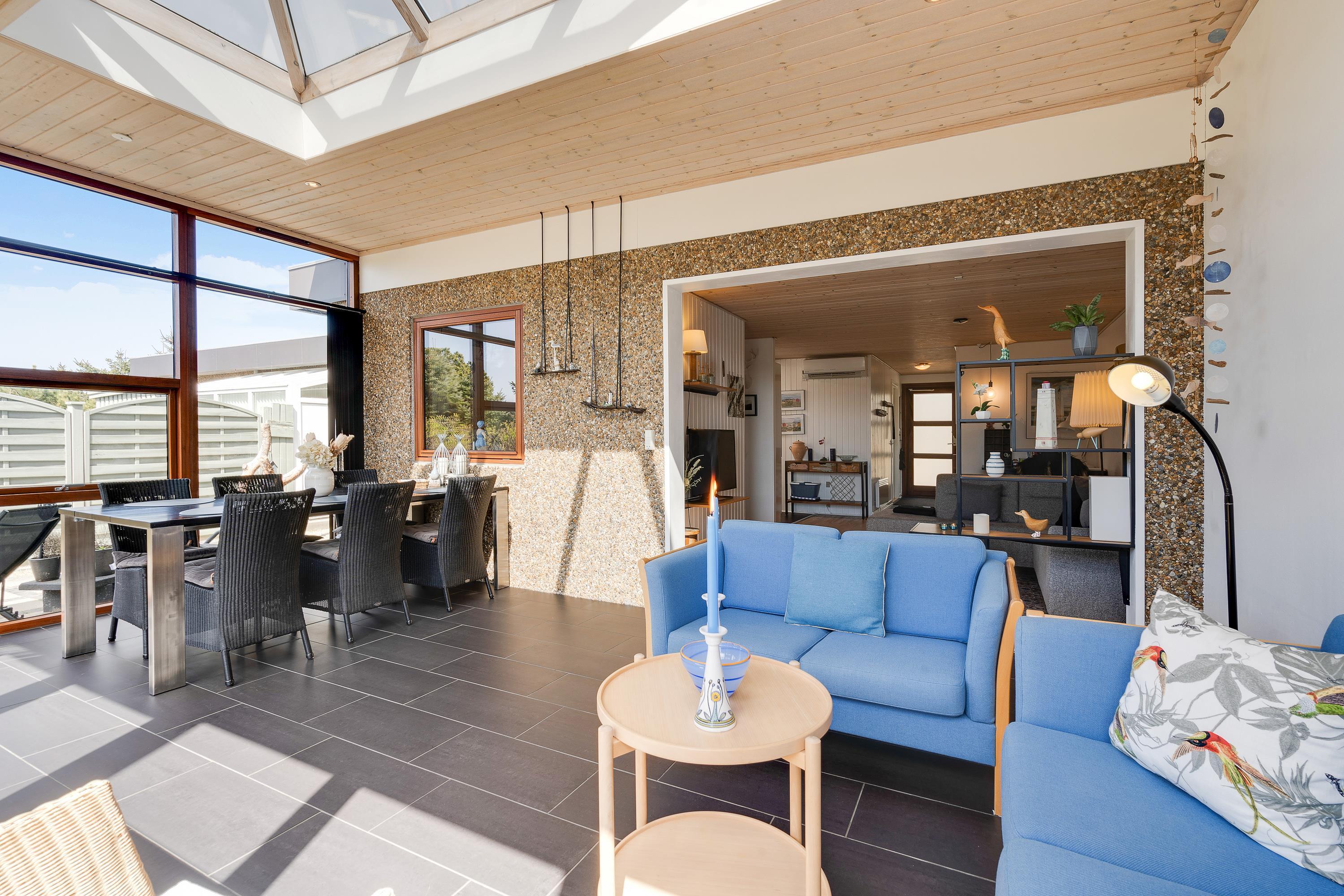 Sommerhusets køkken er udstyret med en opvaskemaskine, der klarer opvasken for jer, så I kan bruge jeres ferietid med hinanden og gode oplevelser. Et hyggeligt stort sofahjørne med fjernsyn og et lille fint kontorhjørne befinder sig i køkken-alrummet, men feriehusets mest fantastiske rum er nok "udestuen". Store vinduespartier og et ovenlysvindue lukker masser af lys ind i rummet, der er indrettet med både spise- og sofahjørne. Herfra kan I nyde udsigten til sommerhusets have og I kan passende tilbringe dagen her, hvis I skulle være så uheldige, at vejret ikke er med jer.