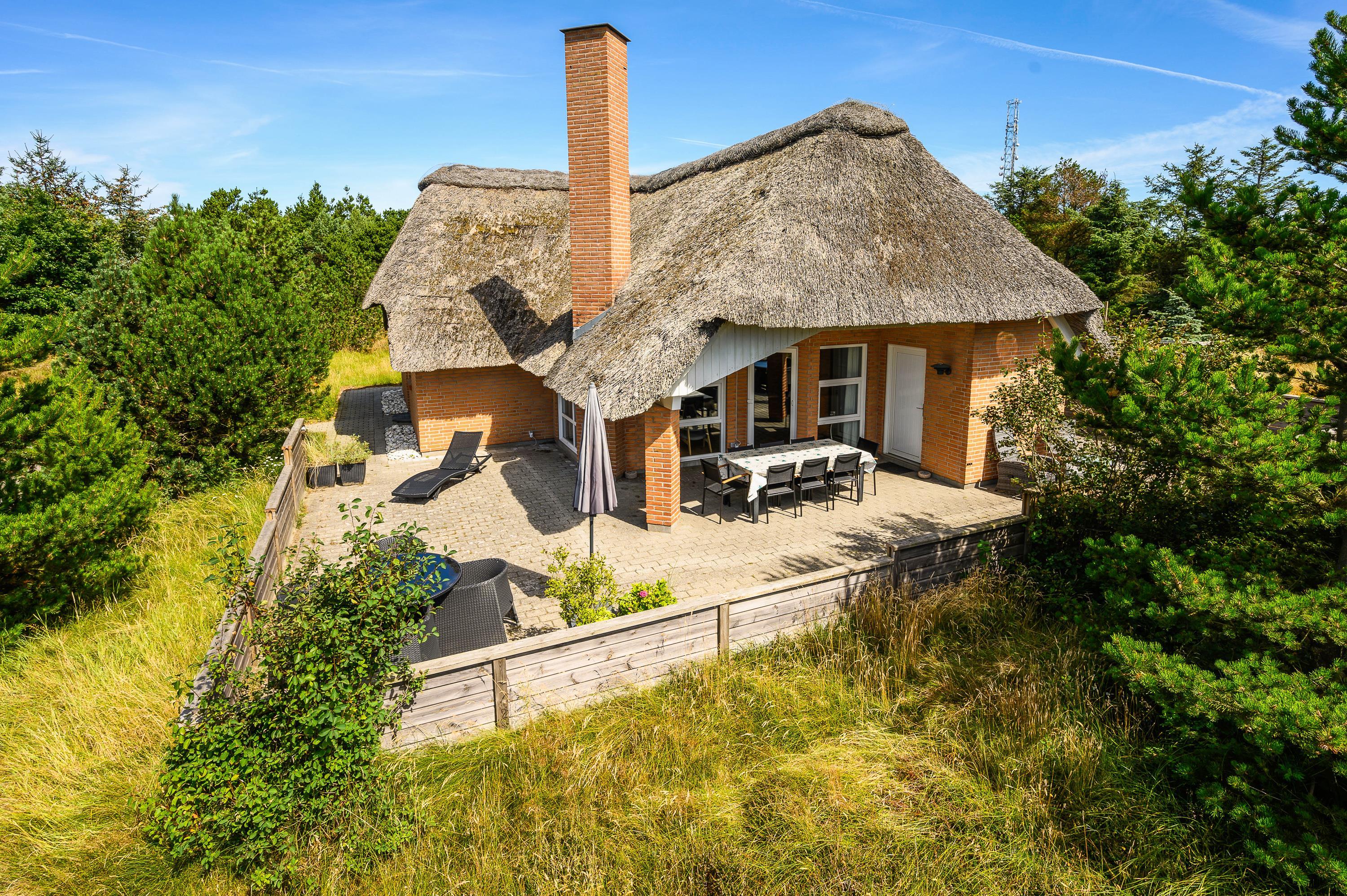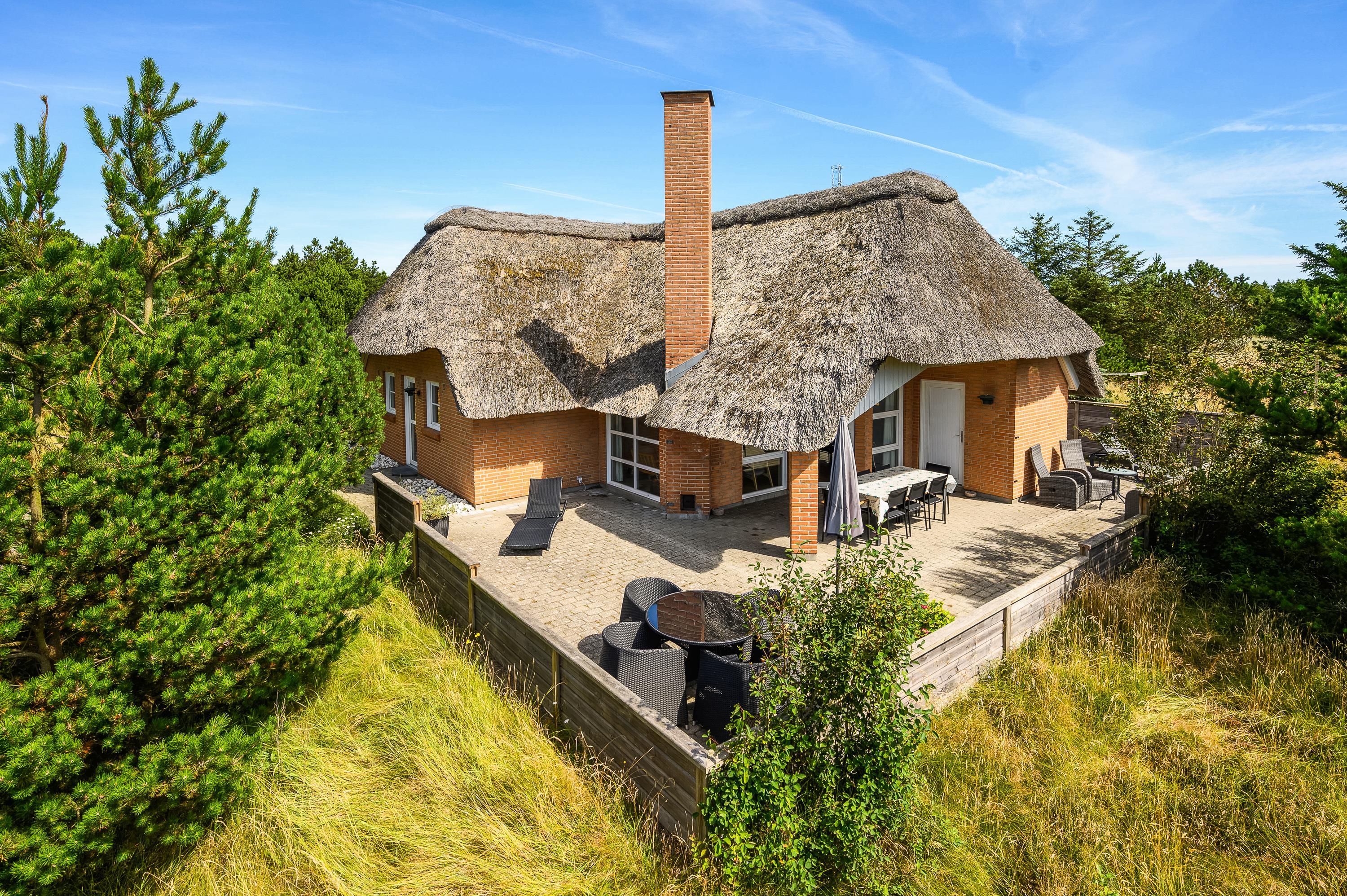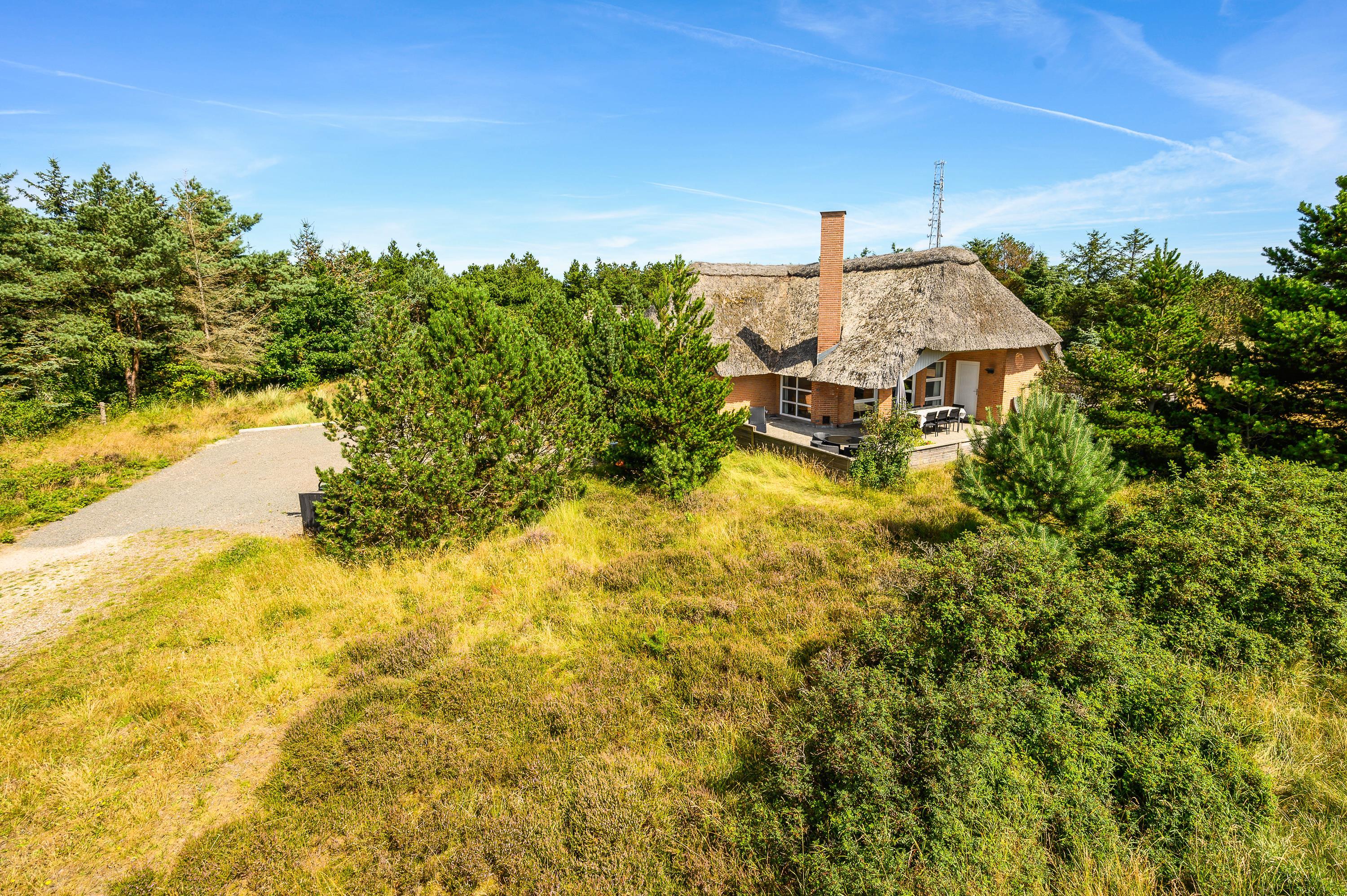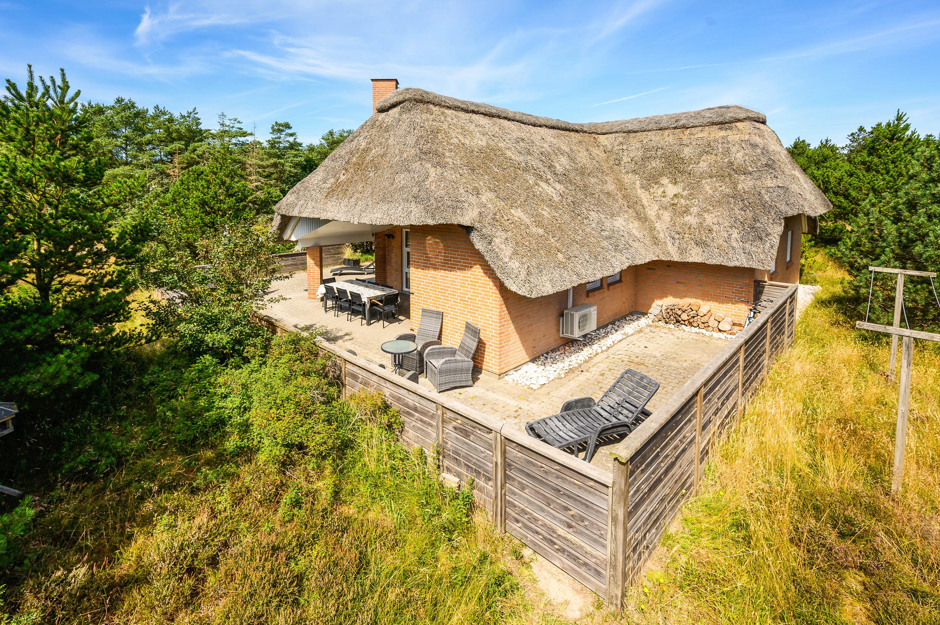 På en stor naturgrund i hedelandskabet og ugeneret for enden af en lukket vej, omgivet af grantræer og buskads, ligger dette stråtækte sommerhus. Her kan I holde en dejlig ferie med op til 8 personer (og 1 hund) i lyse og venlige omgivelser, der blandt andet er indrettet med spabad, sauna, brændeovn og varmepumpe. Det brusende Vesterhav ligger kun 400 meter væk!