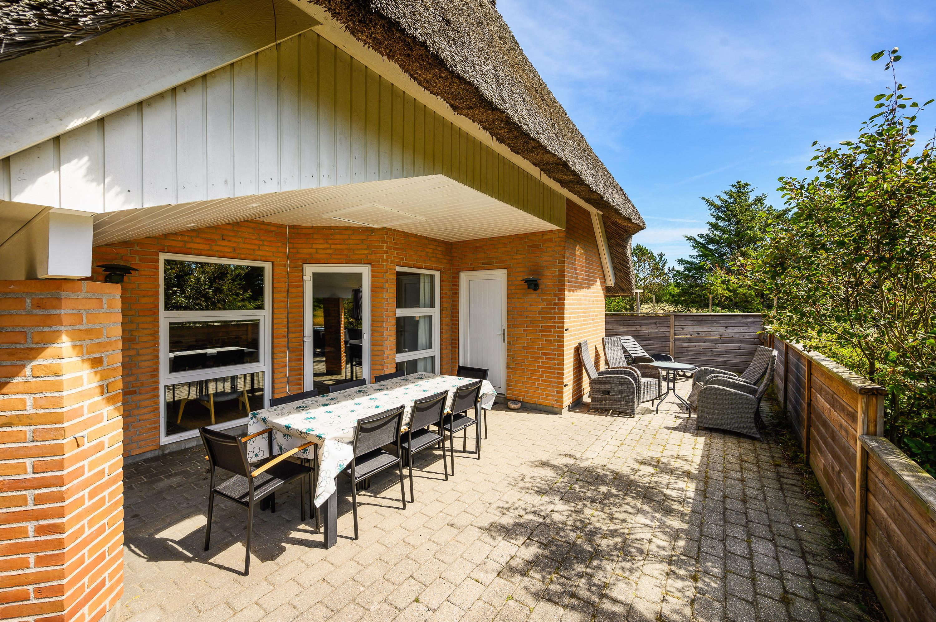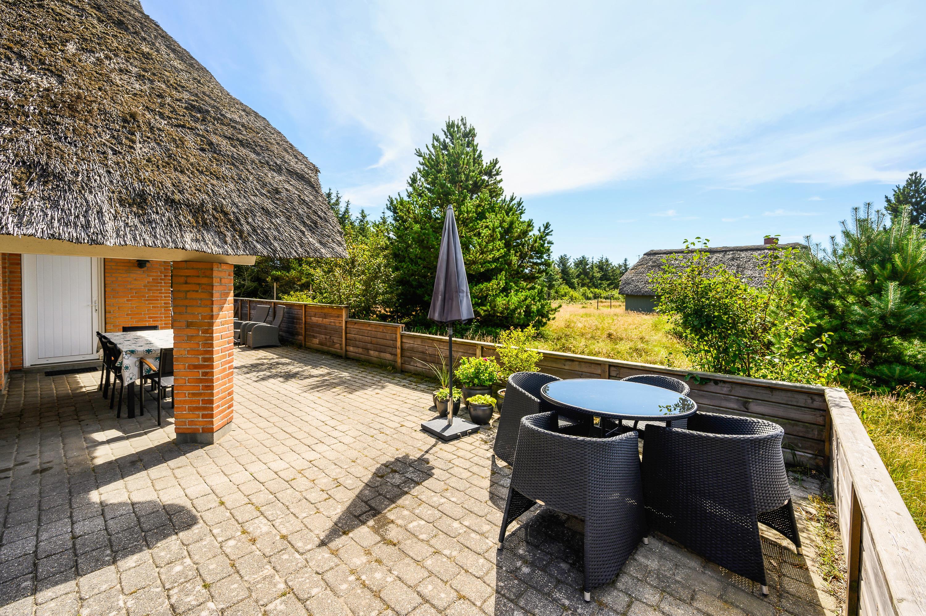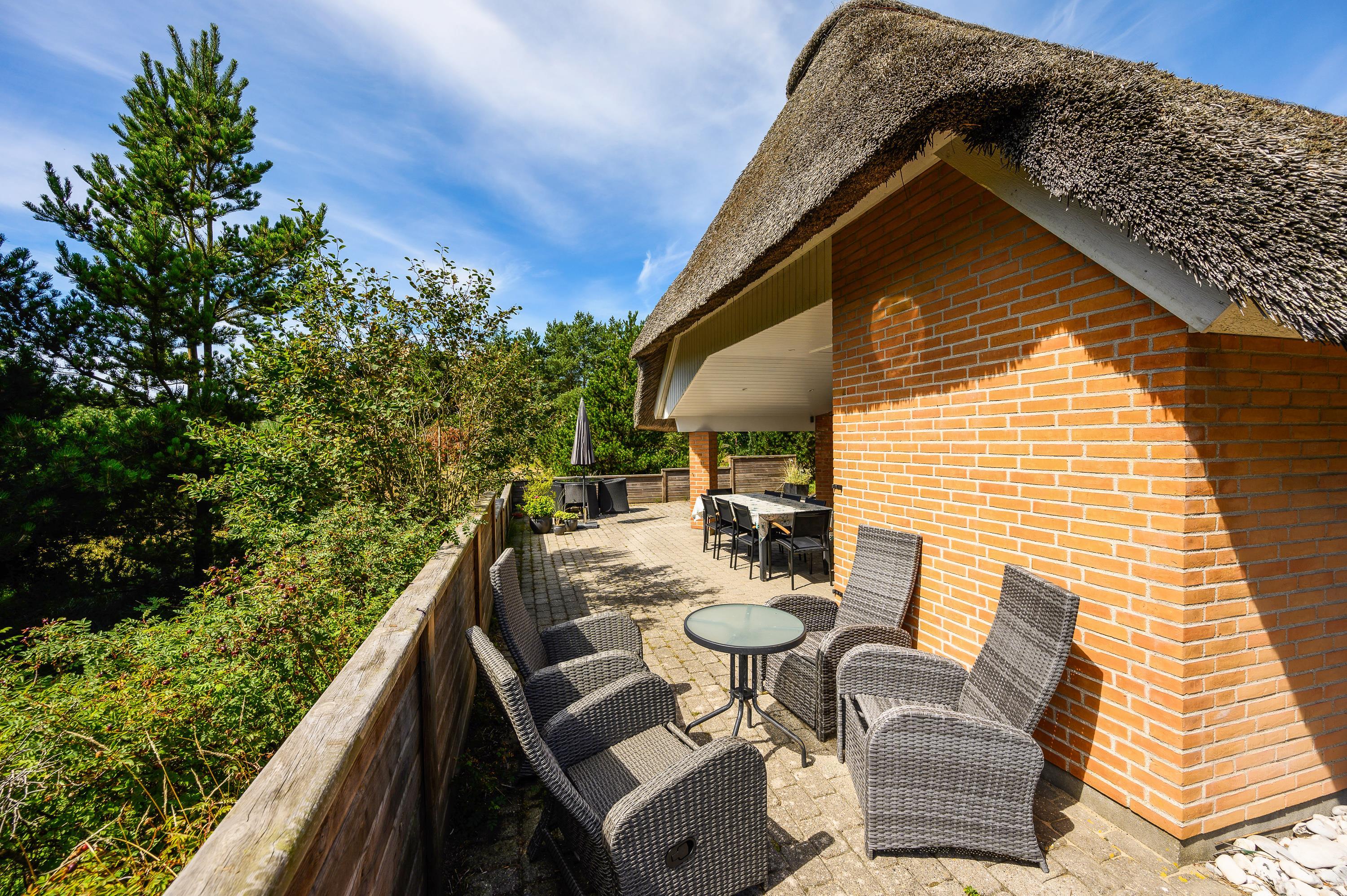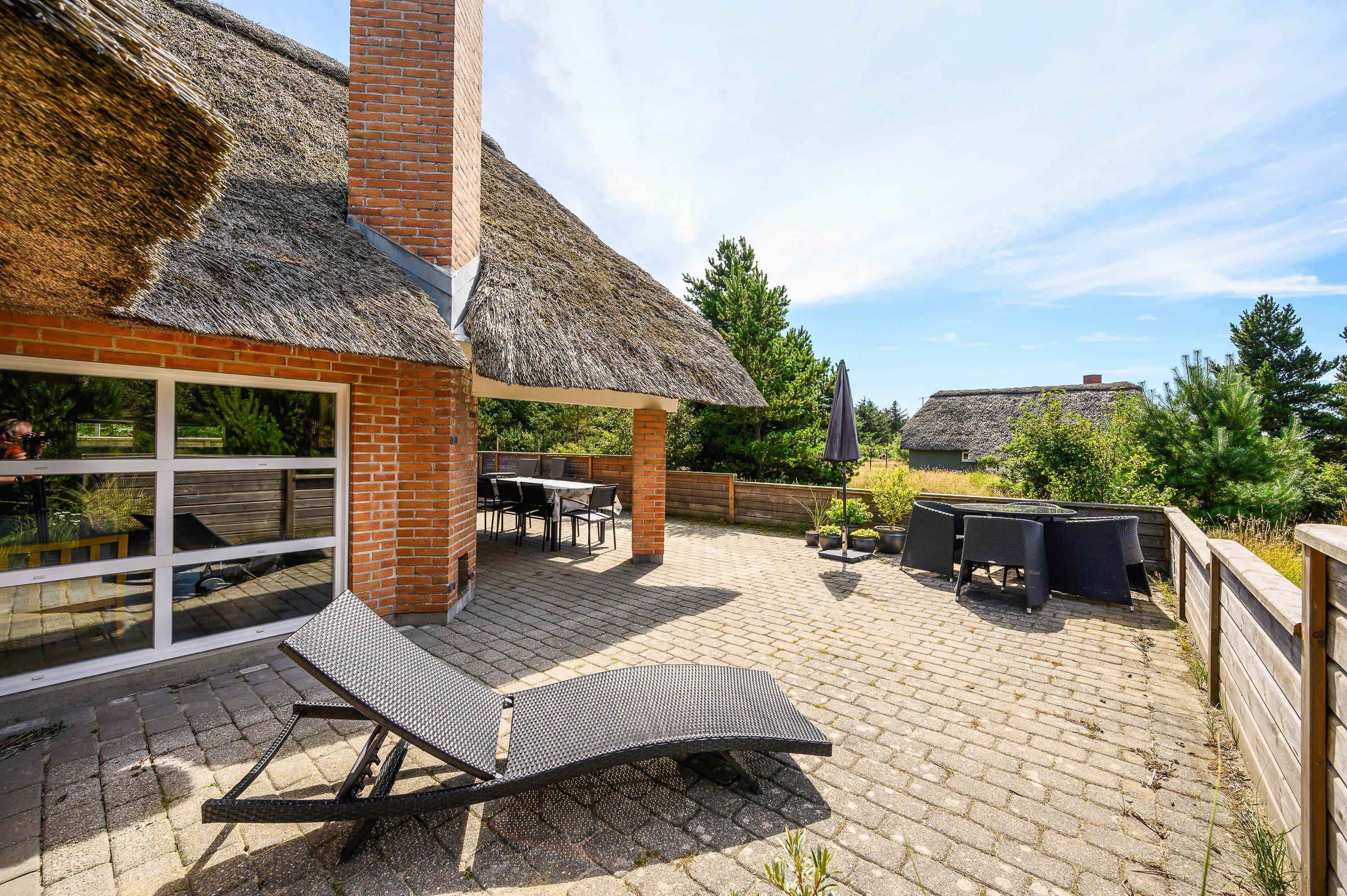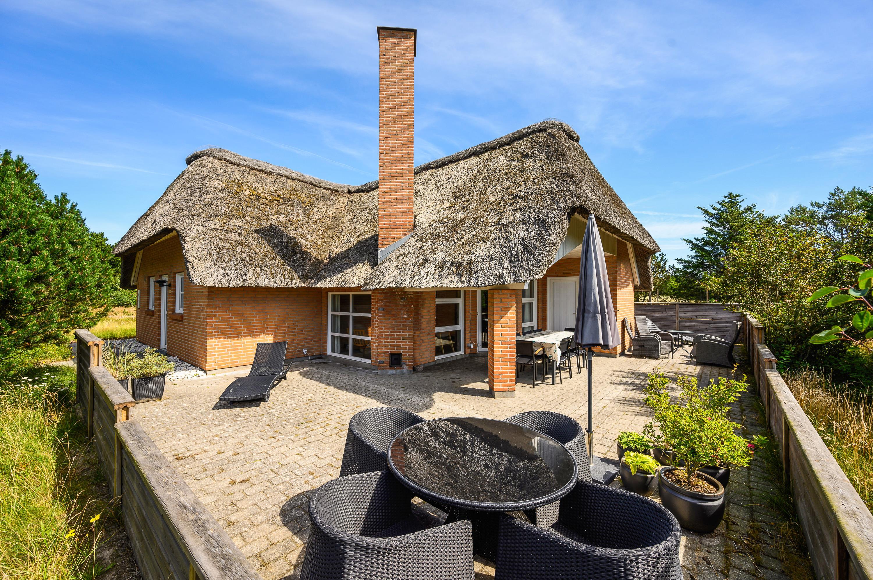 På en stor naturgrund i hedelandskabet og ugeneret for enden af en lukket vej, omgivet af grantræer og buskads, ligger dette stråtækte sommerhus. Her kan I holde en dejlig ferie med op til 8 personer (og 1 hund) i lyse og venlige omgivelser, der blandt andet er indrettet med spabad, sauna, brændeovn og varmepumpe. Det brusende Vesterhav ligger kun 400 meter væk!