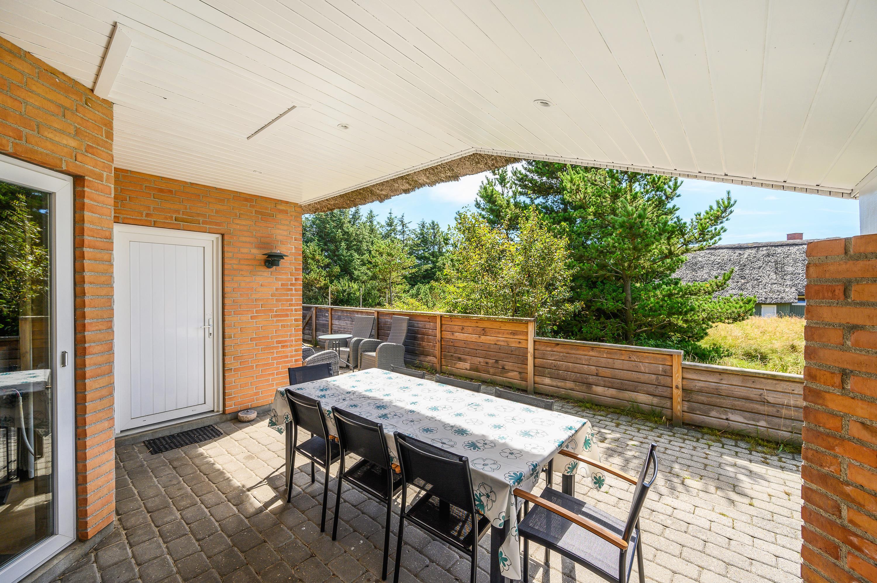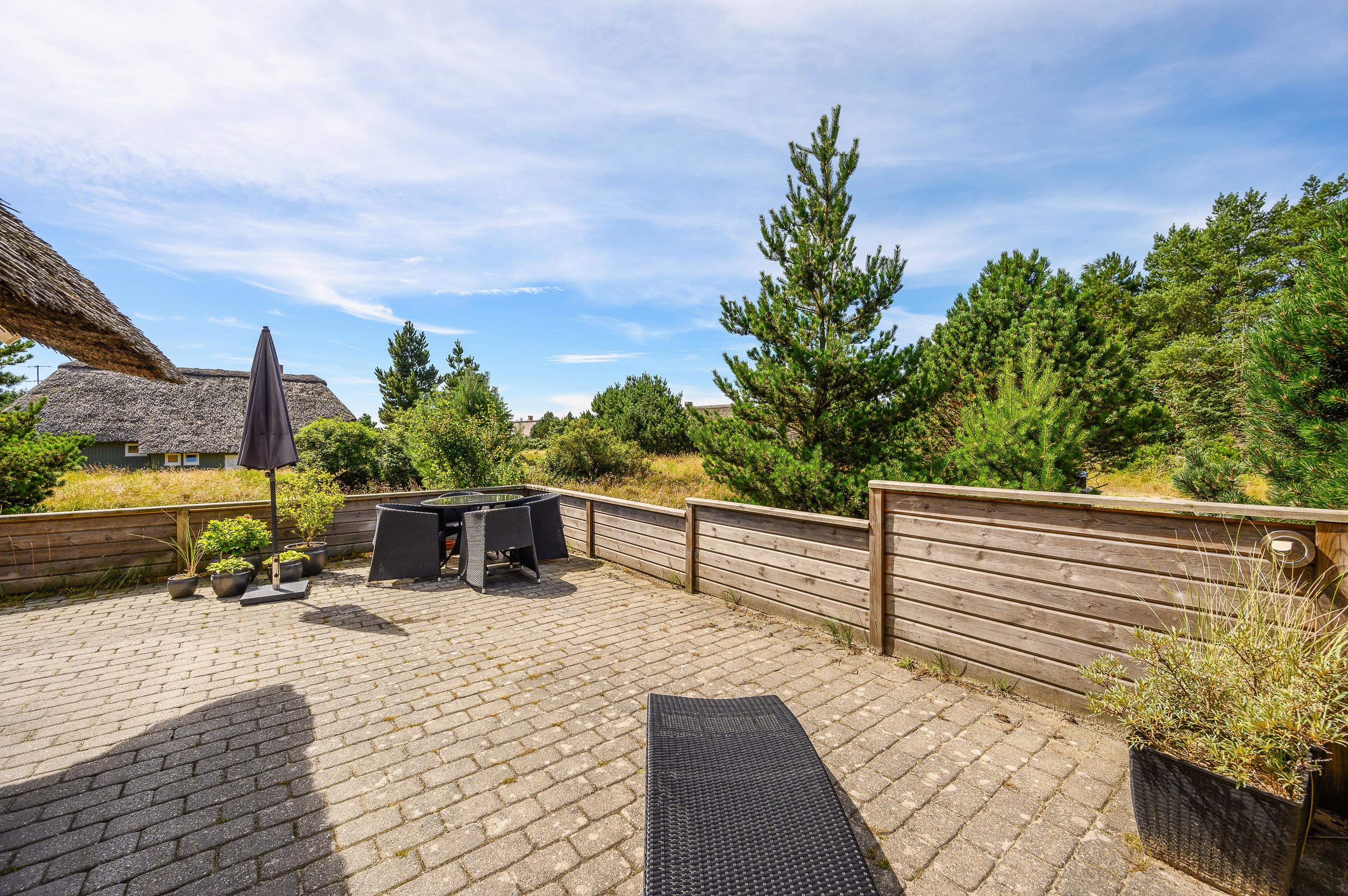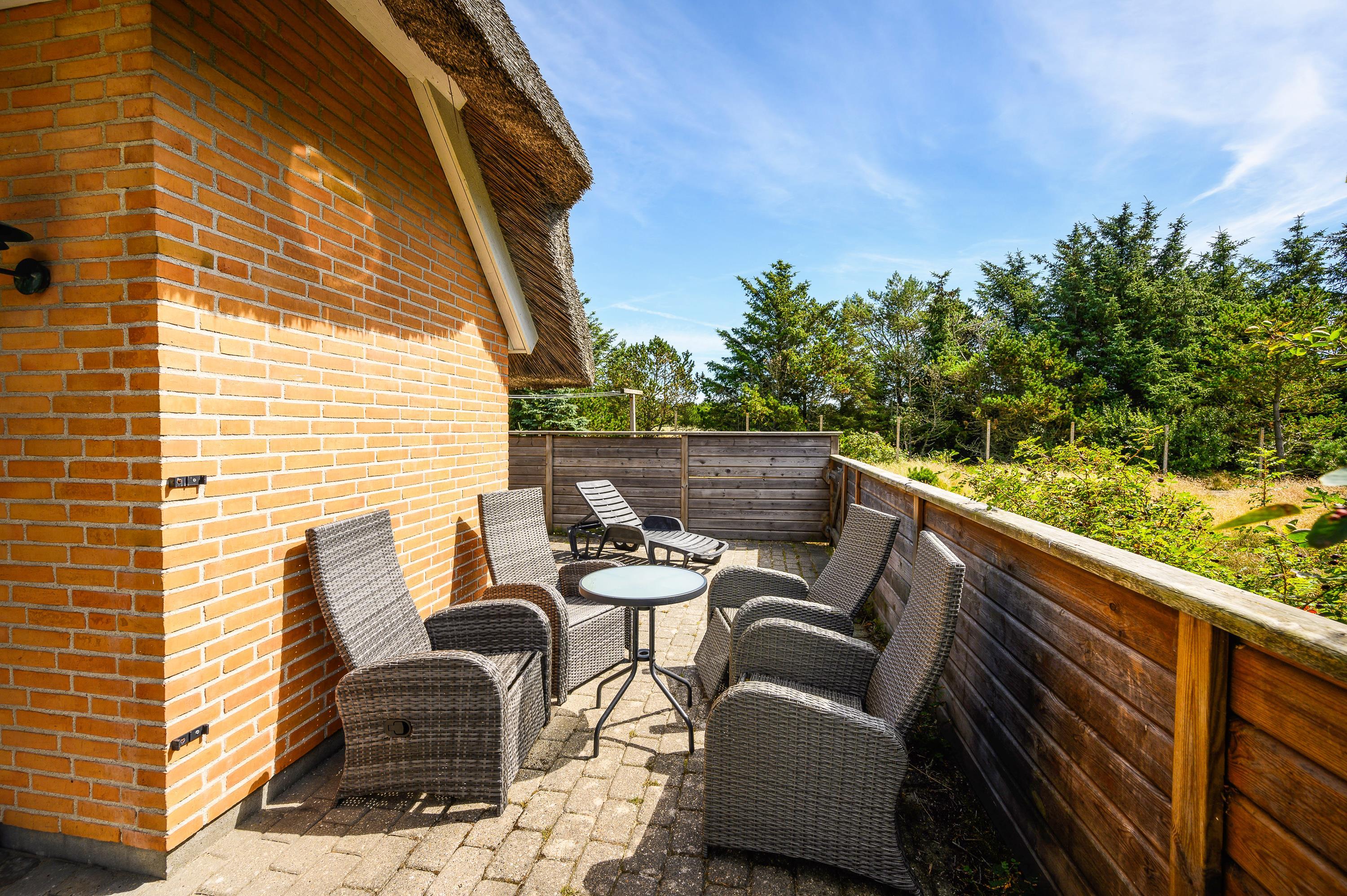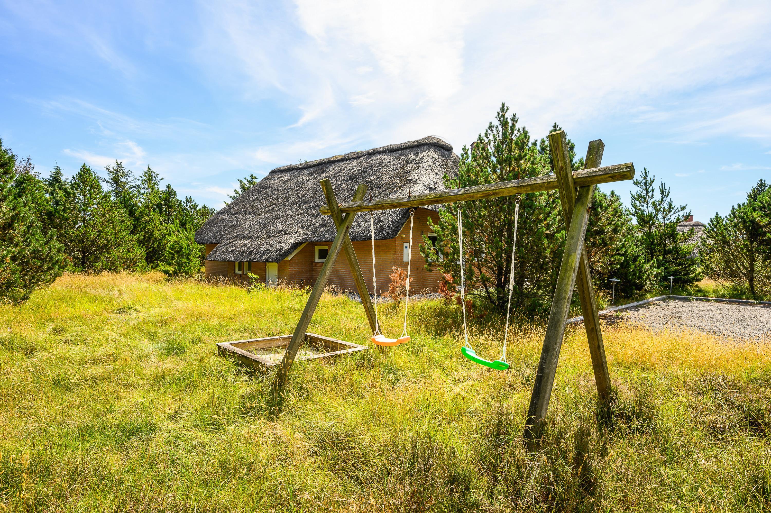 På en stor naturgrund i hedelandskabet og ugeneret for enden af en lukket vej, omgivet af grantræer og buskads, ligger dette stråtækte sommerhus. Her kan I holde en dejlig ferie med op til 8 personer (og 1 hund) i lyse og venlige omgivelser, der blandt andet er indrettet med spabad, sauna, brændeovn og varmepumpe. Det brusende Vesterhav ligger kun 400 meter væk!