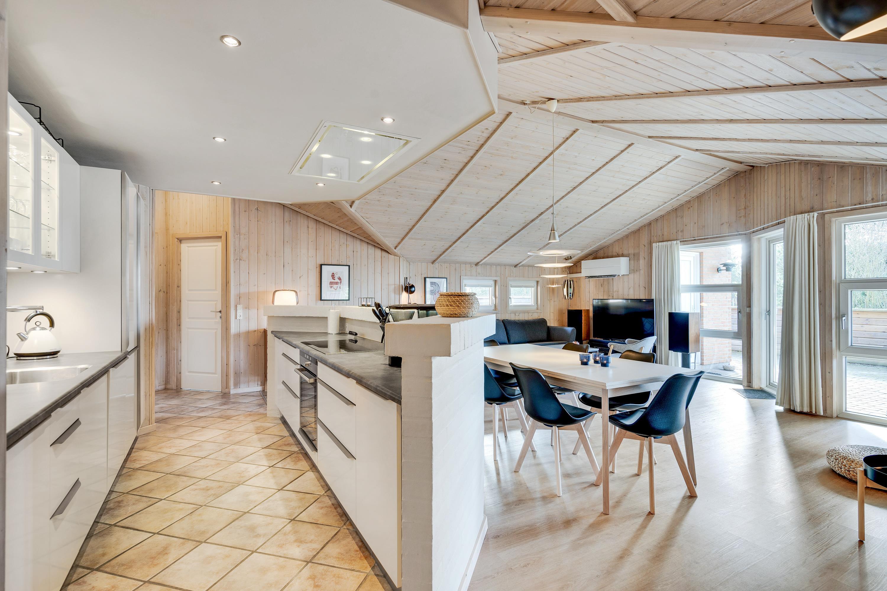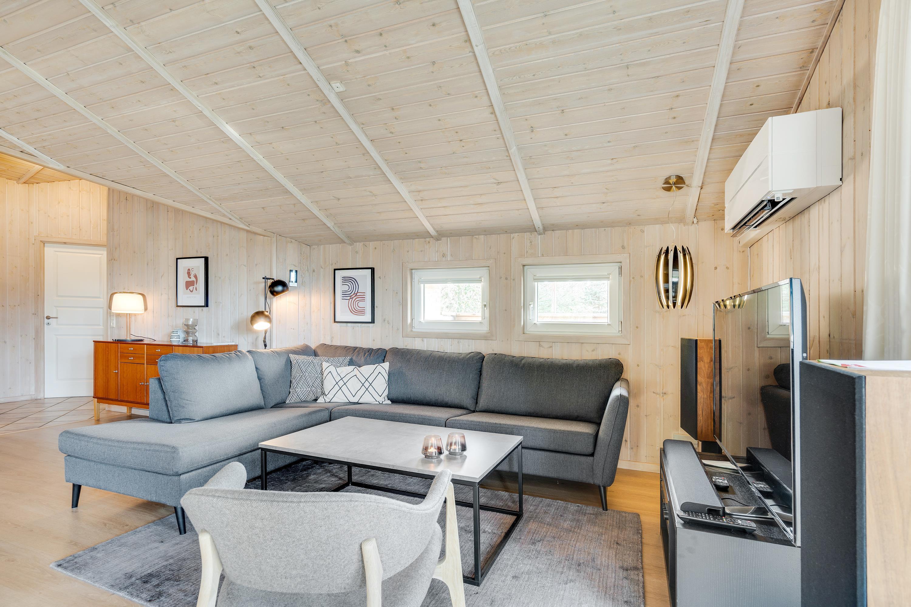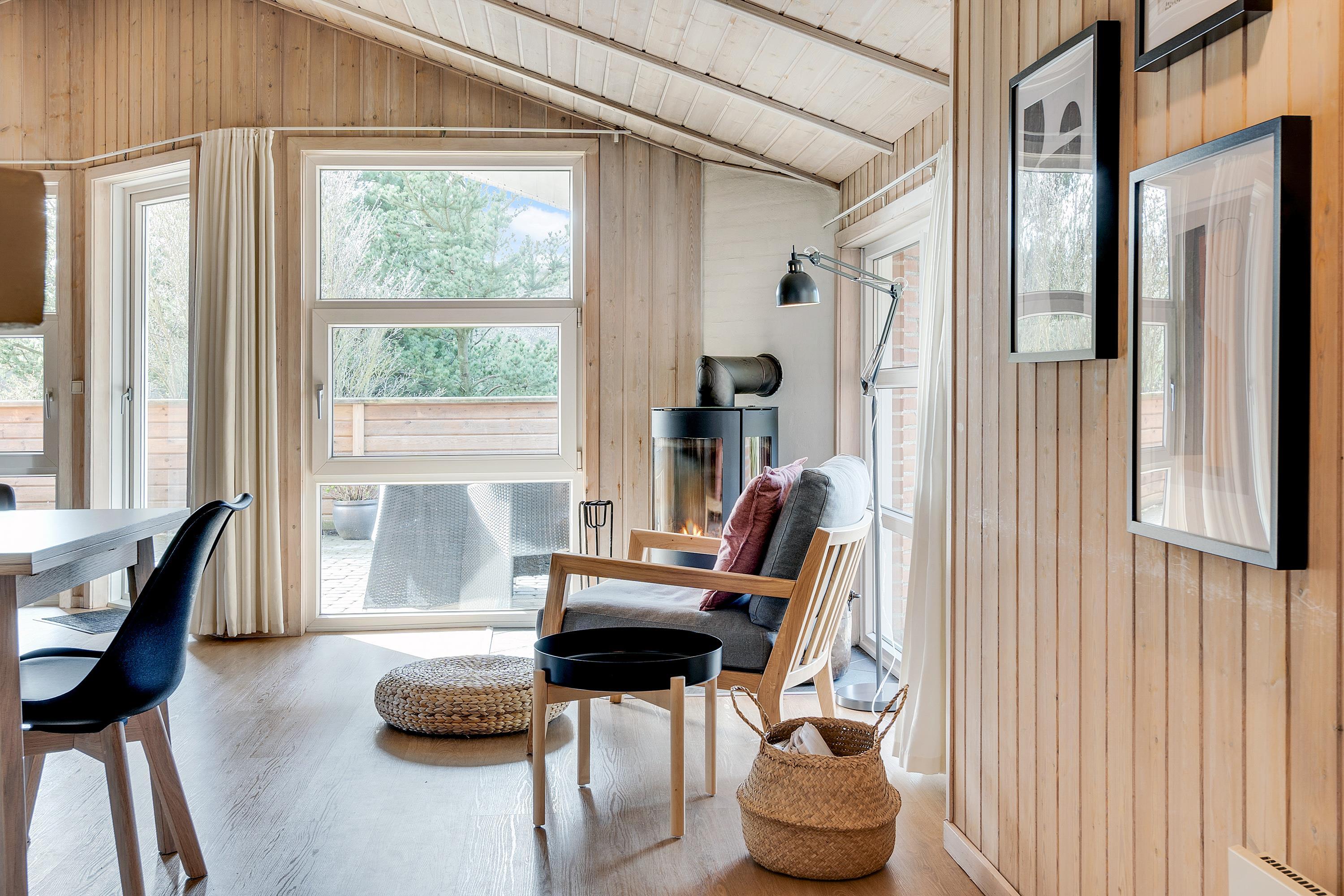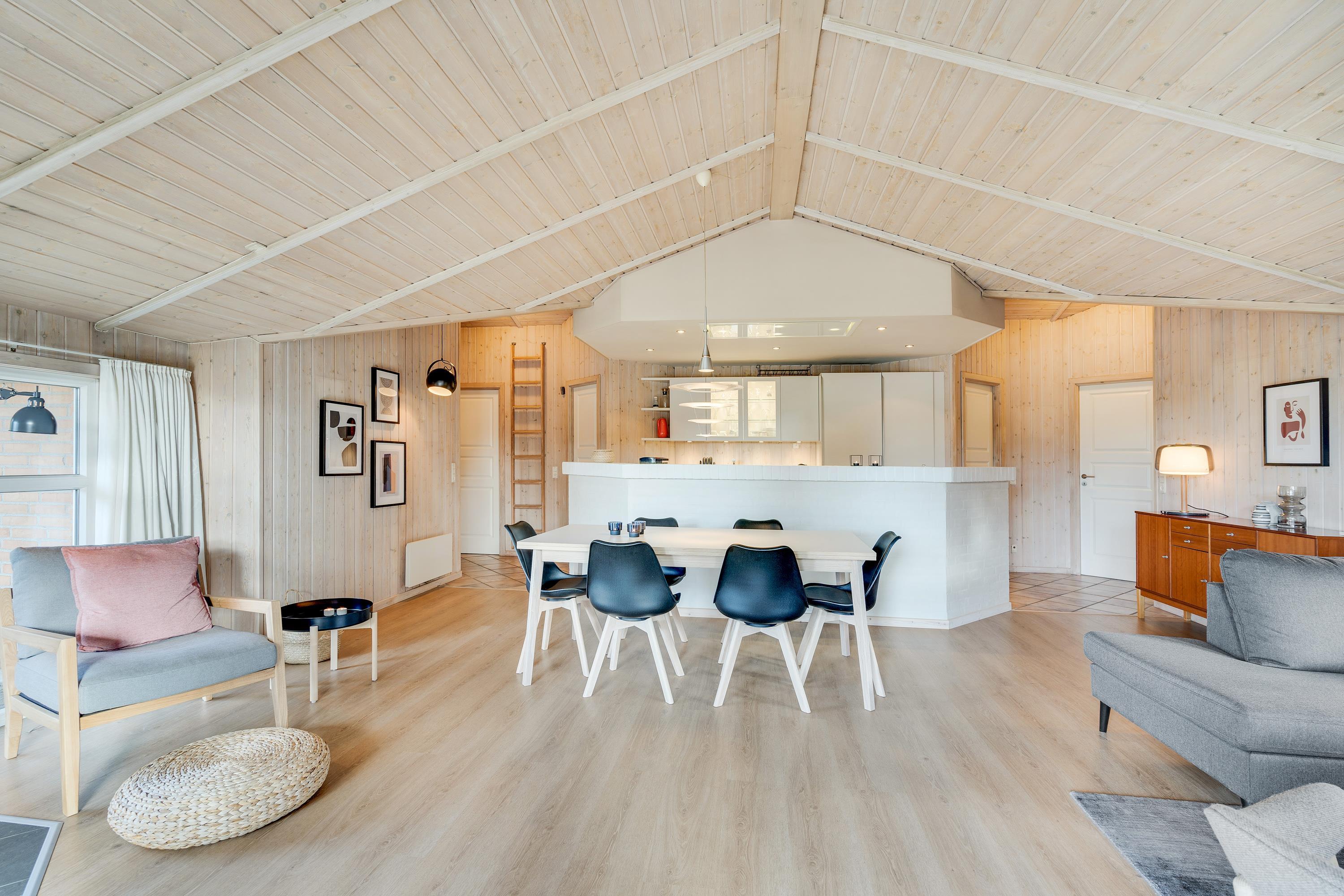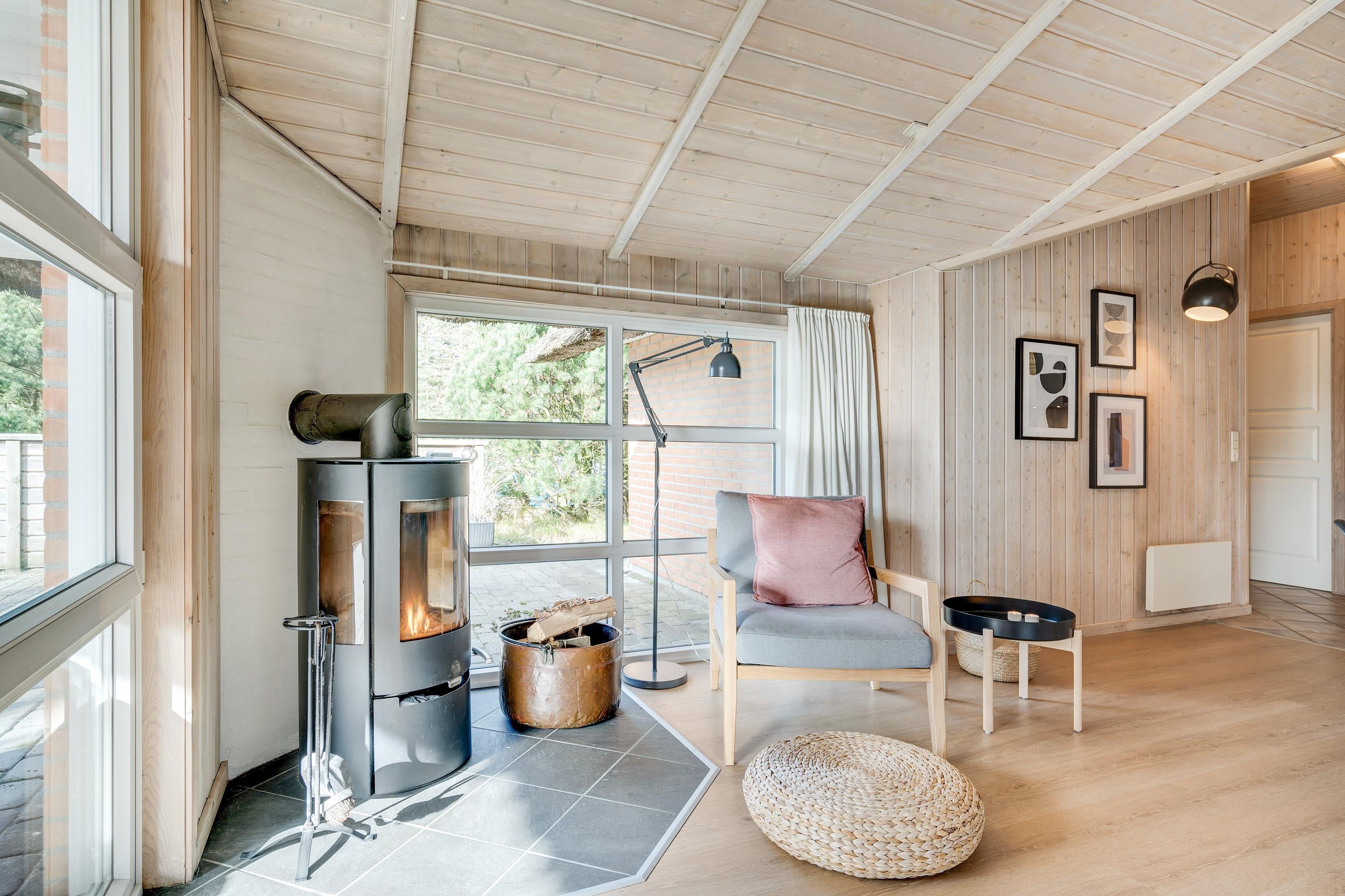 Sommerhusets hjerte er opholdsrummet, der forener køkken, spiseafdeling og stue. Her kan I samle hele familien til feriehygge, mens brændeovnen knitrer i baggrunden. Den energibesparende varmepumpe sørger for, at I har en behagelig temperatur hele året rundt.