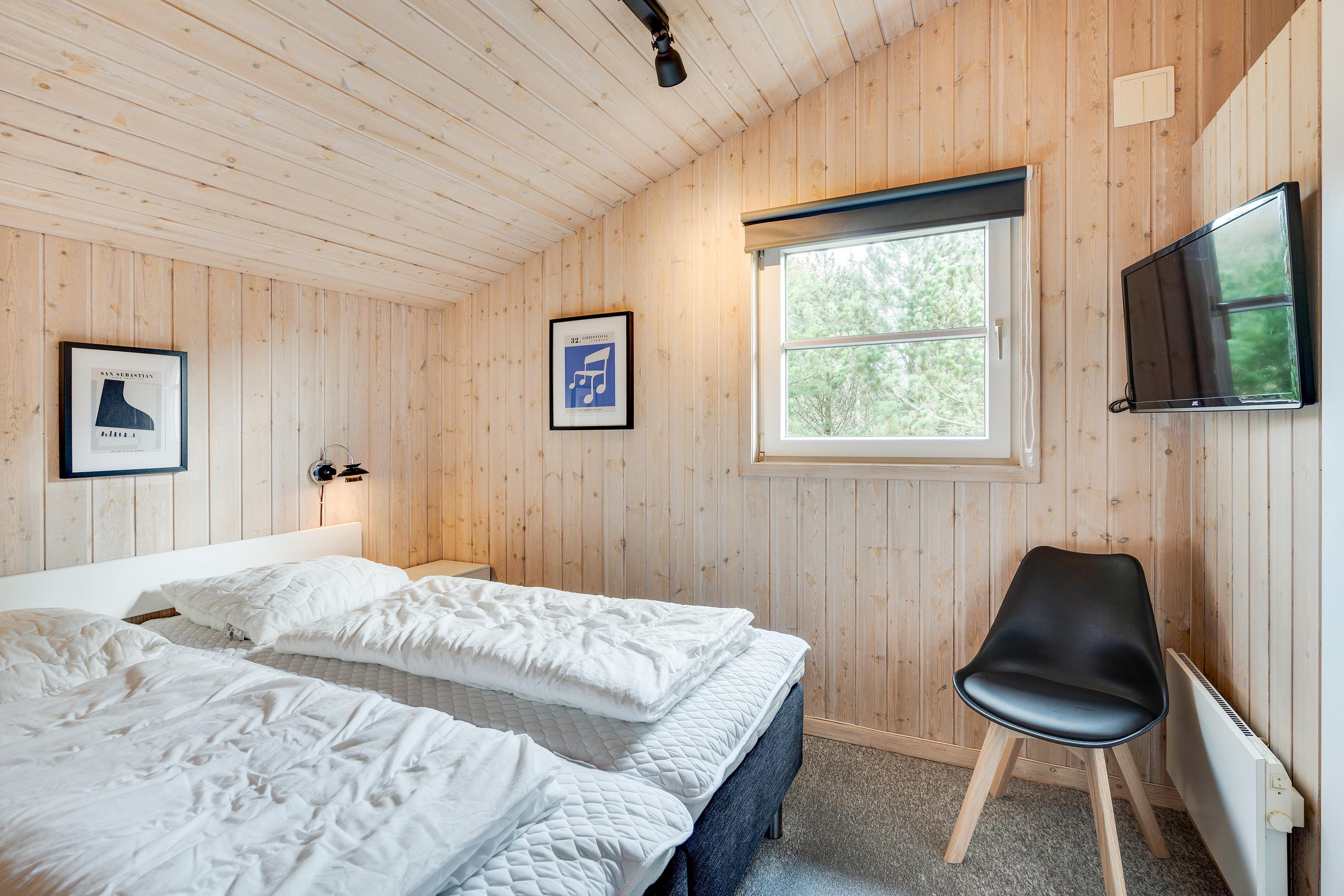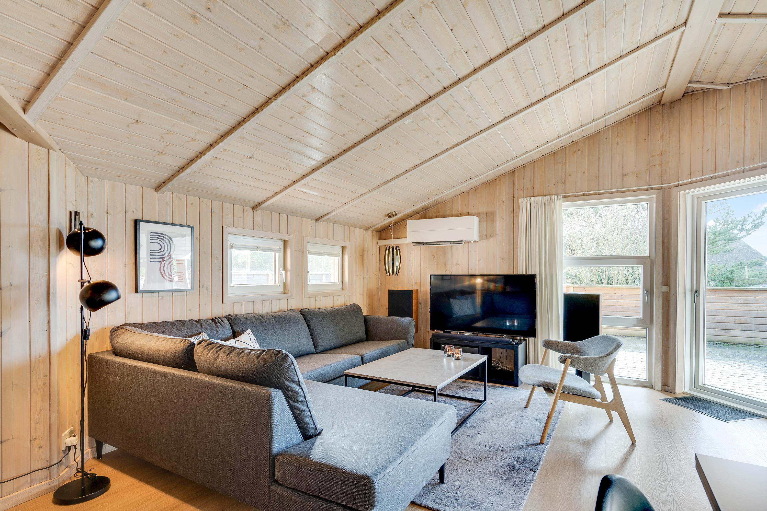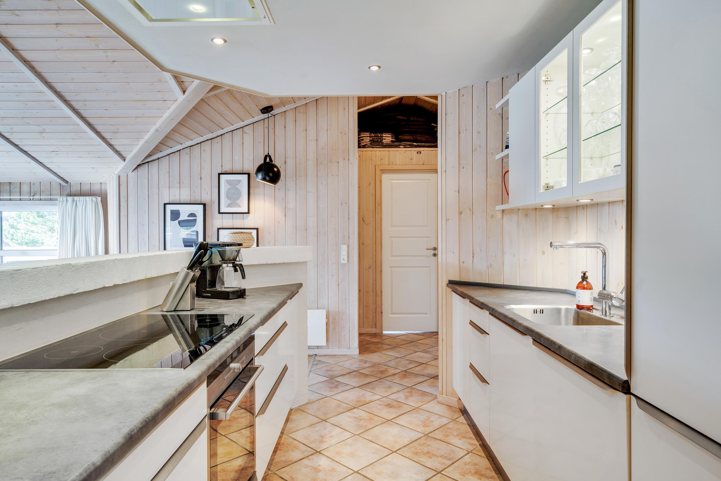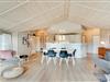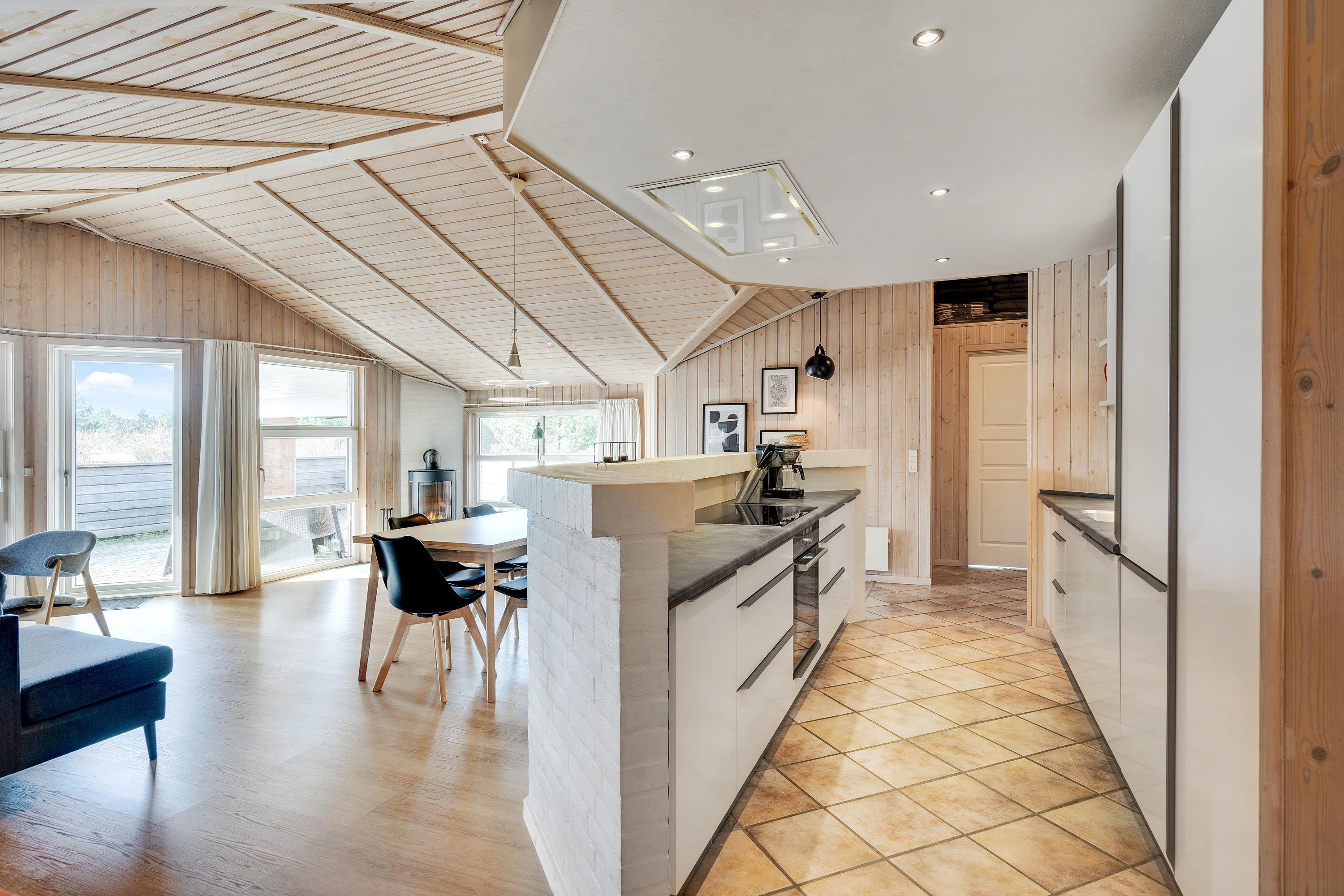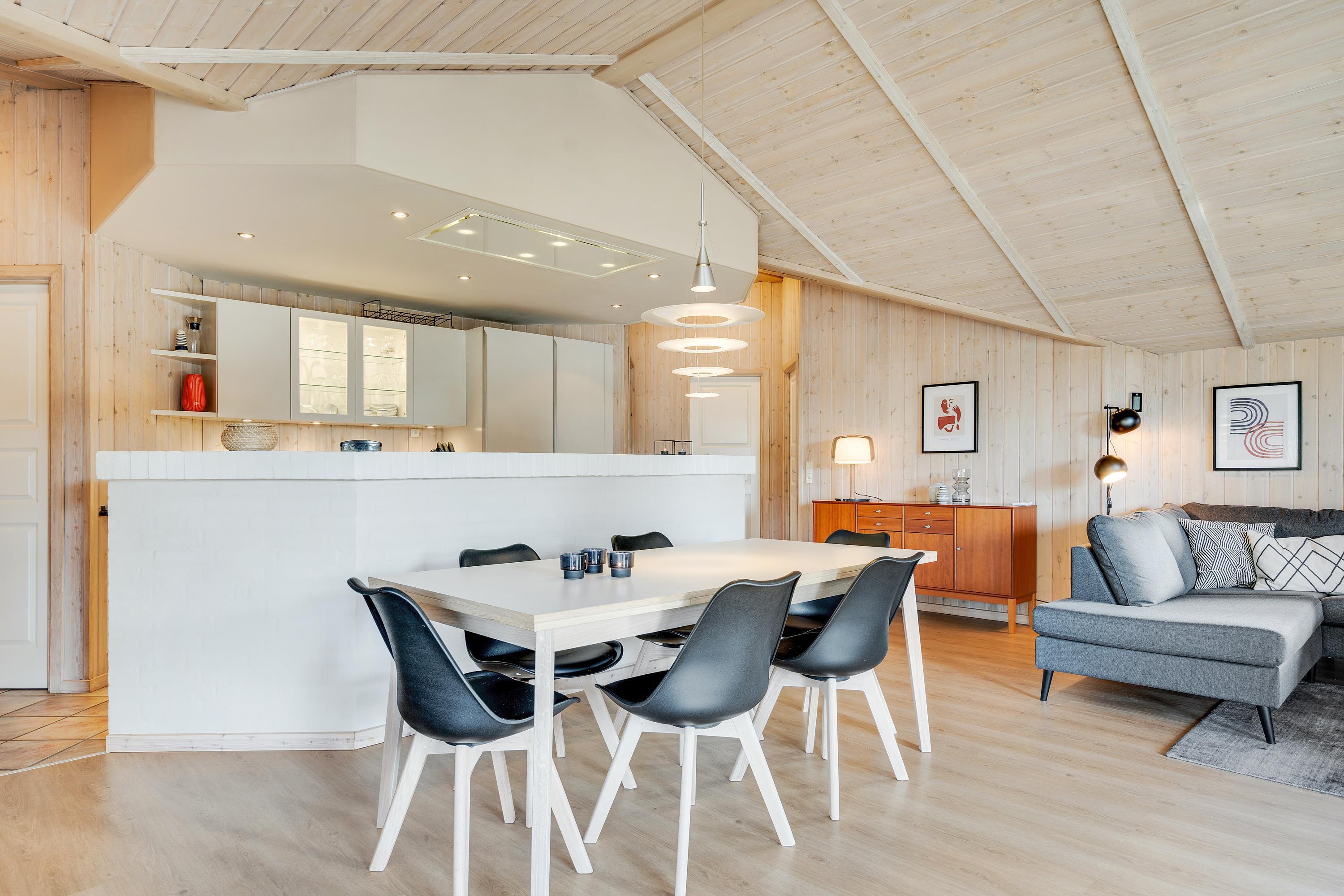 Sommerhusets hjerte er opholdsrummet, der forener køkken, spiseafdeling og stue. Her kan I samle hele familien til feriehygge, mens brændeovnen knitrer i baggrunden. Den energibesparende varmepumpe sørger for, at I har en behagelig temperatur hele året rundt.