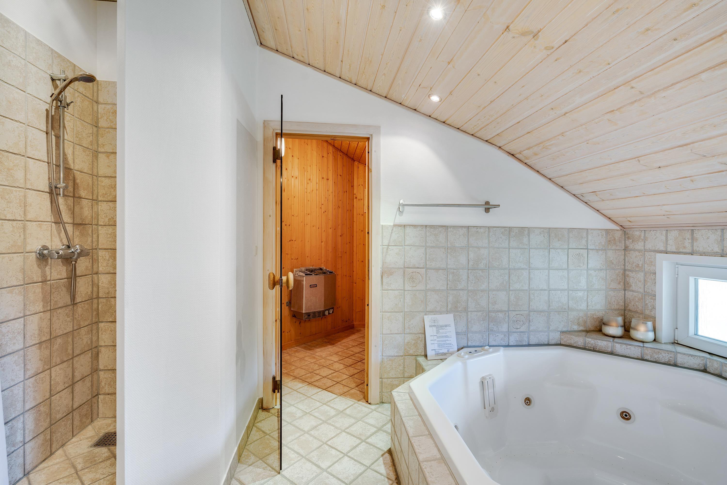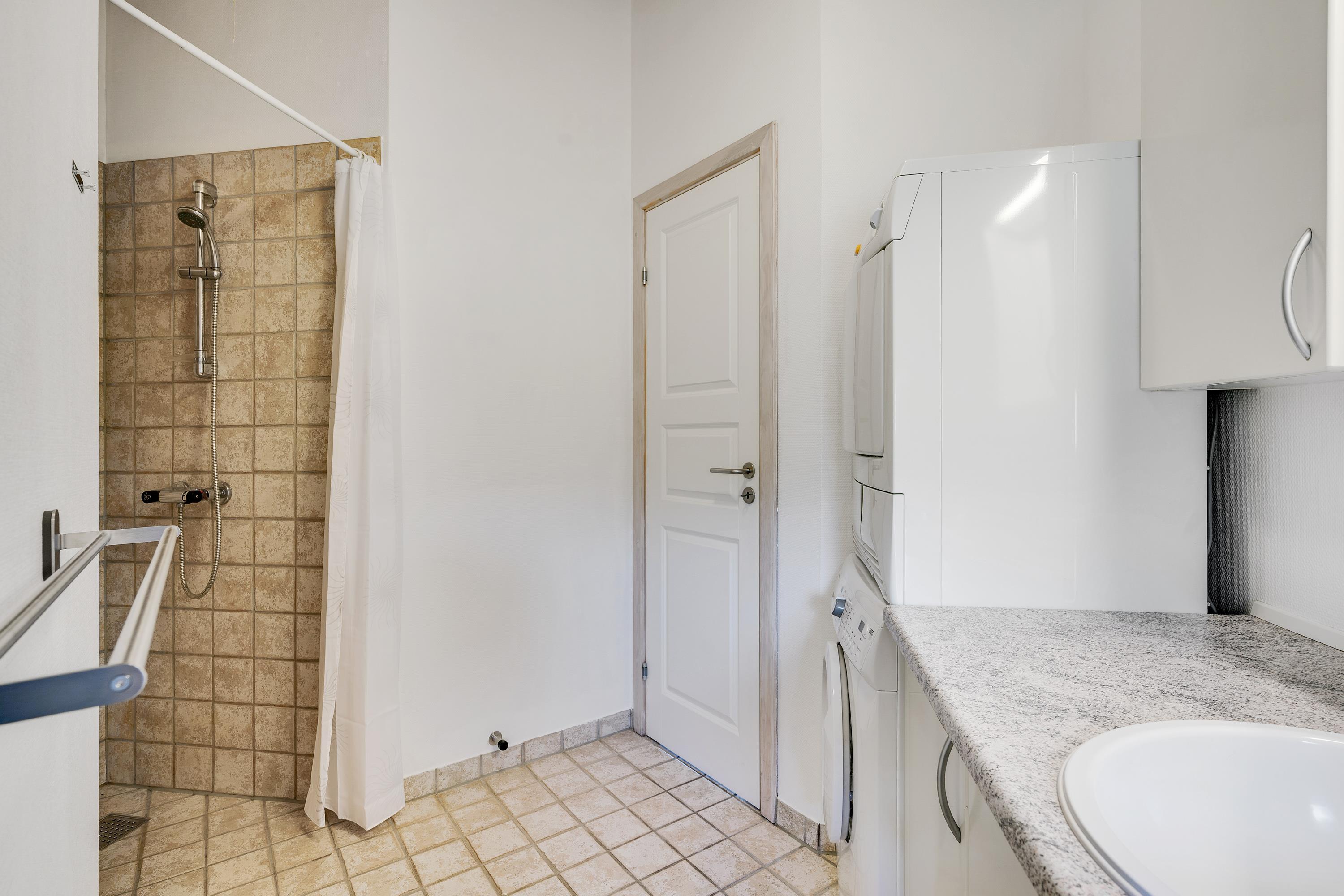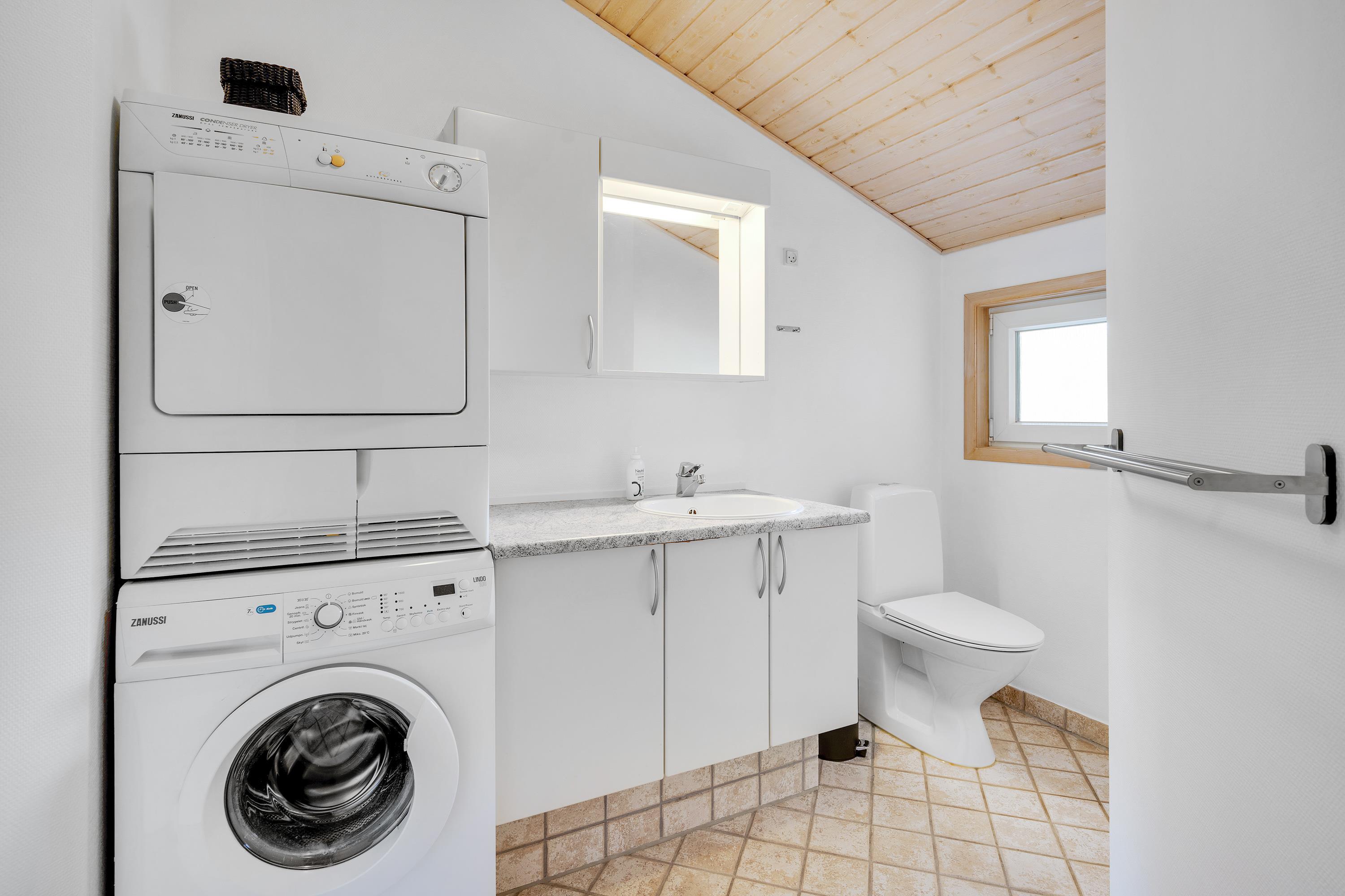 Feriehuset er udstyret med 2 badeværelser (begge med gulvvarme), så I slipper for lange køer til brusebadet om morgenen. Det største badeværelse gemmer desuden på et lækkert wellness-highlight – her er der både spabad og sauna. Det andet badeværelse er indrettet med en praktisk vaskesøjle.