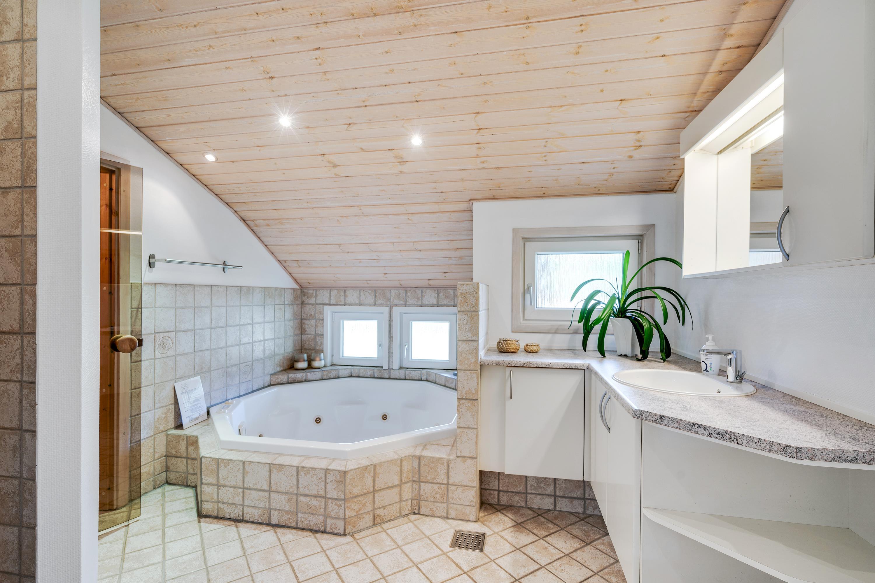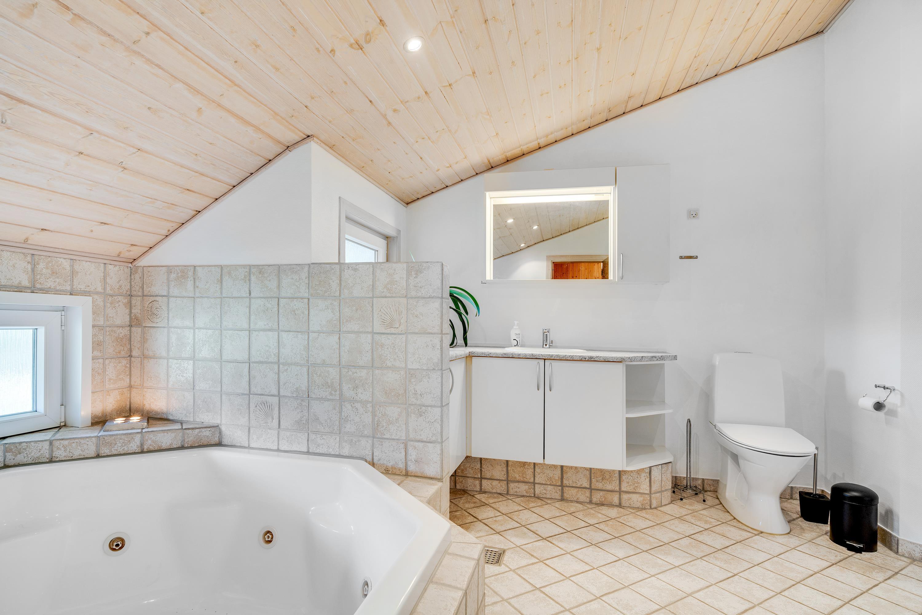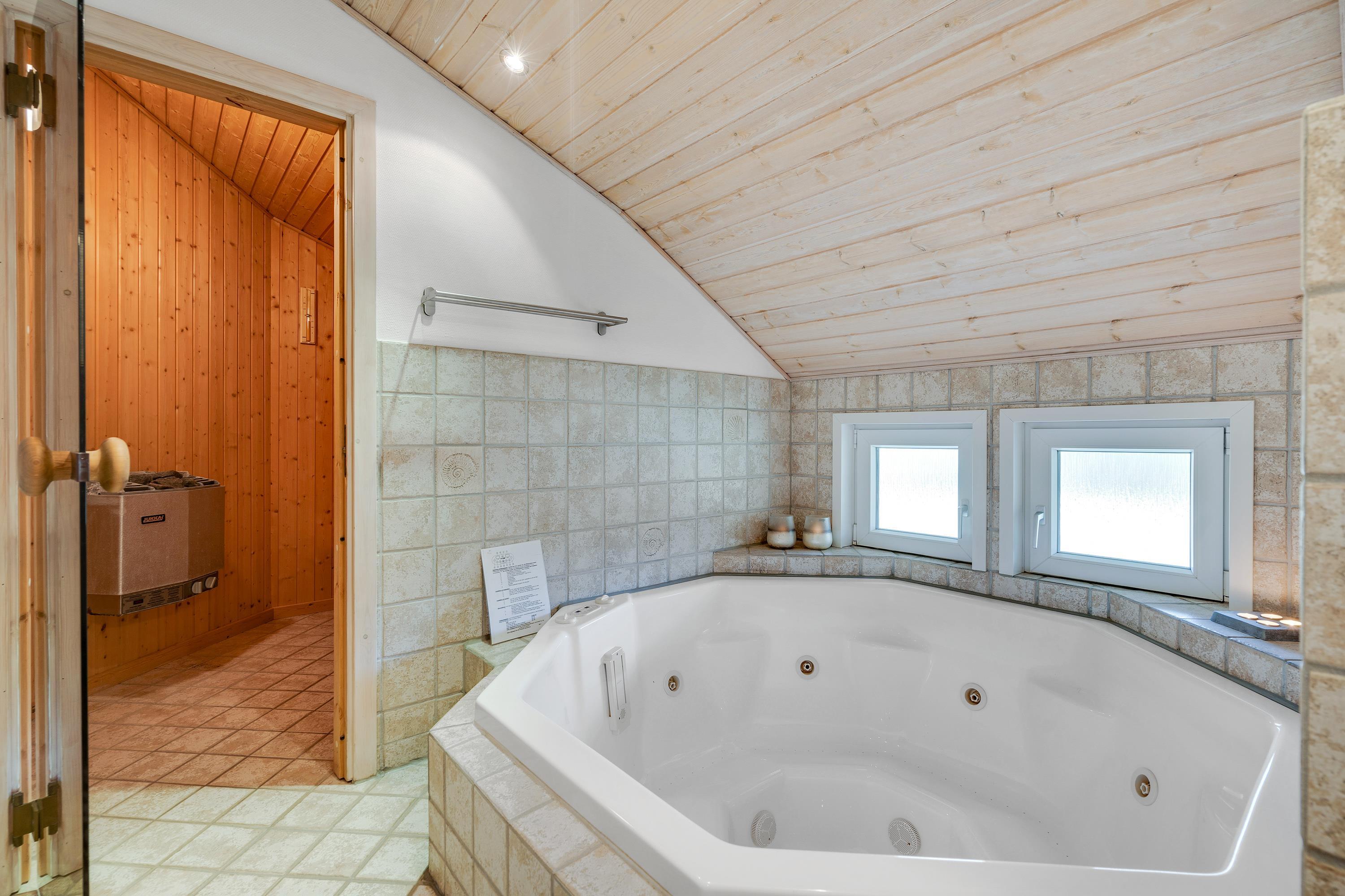 Feriehuset er udstyret med 2 badeværelser (begge med gulvvarme), så I slipper for lange køer til brusebadet om morgenen. Det største badeværelse gemmer desuden på et lækkert wellness-highlight – her er der både spabad og sauna. Det andet badeværelse er indrettet med en praktisk vaskesøjle.