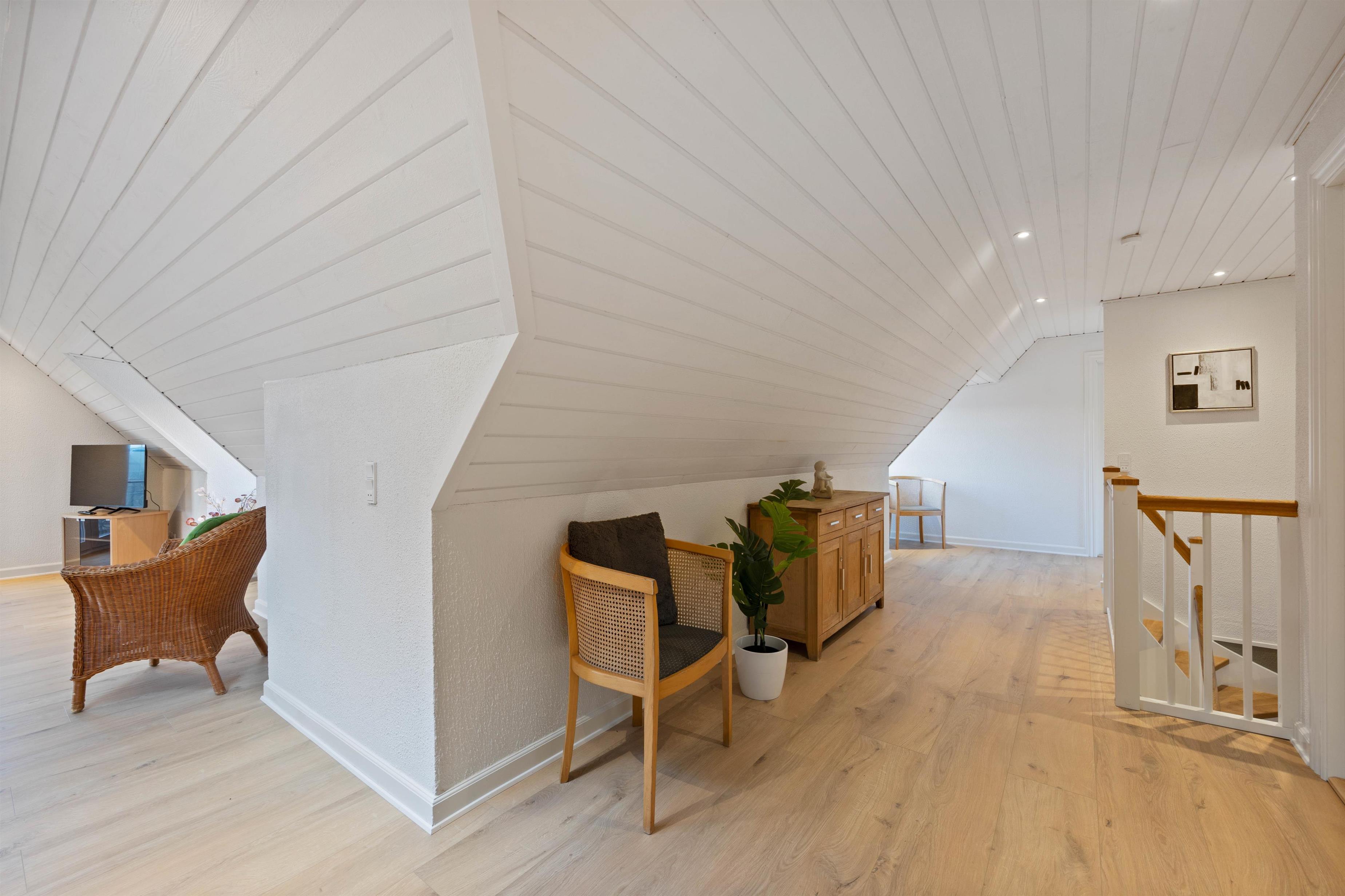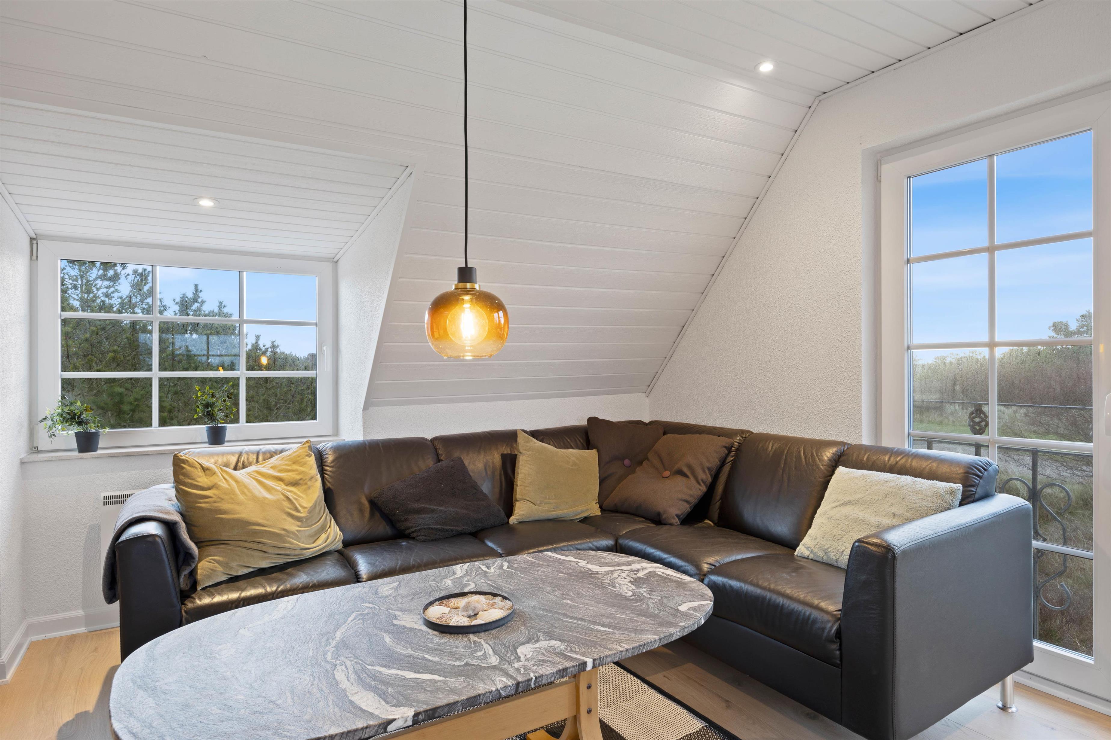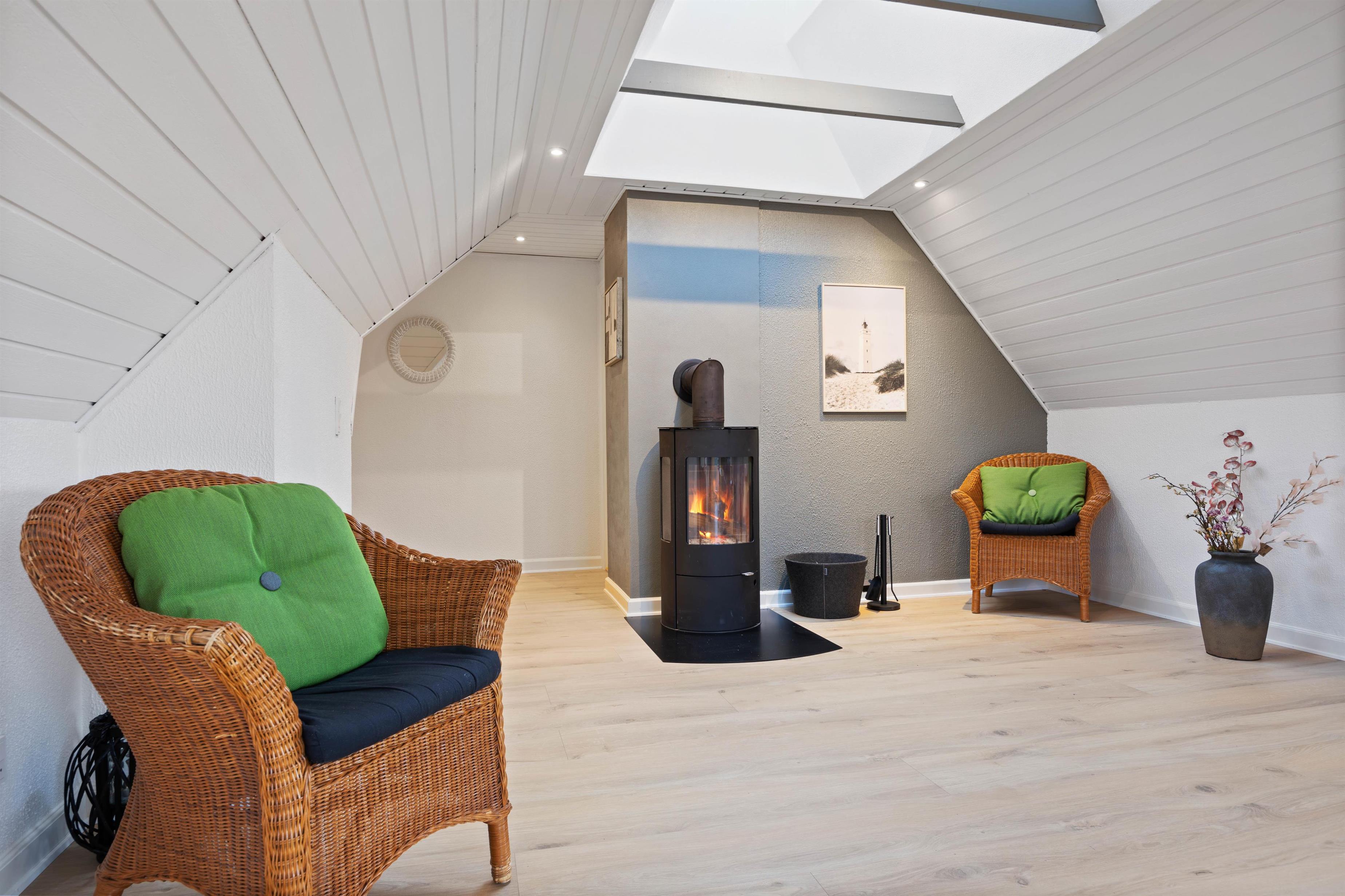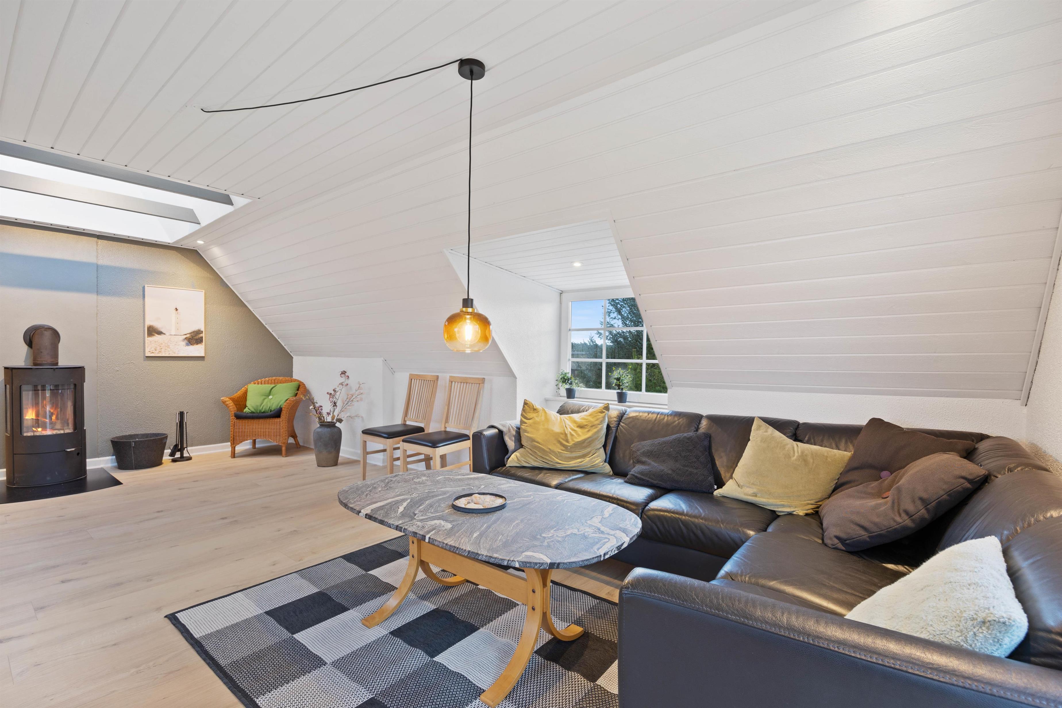 Fra spisestuen er der trappe op til den hyggelige stue på første sal. Her kan I slappe af I den store bløde hjørnesofa til en god film i fjernsynet eller hyggeligt samvær. Her er også en brændeovn, som bidrager til hyggen, og der er en fantastisk udsigt over området. Rytterlyset i loftet giver et fantastisk lys i stuerne.