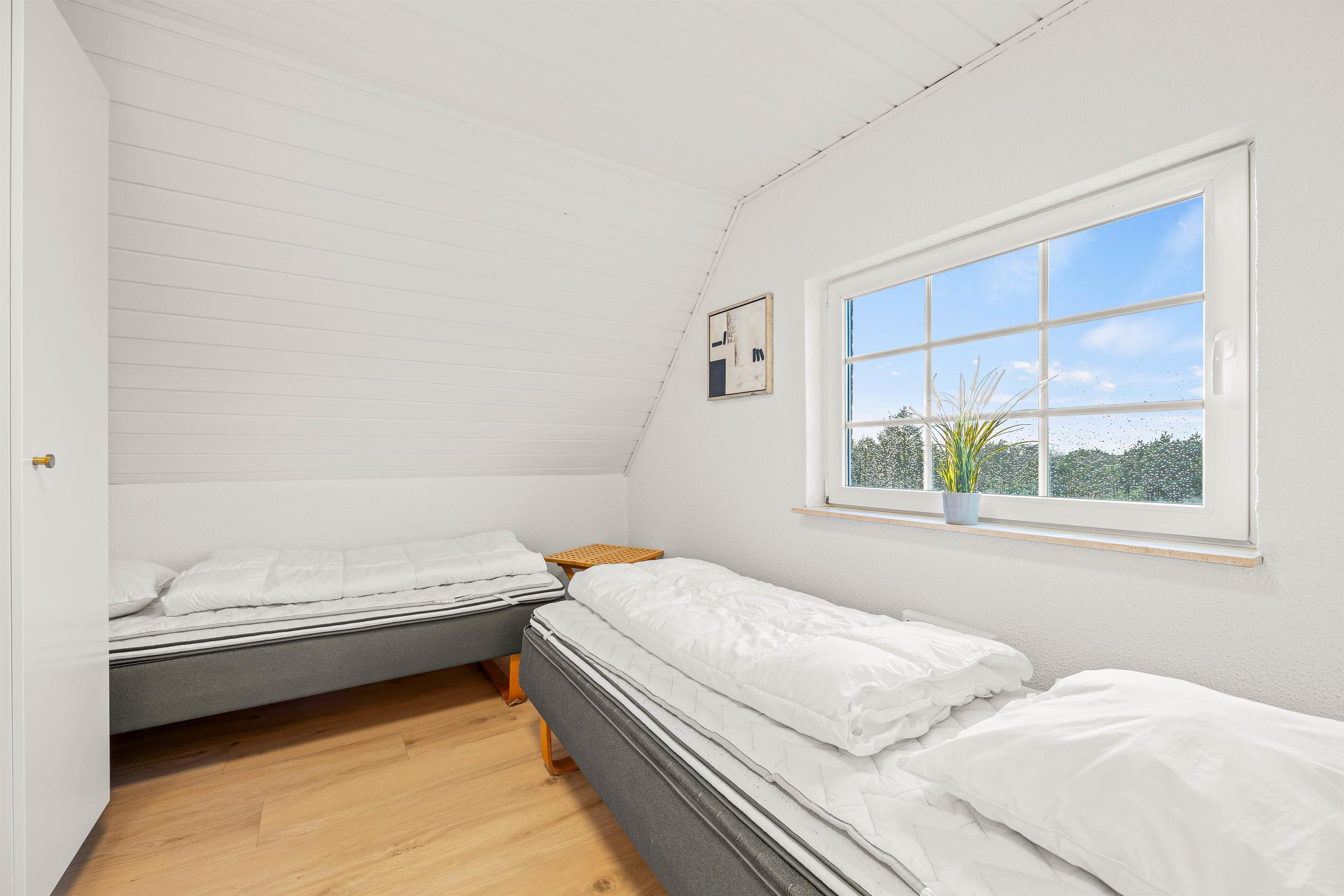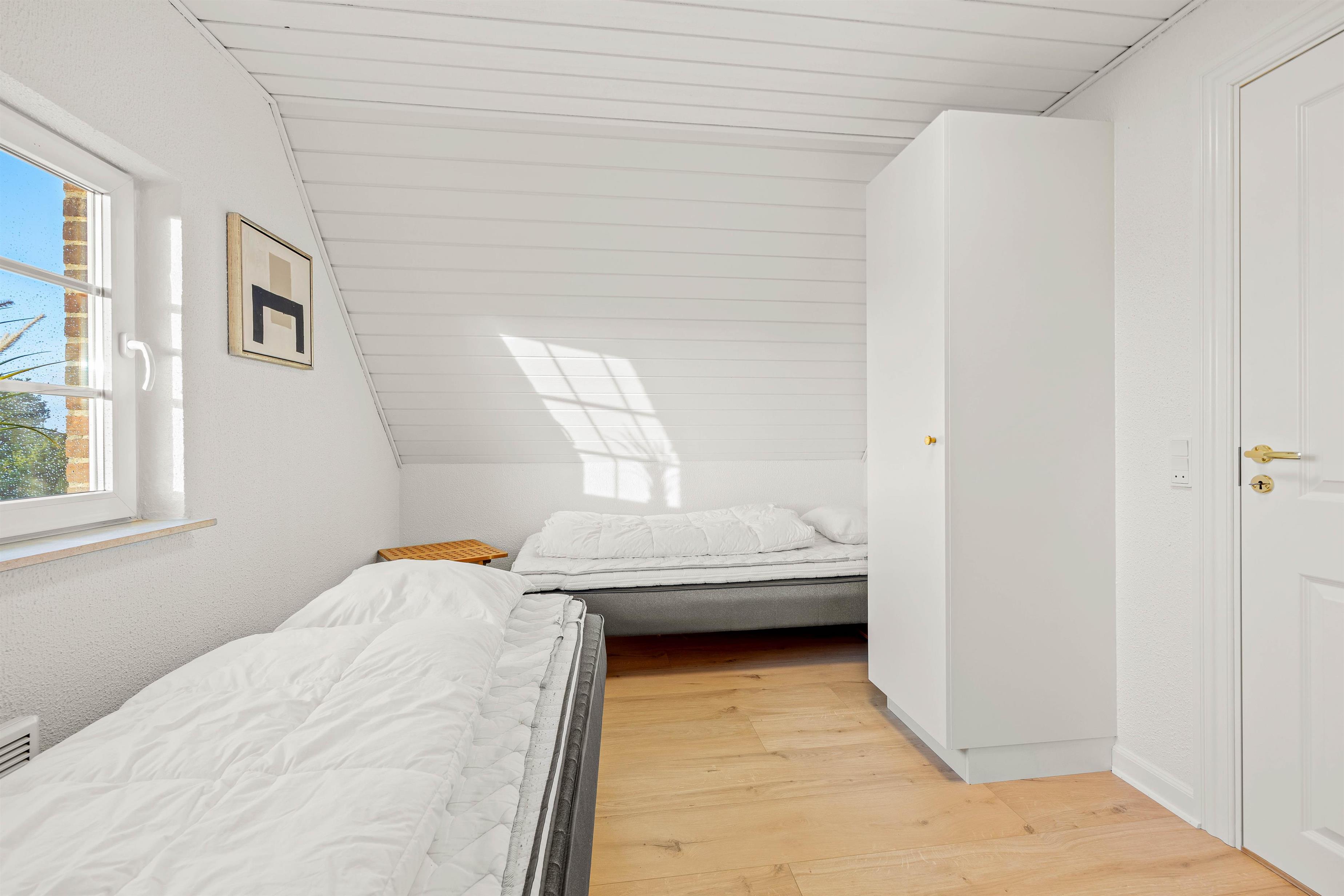 1. sal rummer også 3 soveværelser – 1 stort værelse med 3 enkeltsenge, 1 stort soveværelse med ektra opredning og plads til en barneseng og et lidt mindre soveværelse med dobbeltseng. Førstesalen har også sit eget store badeværelse med brus. I stueetagen er der 2 soveværelser med god skabsplads samt et badeværelse med brus.