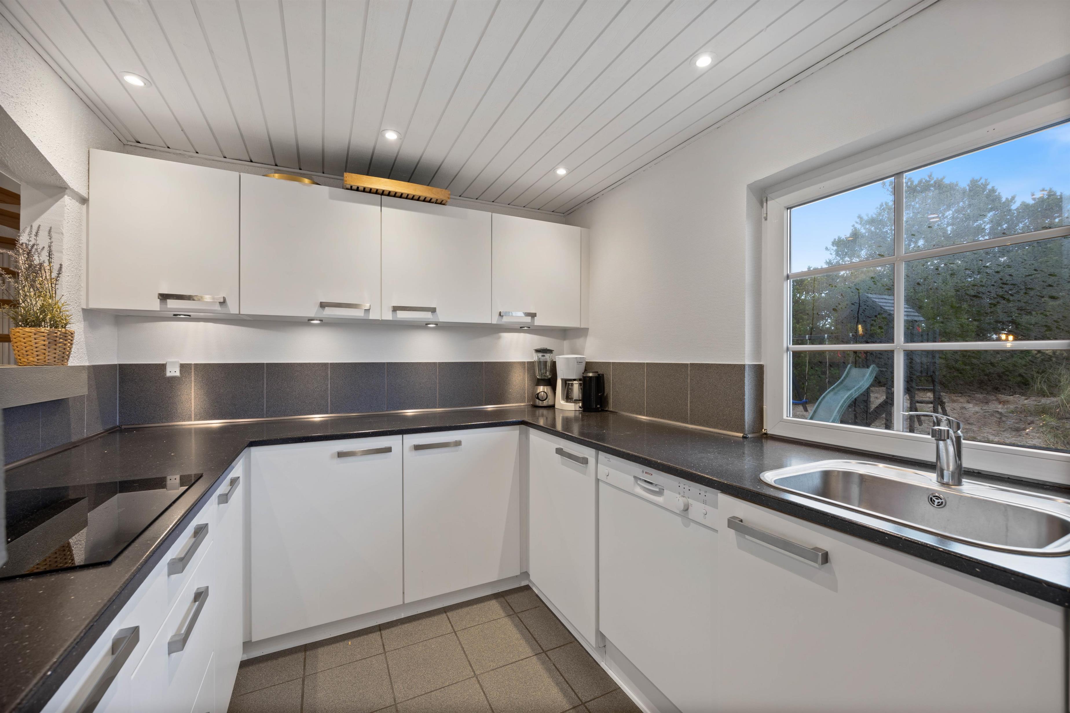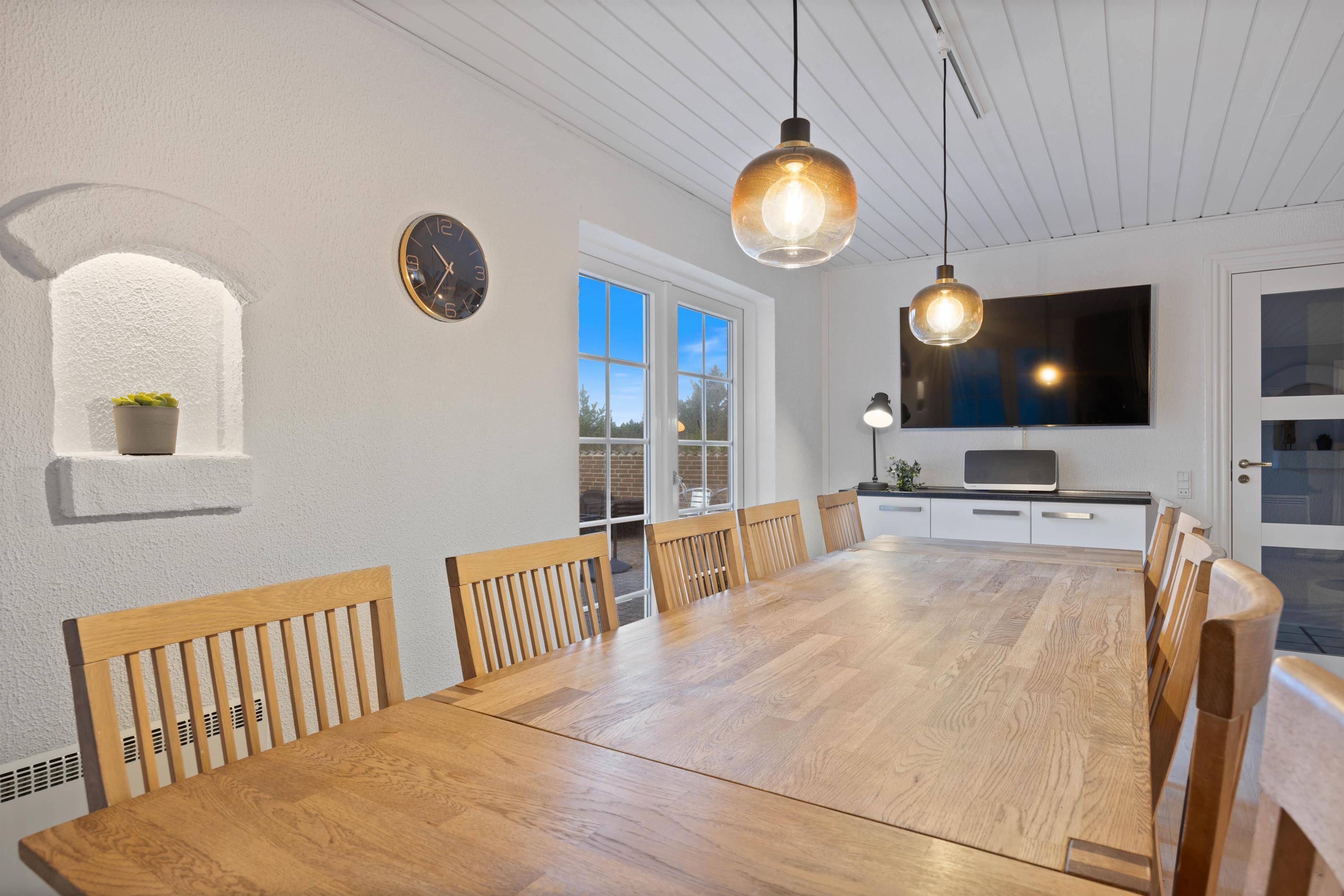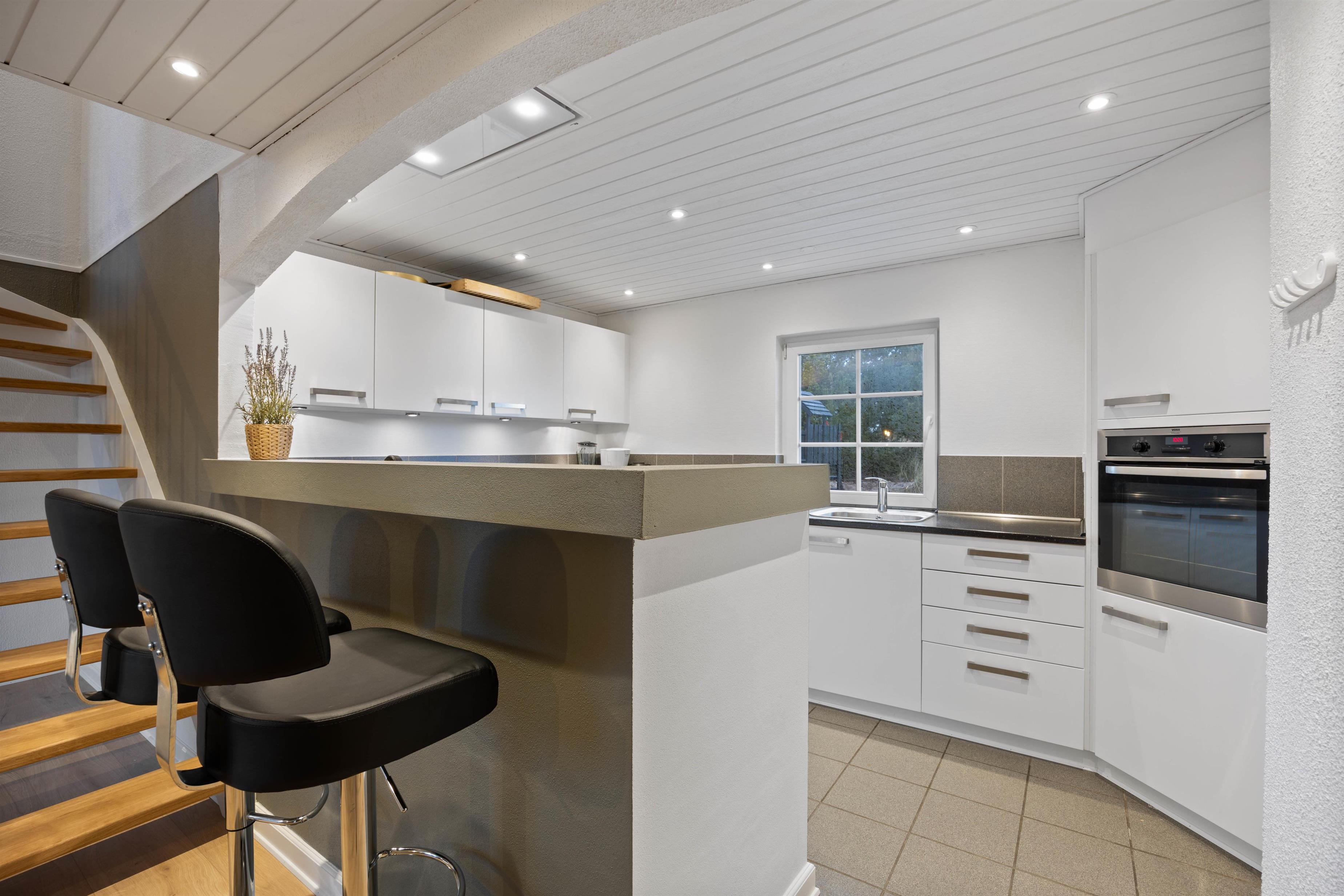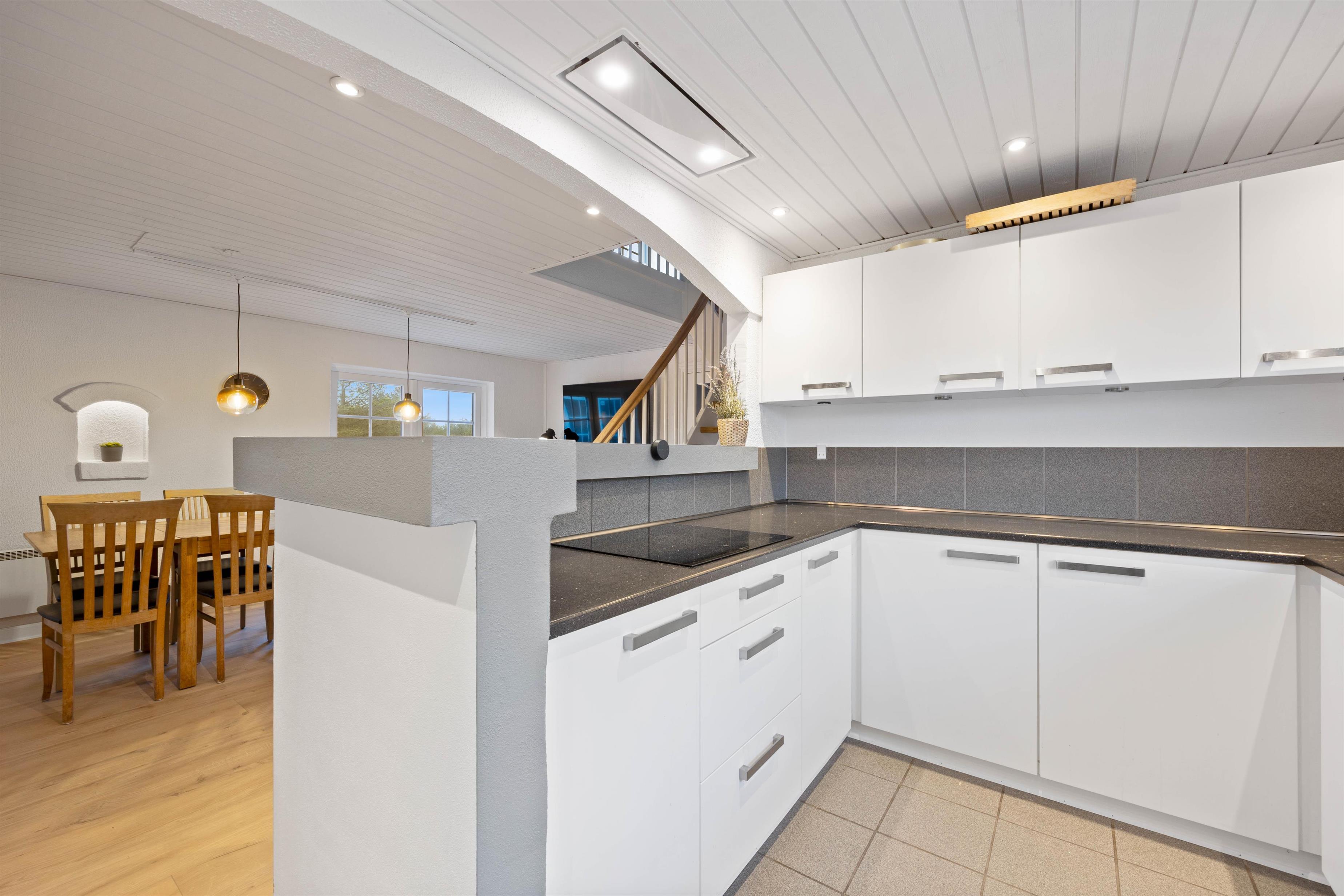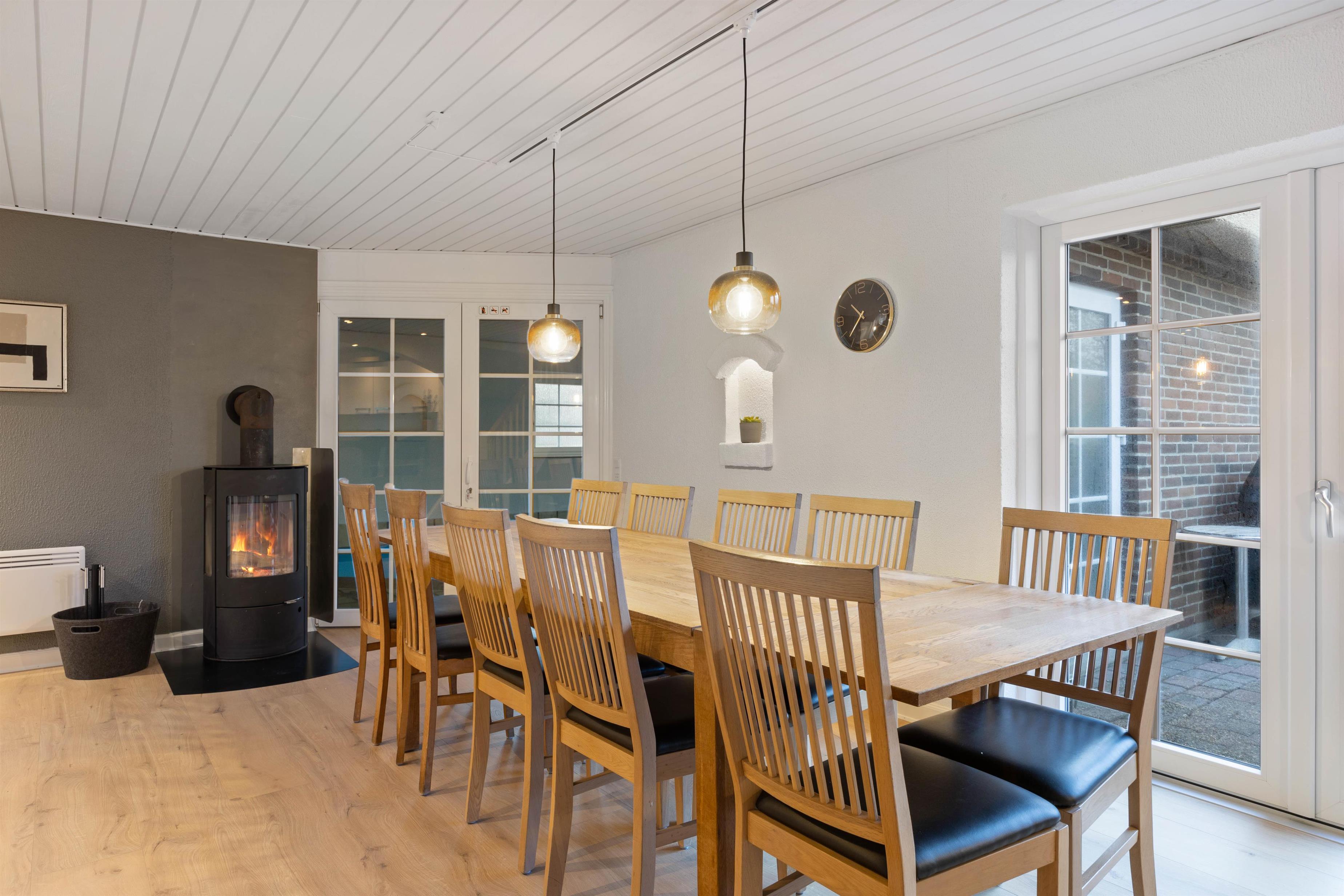 Spisestuen med både TV og brændeovn giver plads til alle og her kan I mødes til et lækkert måltid tilberedt i det veludstyrede køkken eller til et medbragt spil. Køkkenet har plads til, at flere kan hjælpes om madlavningen, og det er udstyret med mikroovn, ovn i ståhøjde og opvaskemaskine naturligvis.