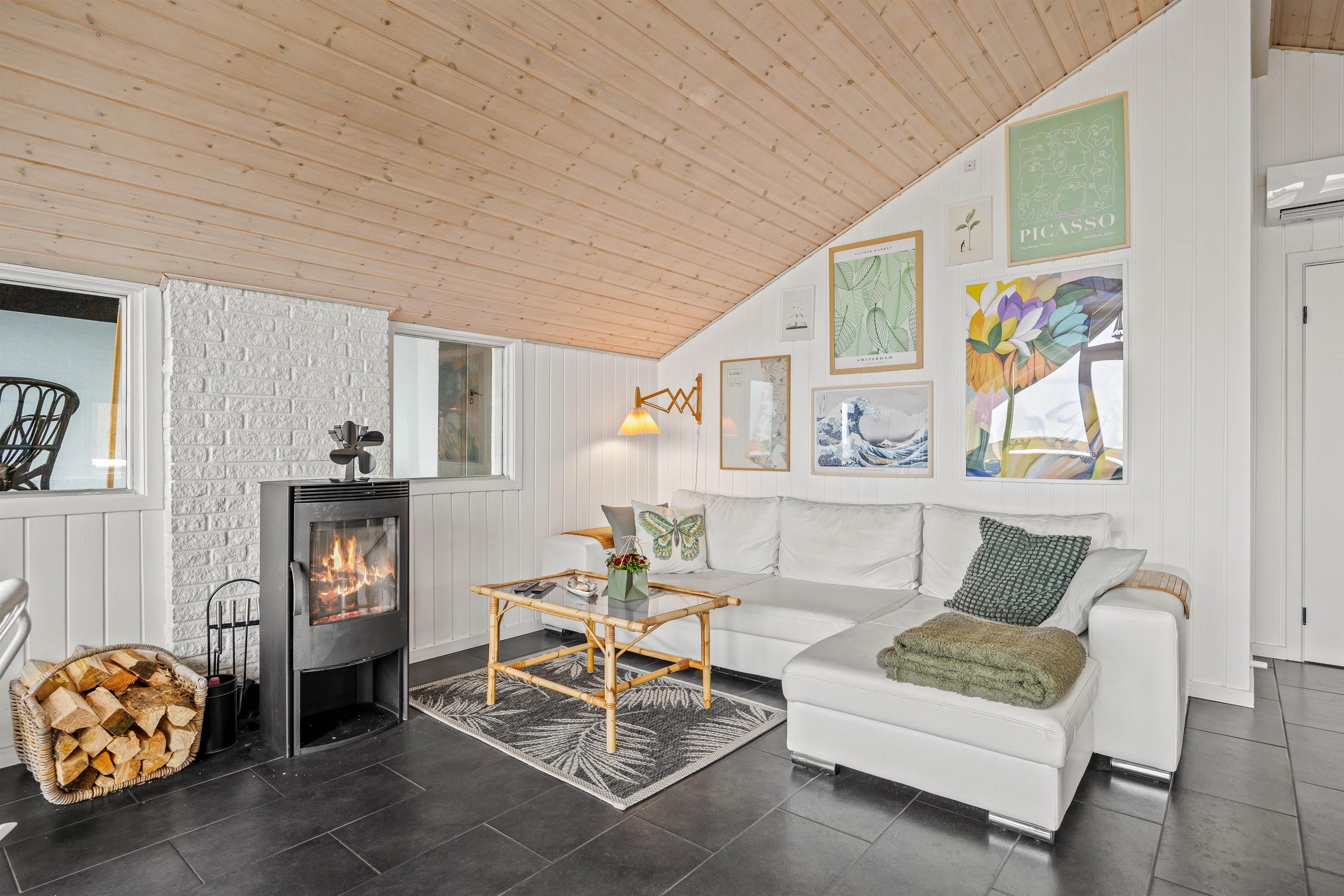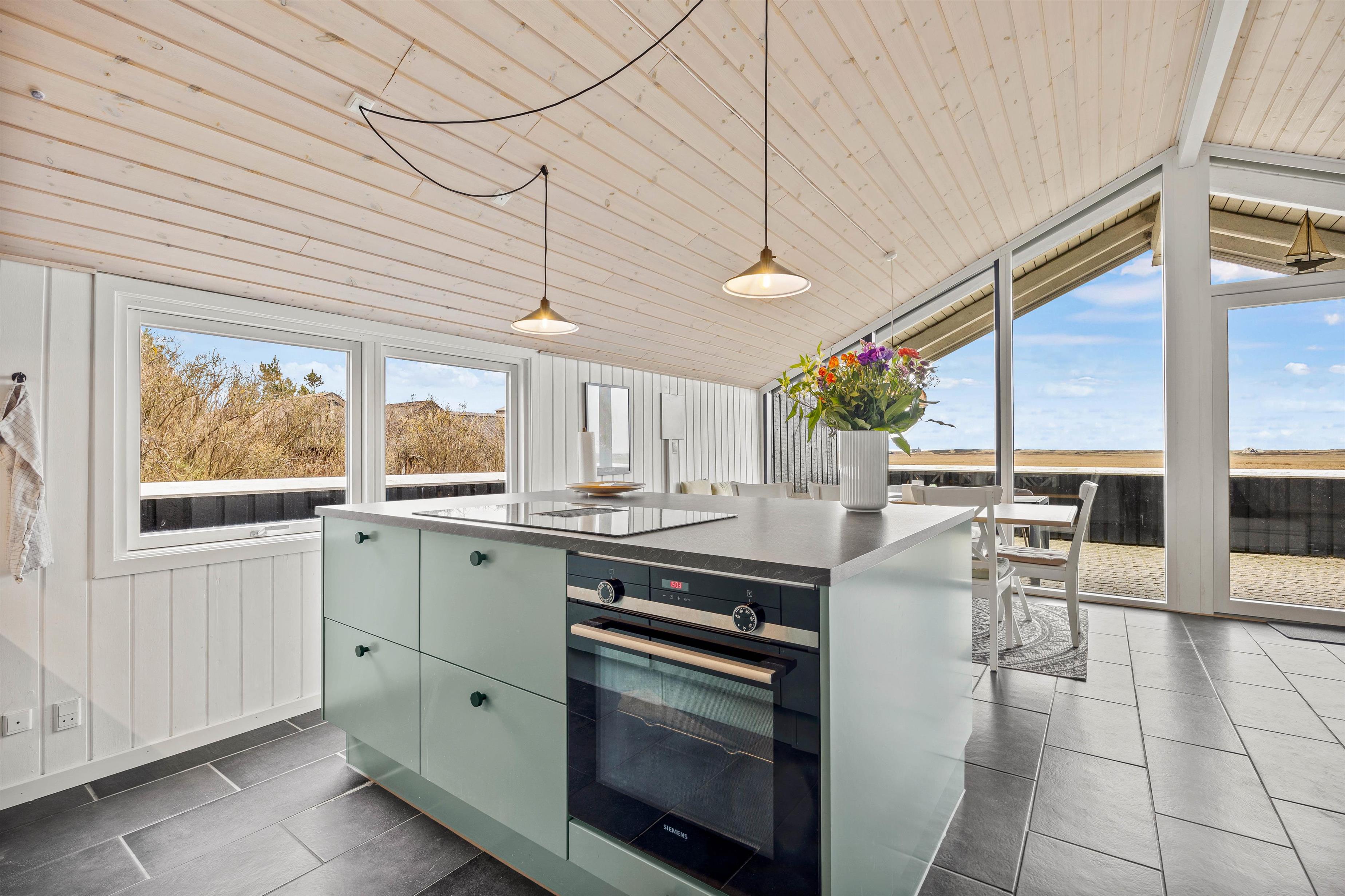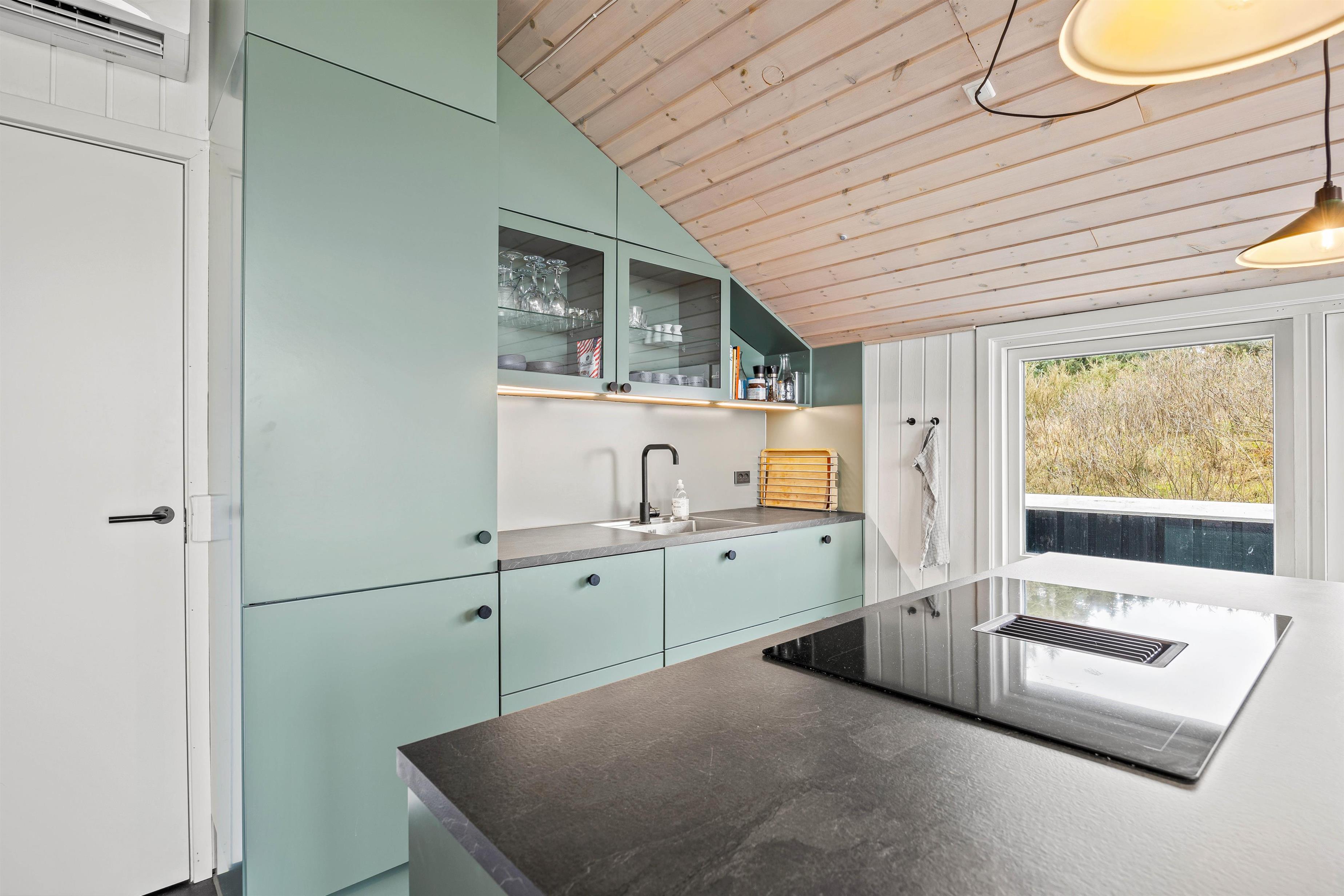 Det moderne køkken er ikke kun smukt, men også moderne udstyret med induktionskogeplade med nedsænket emhætte på en stor køkkenblok, hvor der også er to barstole. Uanset hvor du er - i køkkenet, ved spisebordet eller i den komfortable sofa - har du altid denne fantastiske udsigt udefra. Brændeovnen fuldender hyggestemningen, men brug også feriehusets energibesparende varmepumpe til at vedligeholde en behagelig varme.