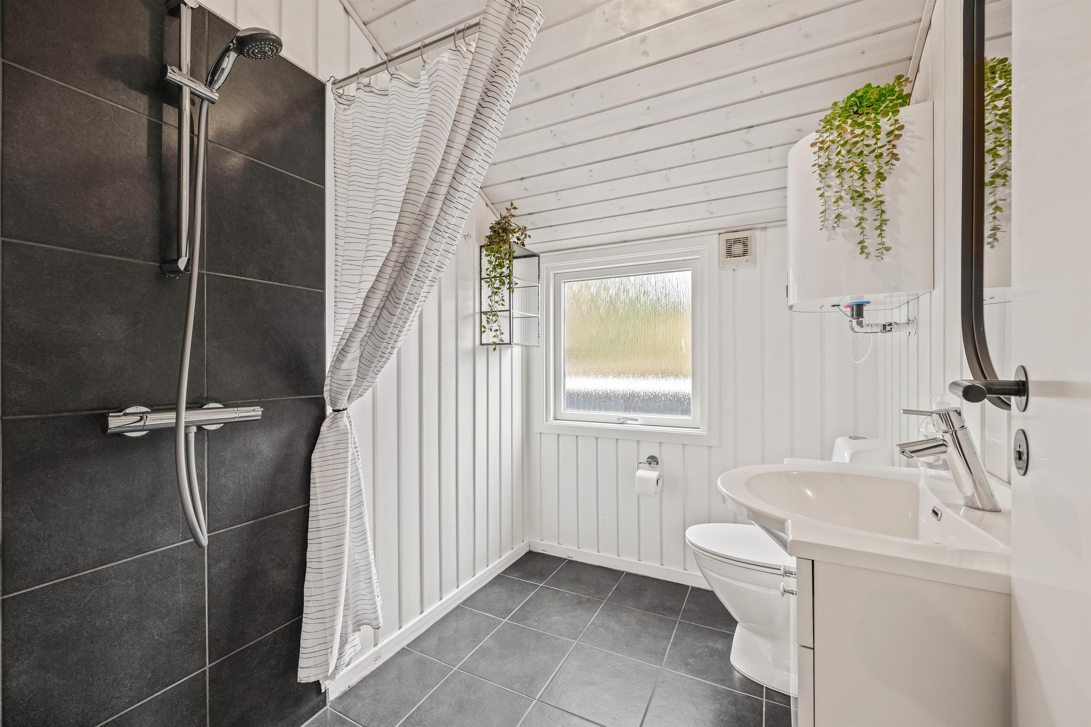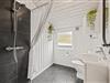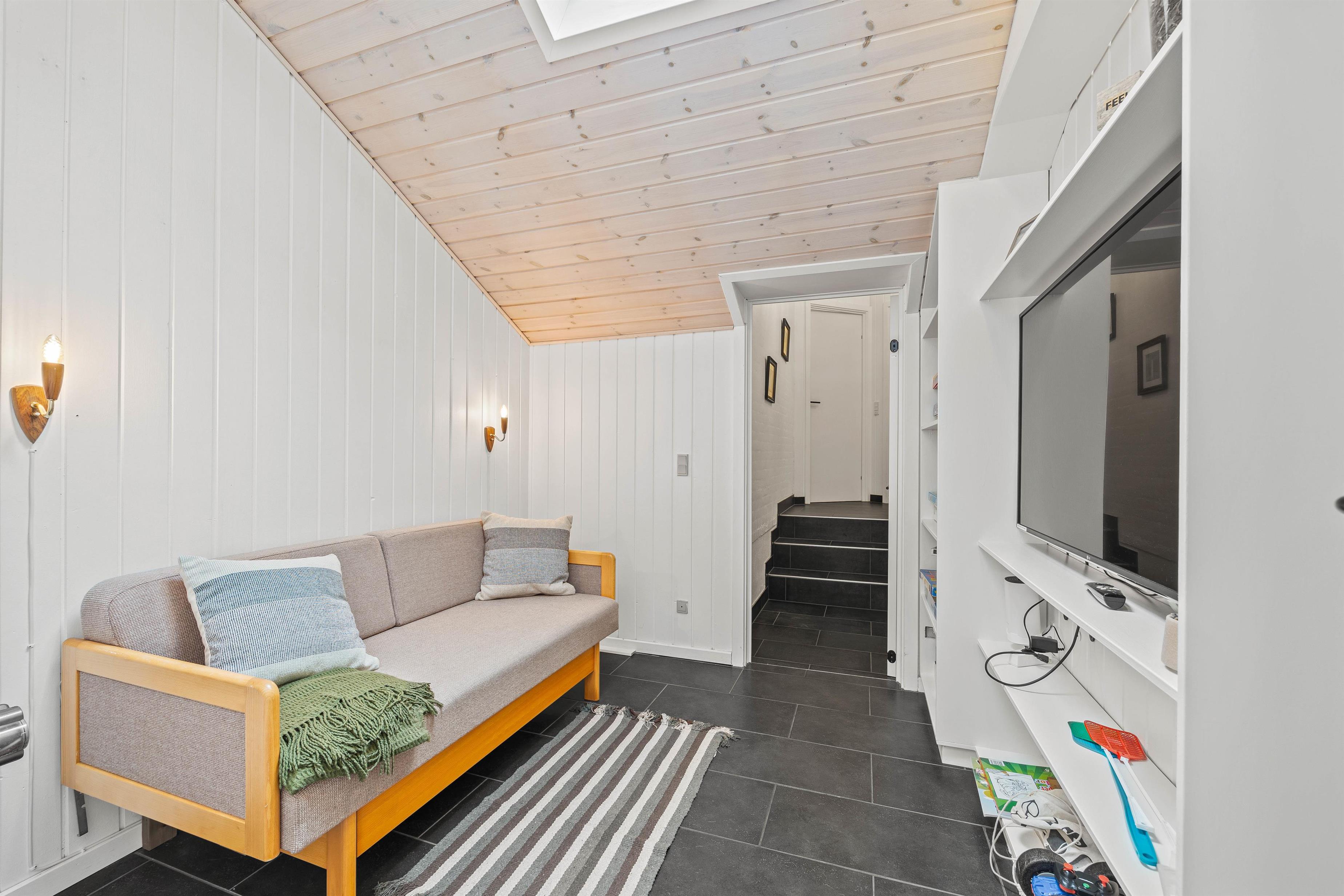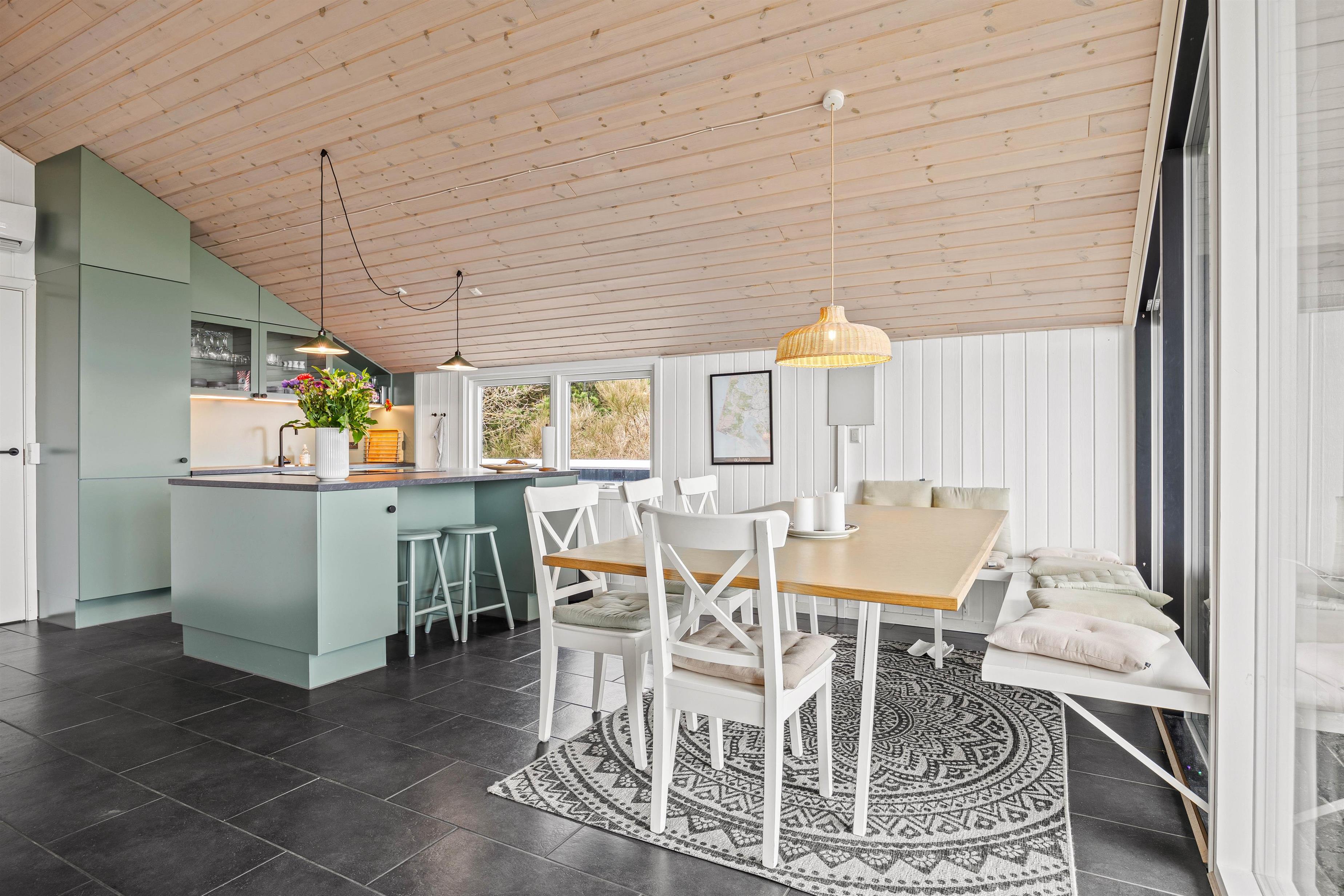 Det moderne køkken er ikke kun smukt, men også moderne udstyret med induktionskogeplade med nedsænket emhætte på en stor køkkenblok, hvor der også er to barstole. Uanset hvor du er - i køkkenet, ved spisebordet eller i den komfortable sofa - har du altid denne fantastiske udsigt udefra. Brændeovnen fuldender hyggestemningen, men brug også feriehusets energibesparende varmepumpe til at vedligeholde en behagelig varme.