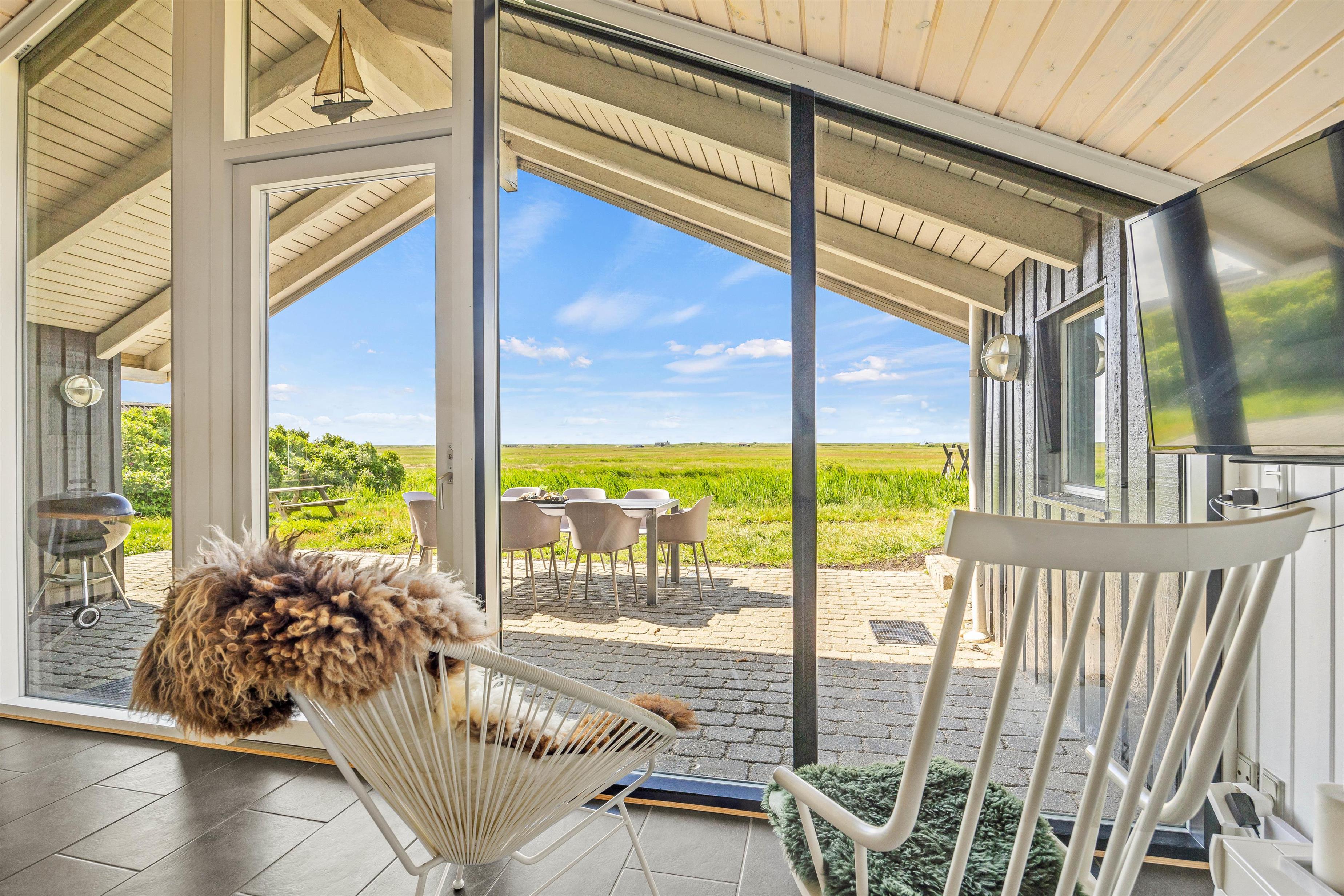 Den hyggelige stemning i dette skønne feriehus kommer dels fra den stilrene blanding af lyse farver og træ, dels fra de store vinduespartier fra gulv til loft i kip. Her lukkes den unikke udsigt over marsken med dyrelivet og Vesterhavet i horisonten ind i det store køkken-alrum.