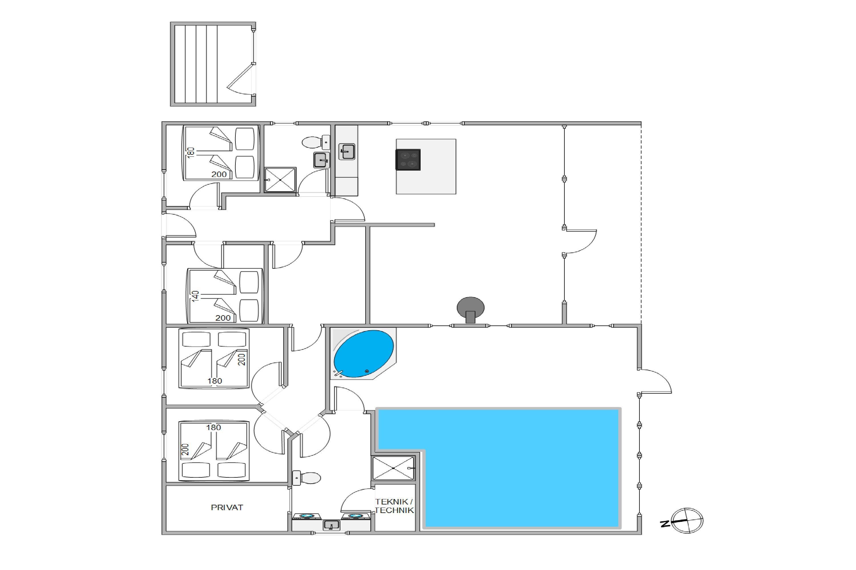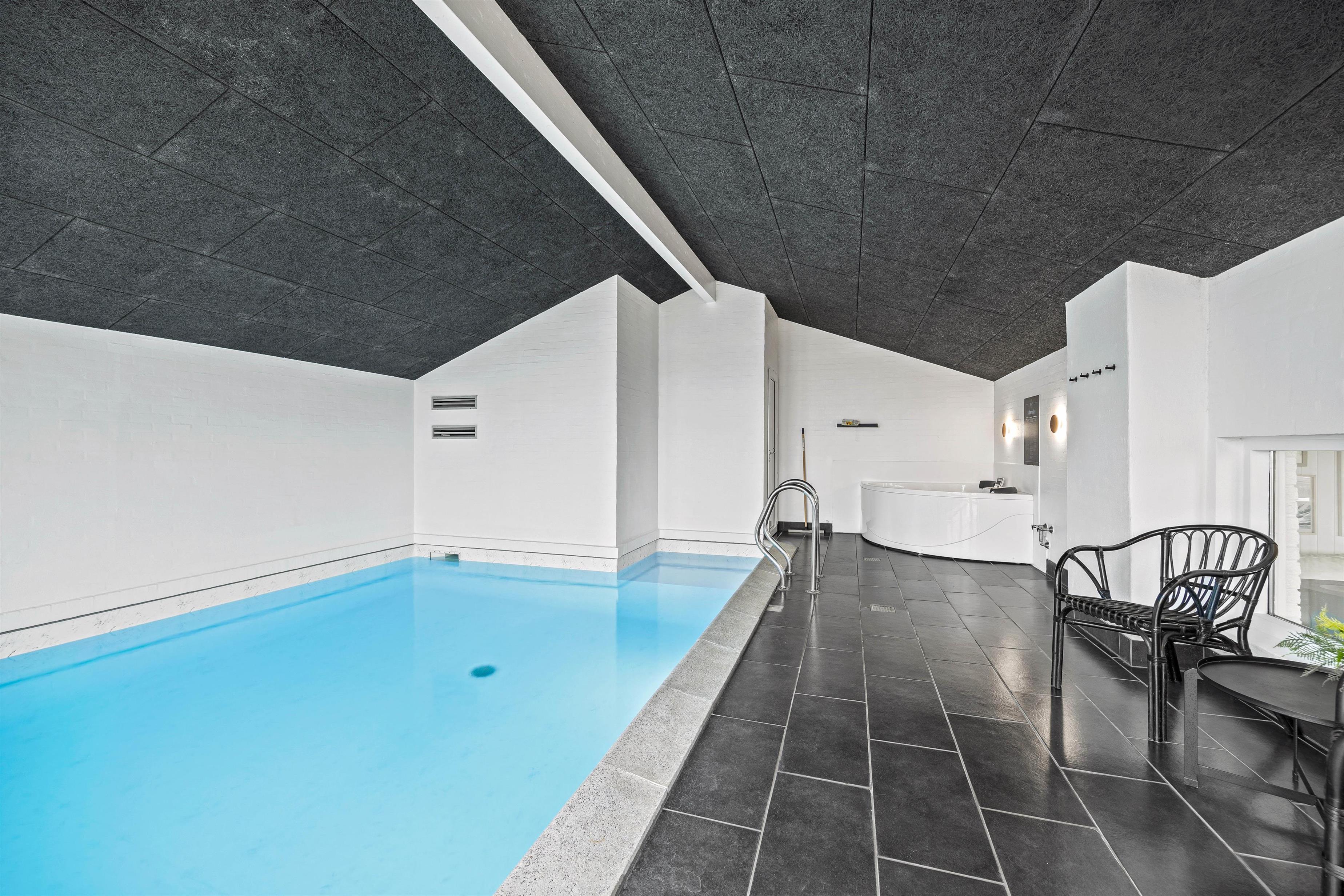 Et andet højdepunkt er wellness-området med en 15 m² pool, en 2-personers spa og sauna. De badeglade vil have det sjovt i poolen, mens andre måske foretrækker at slappe af i spabadets boblende vand. Også herfra kan I nyde den fantastiske udsigt og lyset fra kysten. Den store sauna ligger i forlængelse af det ene af feriehusets 2 badeværelser, der naturligvis har gulvvarme, men også både vaskemaskine og tørretumbler til jeres rådighed.