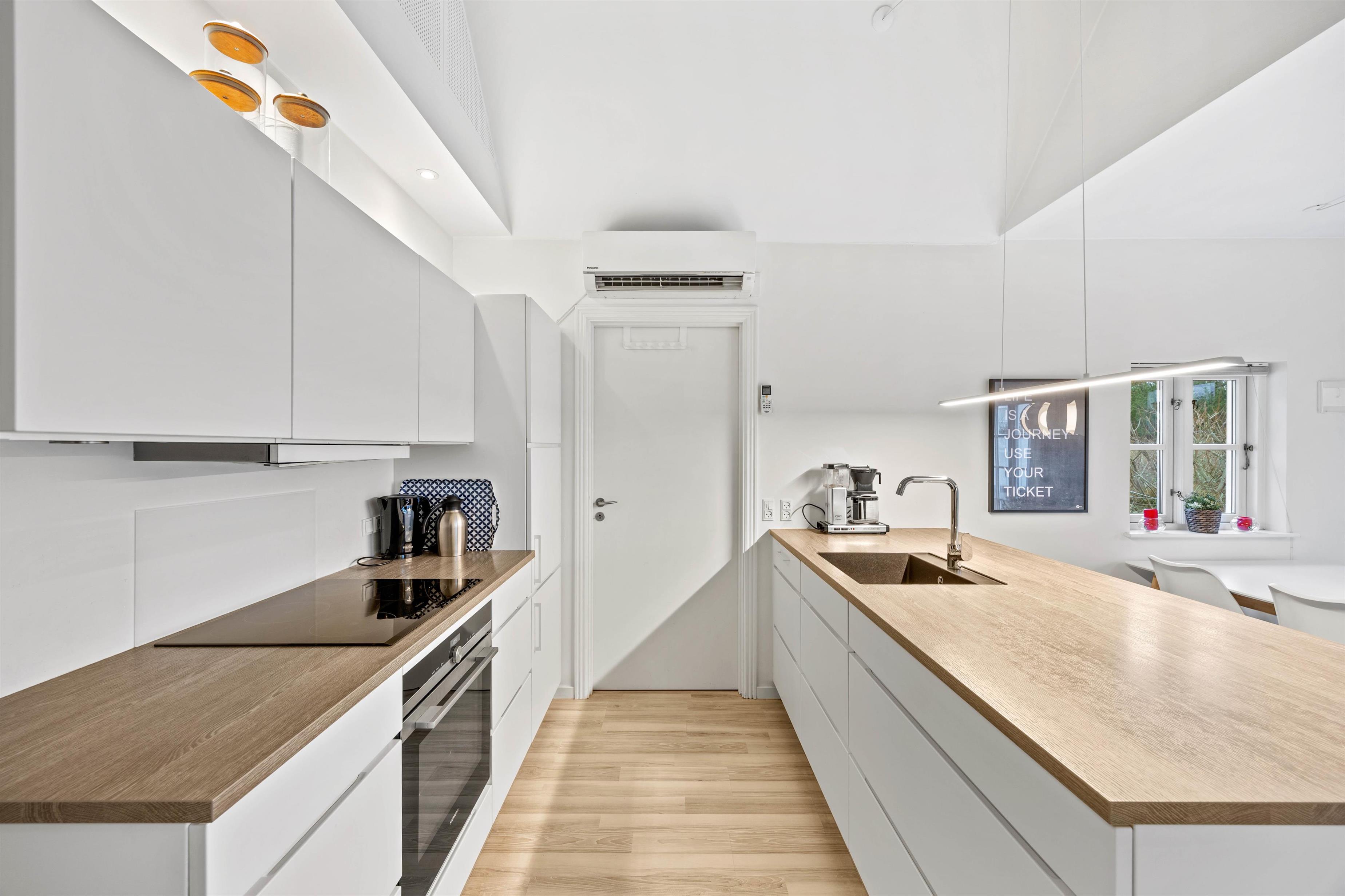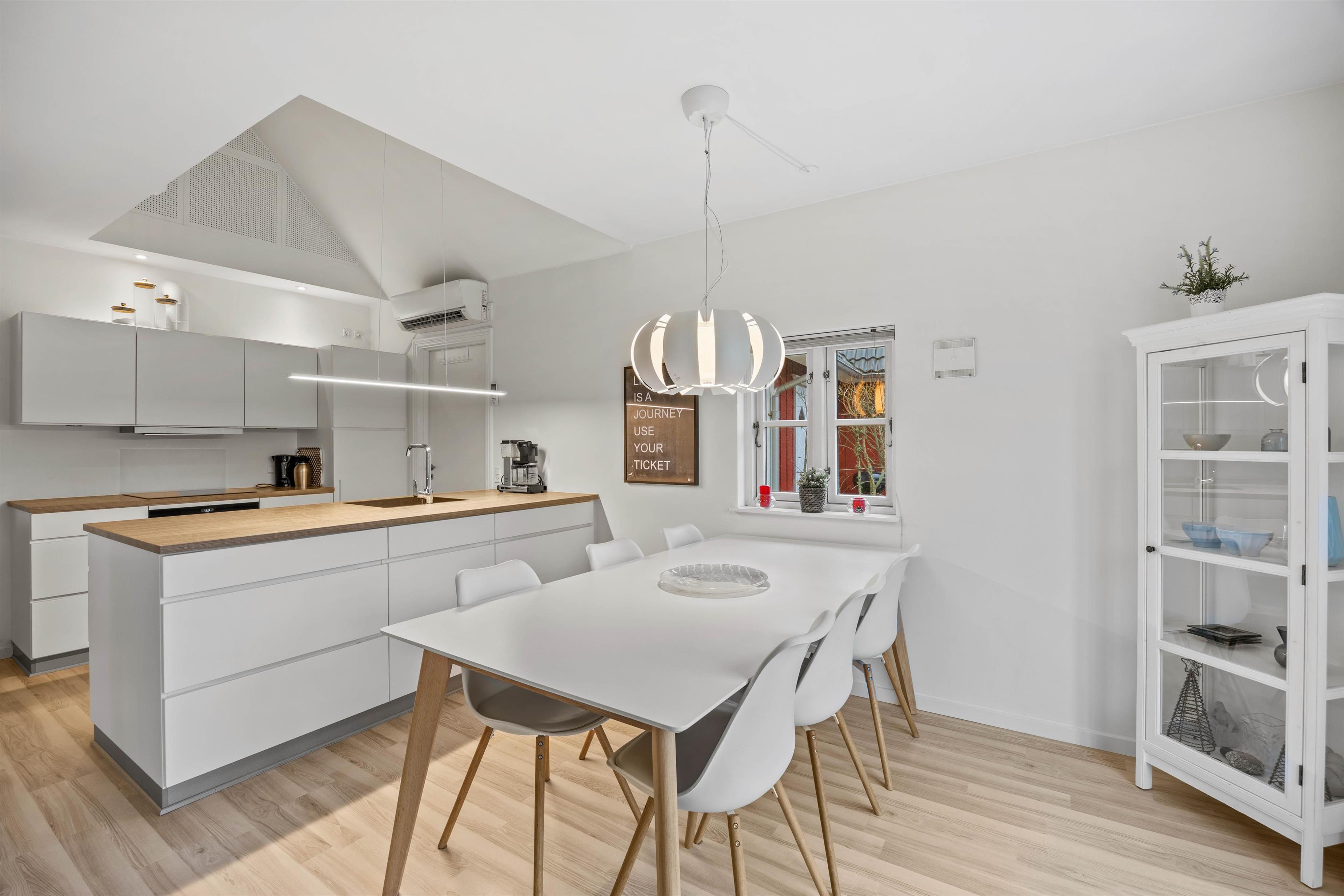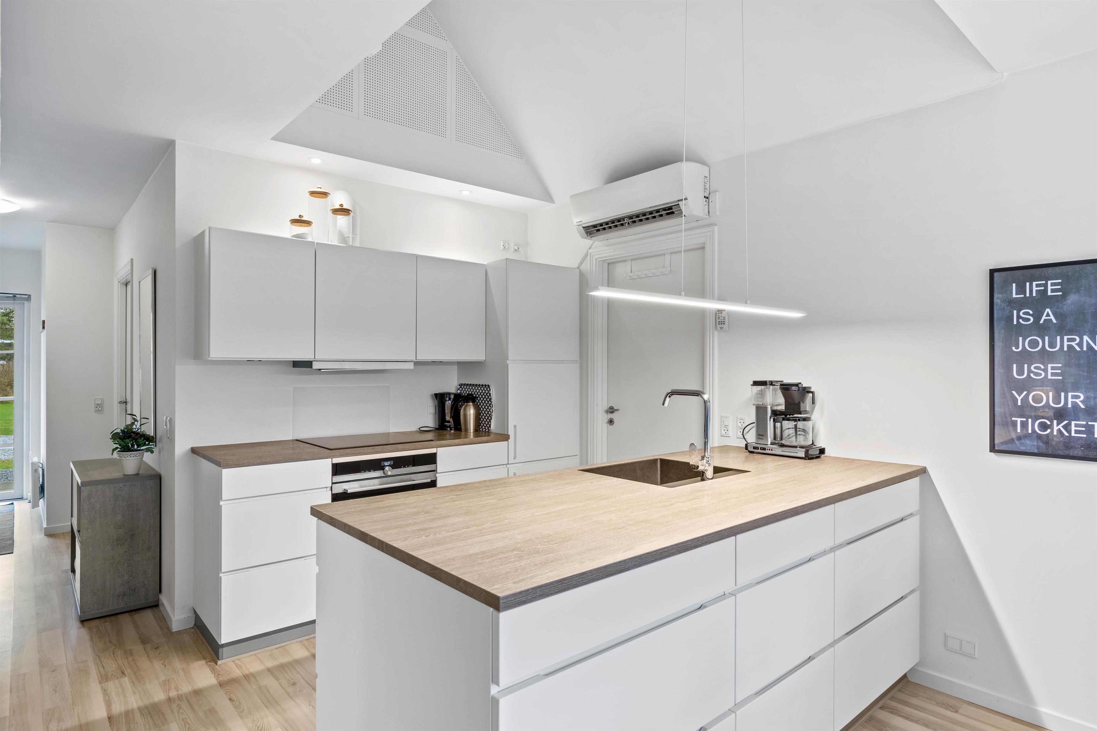 Efter indgang i huset åbner det sig op for jer i det lyse, delvist højloftede rum med køkken/alrum og stue indrettet i en flot, skandinavisk stil. Køkkenet er udstyret med en kombineret ovn/mikroovn og opvaskemaskine, så I nemt kan få lavet dejlige feriemåltider og derefter slippe for at skulle tænke på at skulle ordne opvasken. Skulle I få brug for yderligere fryserkapacitet, råder huset desuden over en separat fryser på 90 liter.