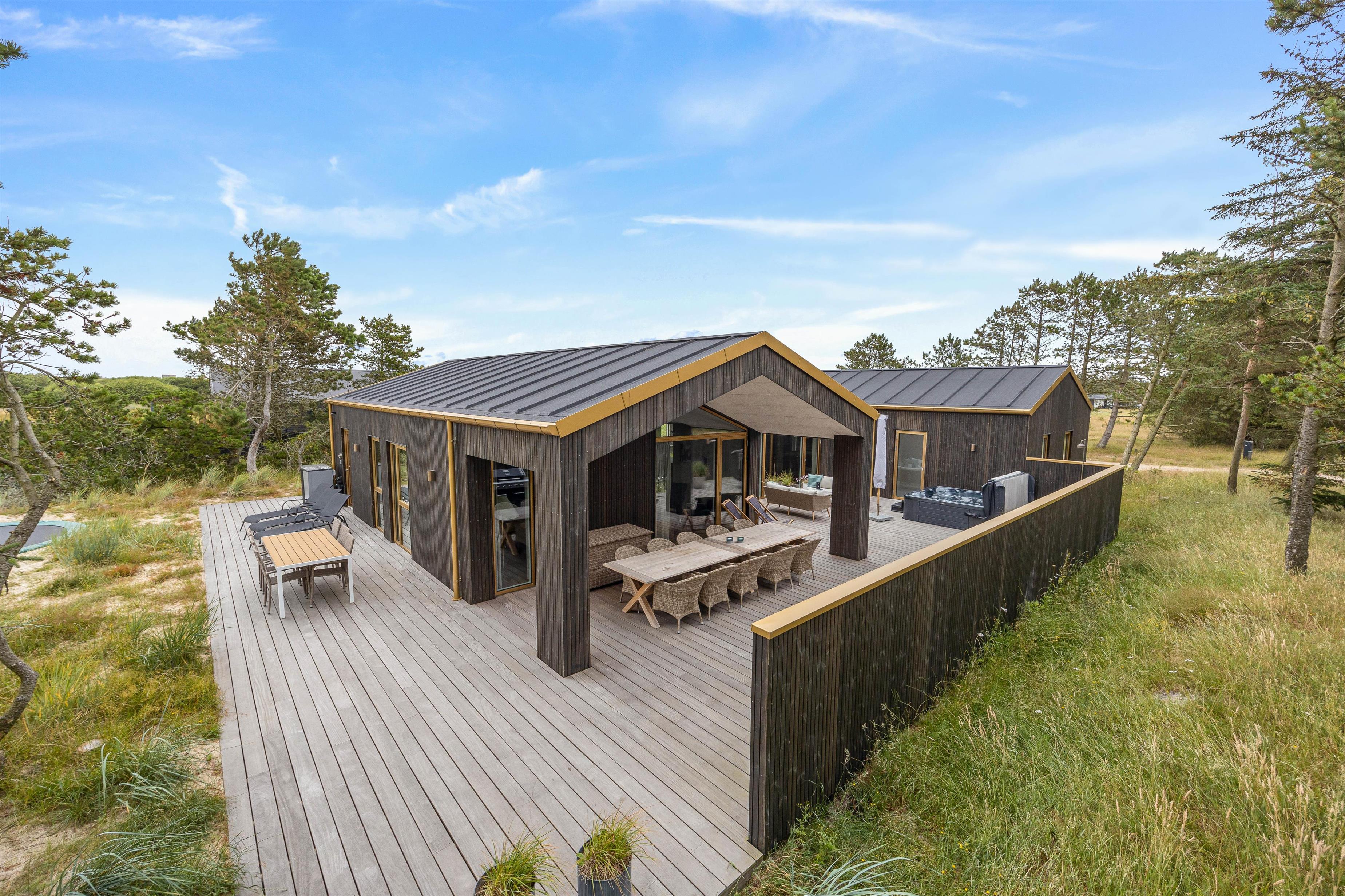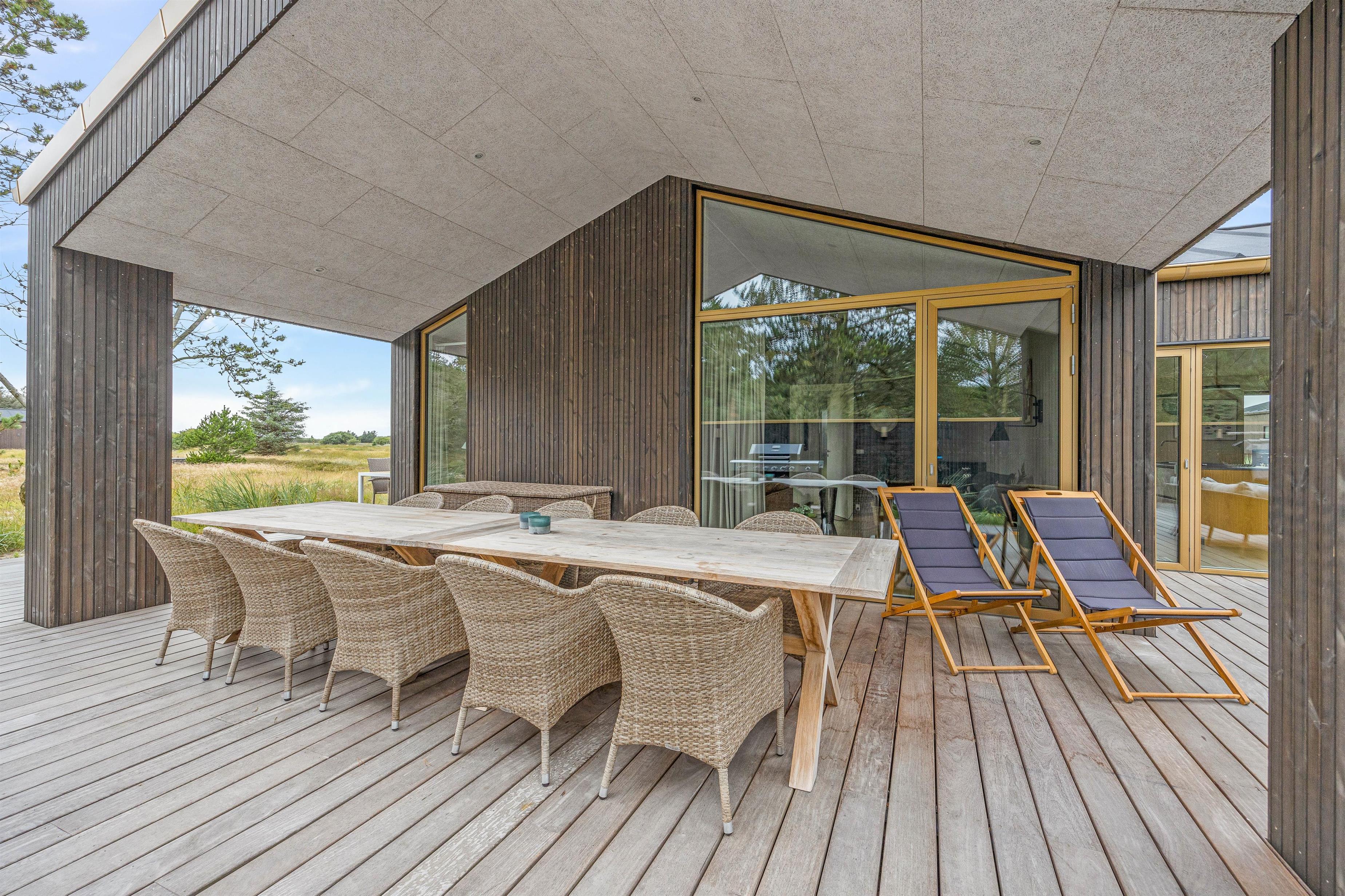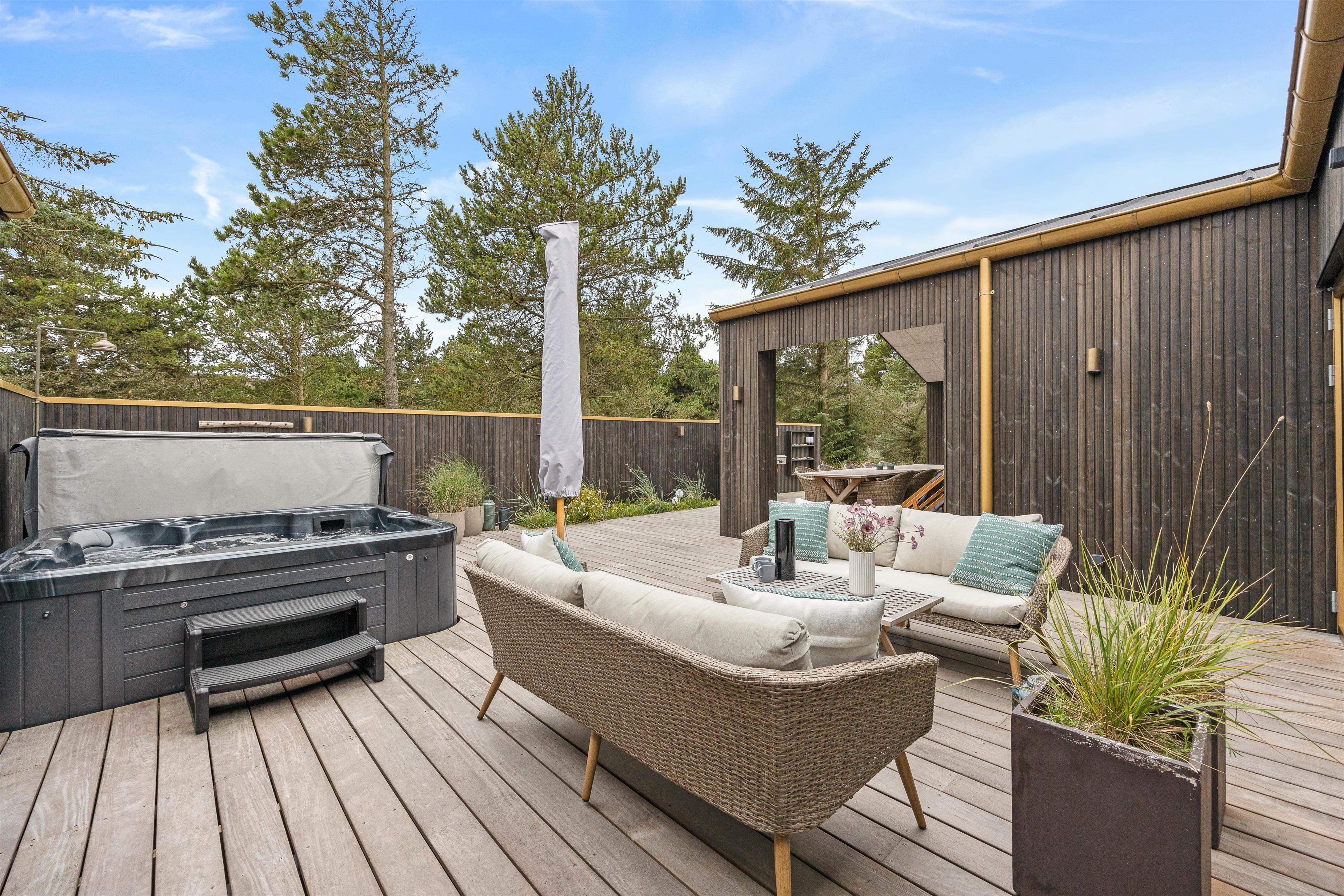 Til det luksuriøse feriehus hører også en lækker terrasse. Terrassen har både en åben og en overdækket del, og ligegyldigt om I foretrækker fuld sol eller skyggehygge, er der et godt spot til jer. Ud over den lækre wellnessoase med udendørs spabad er terrassen udstyret med gode havemøbler, liggestole og en grill til de lune sommeraftener. Fra 1. april til 31. oktober står også udebruseren til jeres rådighed.